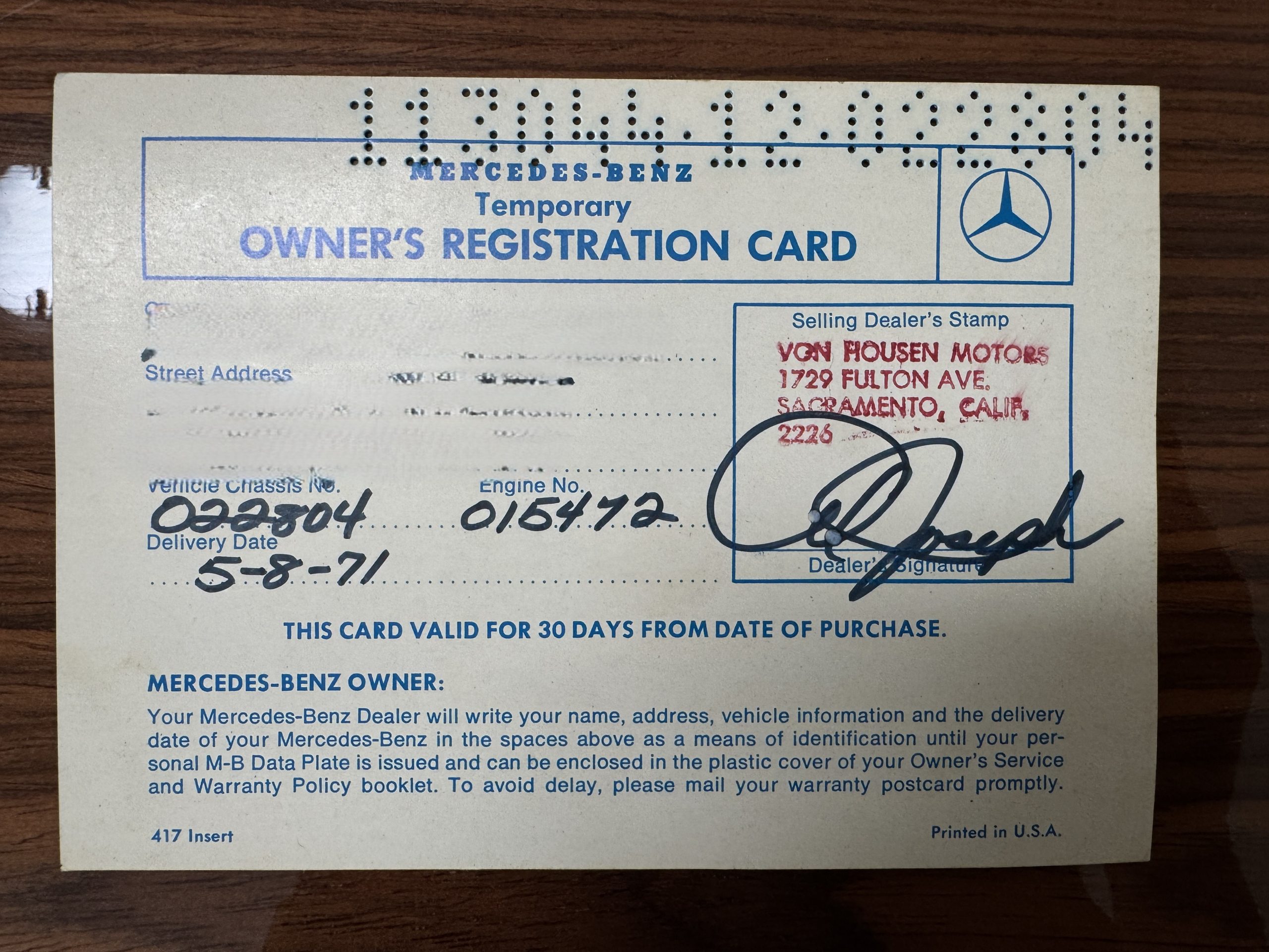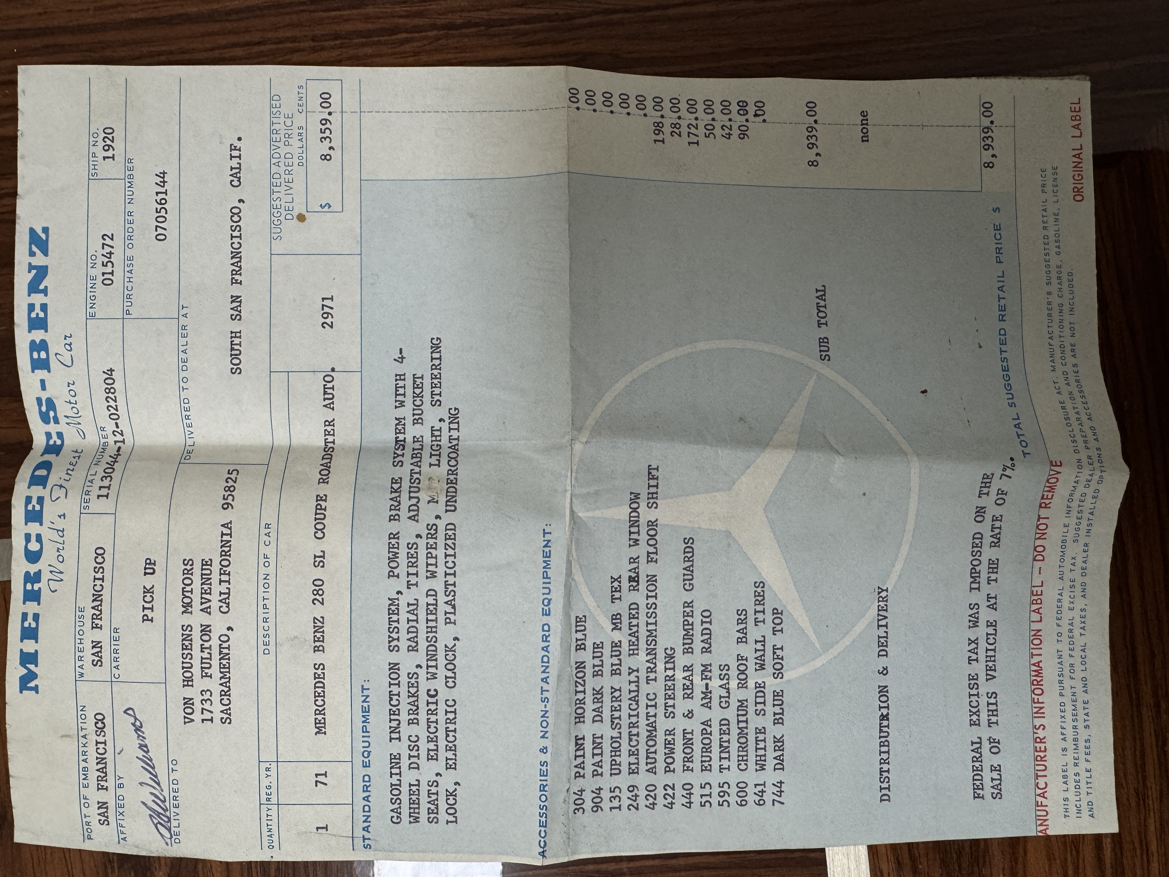 The Mercedes was purchased in May 1971 from Van Housen Motors in Sacramento making this a California “Blue-Plate” car. The Mercedes was originally purchased and continued to be owned by one family! The current owner’s former father-in-law purchased the Mercedes to be his daily driver and passion while he built the most premier men’s clothing store in Sacramento. Towards the end of his lifetime, the Mercedes was gifted to his son. The son and his wife cherished the Mercedes and completed the restoration together from 2011 to 2013. The Mercedes was serviced and restored by Stephens Service Center in Sacramento since 1993. Their design for the restoration was to be just below concours level but a high-quality beautiful restoration yet drivable for them to enjoy together while they resided in Napa Valley, California. His wife is the sole owner since he passed and is ready to see someone else enjoy the beloved family Mercedes to make their own beautiful memories.