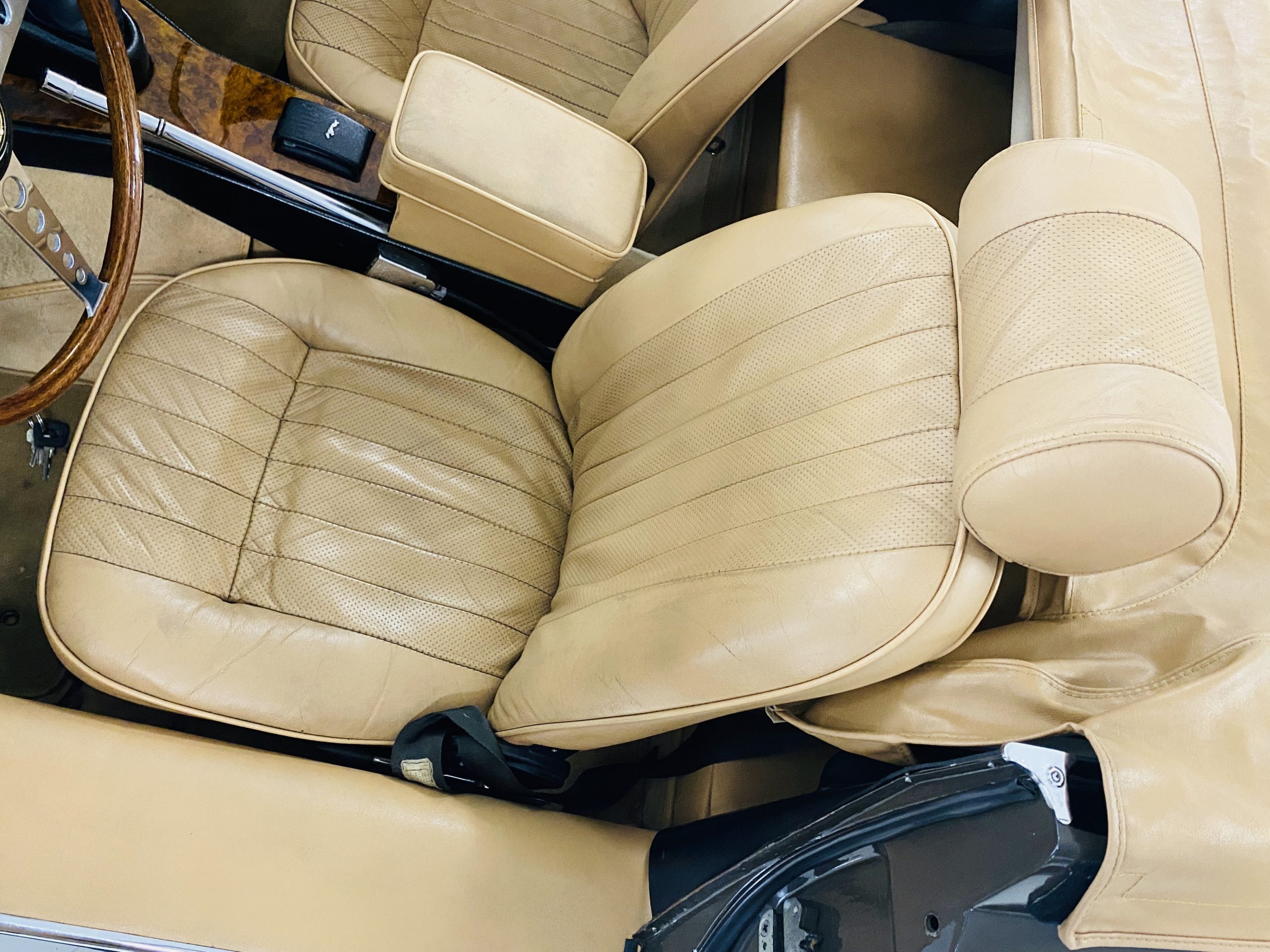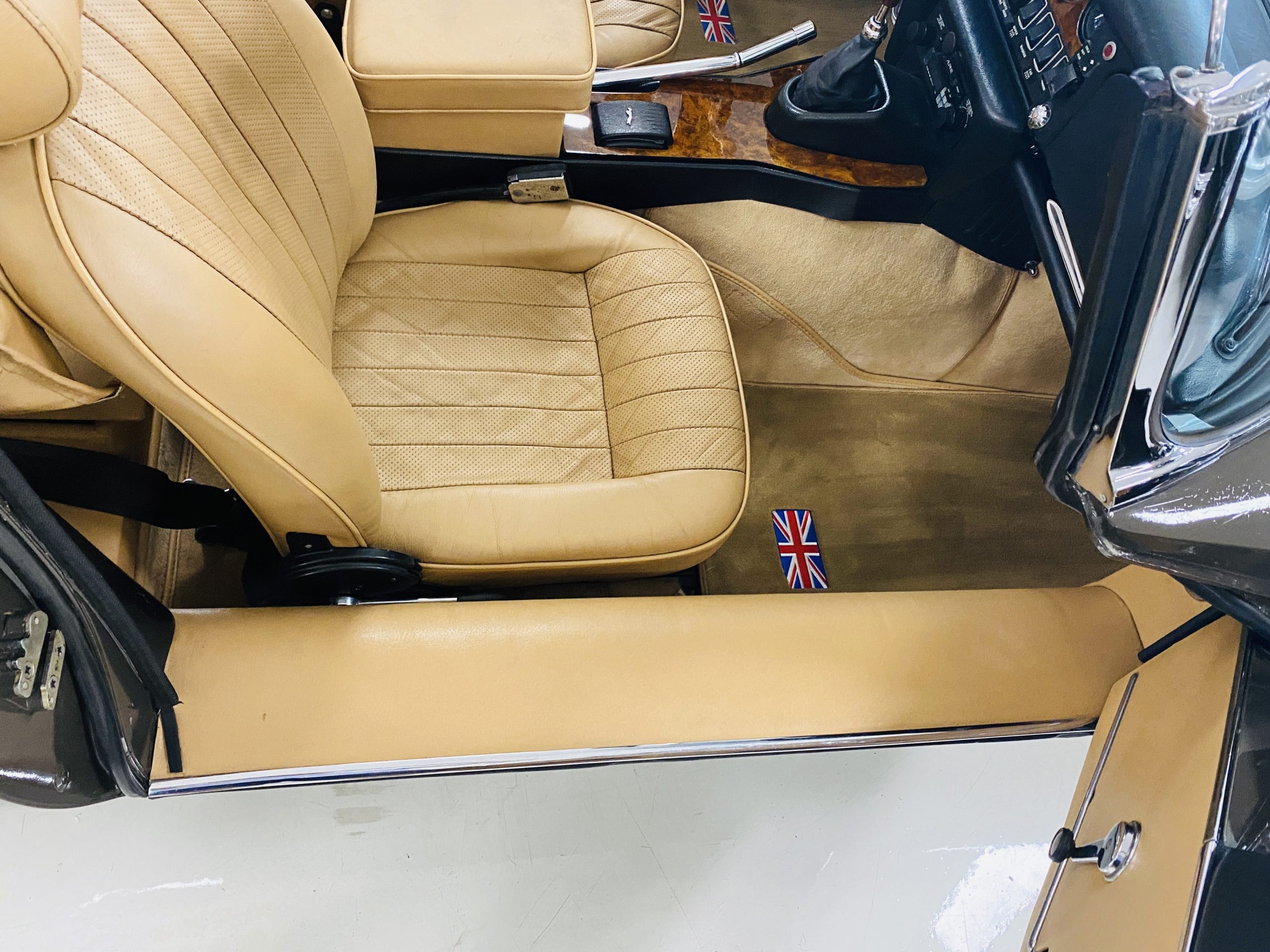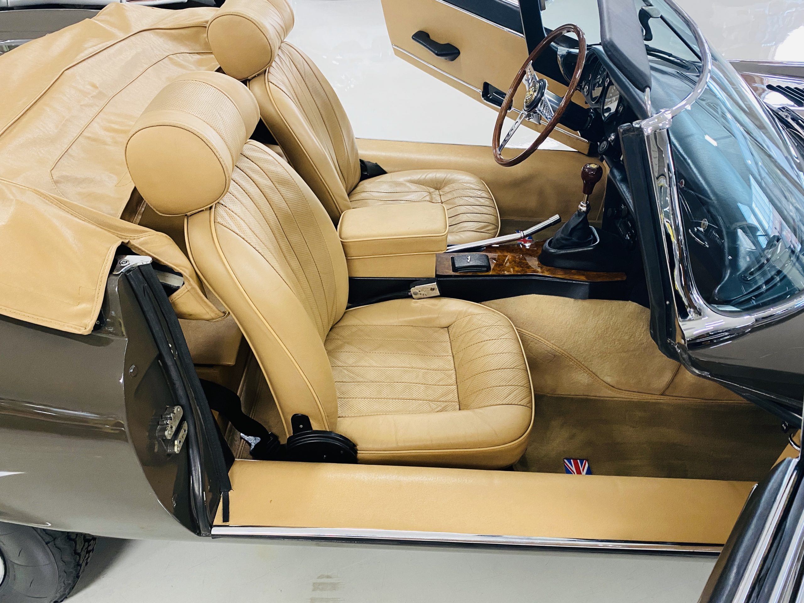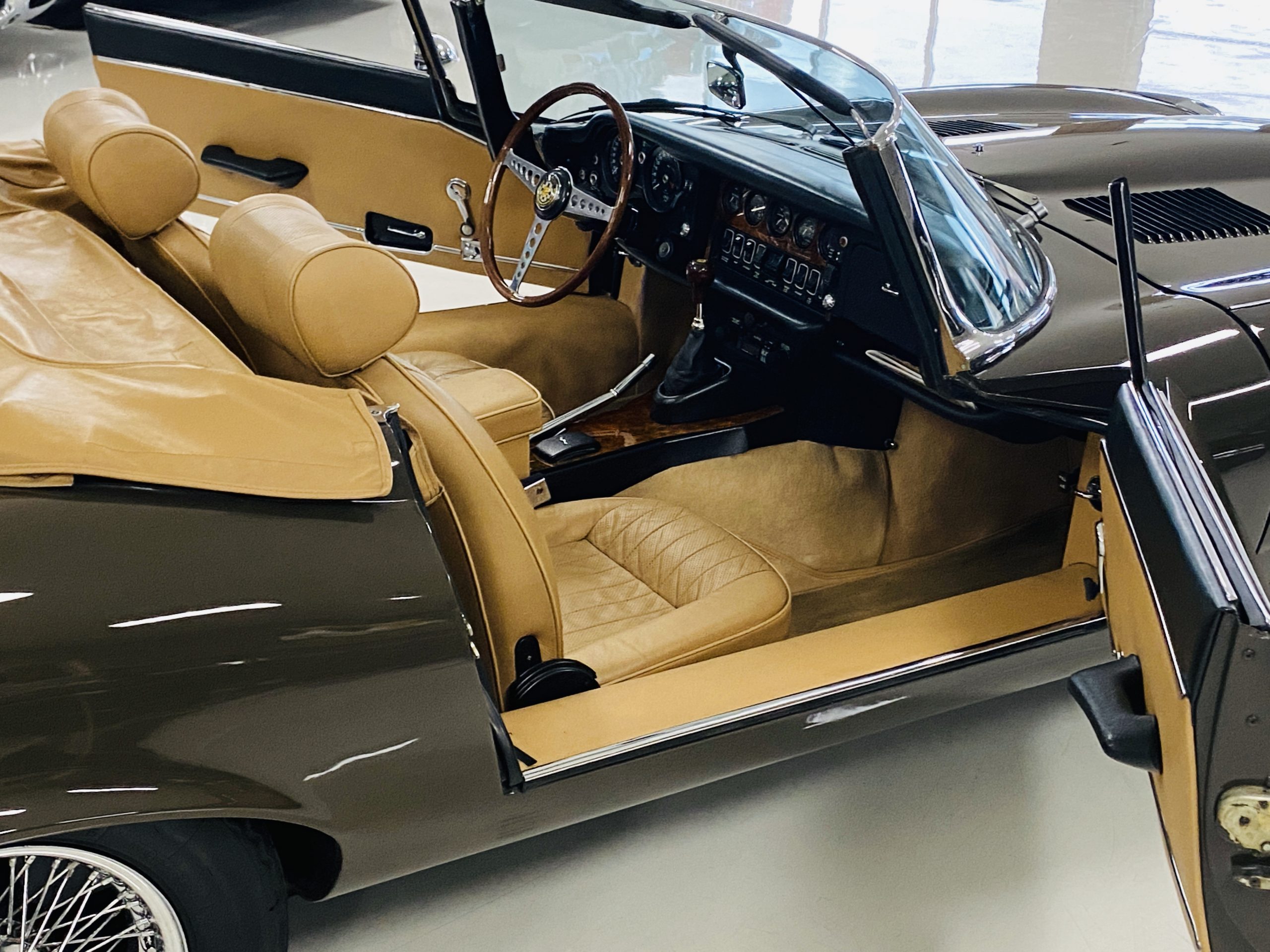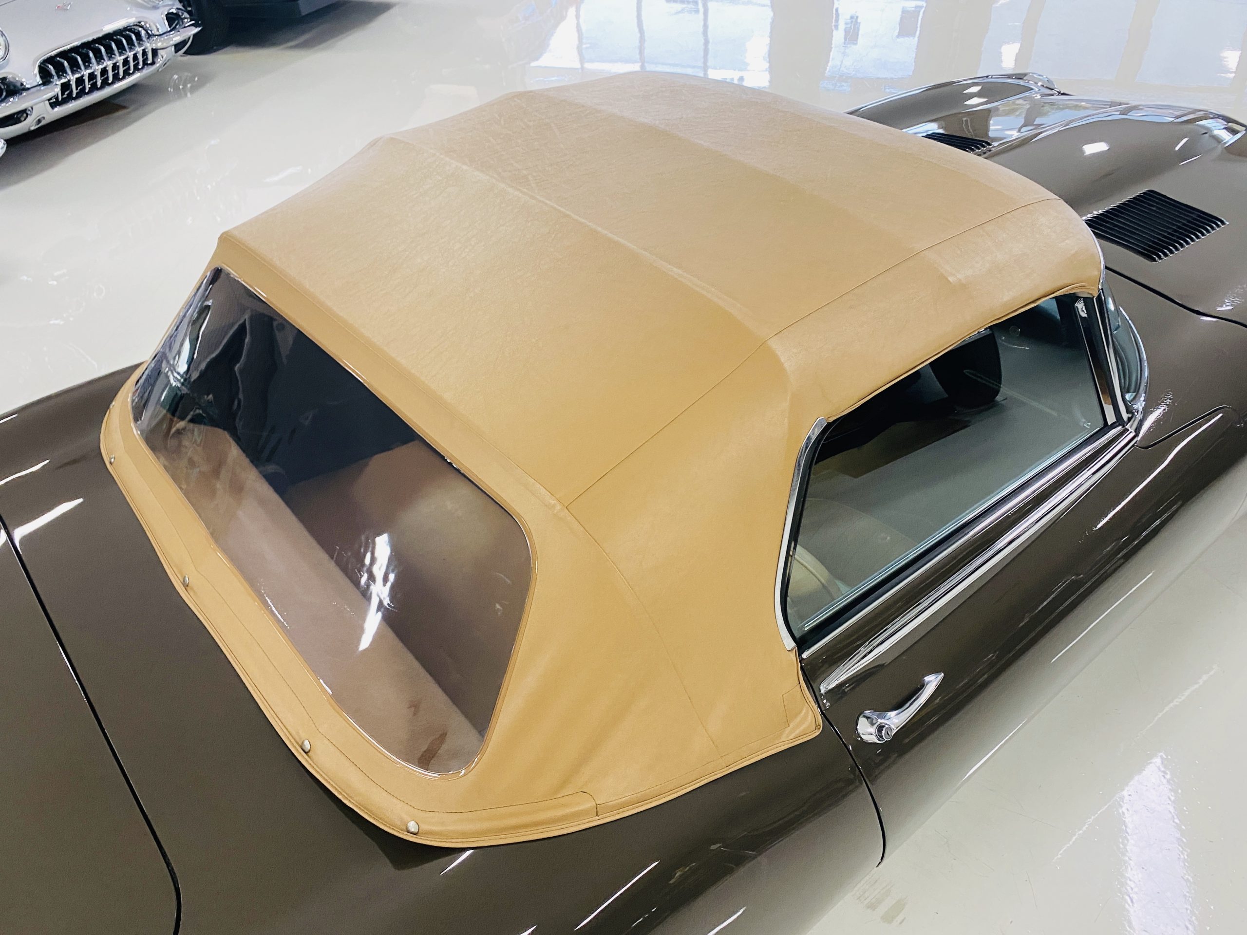 The Sable Brown livery is beautiful. Over the years much of the paint has been touched up leaving about one-quarter of the paint being original. There are several areas where there is normal lacquer cracking evident which we highlight in our video inspection. The overall presentation is stunning and, in our opinion, this would not be a car to repaint as it is 48 years old and still has a gorgeous luster and shine without any areas of paint rubbed through to primer. The paint is complimented with its all original chrome that is as-new. From the sculpted headlight surrounds, the “small” bumpers, the wire wheels to the door handles, the chrome on this Jaguar is in showroom condition. The convertible top was replaced 18 years ago, but is in absolutely excellent condition.