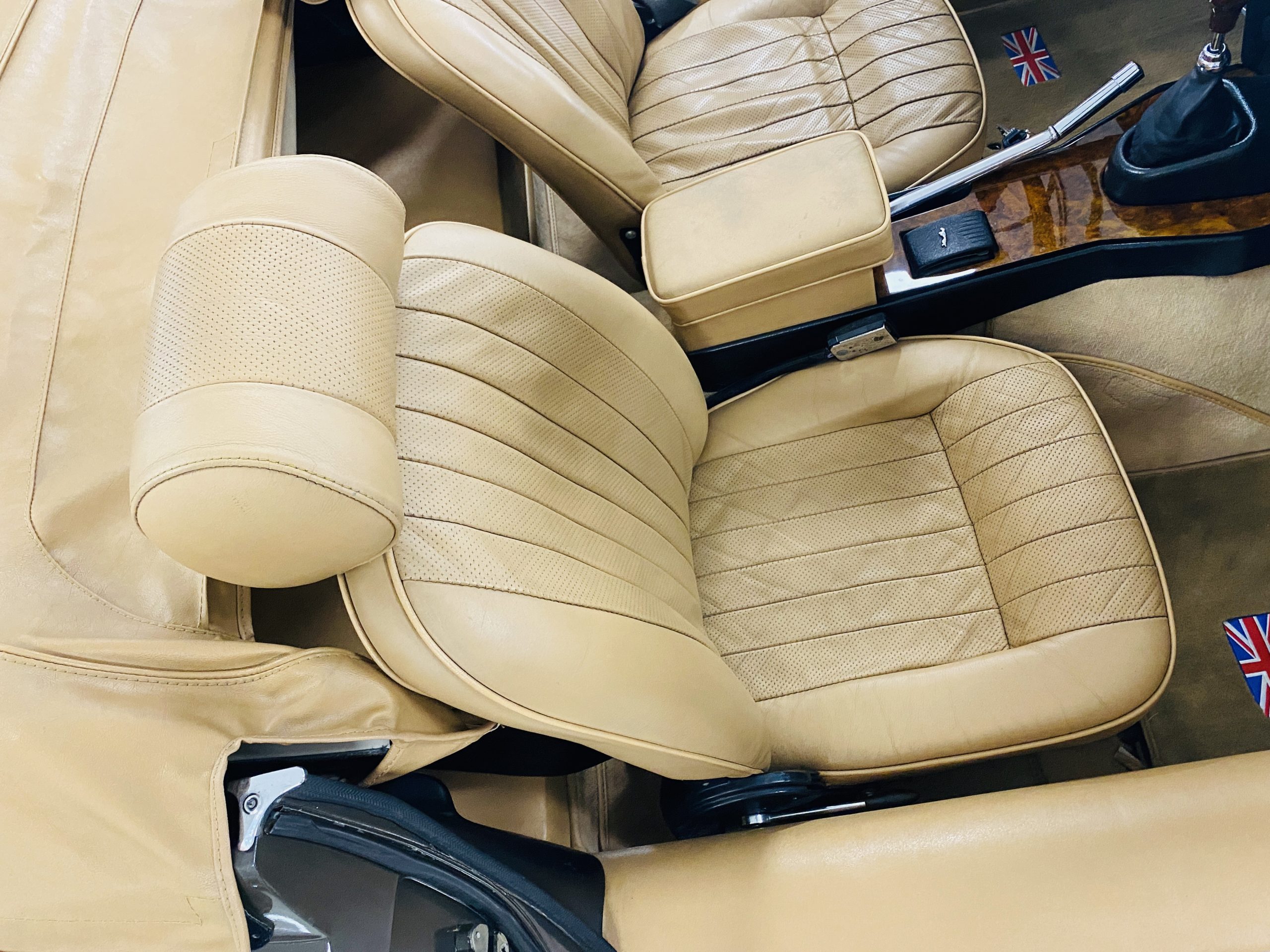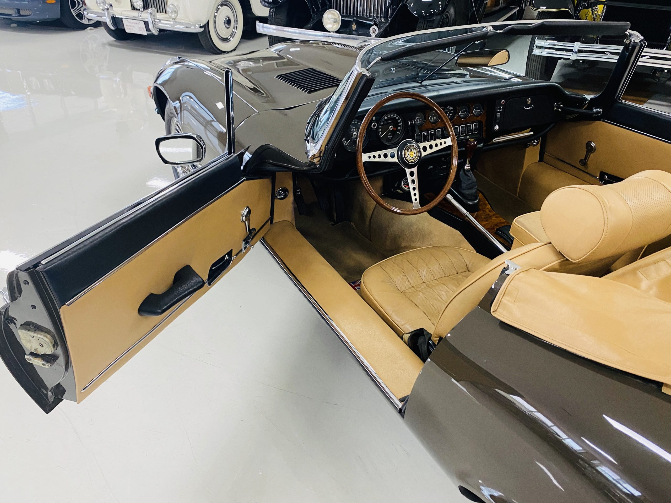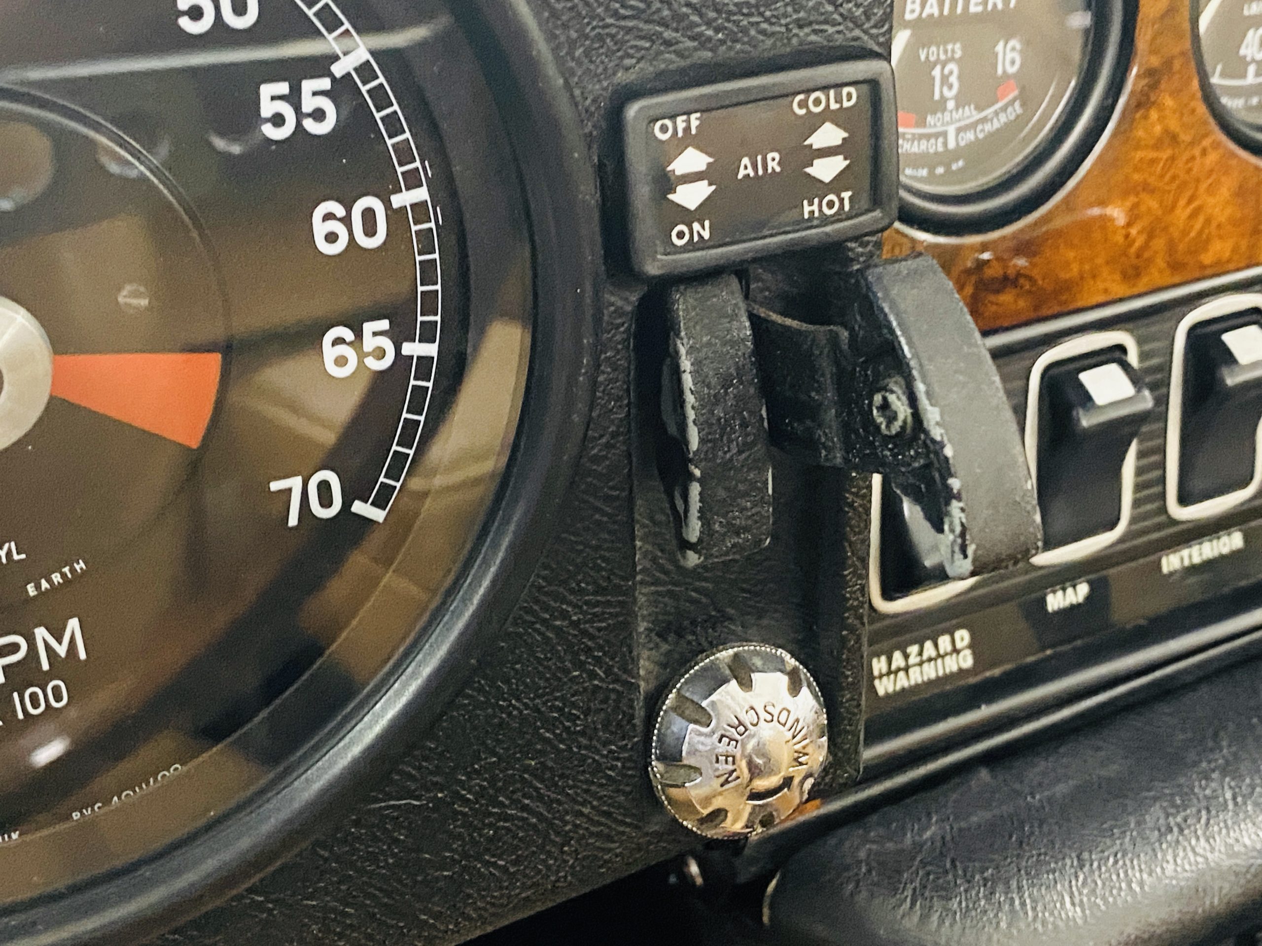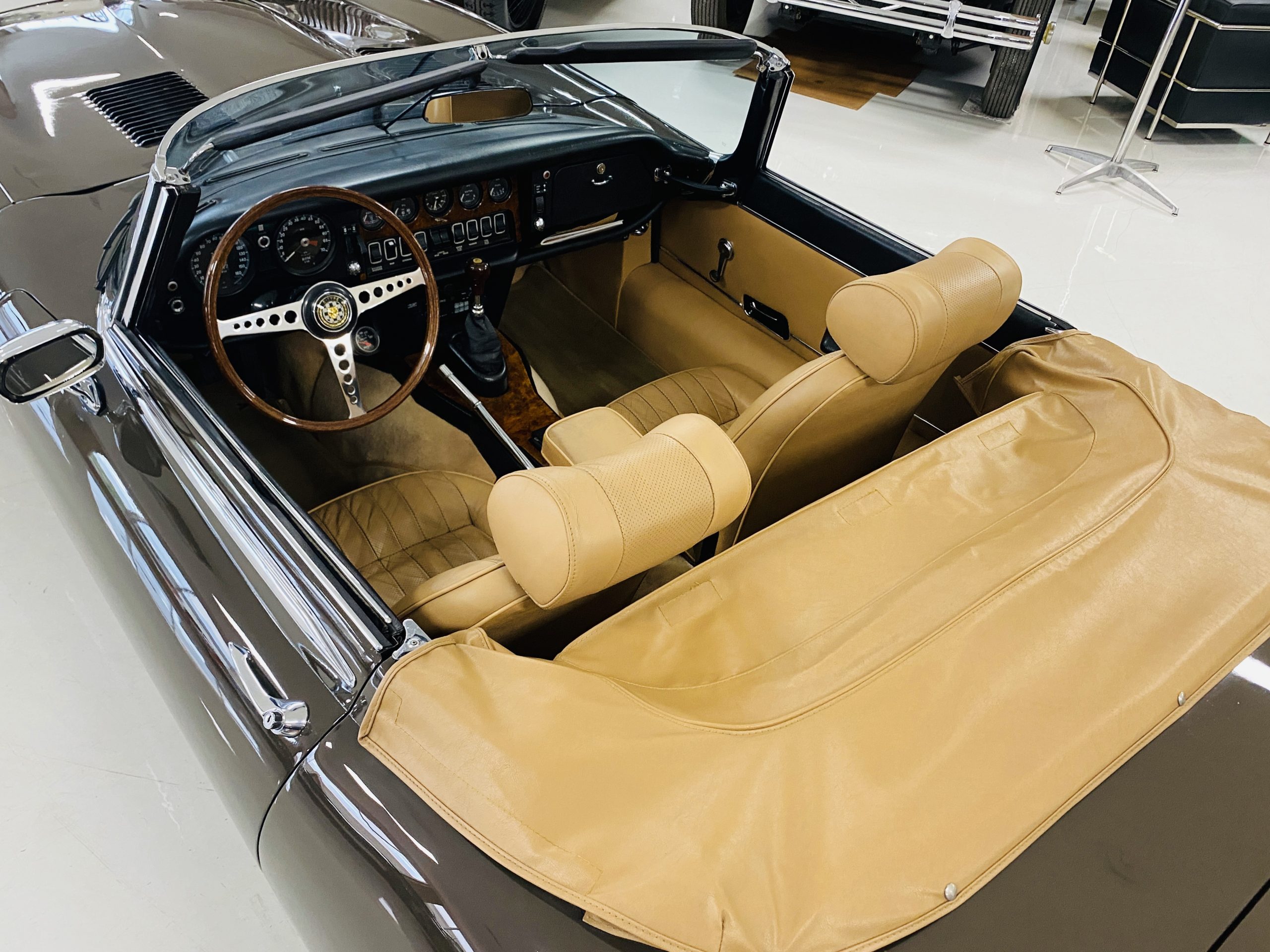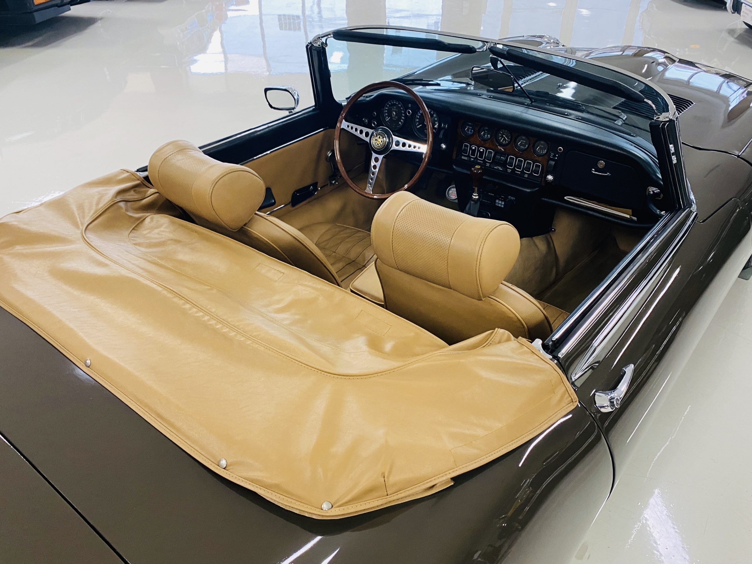 The Sable Brown livery is beautiful. Over the years much of the paint has been touched up leaving about one-quarter of the paint being original. There are several areas where there is normal lacquer cracking evident which we highlight in our video inspection. The overall presentation is stunning and, in our opinion, this would not be a car to repaint as it is 48 years old and still has a gorgeous luster and shine without any areas of paint rubbed through to primer. The paint is complimented with its all original chrome that is as-new. From the sculpted headlight surrounds, the “small” bumpers, the wire wheels to the door handles, the chrome on this Jaguar is in showroom condition. The convertible top was replaced 18 years ago, but is in absolutely excellent condition.
