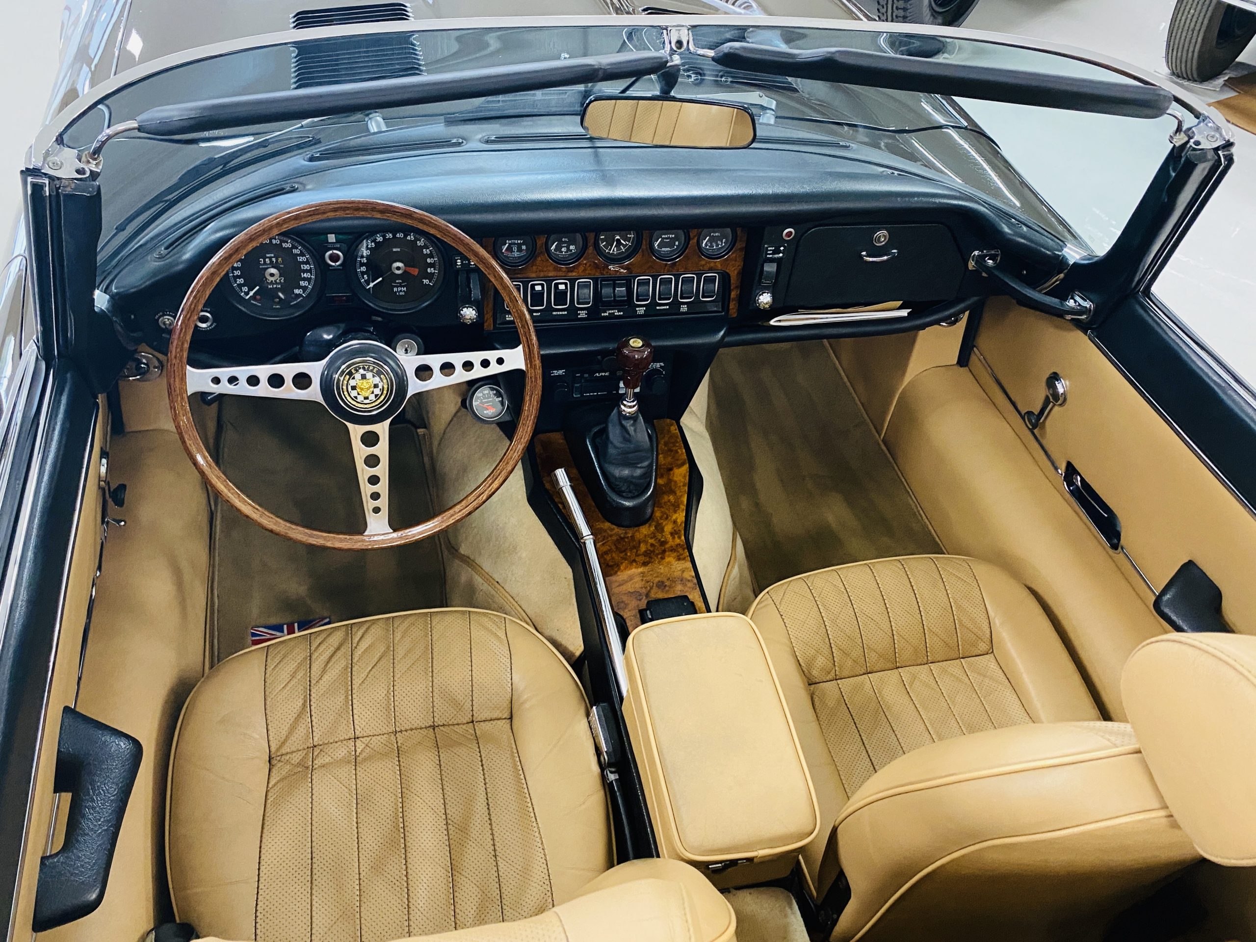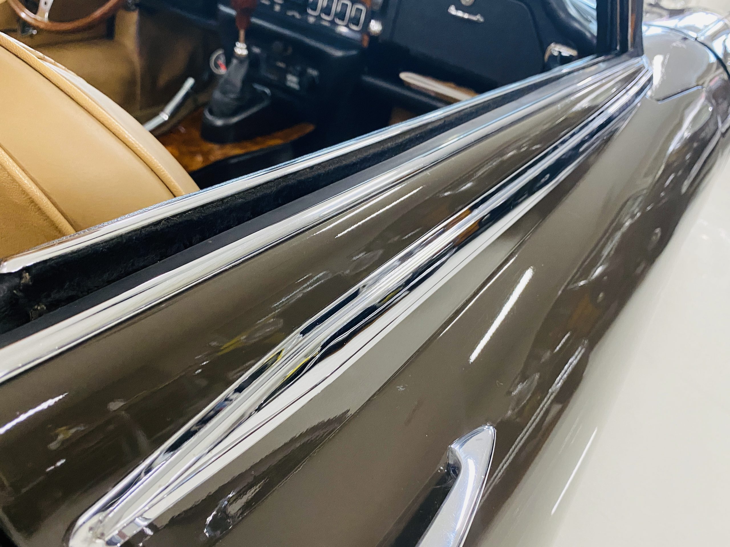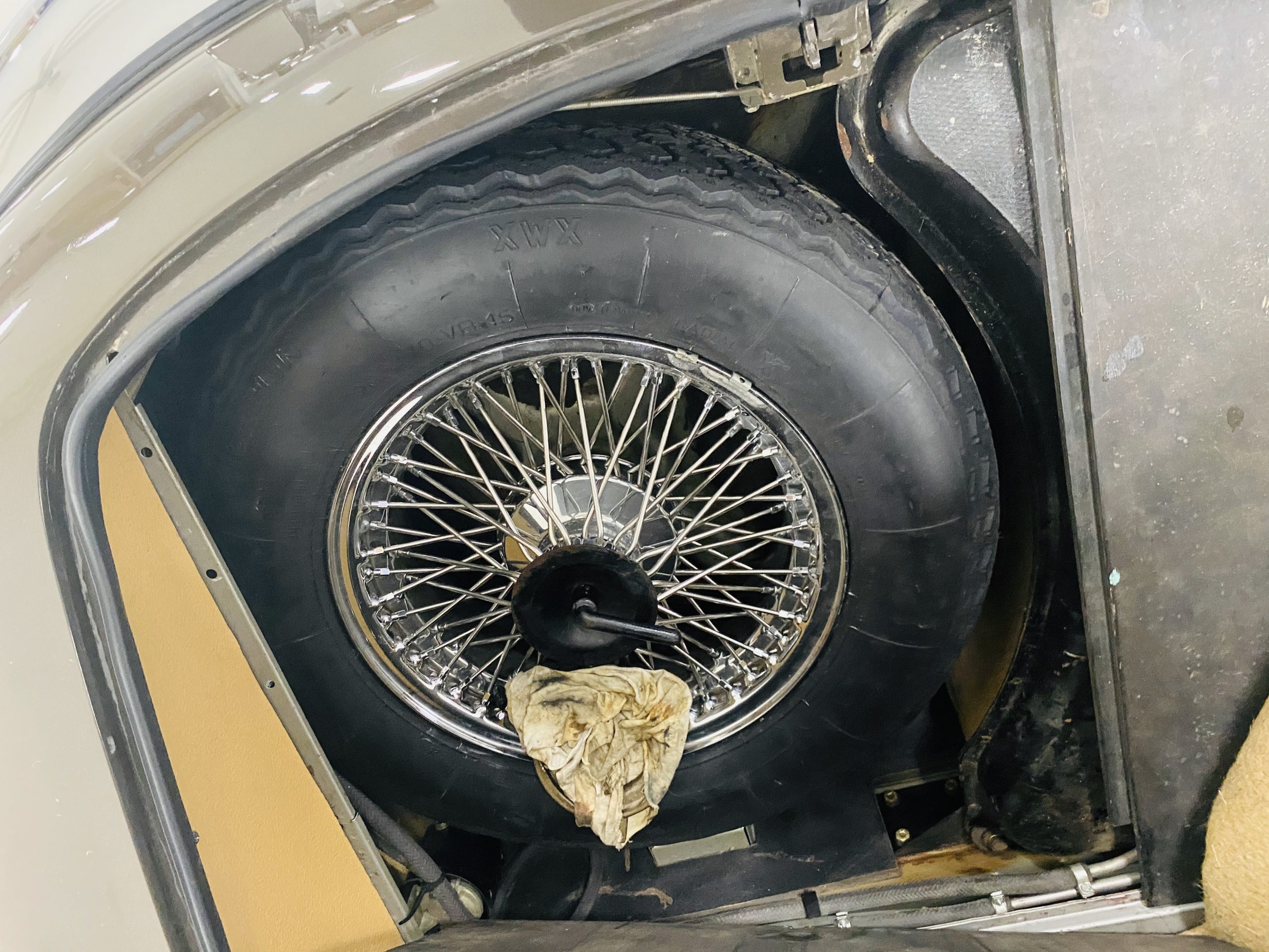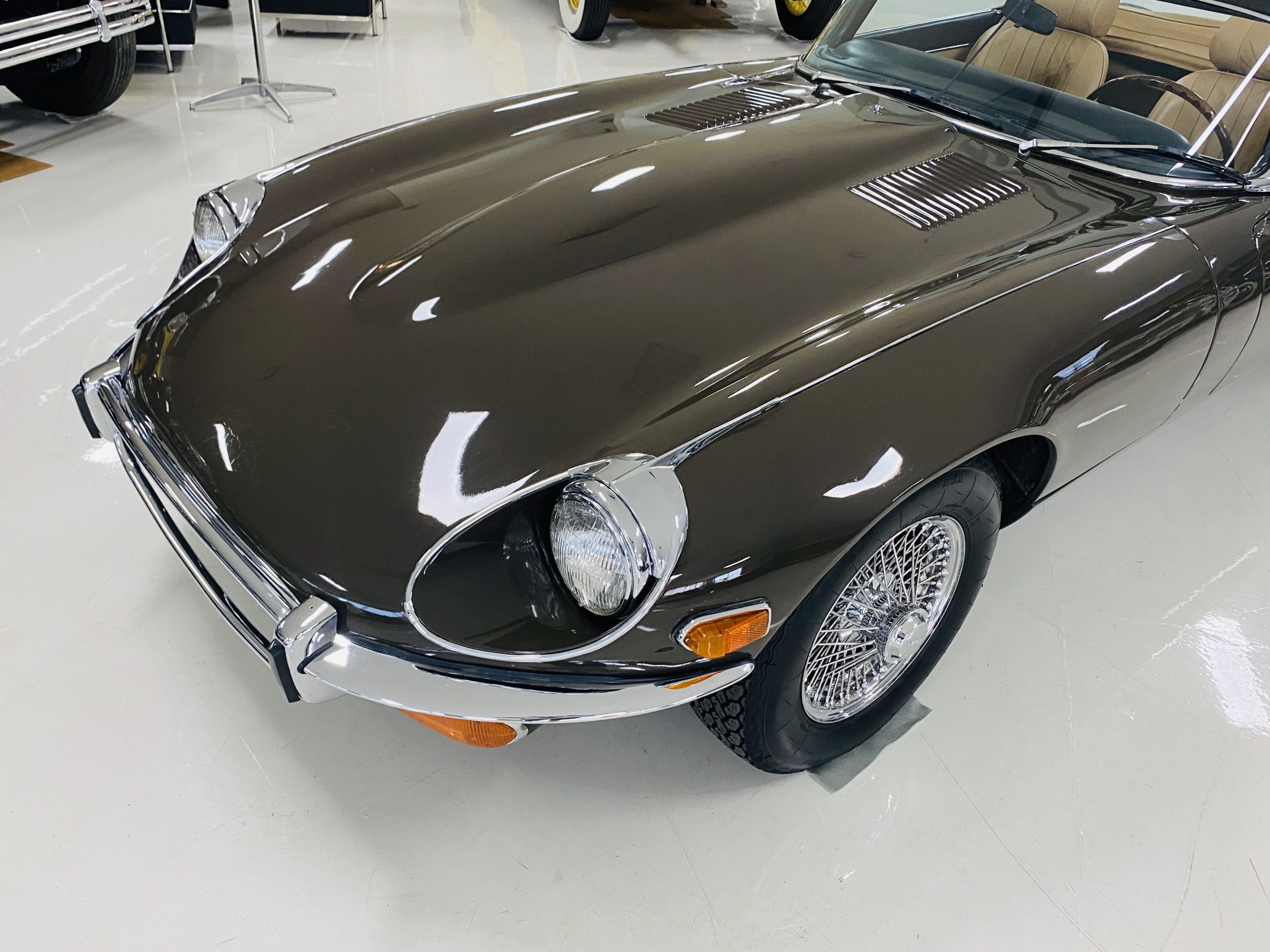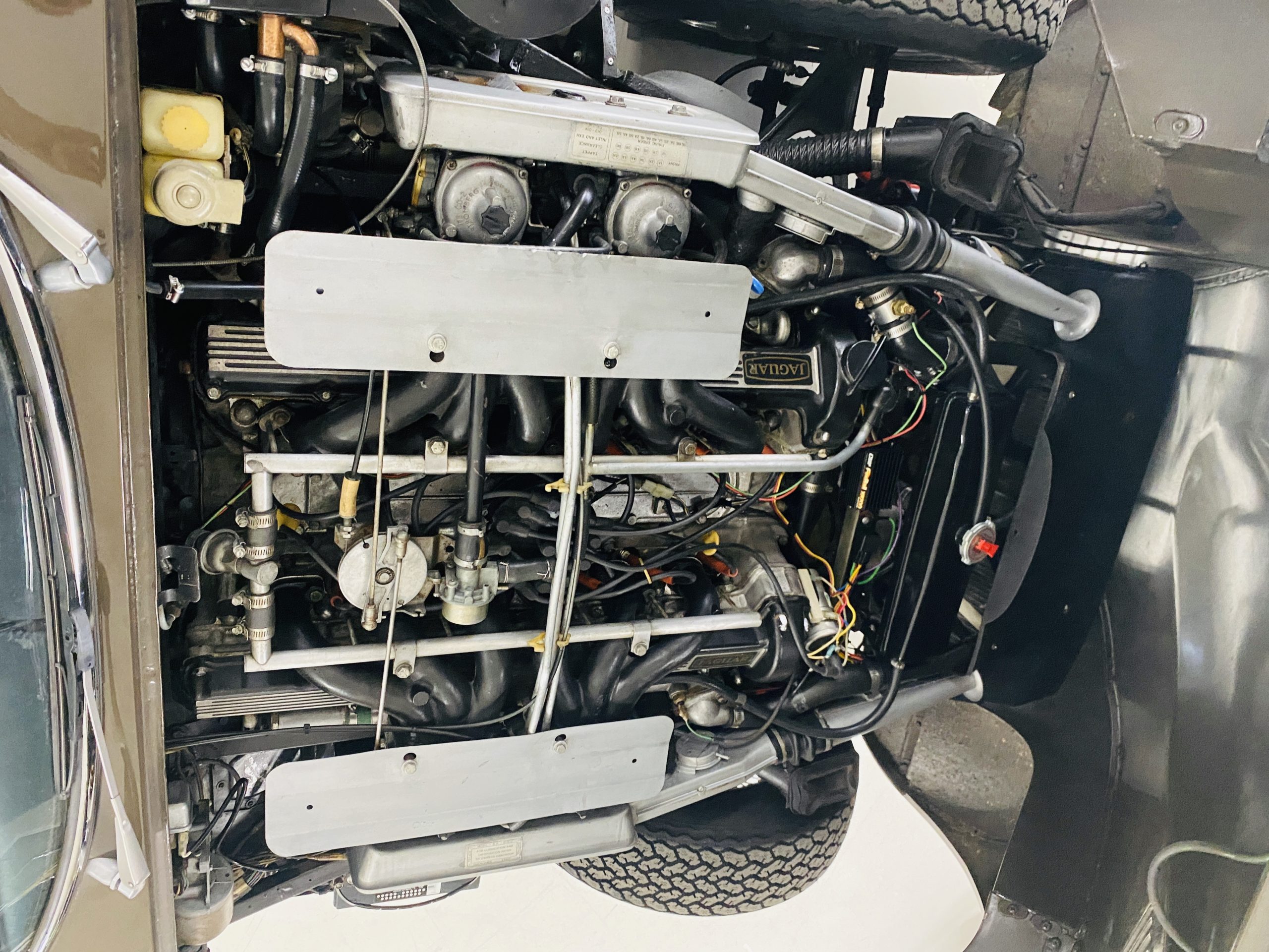 The Sable Brown livery is beautiful. Over the years much of the paint has been touched up leaving about one-quarter of the paint being original. There are several areas where there is normal lacquer cracking evident which we highlight in our video inspection. The overall presentation is stunning and, in our opinion, this would not be a car to repaint as it is 48 years old and still has a gorgeous luster and shine without any areas of paint rubbed through to primer. The paint is complimented with its all original chrome that is as-new. From the sculpted headlight surrounds, the “small” bumpers, the wire wheels to the door handles, the chrome on this Jaguar is in showroom condition. The convertible top was replaced 18 years ago, but is in absolutely excellent condition.
