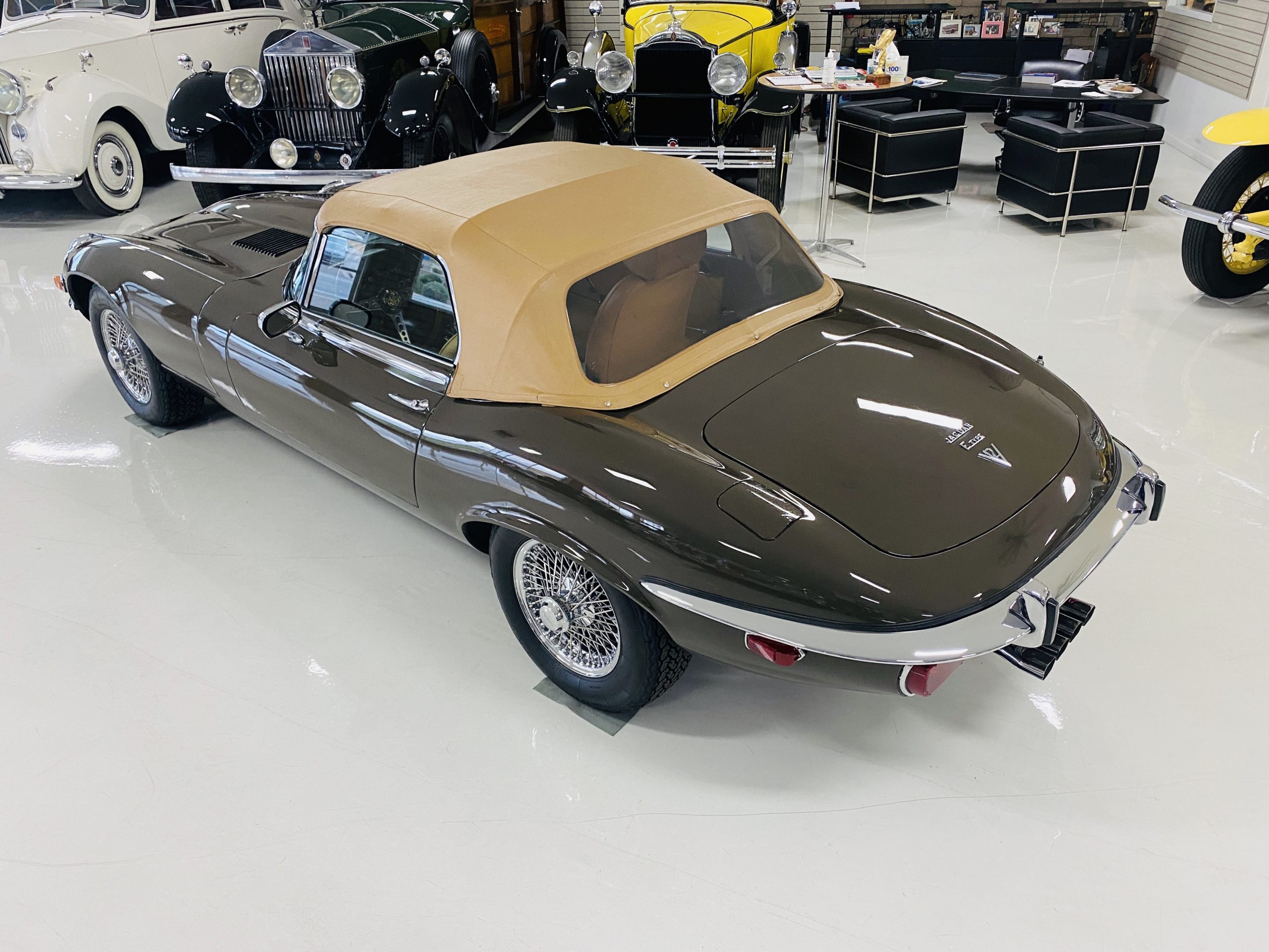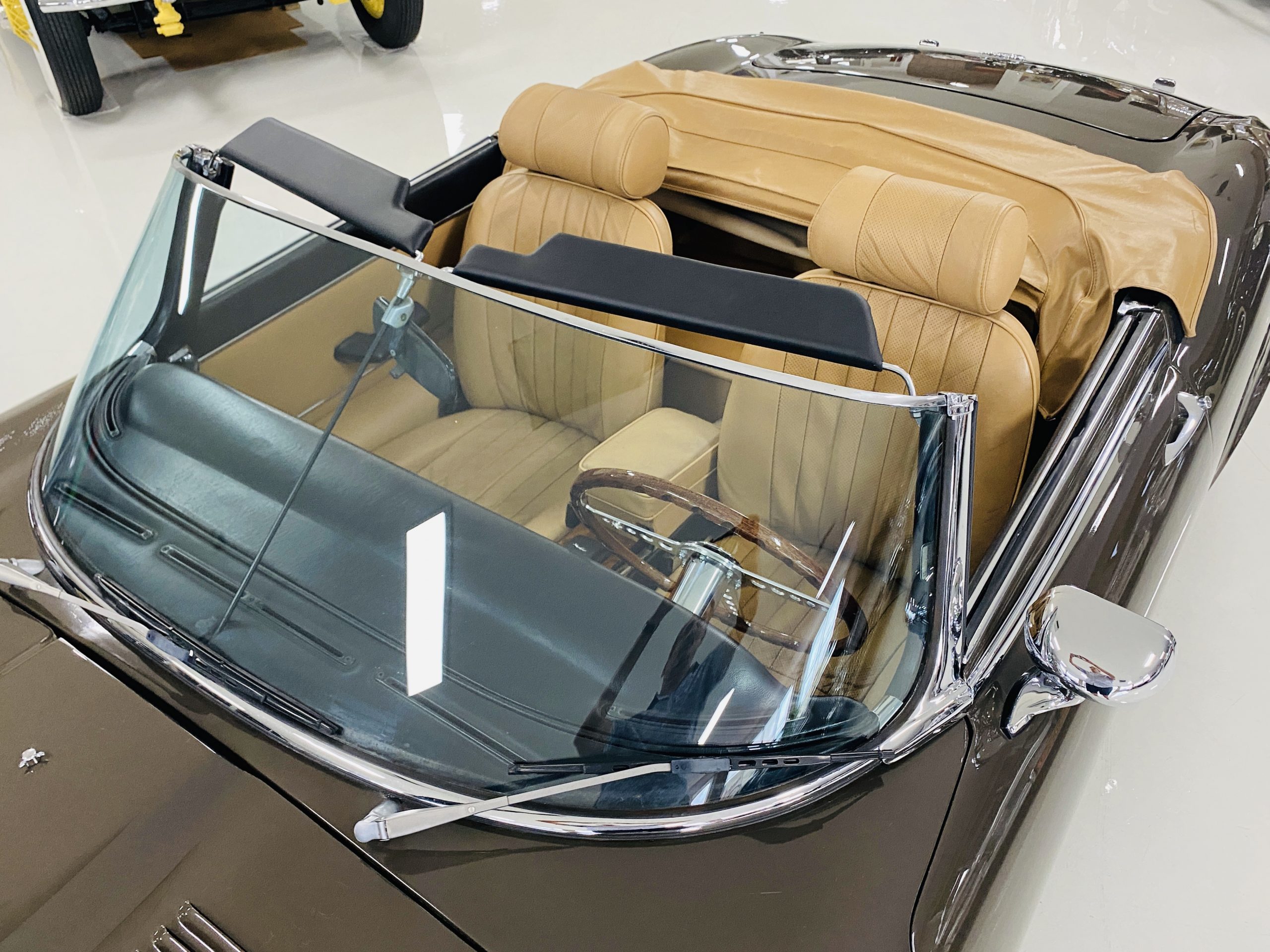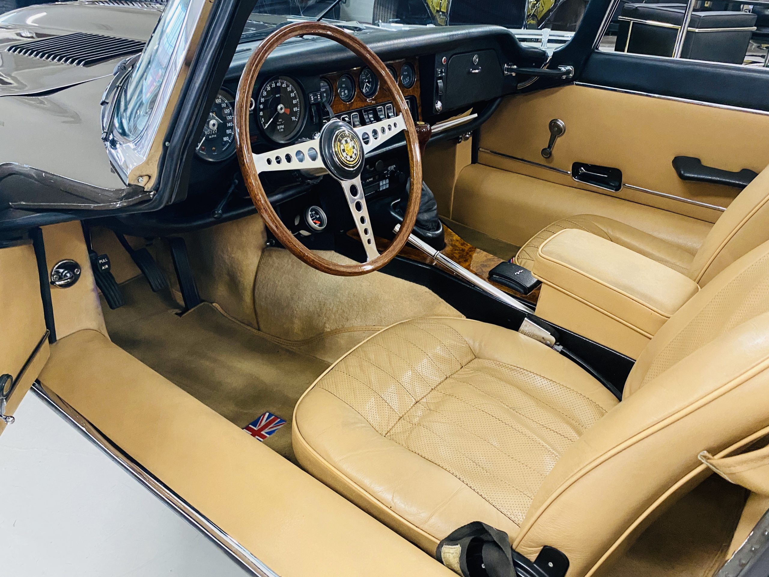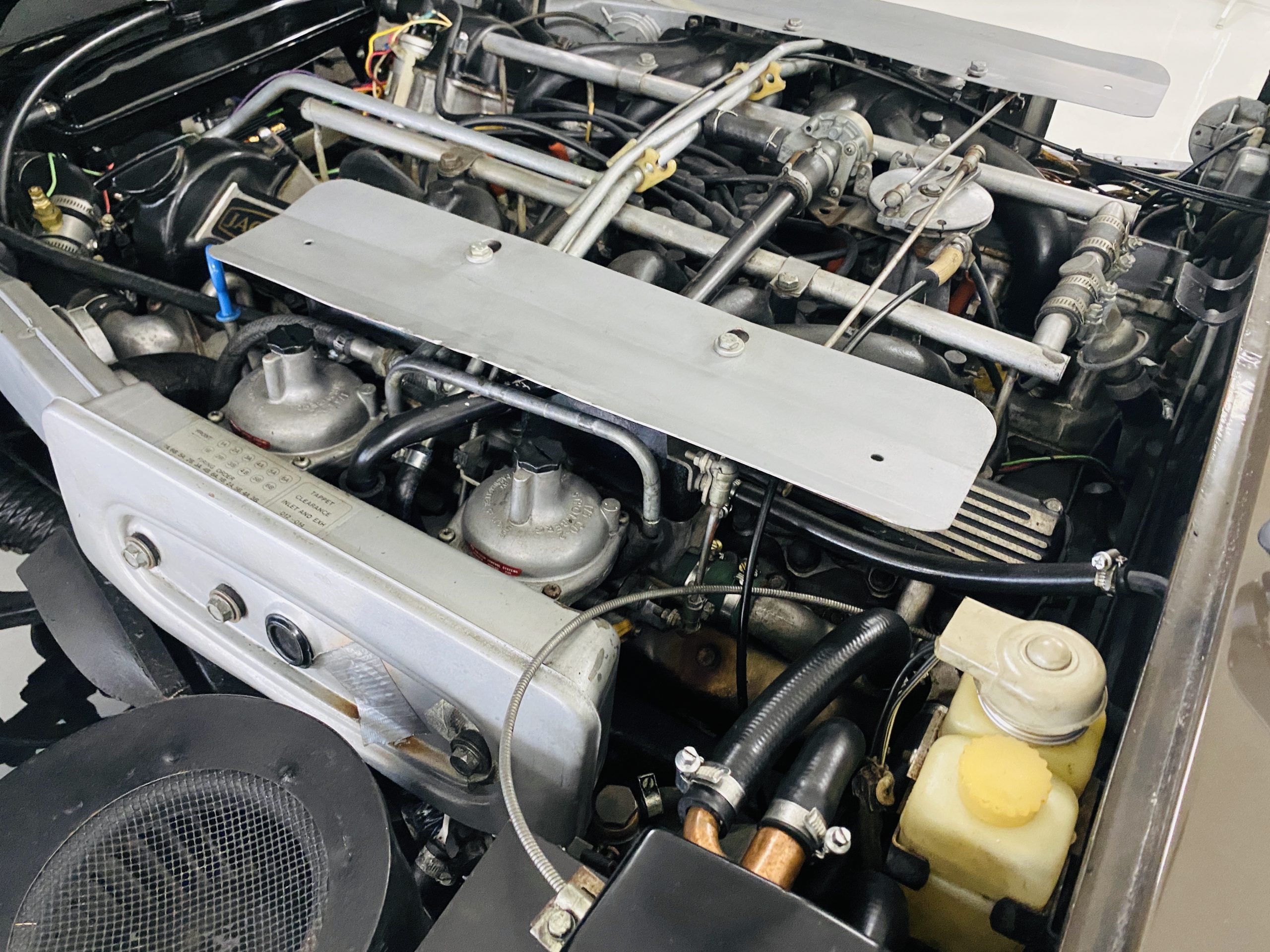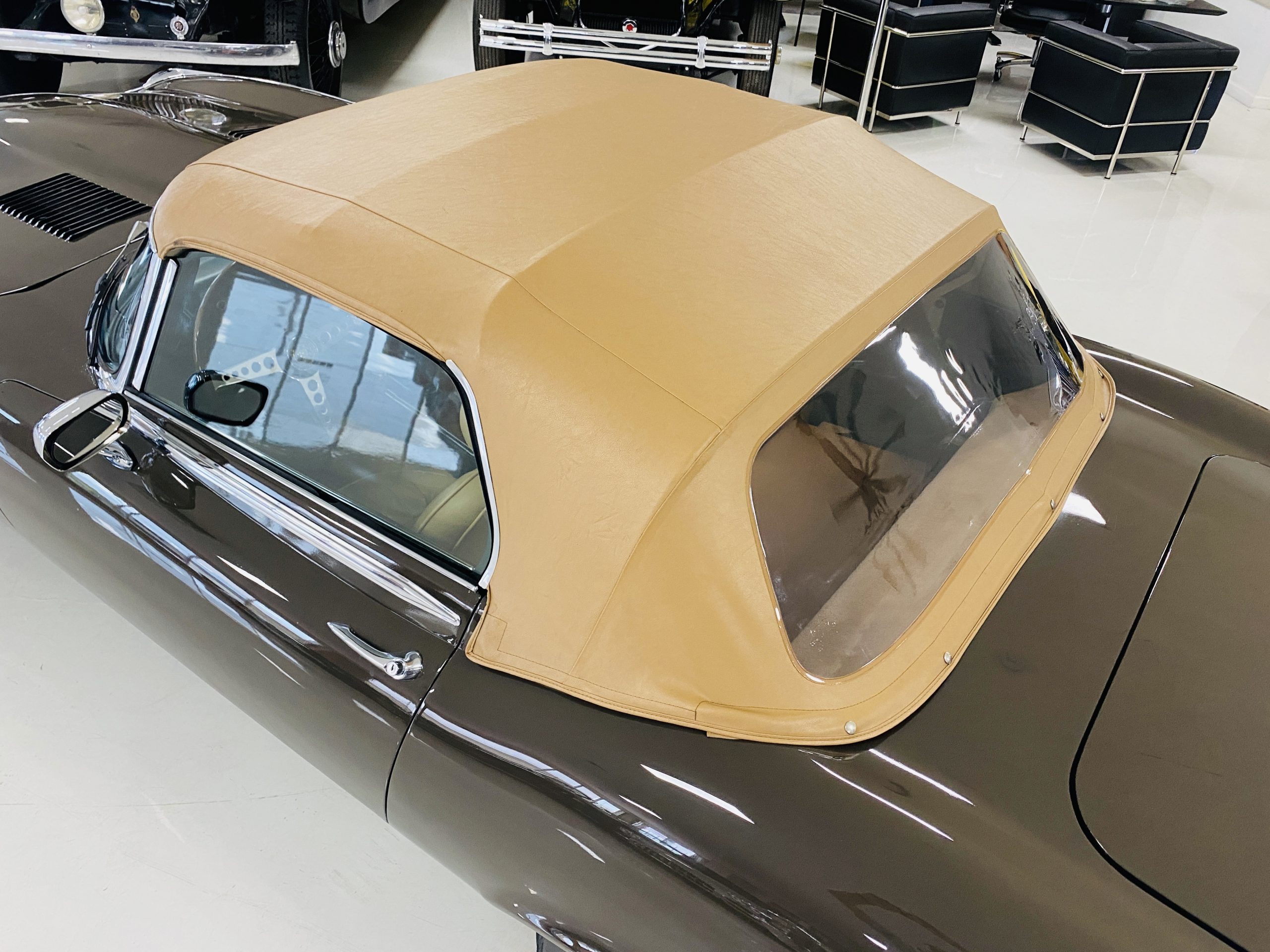 The Sable Brown livery is beautiful. Over the years much of the paint has been touched up leaving about one-quarter of the paint being original. There are several areas where there is normal lacquer cracking evident which we highlight in our video inspection. The overall presentation is stunning and, in our opinion, this would not be a car to repaint as it is 48 years old and still has a gorgeous luster and shine without any areas of paint rubbed through to primer. The paint is complimented with its all original chrome that is as-new. From the sculpted headlight surrounds, the “small” bumpers, the wire wheels to the door handles, the chrome on this Jaguar is in showroom condition. The convertible top was replaced 18 years ago, but is in absolutely excellent condition.