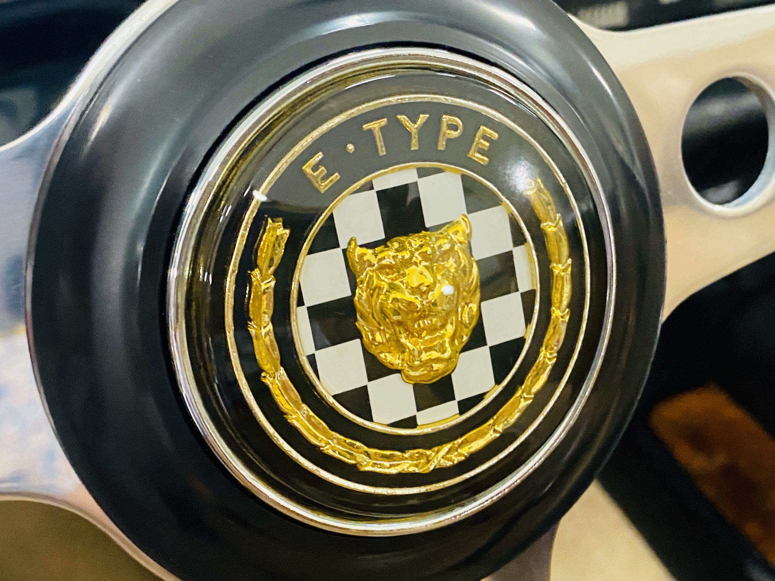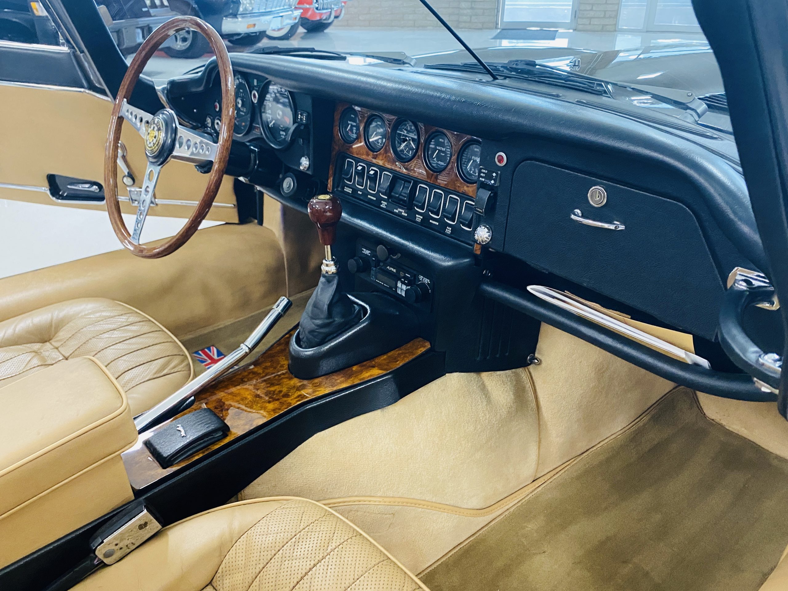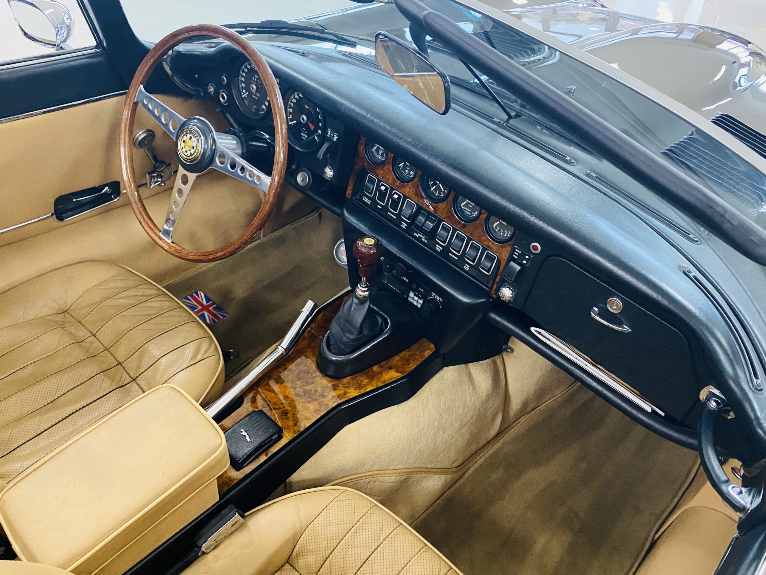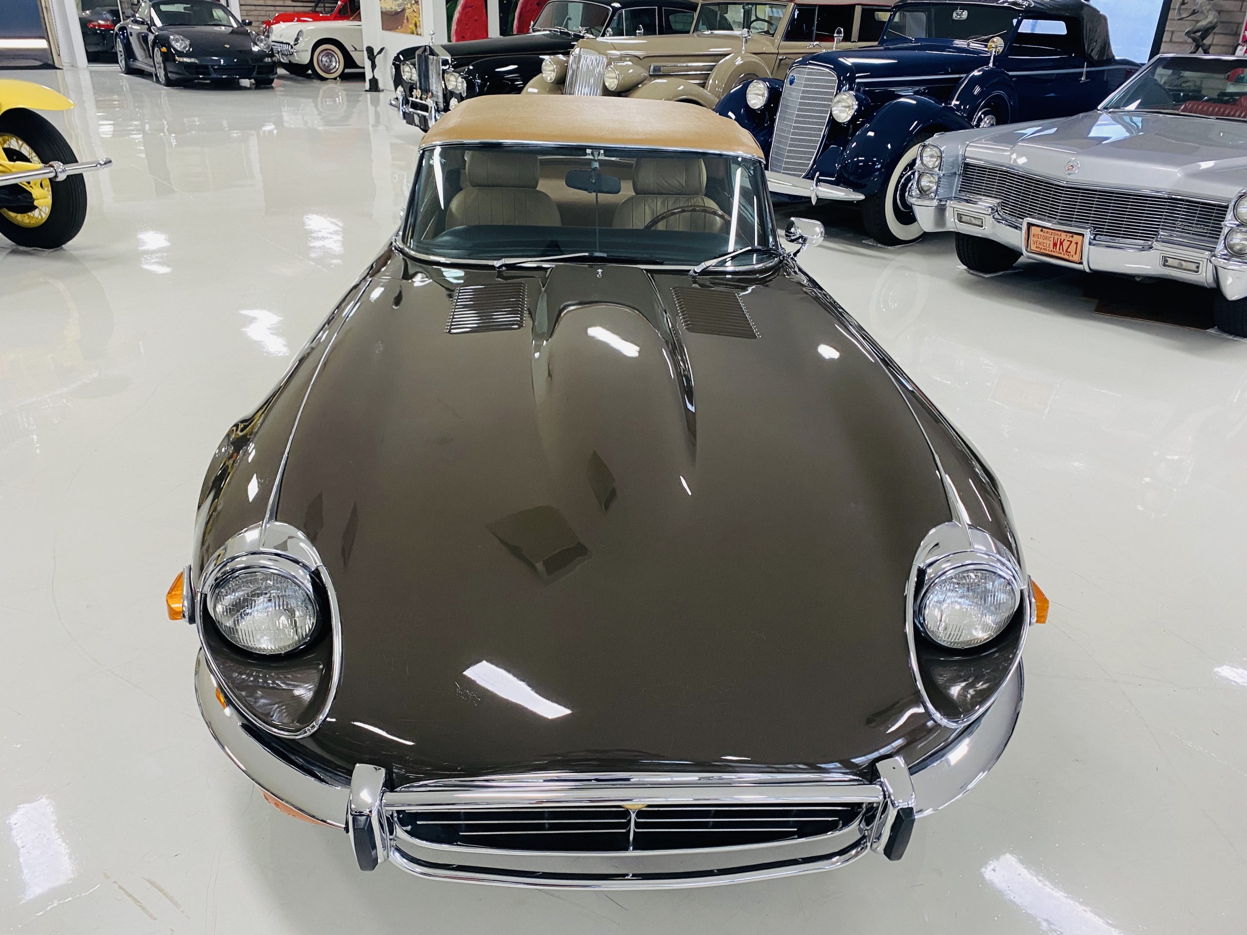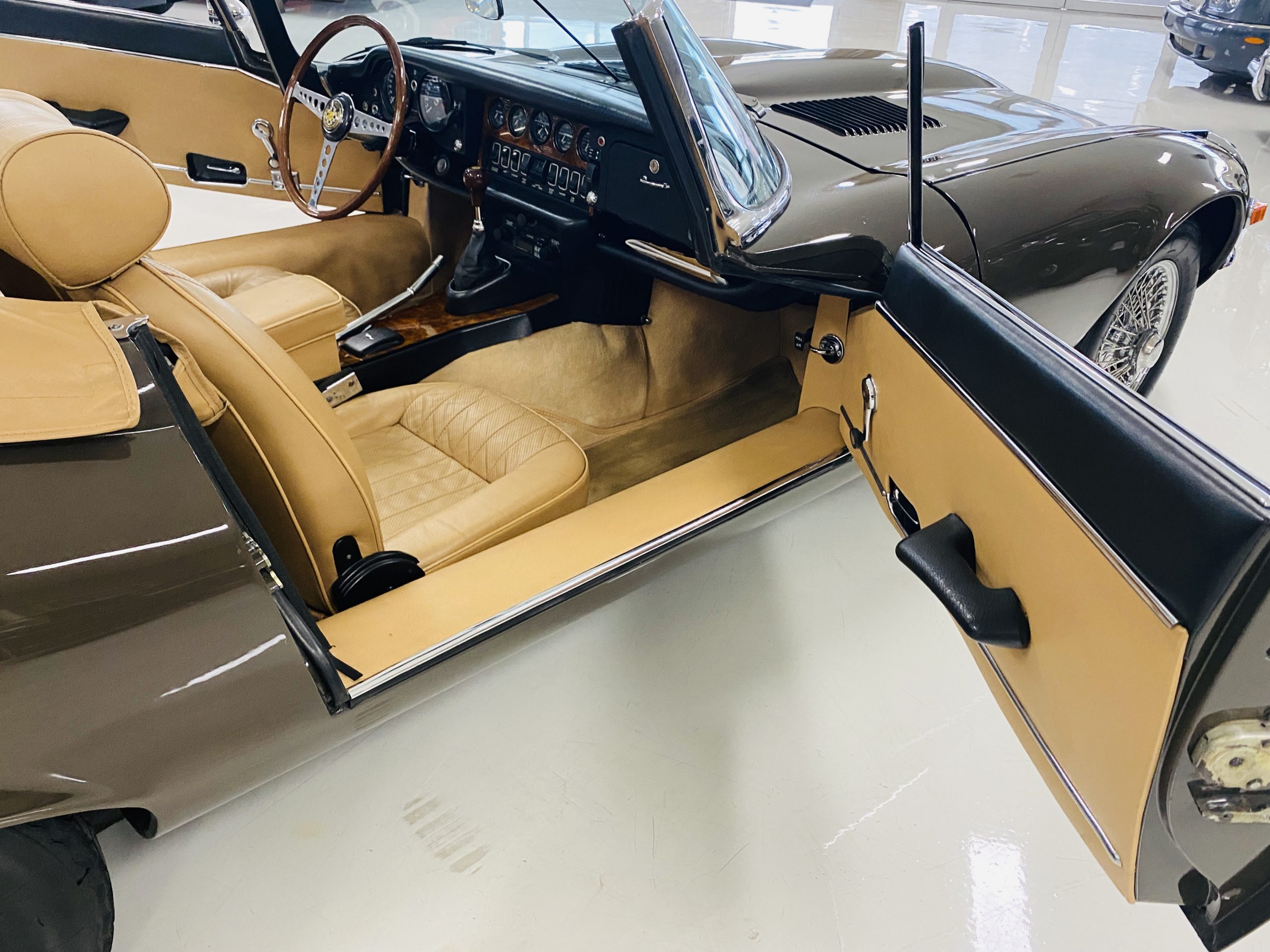 The Sable Brown livery is beautiful. Over the years much of the paint has been touched up leaving about one-quarter of the paint being original. There are several areas where there is normal lacquer cracking evident which we highlight in our video inspection. The overall presentation is stunning and, in our opinion, this would not be a car to repaint as it is 48 years old and still has a gorgeous luster and shine without any areas of paint rubbed through to primer. The paint is complimented with its all original chrome that is as-new. From the sculpted headlight surrounds, the “small” bumpers, the wire wheels to the door handles, the chrome on this Jaguar is in showroom condition. The convertible top was replaced 18 years ago, but is in absolutely excellent condition.