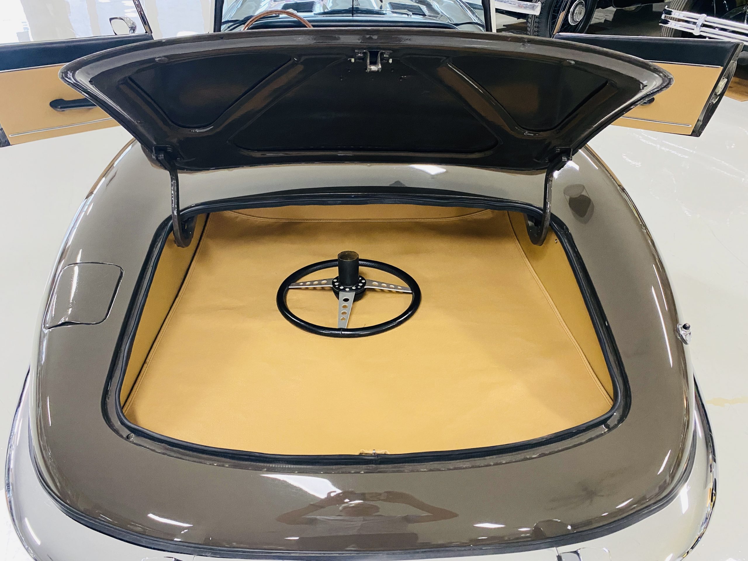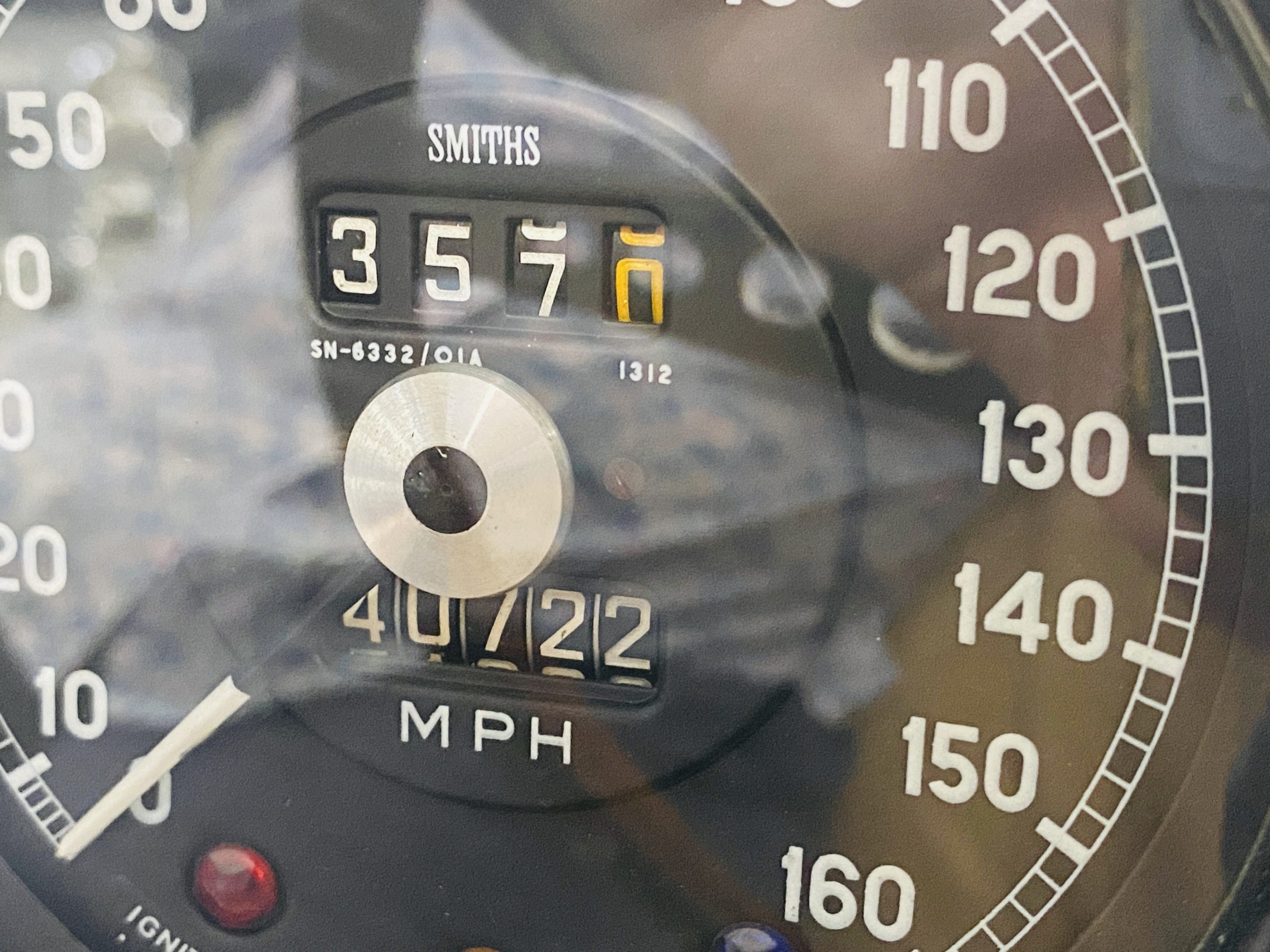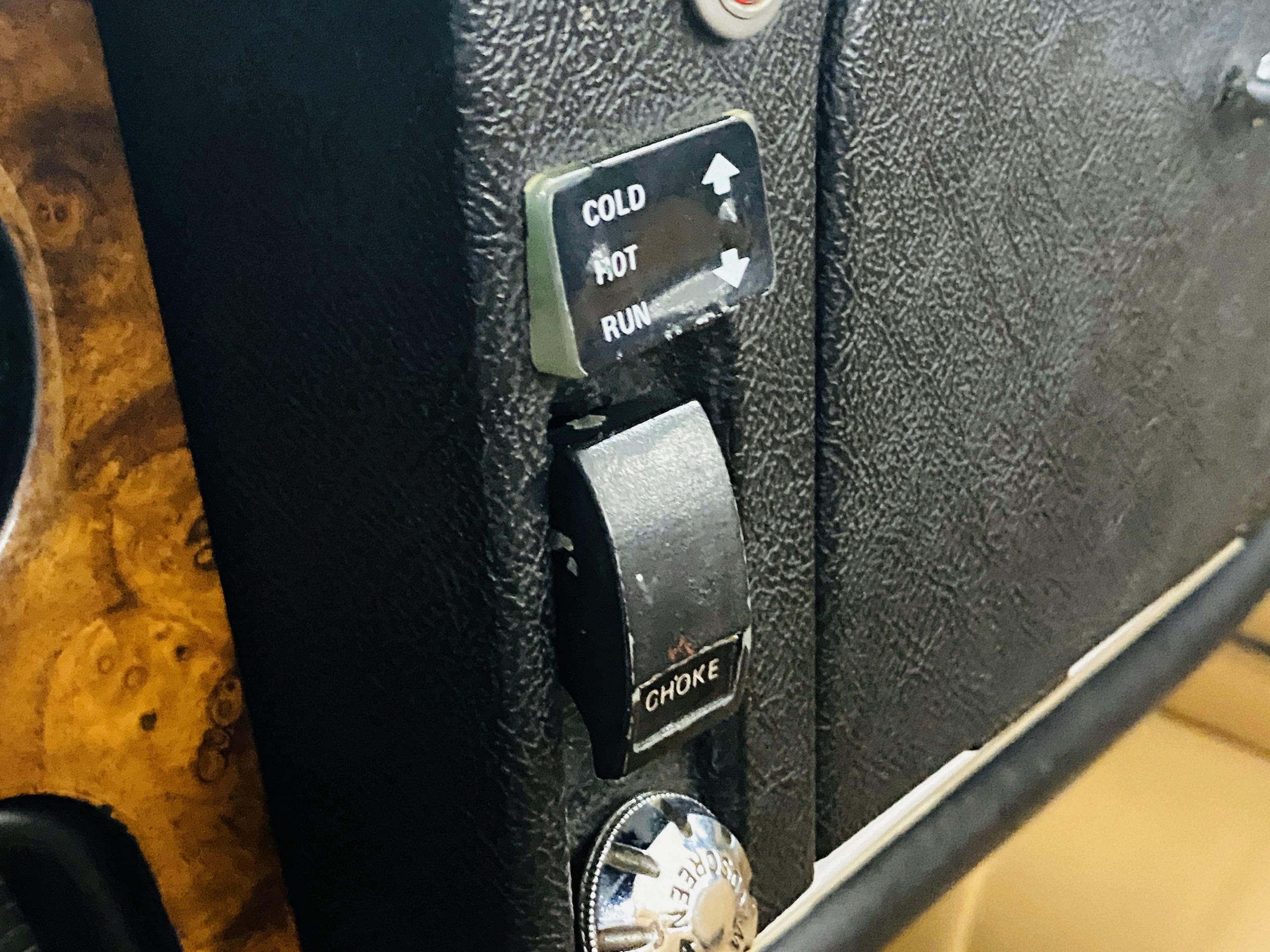 The iconic dashboard is all original and without cracks or markings. The instruments are as-new and there is nearly no wear on any of the switches and levers. Beautiful burl walnut veneers have been added to the center dash and console and provide a very elegant finish to the interior. The burlwood compliment the new replacement wood rimmed steering wheel and shift knob.