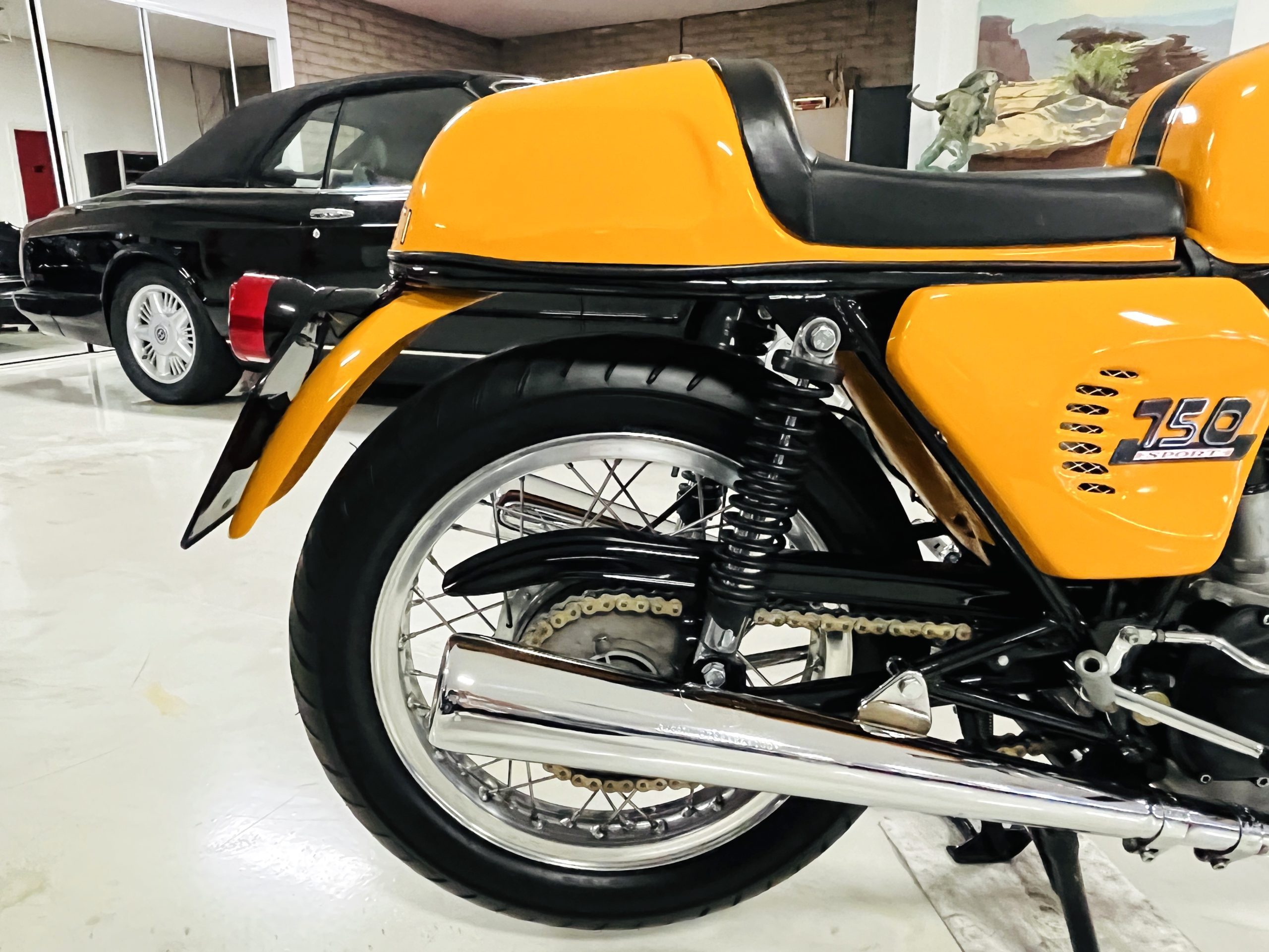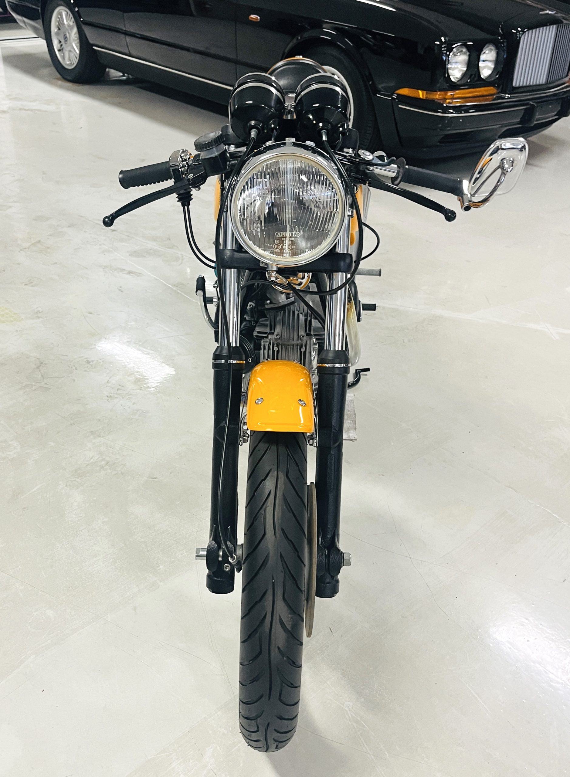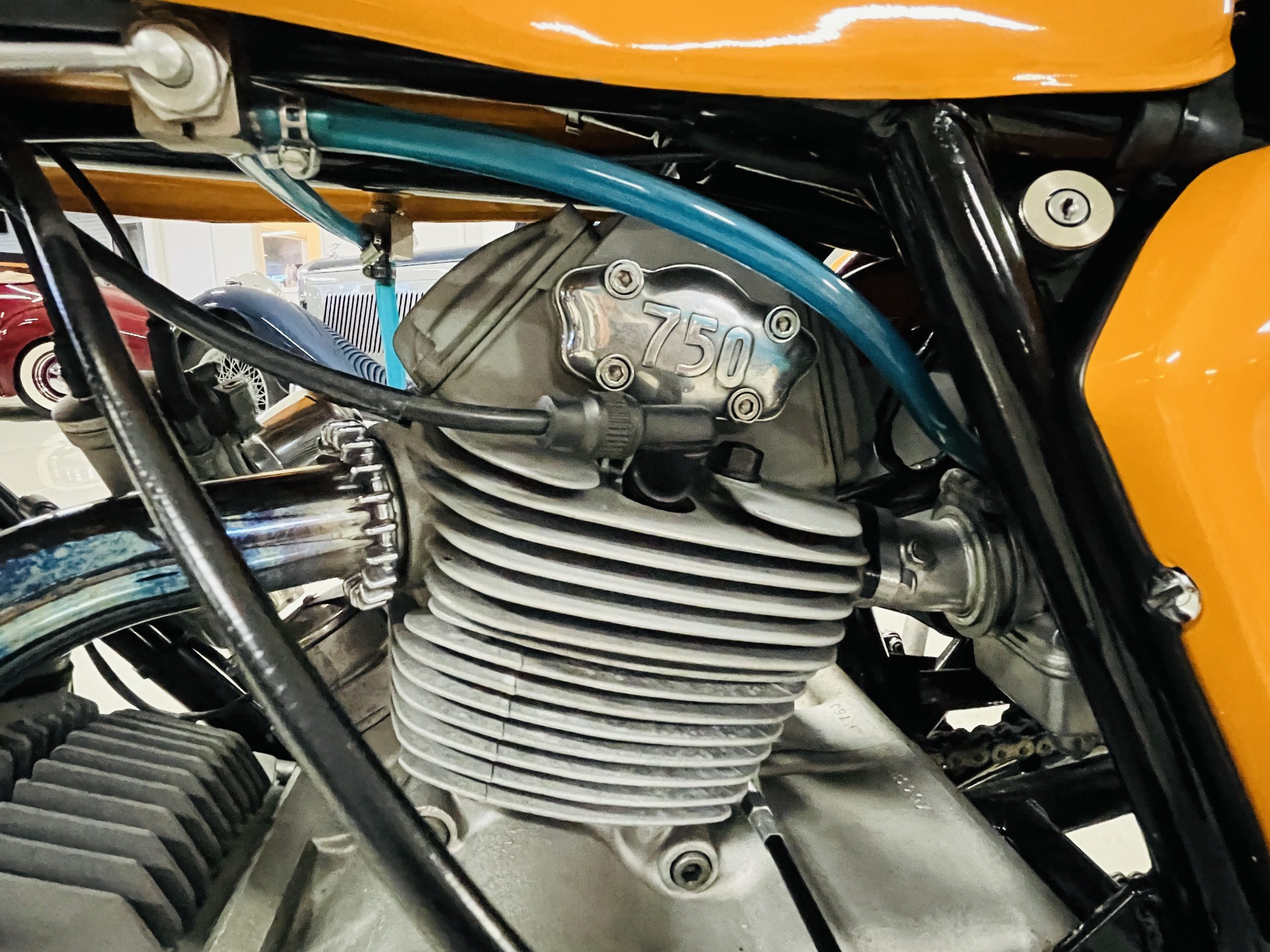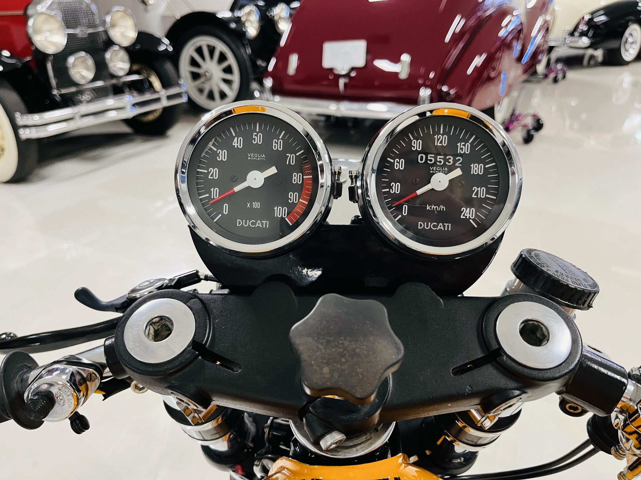 The original engine has never been opened as evidenced by the original factory lead seal on the bottom of the case. The 750 Sport is equipped with an air-cooled, four-stroke, 90-degree L-twin cylinder, SOHC, two-valve-per-cylinder engine that produces 72hp and is capable of speeds over 125 MPH. The 750 Sport came equipped from the factory with a solo saddle, rearsets (rear pegs), and clip-on handlebars. This example is equipped with a fork-mounted headlight and Borrani wheels. This 750 Sport features Veglia-Borletti gauges, including a 10k-rpm tachometer and a 240-km/h speedometer.