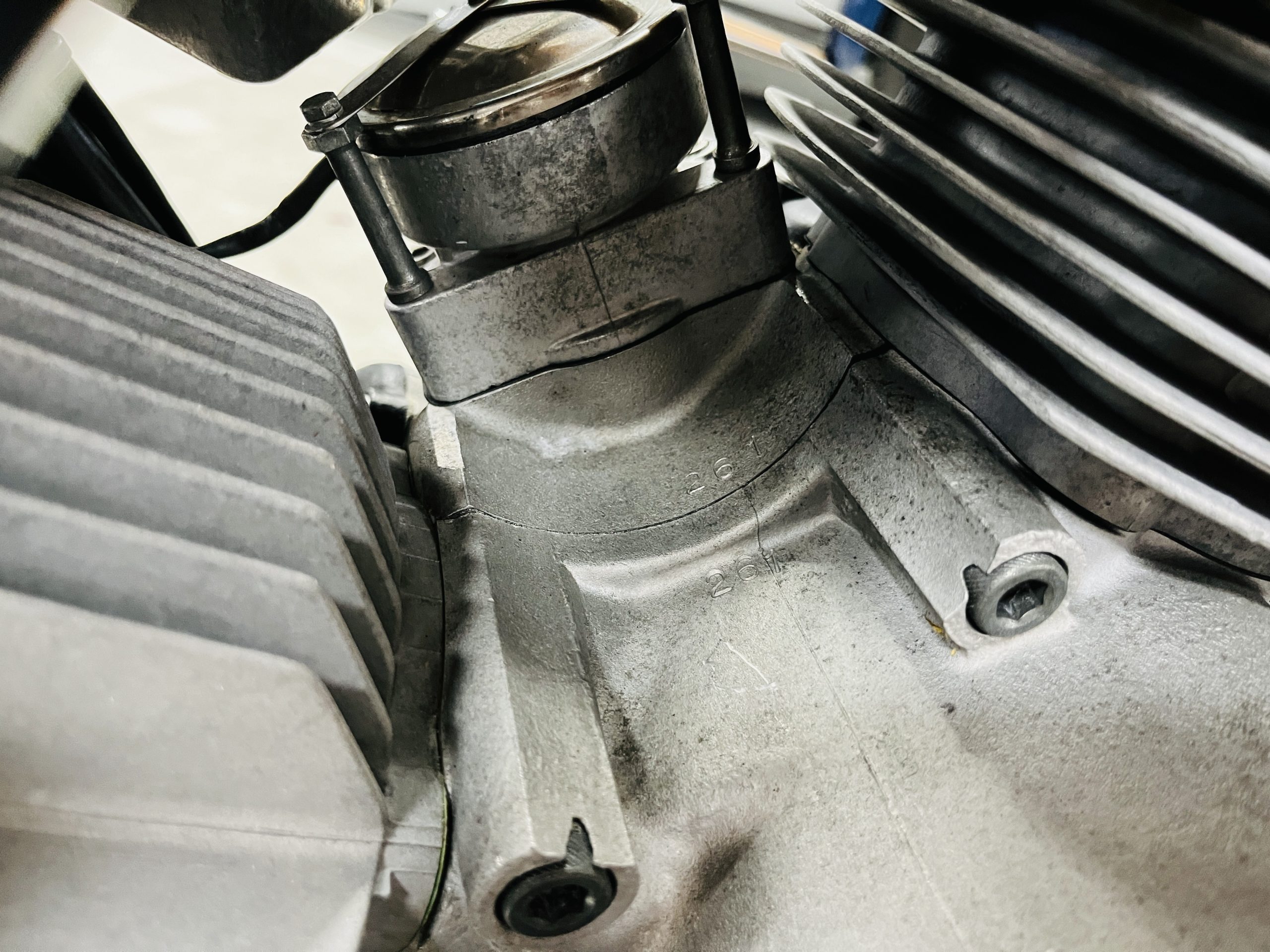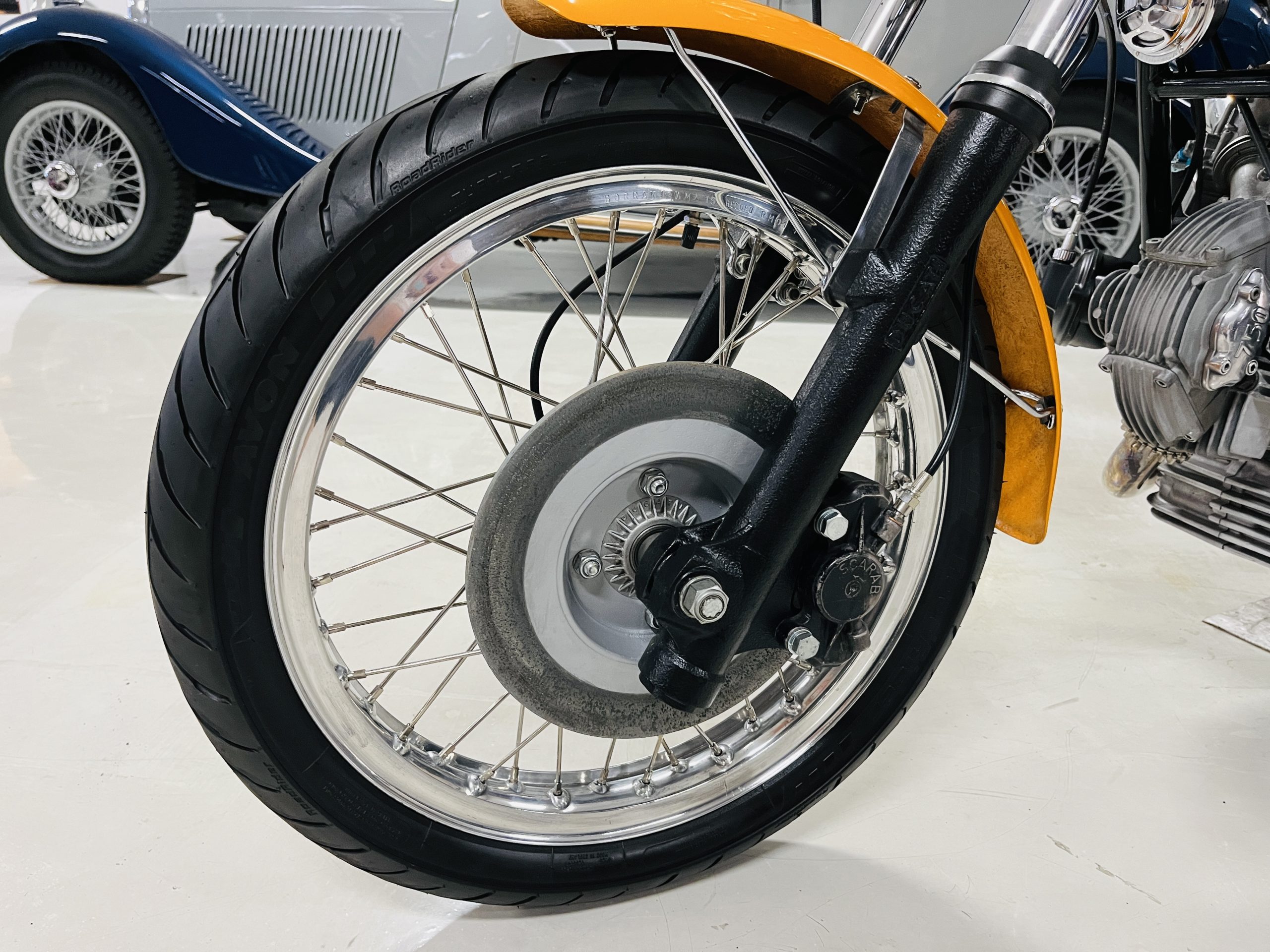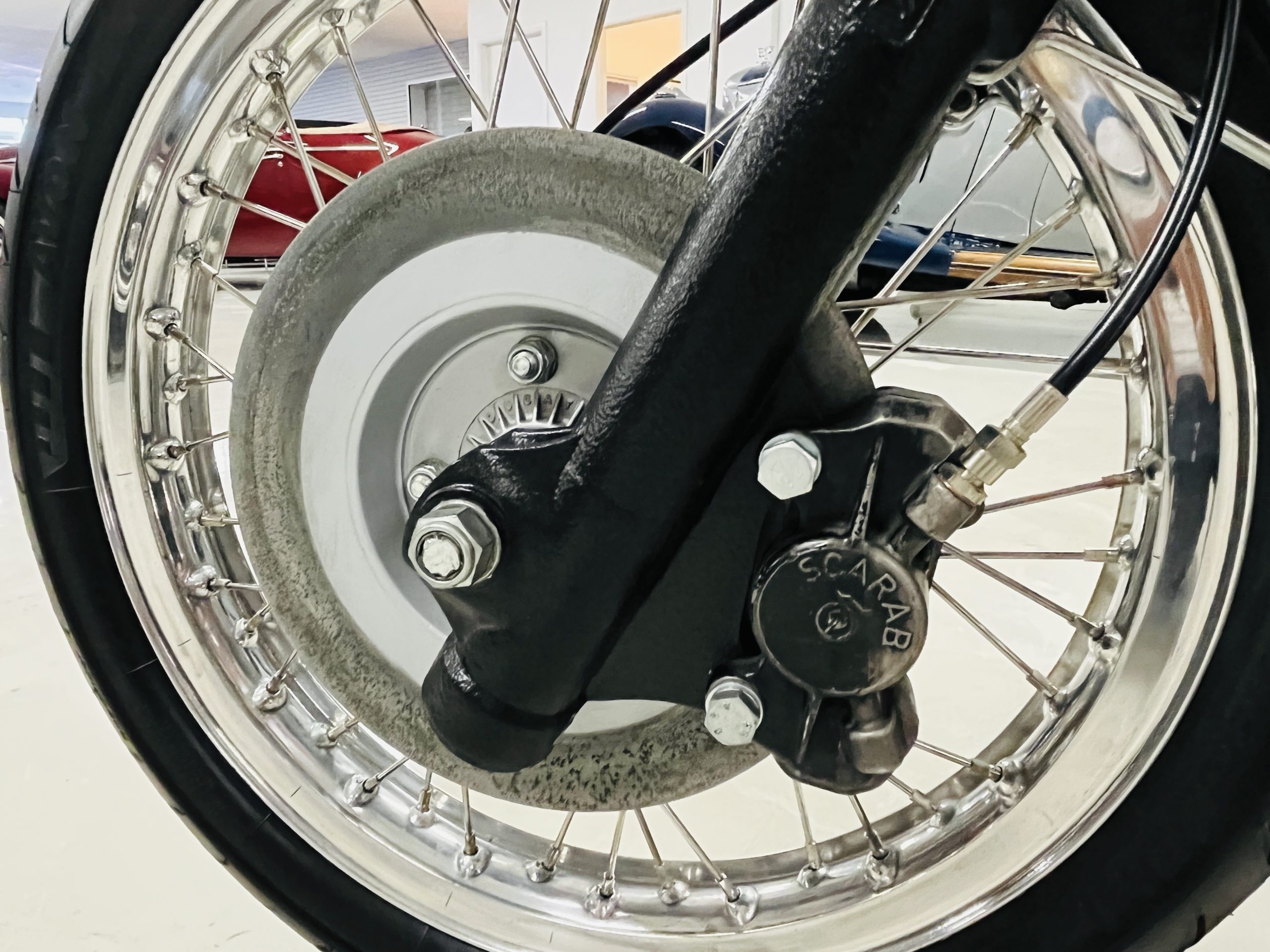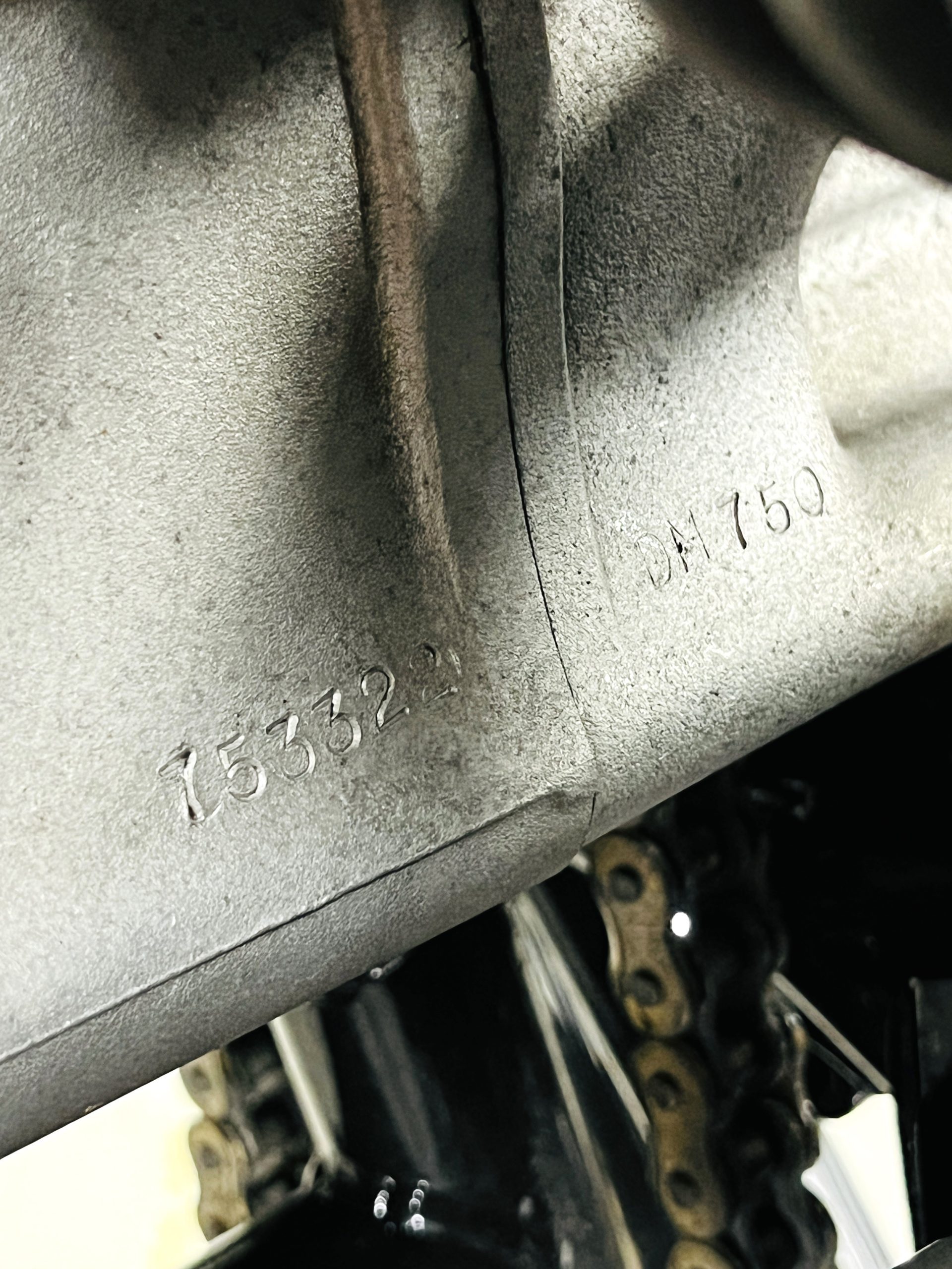 The original engine has never been opened as evidenced by the original factory lead seal on the bottom of the case. The 750 Sport is equipped with an air-cooled, four-stroke, 90-degree L-twin cylinder, SOHC, two-valve-per-cylinder engine that produces 72hp and is capable of speeds over 125 MPH. The 750 Sport came equipped from the factory with a solo saddle, rearsets (rear pegs), and clip-on handlebars. This example is equipped with a fork-mounted headlight and Borrani wheels. This 750 Sport features Veglia-Borletti gauges, including a 10k-rpm tachometer and a 240-km/h speedometer.