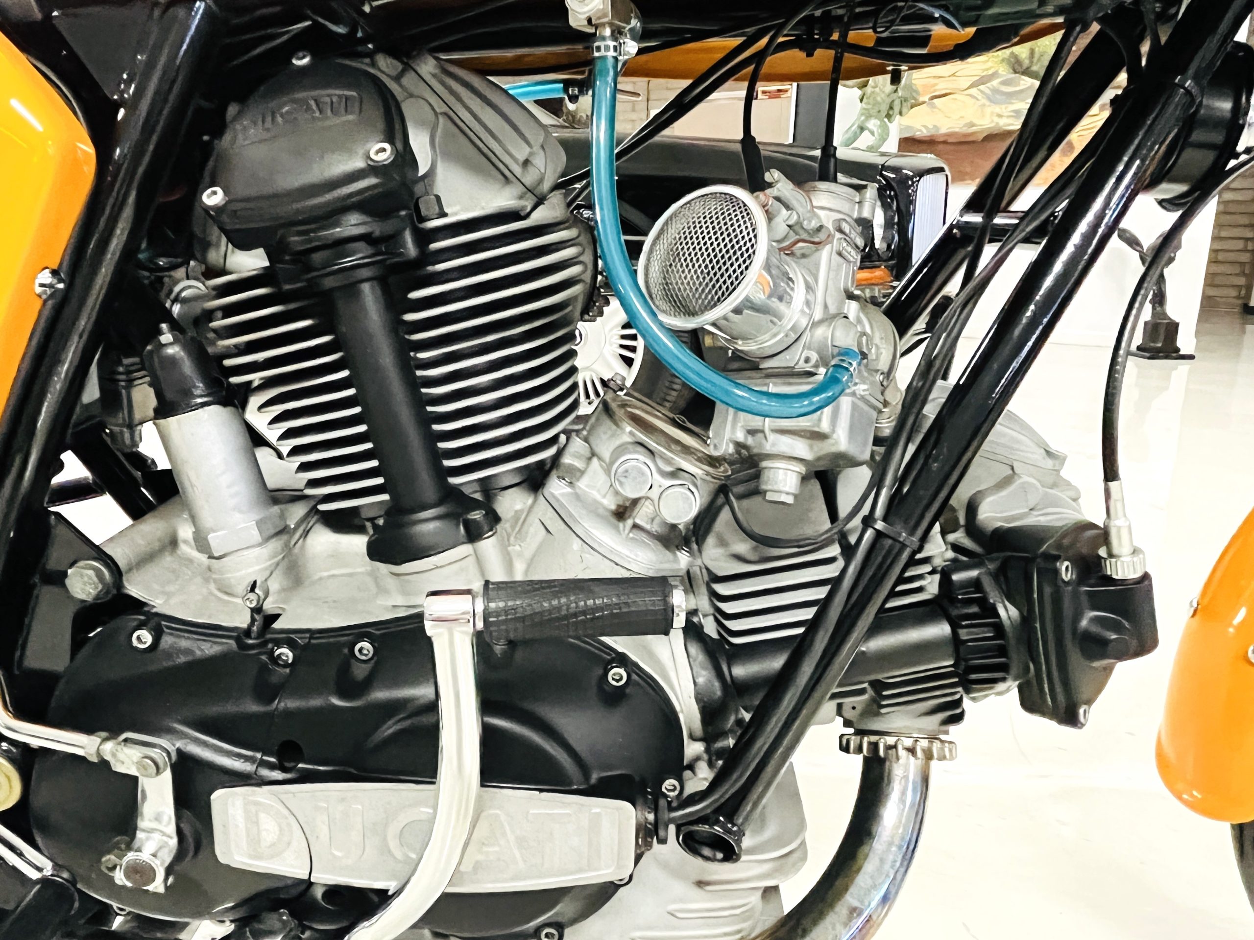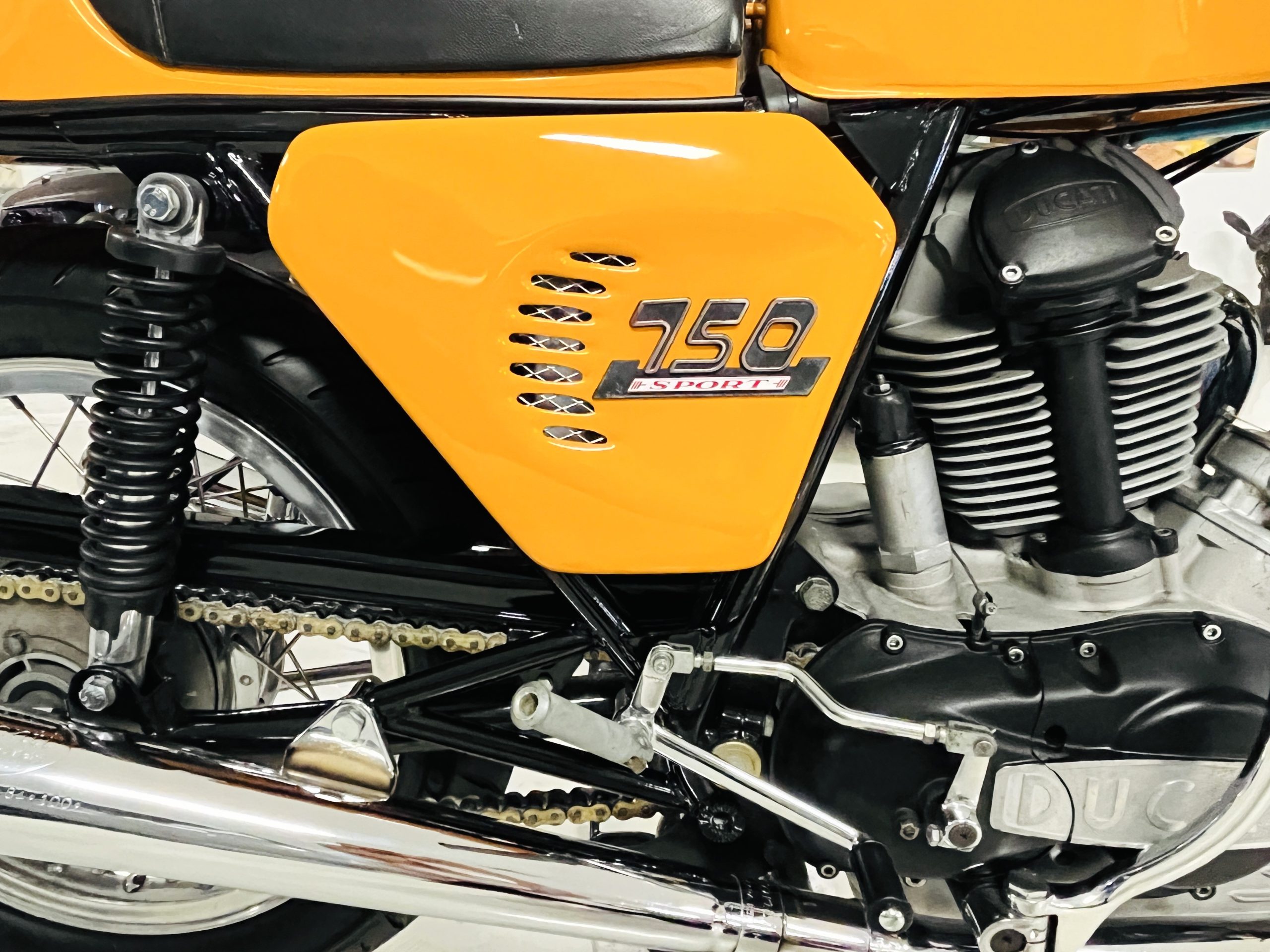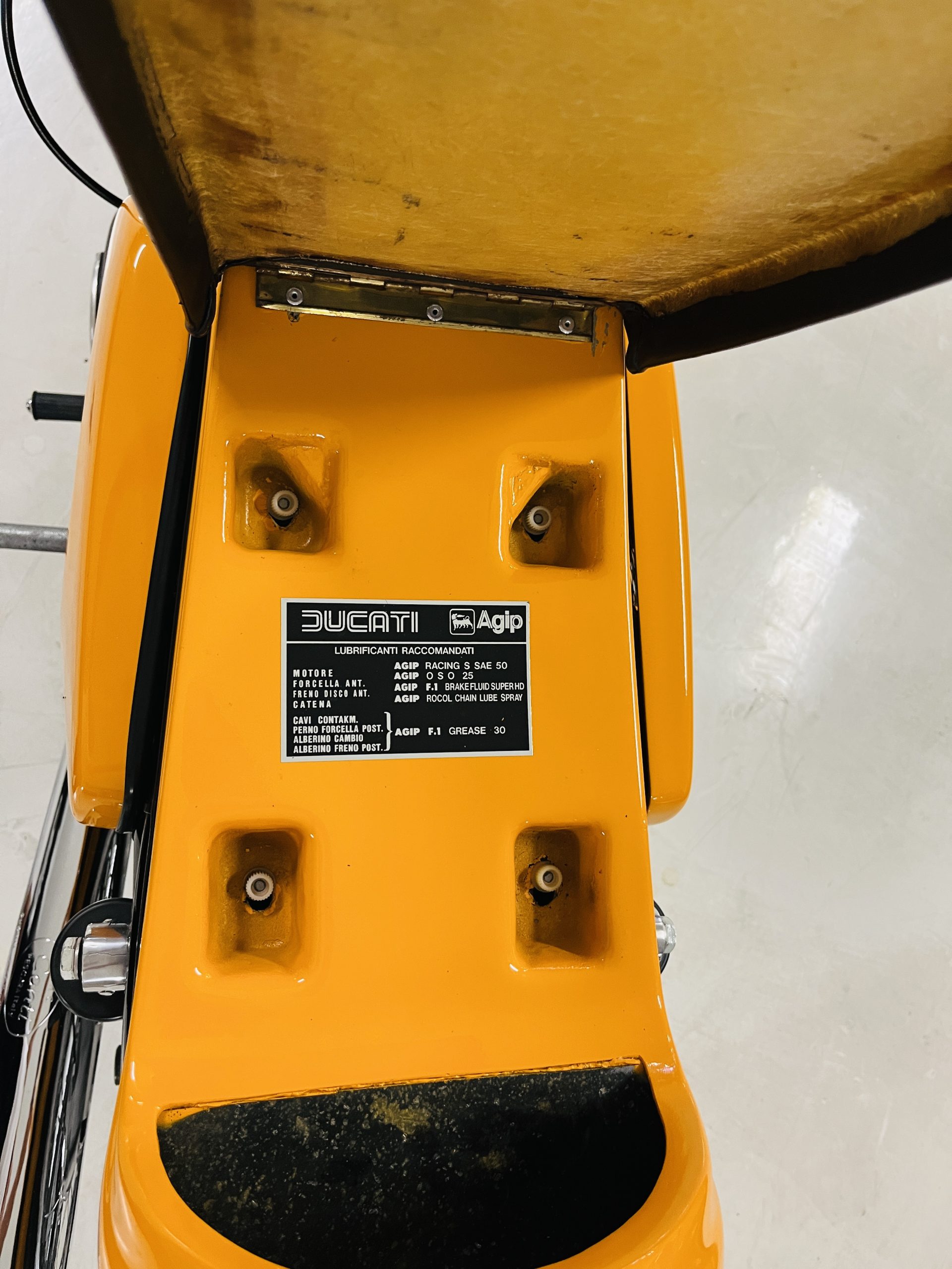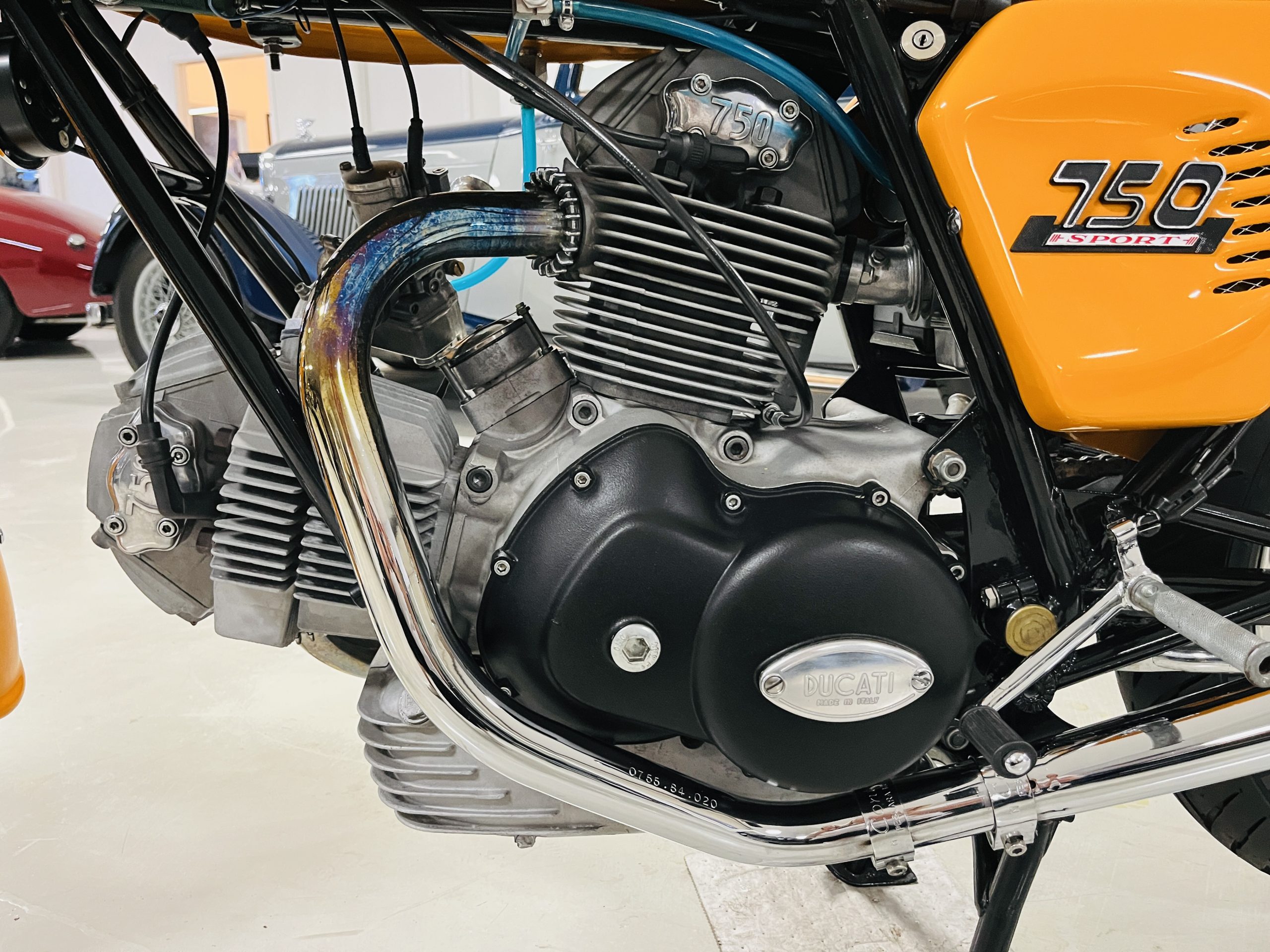 The livery in vibrant Giallo Ocra (Orange Ochre) is in excellent condition and is dressed in all the correct emblems and markings. All the moldings, side covers, fenders, and shields are in excellent condition. The black vinyl seat has no tears or discoloration and is in excellent condition. The black frame and Giallo Ocra body were repainted during the restoration. The complete thorough restoration took the Ducati 750 Sport to its original condition. Any modifications by previous owners were reverted to its original specifications.