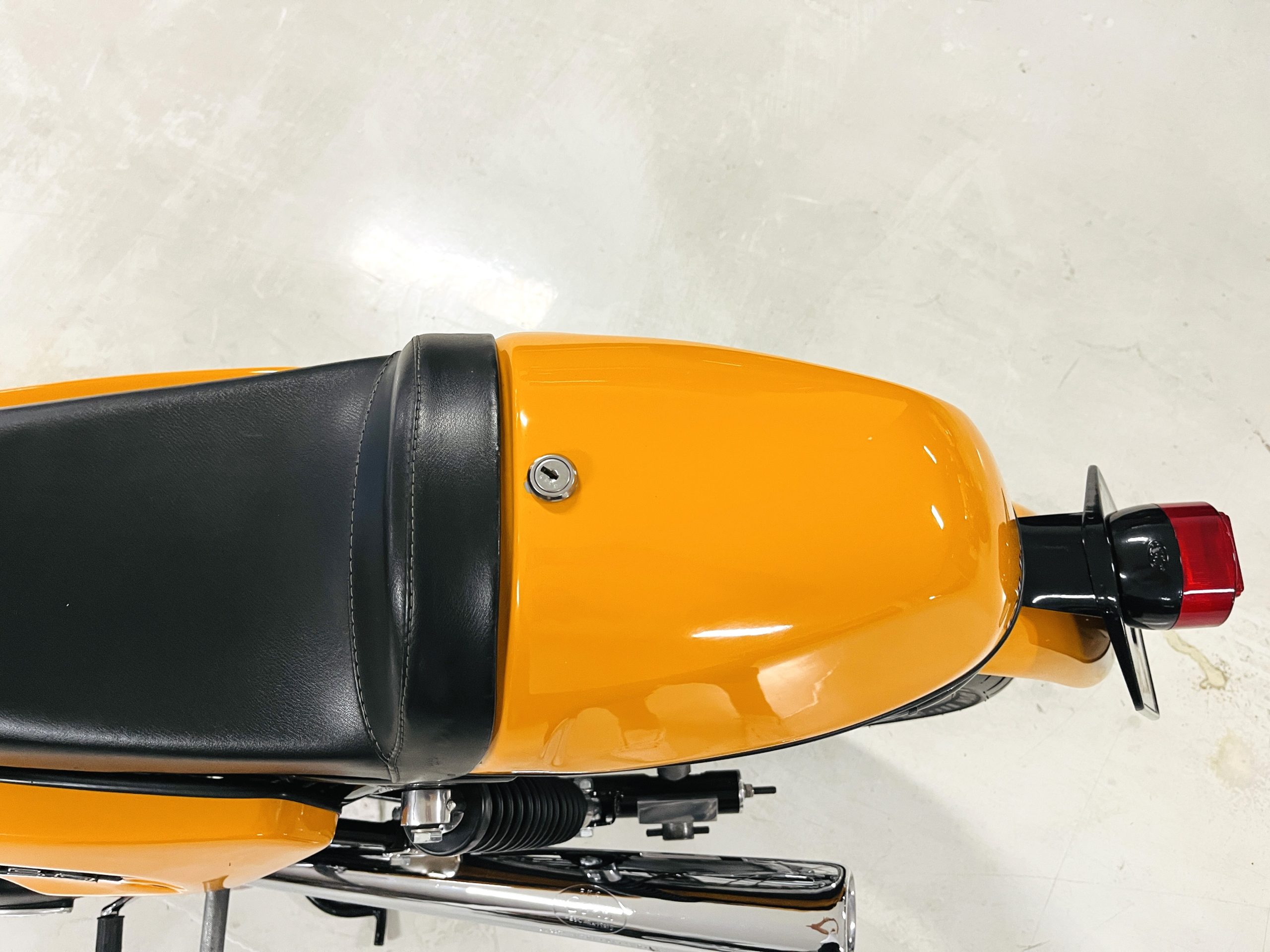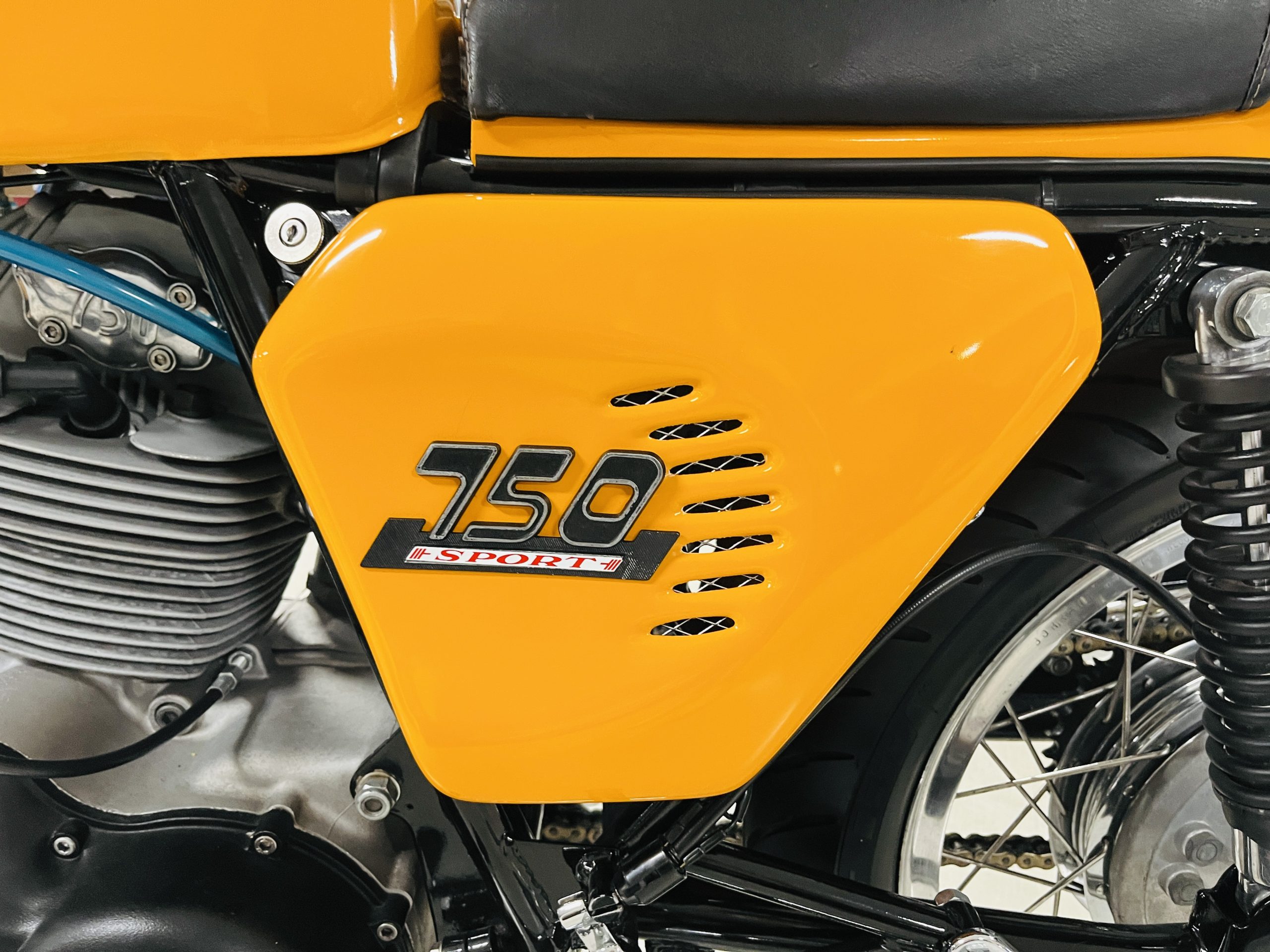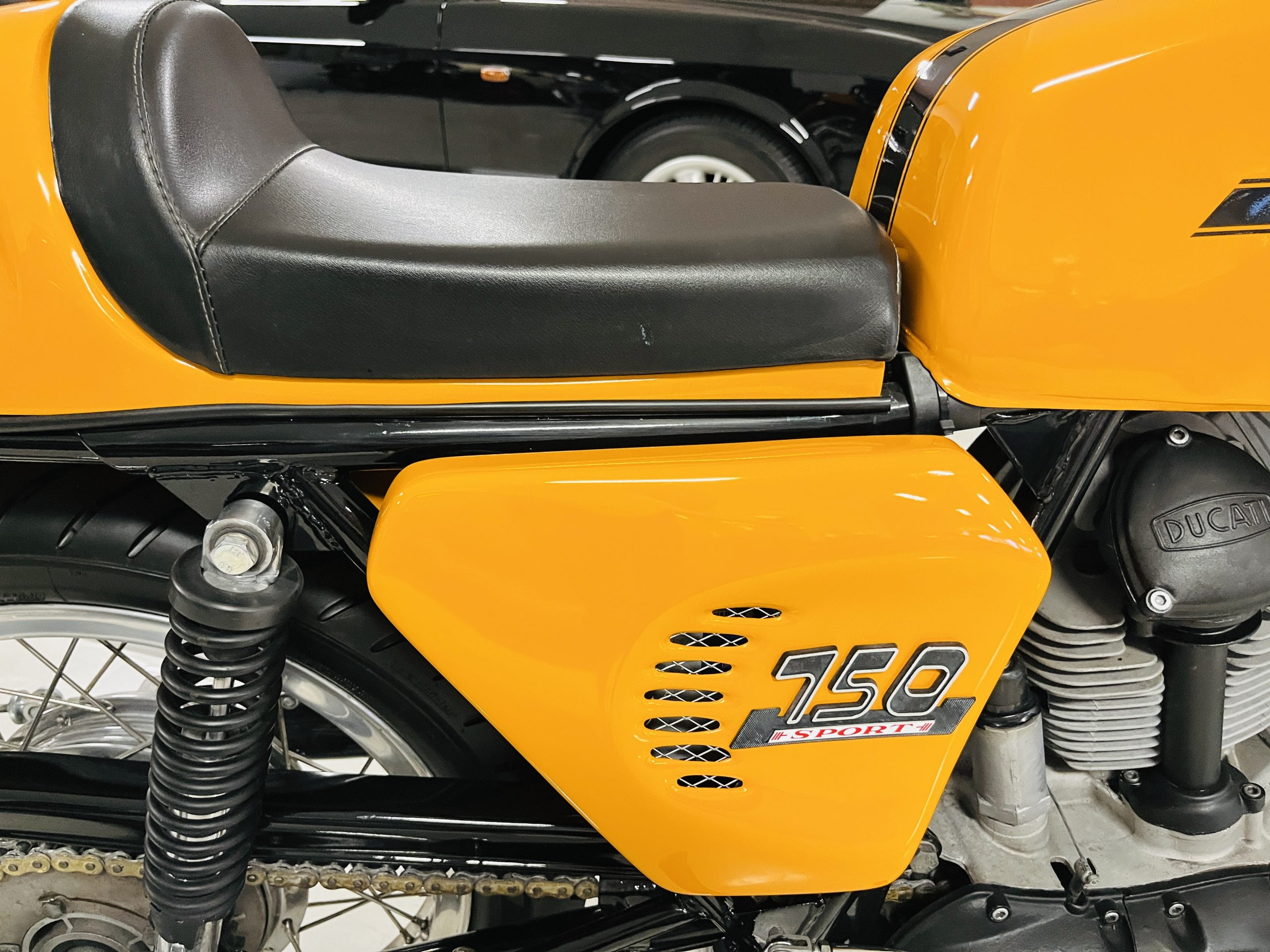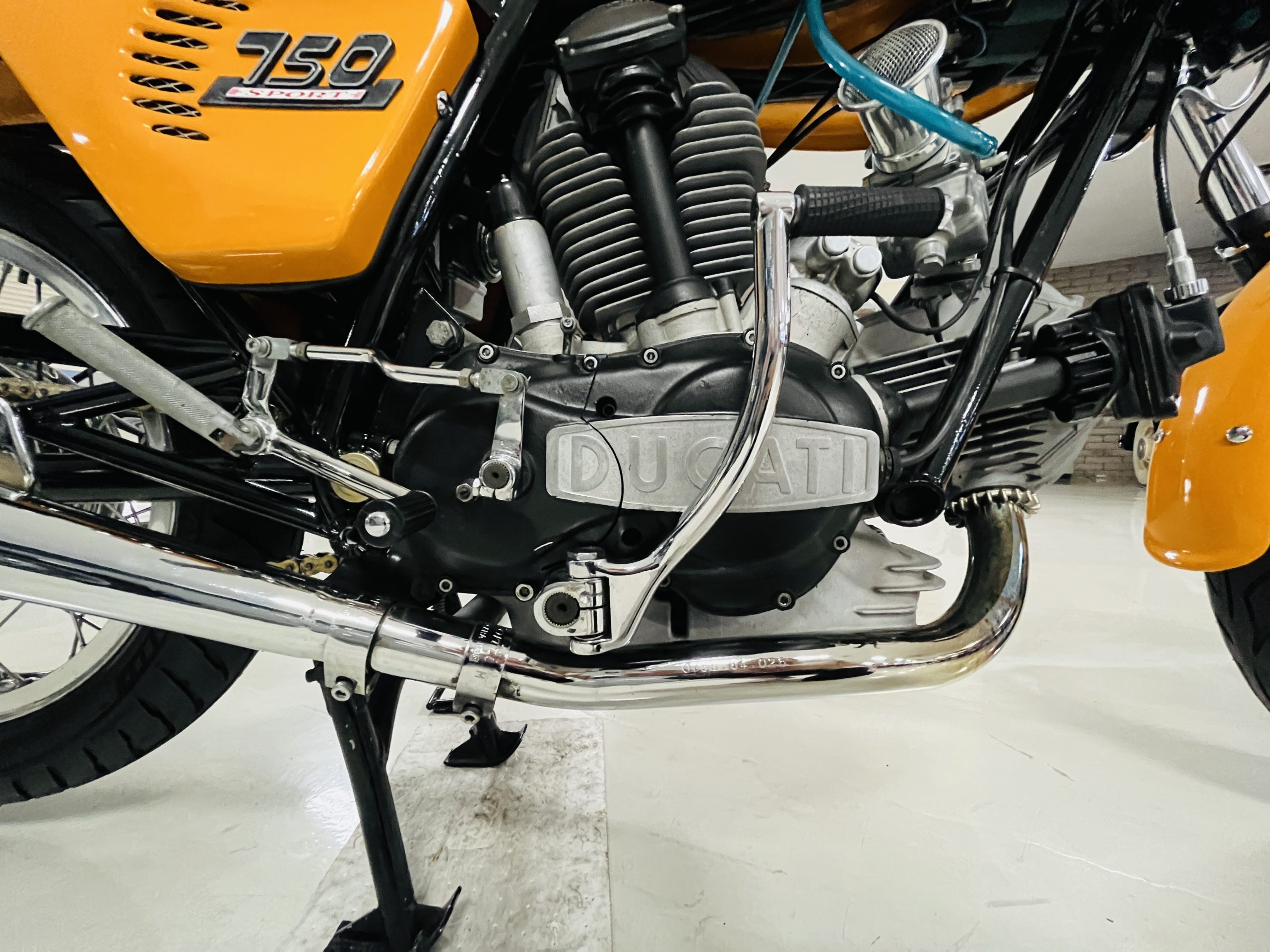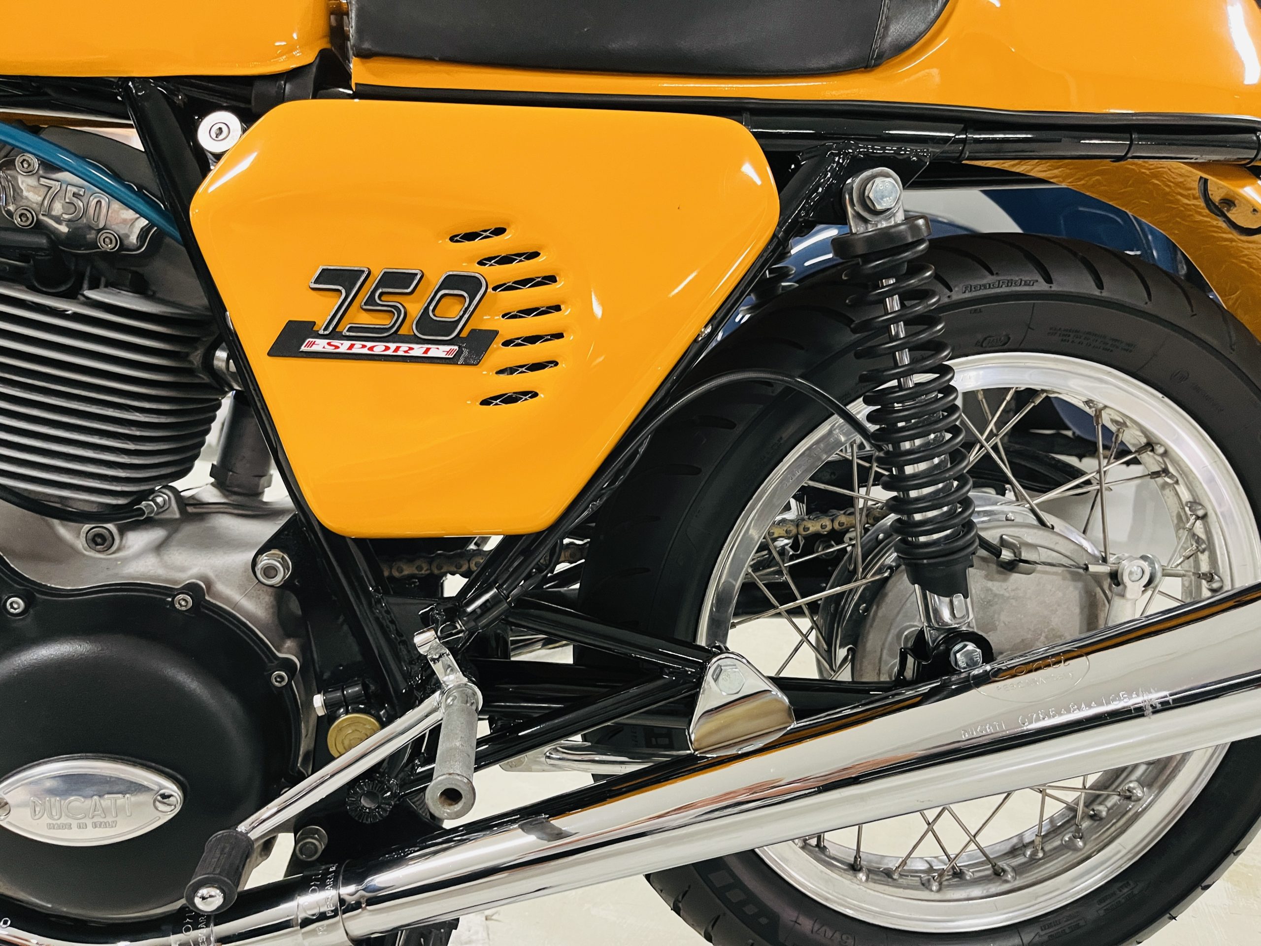 The livery in vibrant Giallo Ocra (Orange Ochre) is in excellent condition and is dressed in all the correct emblems and markings. All the moldings, side covers, fenders, and shields are in excellent condition. The black vinyl seat has no tears or discoloration and is in excellent condition. The black frame and Giallo Ocra body were repainted during the restoration. The complete thorough restoration took the Ducati 750 Sport to its original condition. Any modifications by previous owners were reverted to its original specifications.