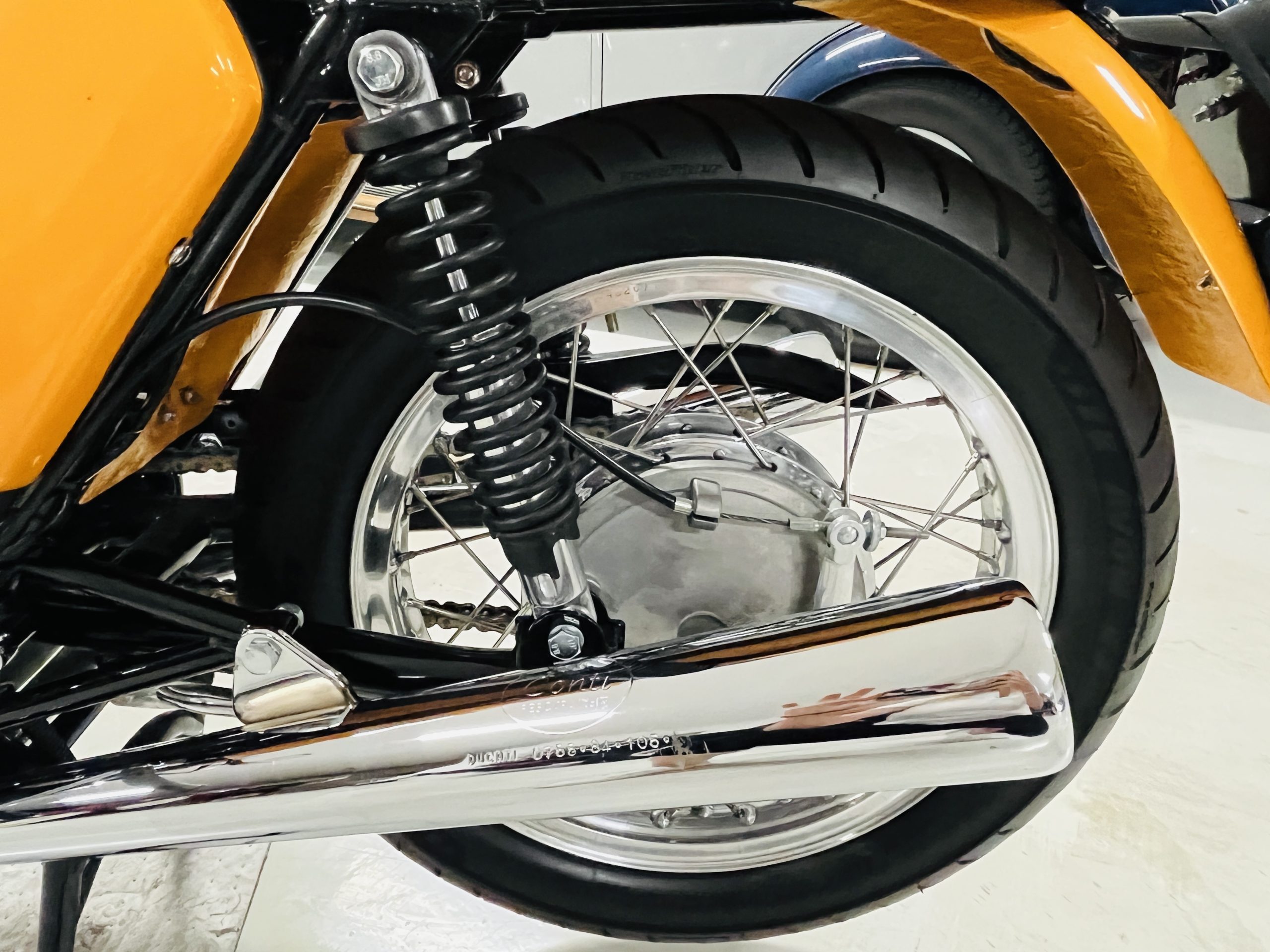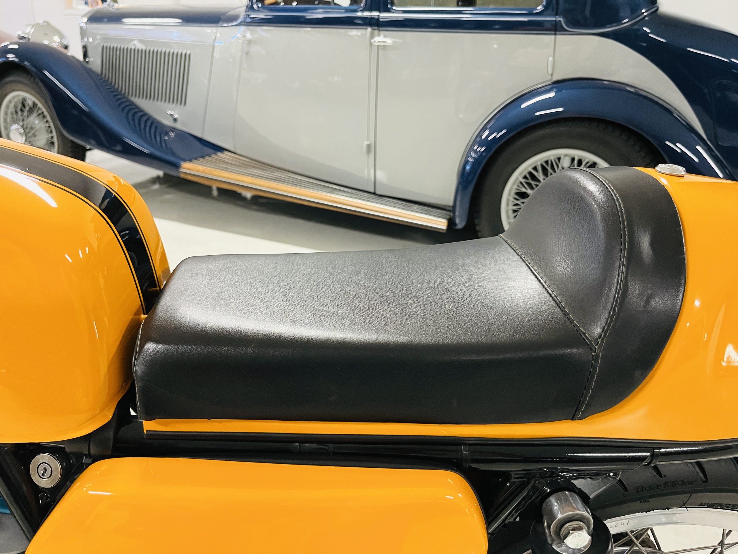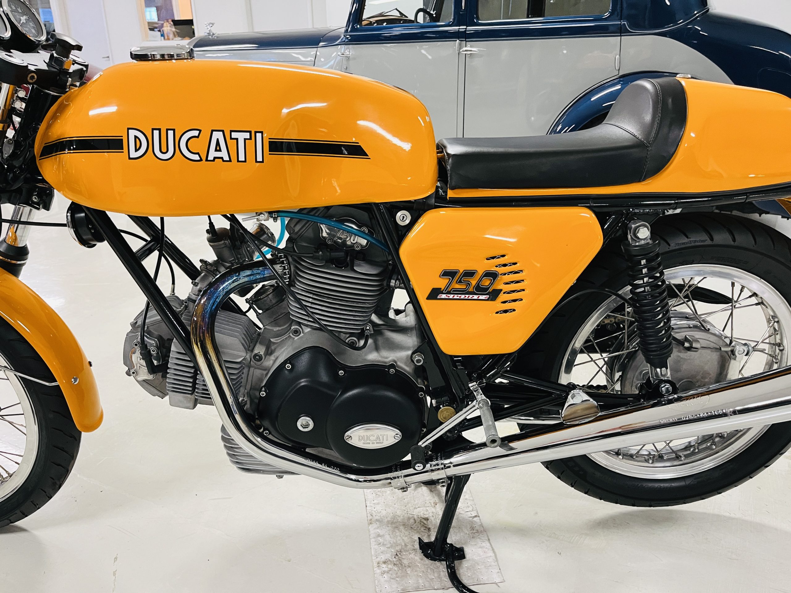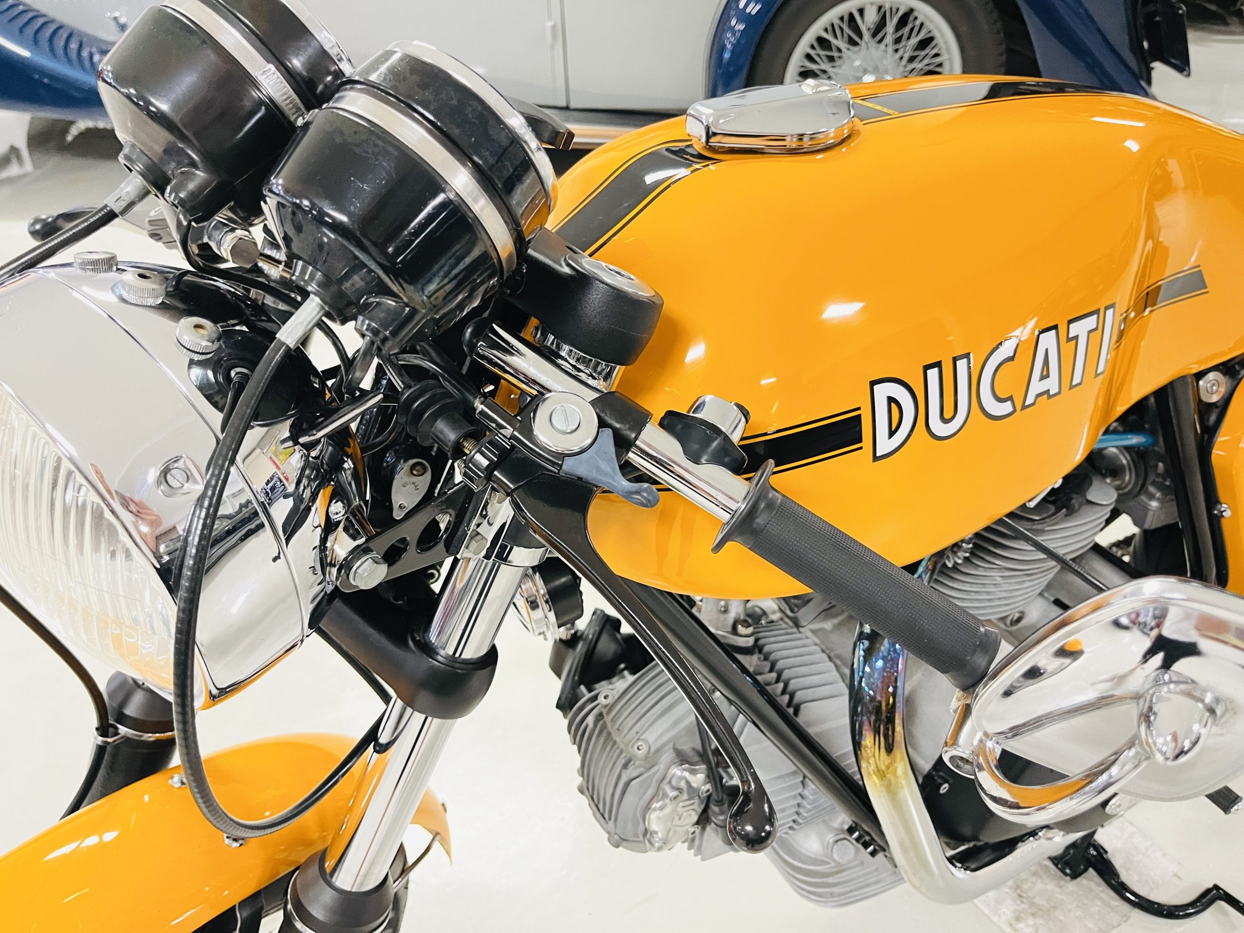 The livery in vibrant Giallo Ocra (Orange Ochre) is in excellent condition and is dressed in all the correct emblems and markings. All the moldings, side covers, fenders, and shields are in excellent condition. The black vinyl seat has no tears or discoloration and is in excellent condition. The black frame and Giallo Ocra body were repainted during the restoration. The complete thorough restoration took the Ducati 750 Sport to its original condition. Any modifications by previous owners were reverted to its original specifications.