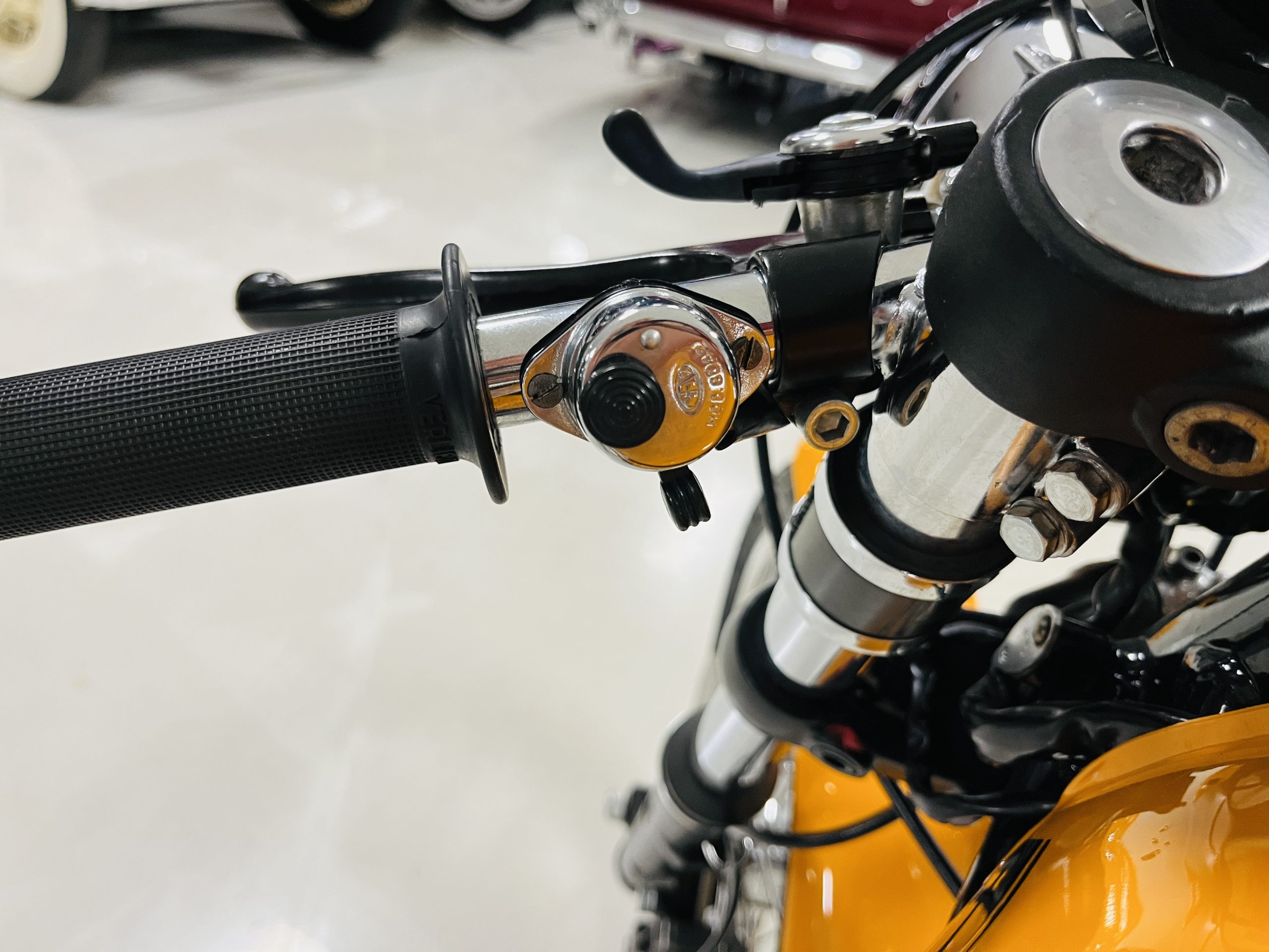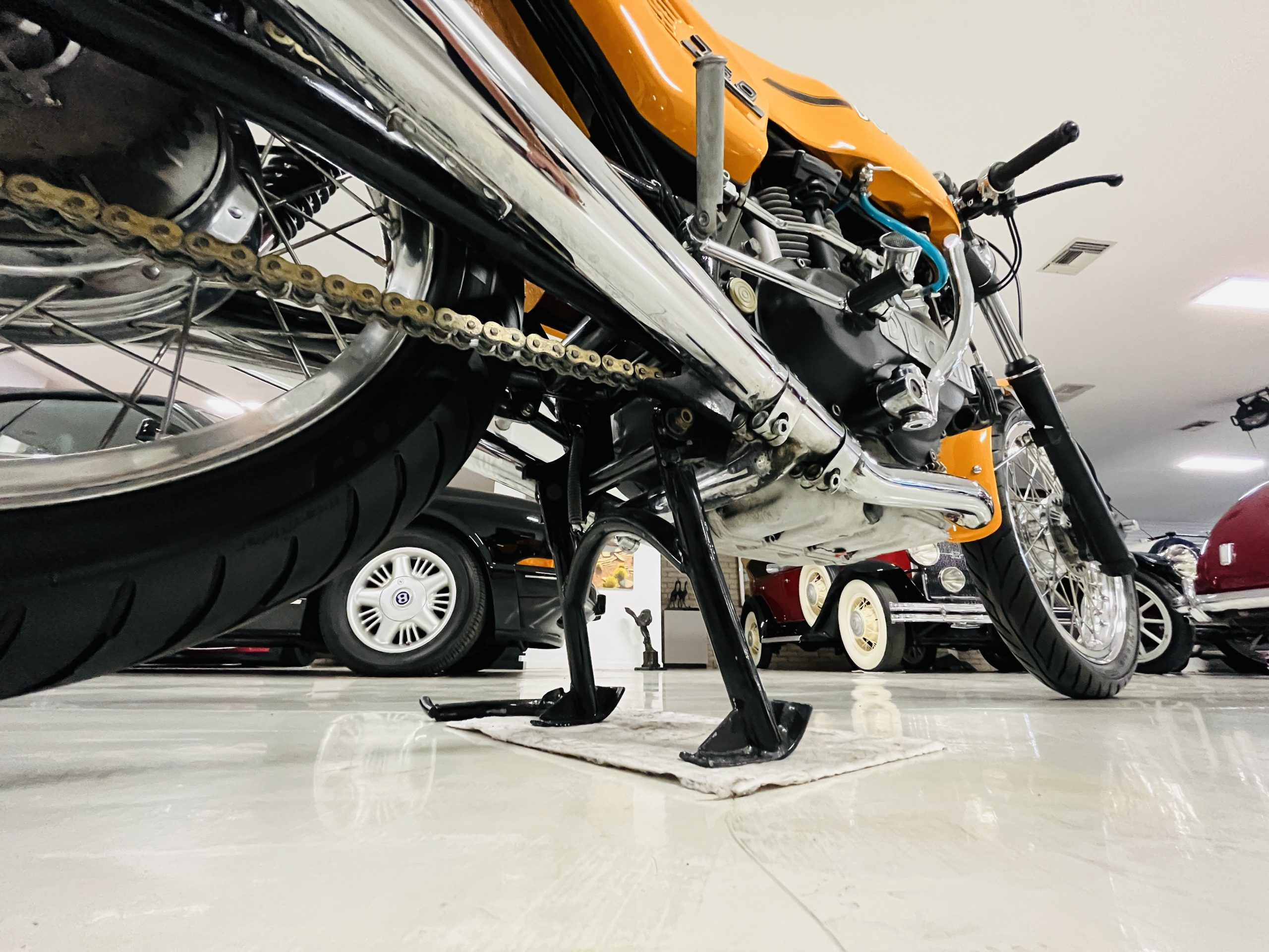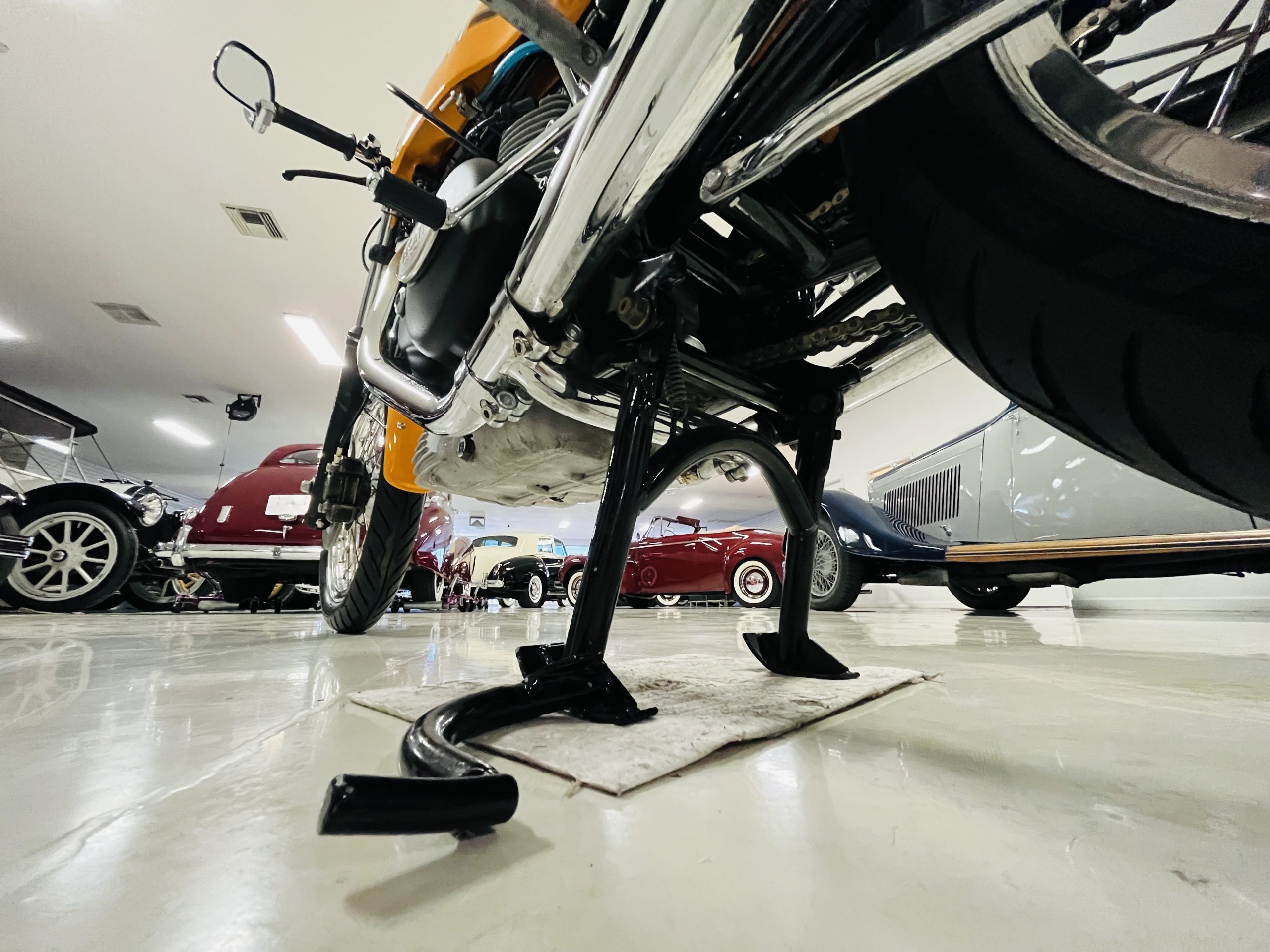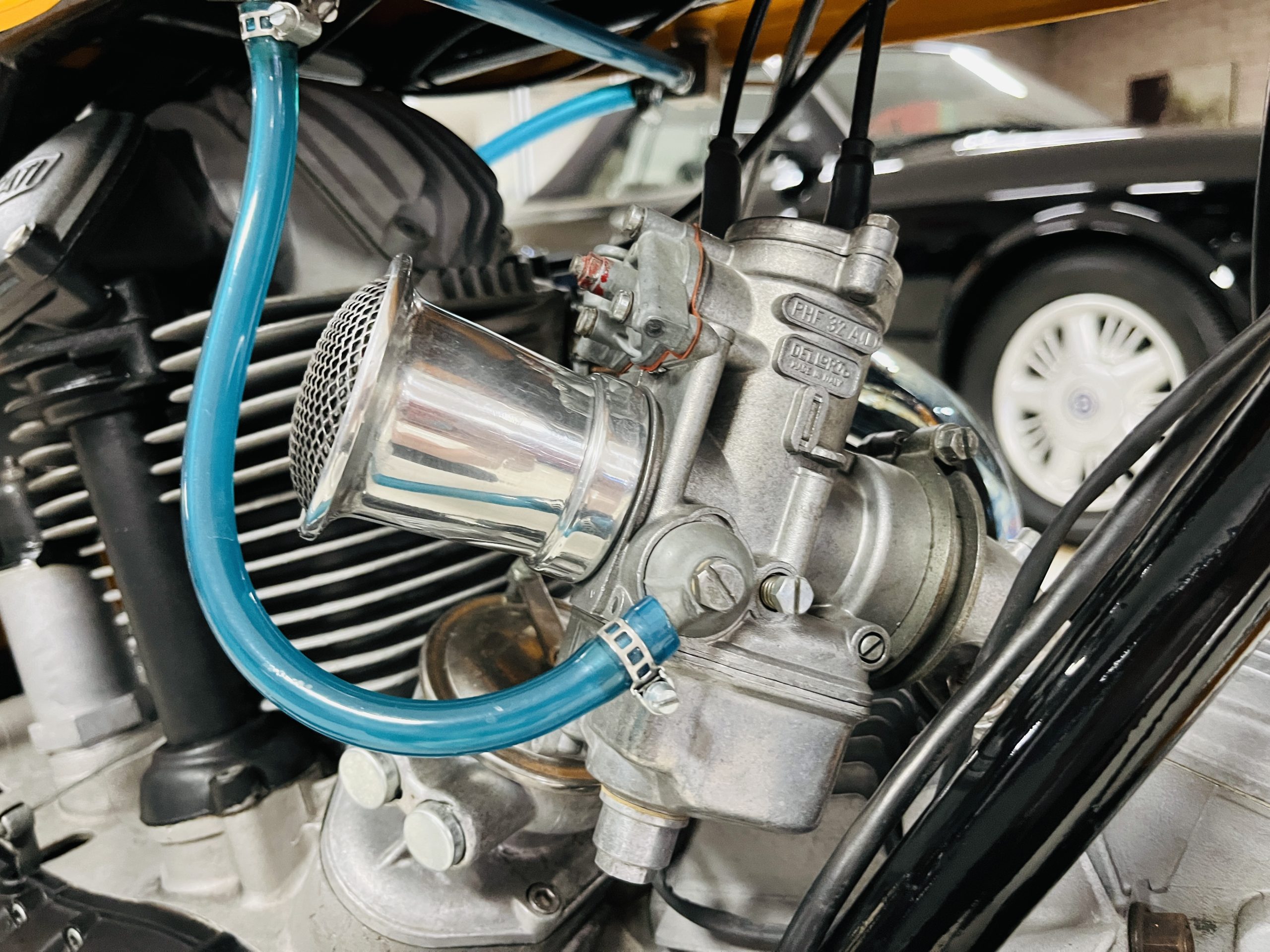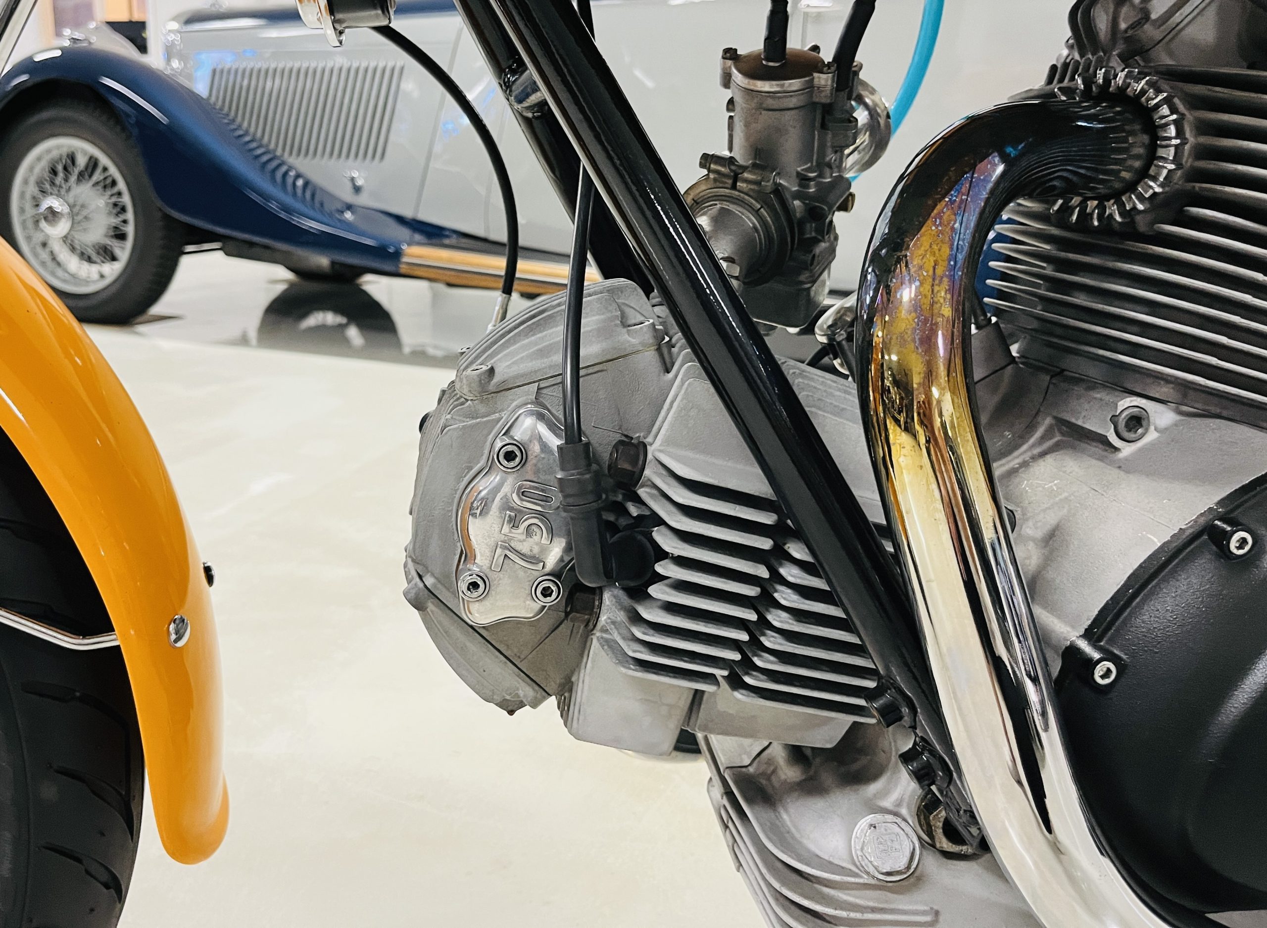 The livery in vibrant Giallo Ocra (Orange Ochre) is in excellent condition and is dressed in all the correct emblems and markings. All the moldings, side covers, fenders, and shields are in excellent condition. The black vinyl seat has no tears or discoloration and is in excellent condition. The black frame and Giallo Ocra body were repainted during the restoration. The complete thorough restoration took the Ducati 750 Sport to its original condition. Any modifications by previous owners were reverted to its original specifications.