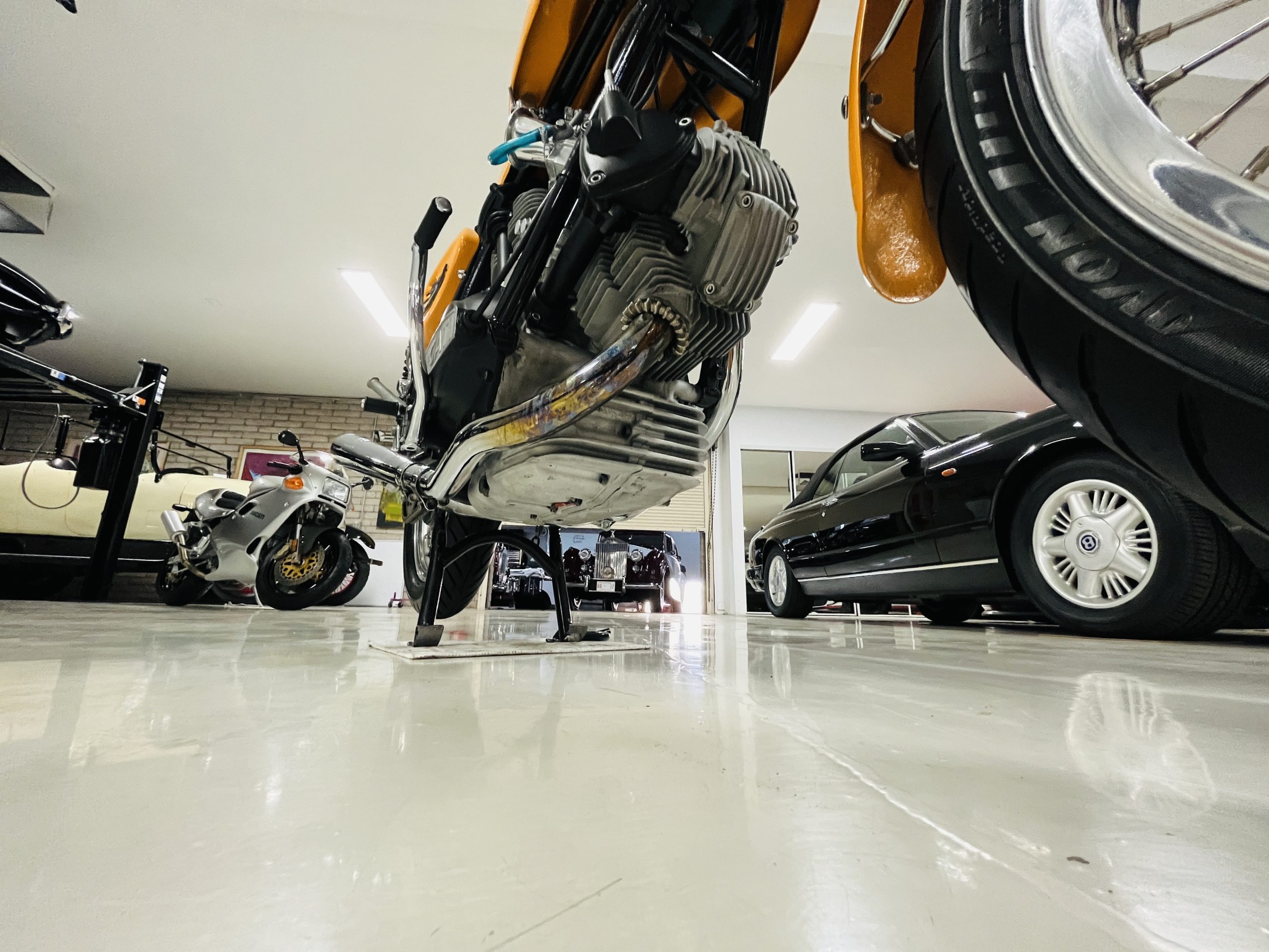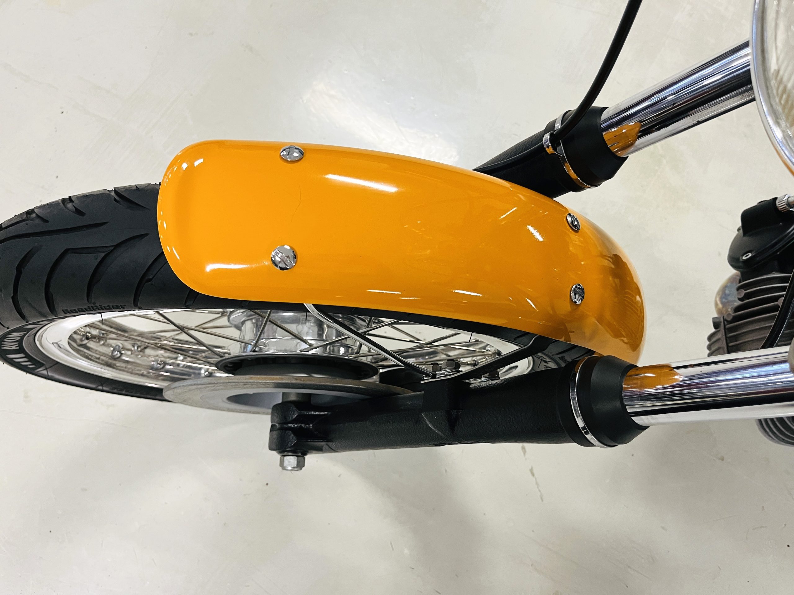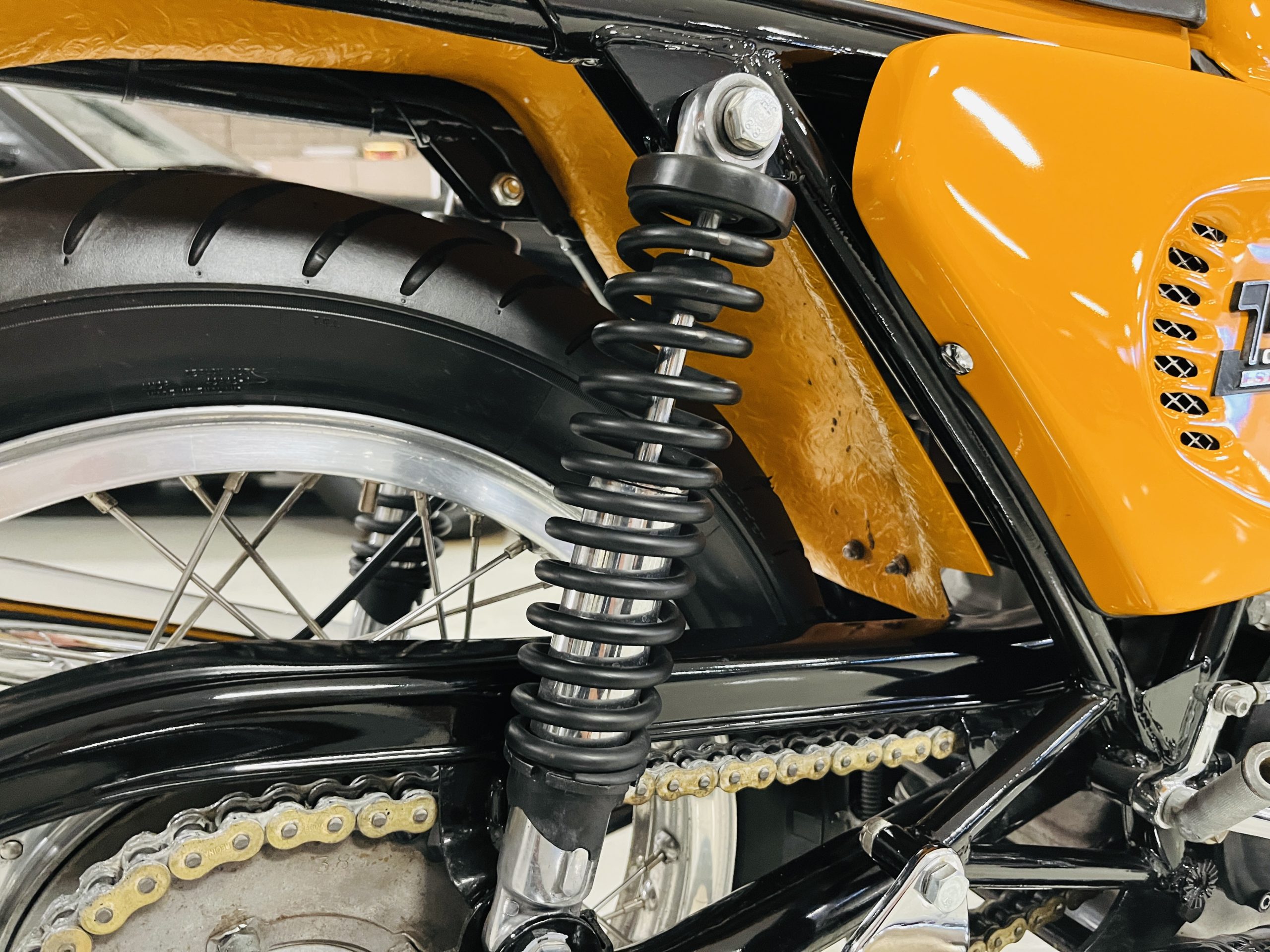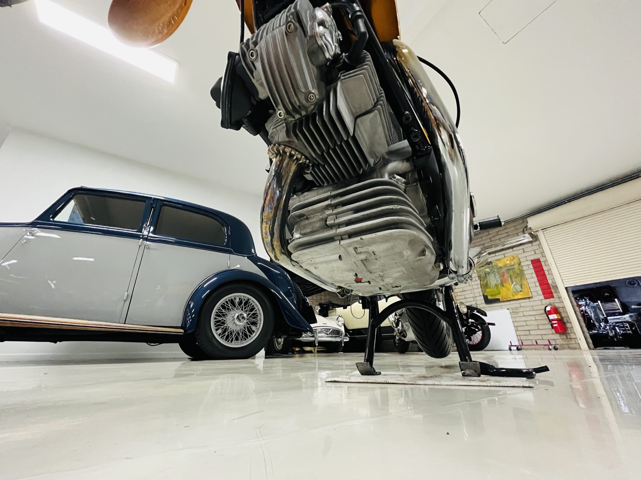 The livery in vibrant Giallo Ocra (Orange Ochre) is in excellent condition and is dressed in all the correct emblems and markings. All the moldings, side covers, fenders, and shields are in excellent condition. The black vinyl seat has no tears or discoloration and is in excellent condition. The black frame and Giallo Ocra body were repainted during the restoration. The complete thorough restoration took the Ducati 750 Sport to its original condition. Any modifications by previous owners were reverted to its original specifications.