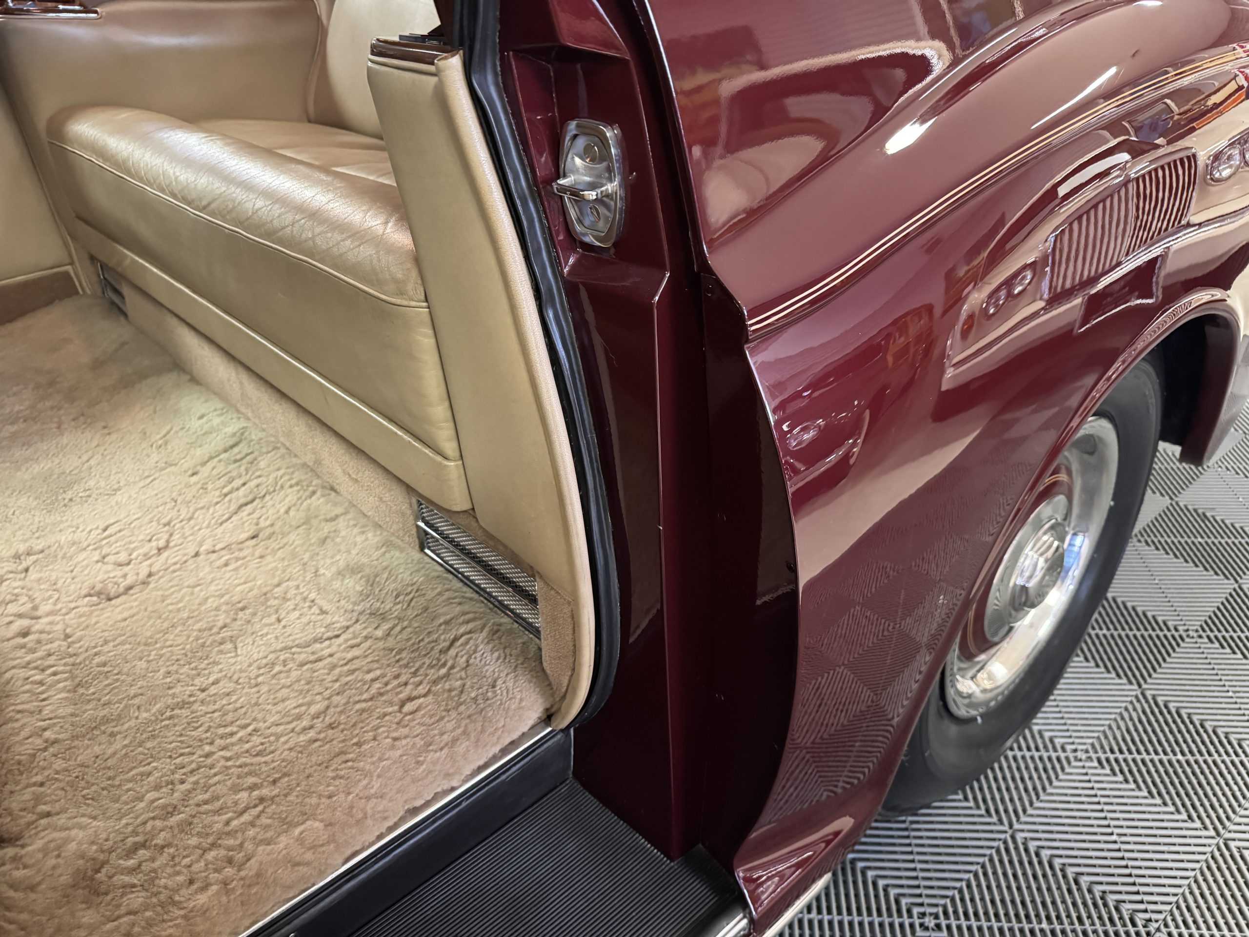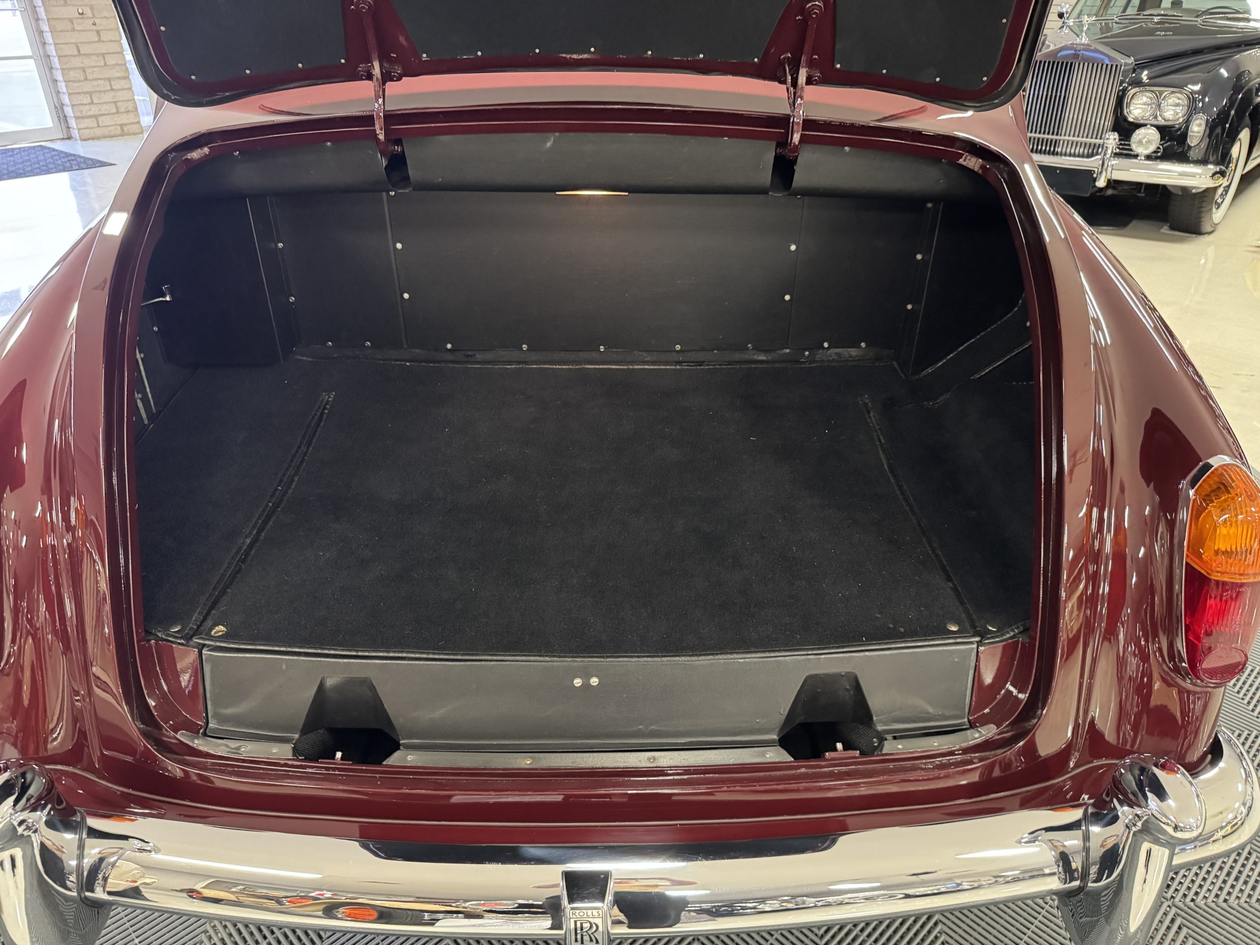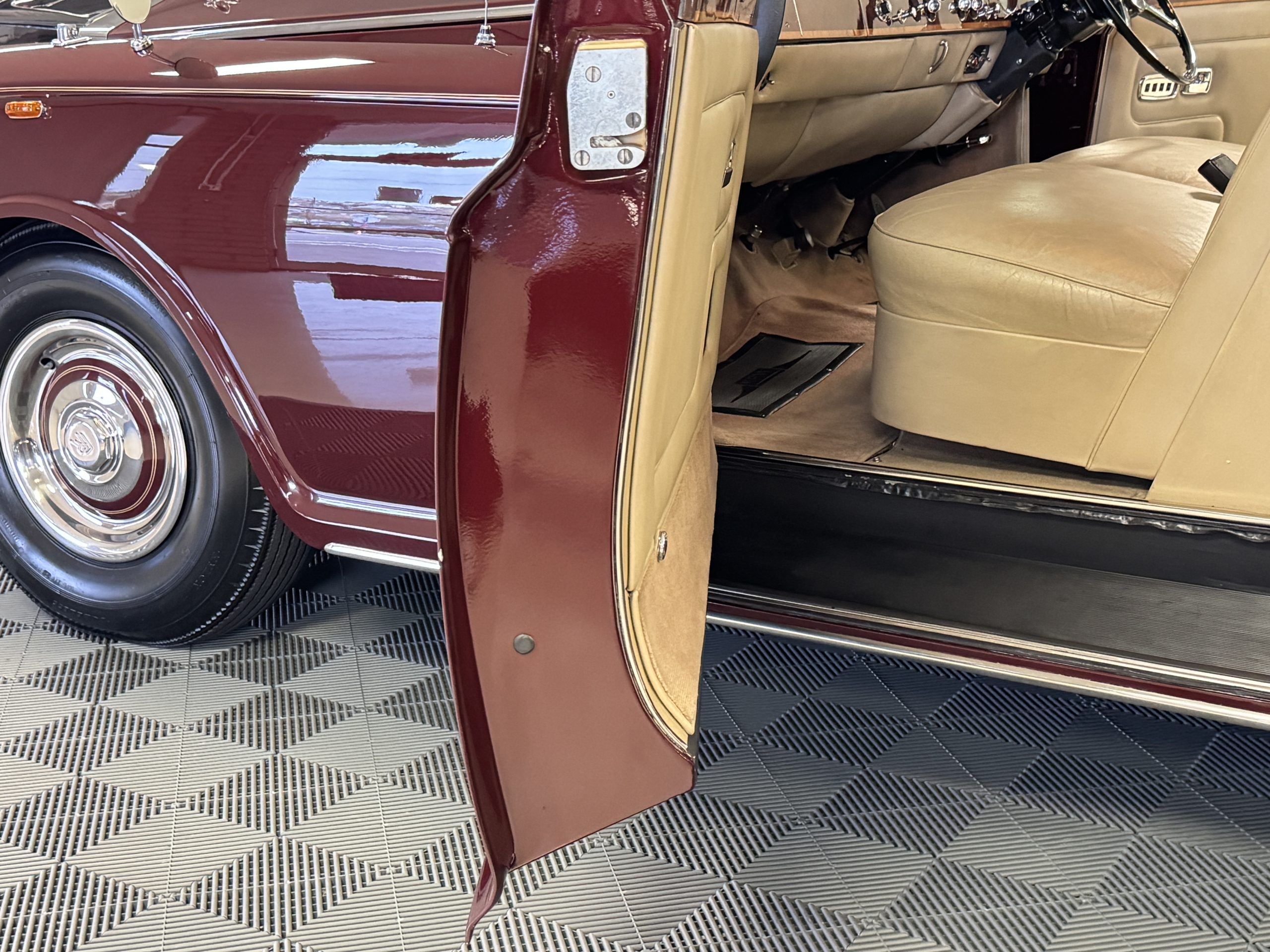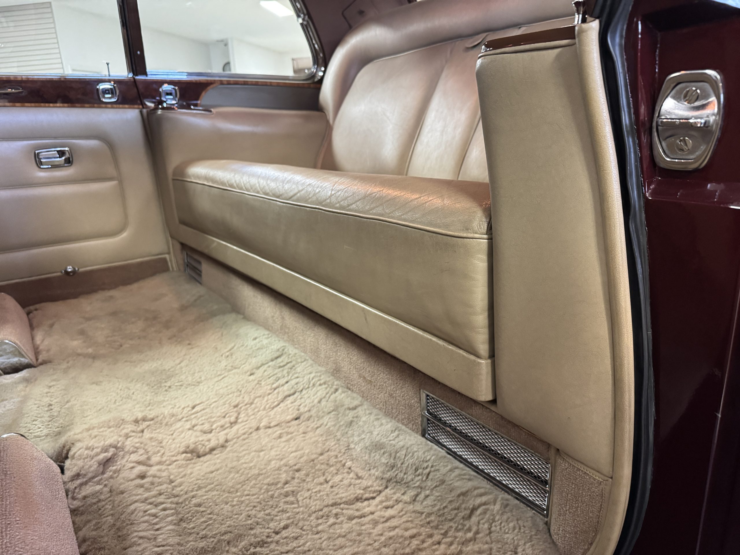 By 1999, the Rolls was treated to a full repaint in Claret metallic and is complimented by fine gold pinstripes. The PPG base-coat clear-coat paintwork is of excellent quality and is in beautiful condition today and was performed by Classic Body Works in Peck, KS. The chrome and stainless-steel trim are in superb condition. The original Lucas fog lights, dual wing mirrors, and the special-order flag mast are all in excellent condition. The chrome wheel covers have the correct Claret trim rings with double gold pinstripes. The correct Dunlap Fort 8.90-15 black walled tires provide the perfect appearance and stature. Overall, the exterior is in concours condition.