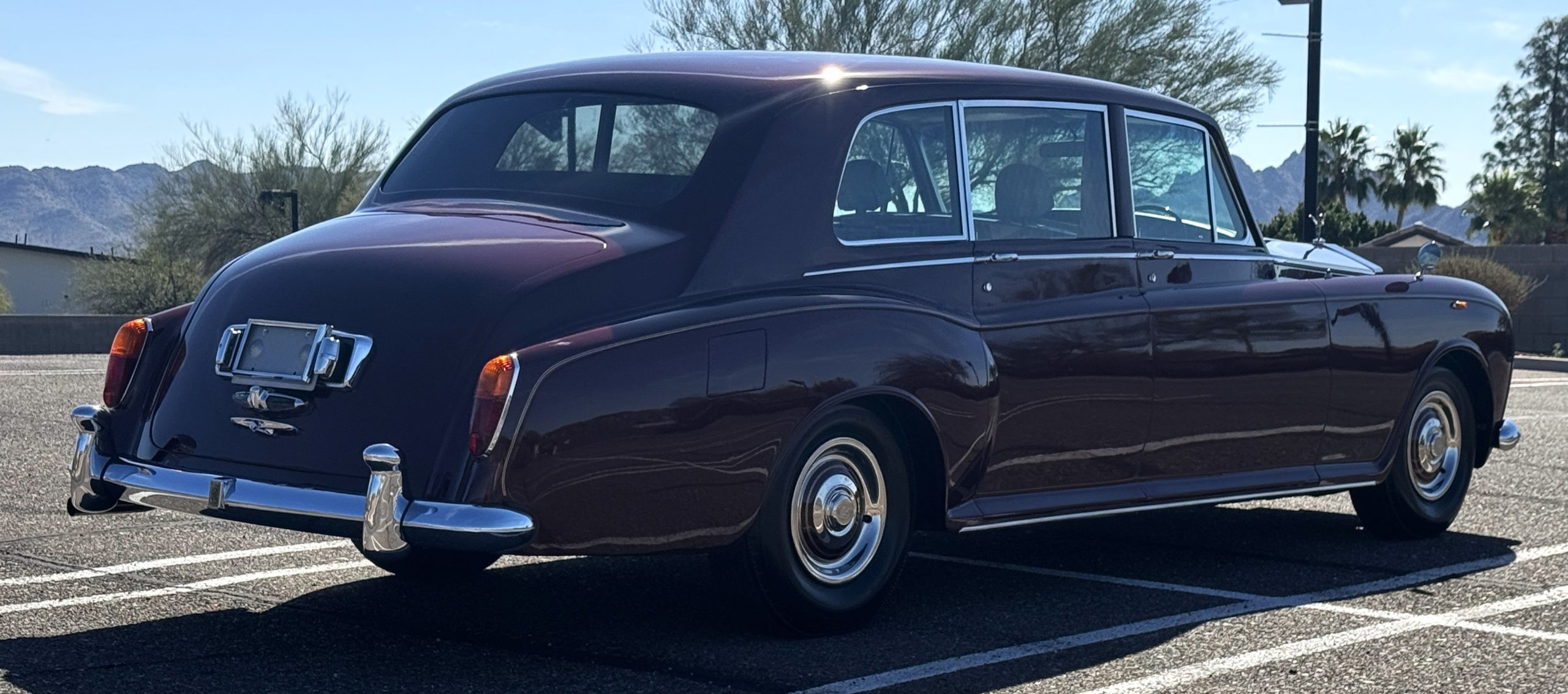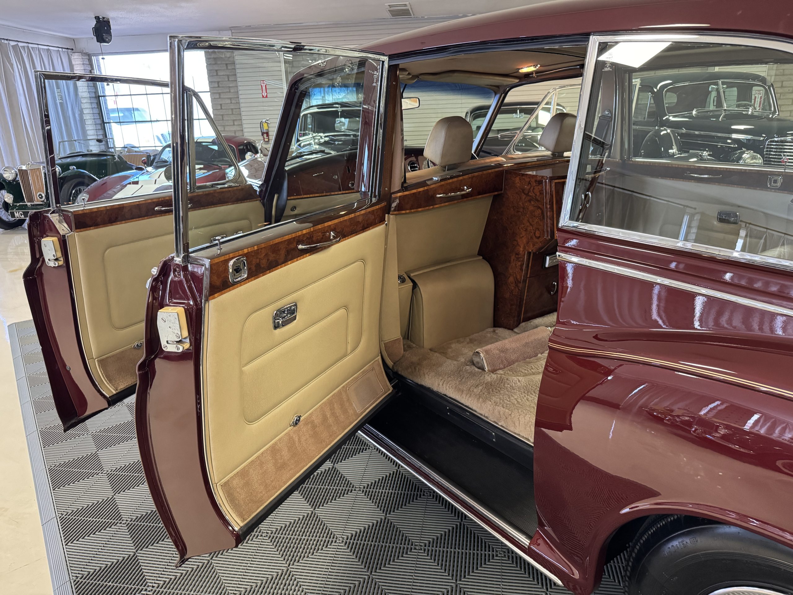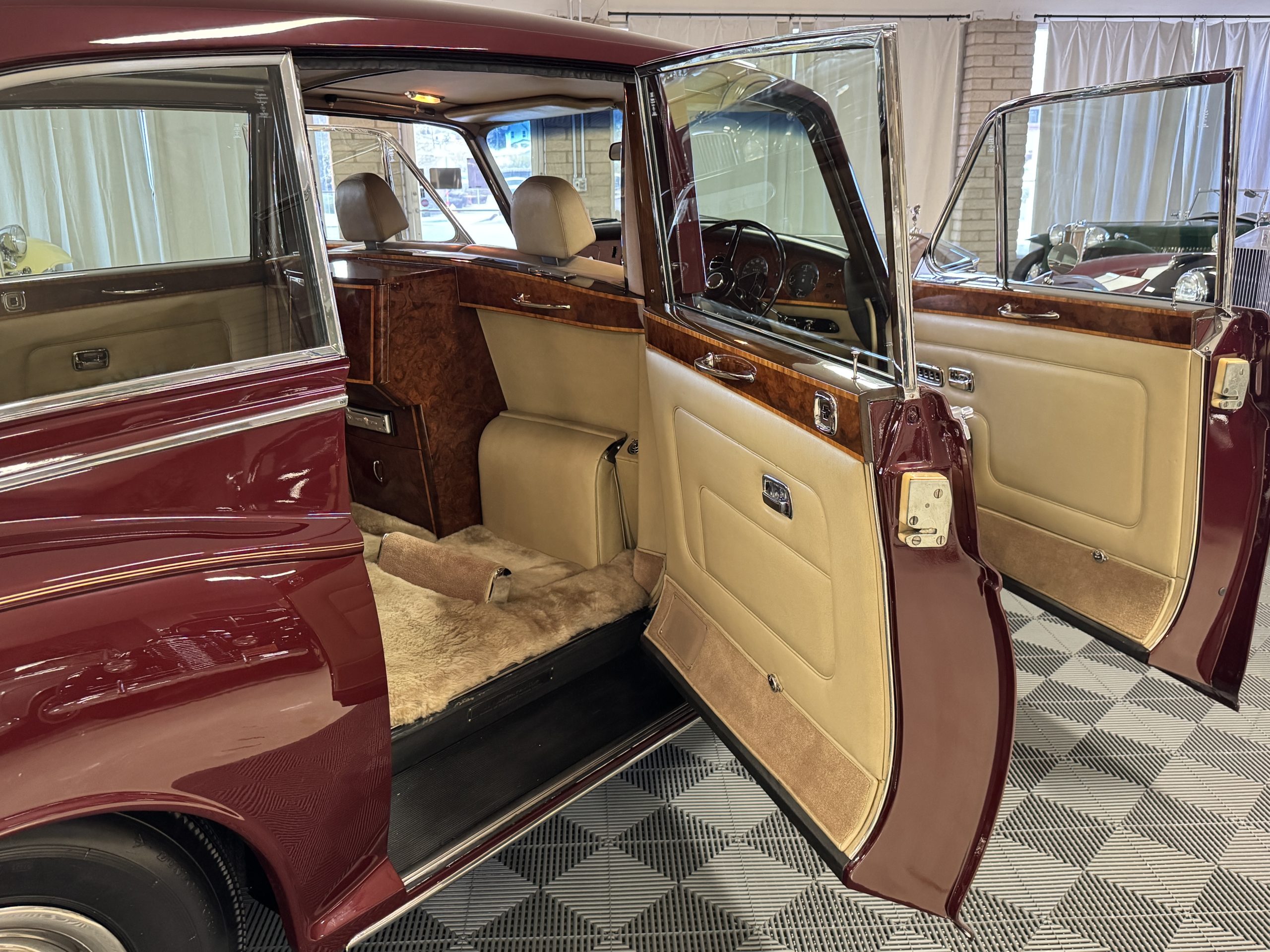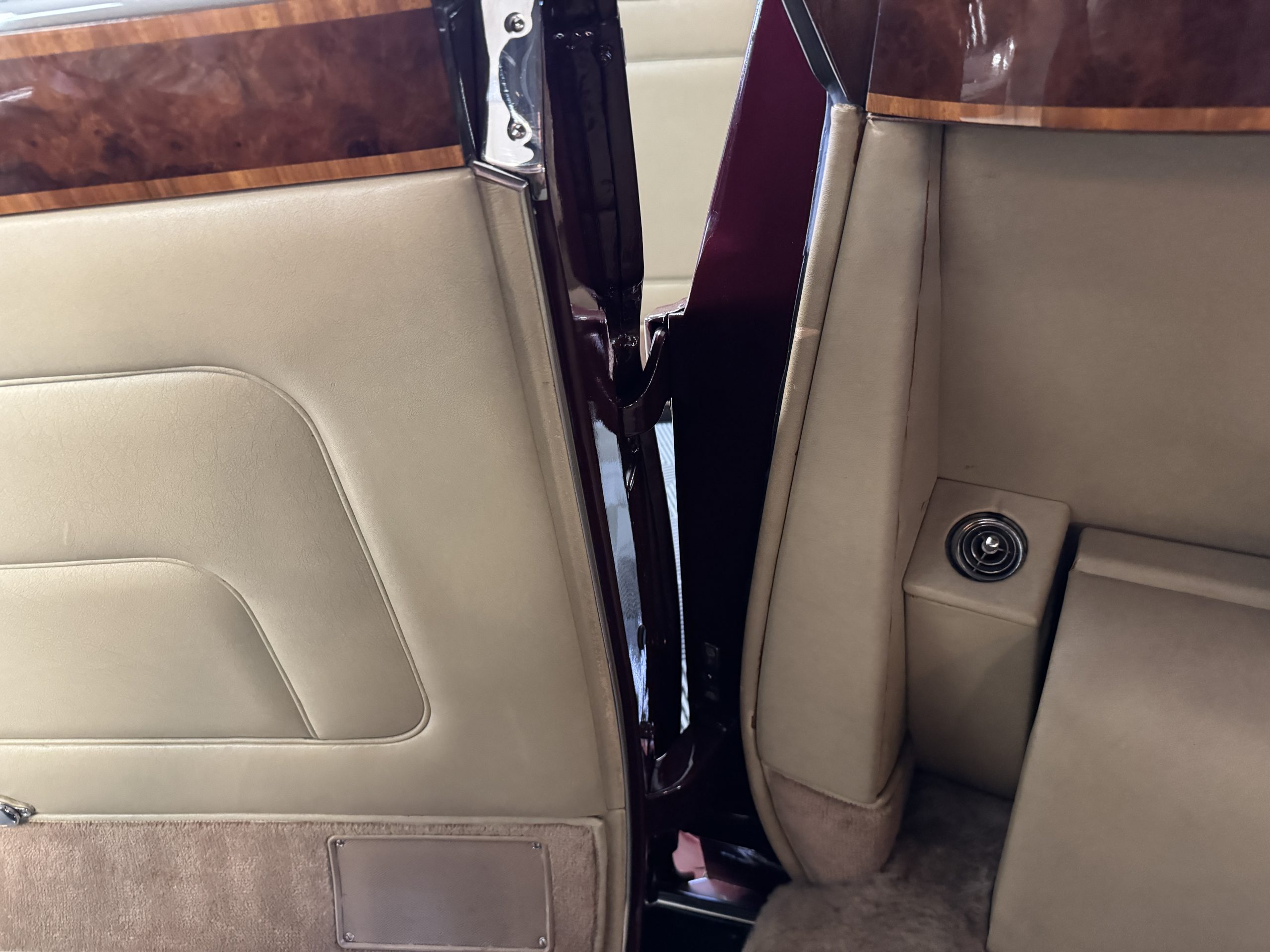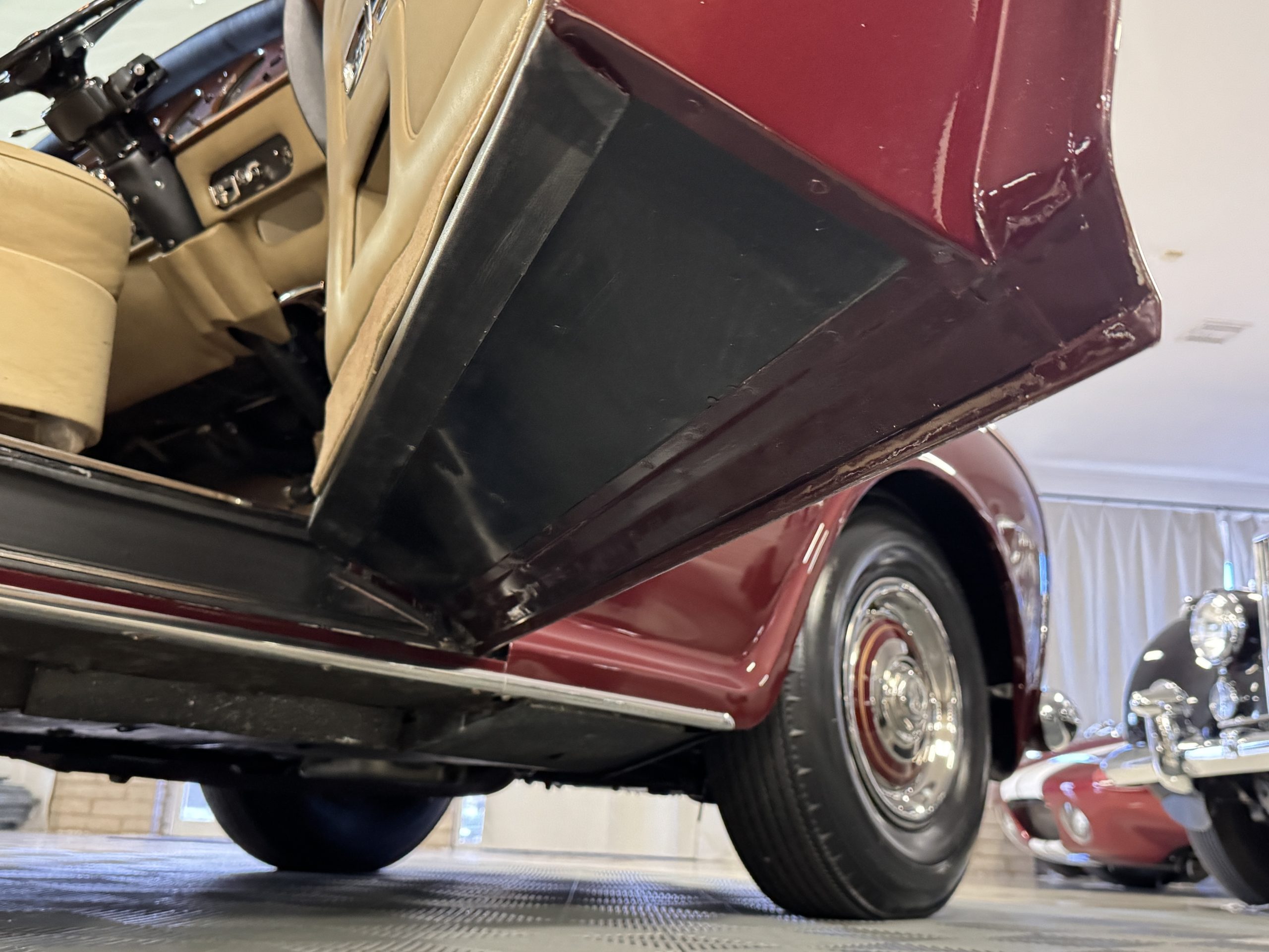 By 1999, the Rolls was treated to a full repaint in Claret metallic and is complimented by fine gold pinstripes. The PPG base-coat clear-coat paintwork is of excellent quality and is in beautiful condition today and was performed by Classic Body Works in Peck, KS. The chrome and stainless-steel trim are in superb condition. The original Lucas fog lights, dual wing mirrors, and the special-order flag mast are all in excellent condition. The chrome wheel covers have the correct Claret trim rings with double gold pinstripes. The correct Dunlap Fort 8.90-15 black walled tires provide the perfect appearance and stature. Overall, the exterior is in concours condition.