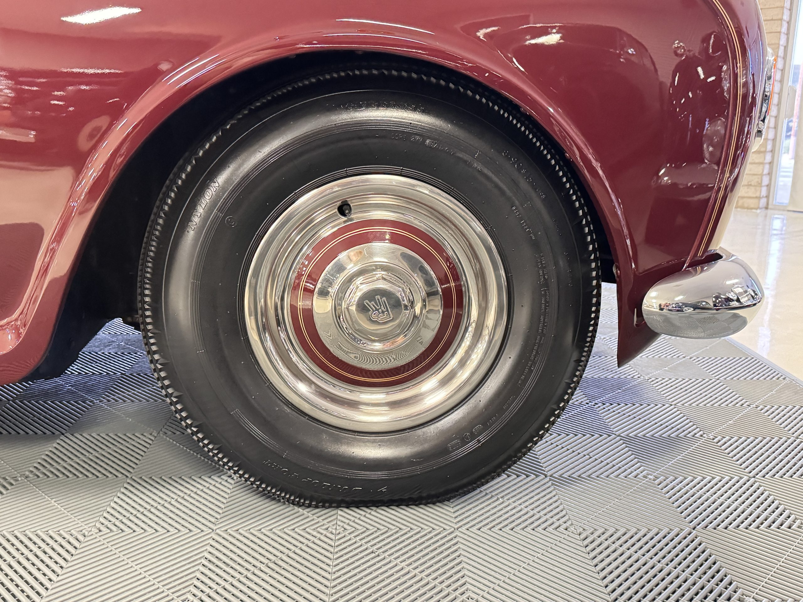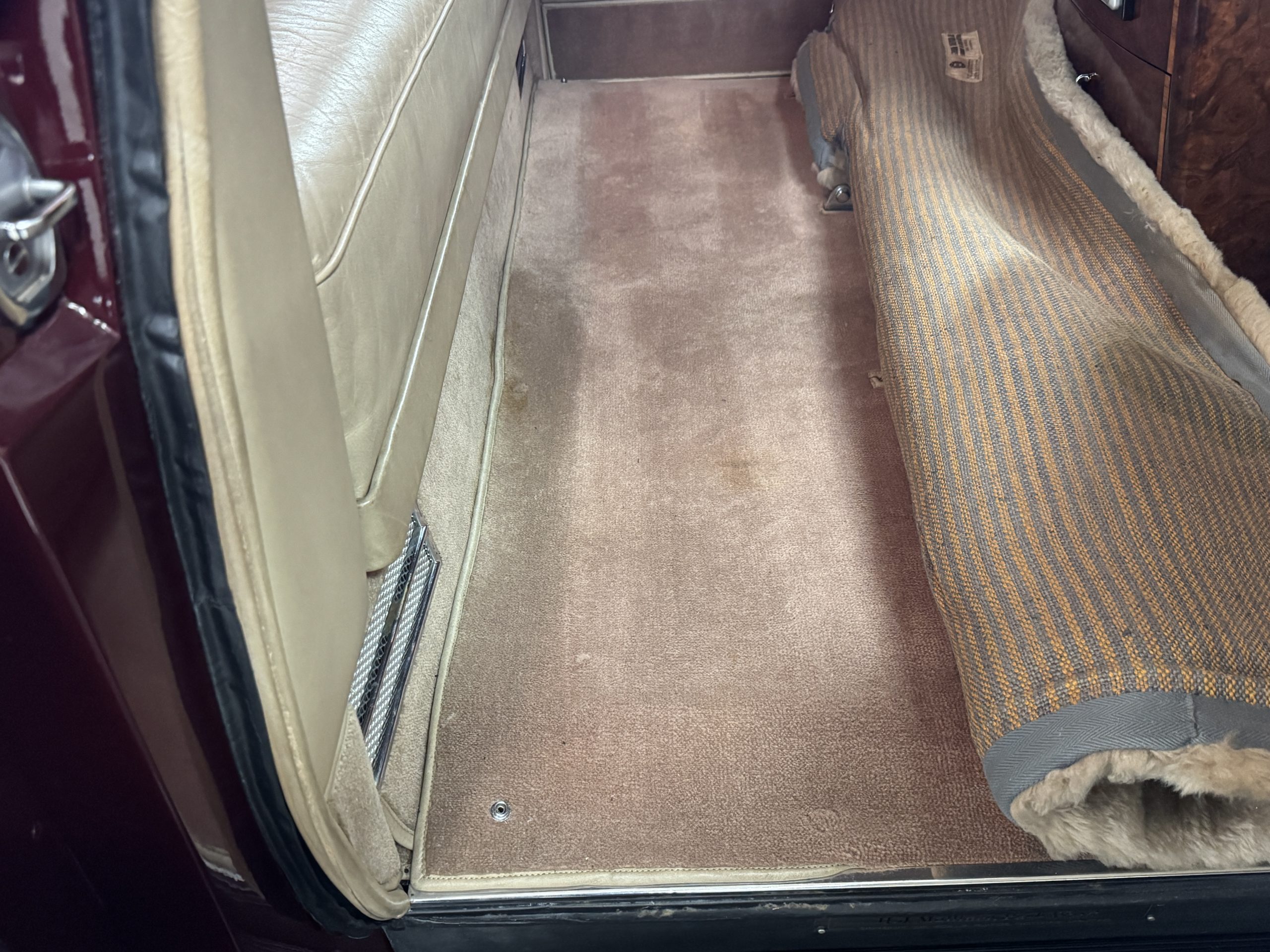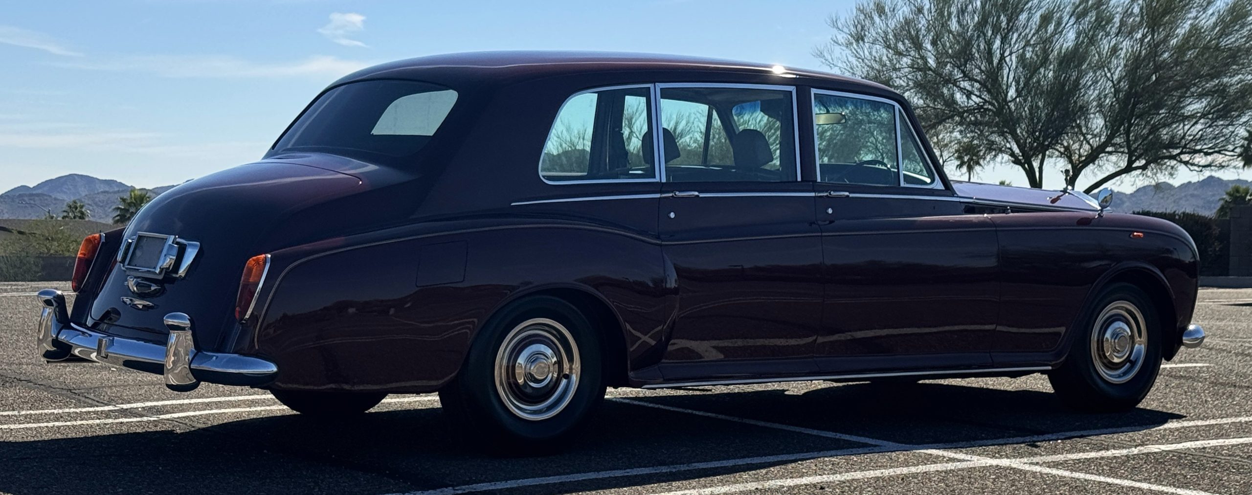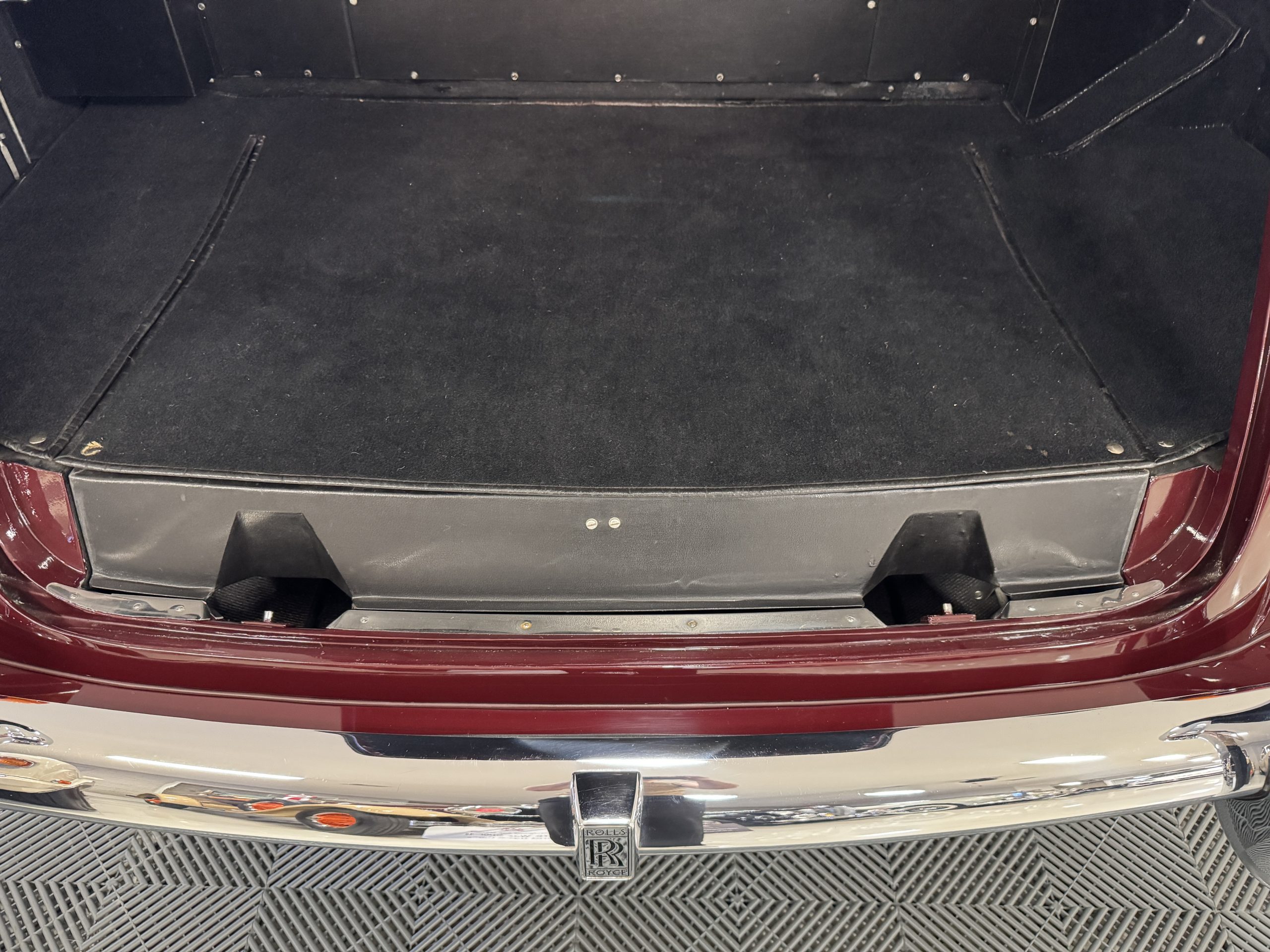 By 1999, the Rolls was treated to a full repaint in Claret metallic and is complimented by fine gold pinstripes. The PPG base-coat clear-coat paintwork is of excellent quality and is in beautiful condition today and was performed by Classic Body Works in Peck, KS. The chrome and stainless-steel trim are in superb condition. The original Lucas fog lights, dual wing mirrors, and the special-order flag mast are all in excellent condition. The chrome wheel covers have the correct Claret trim rings with double gold pinstripes. The correct Dunlap Fort 8.90-15 black walled tires provide the perfect appearance and stature. Overall, the exterior is in concours condition.