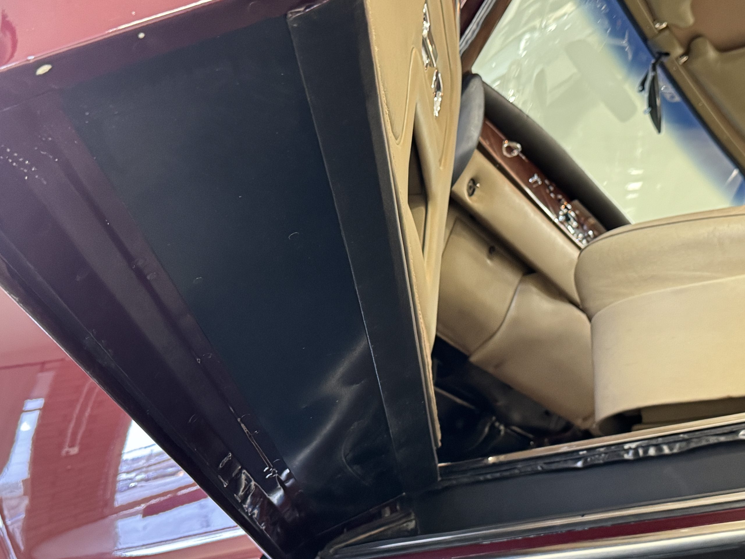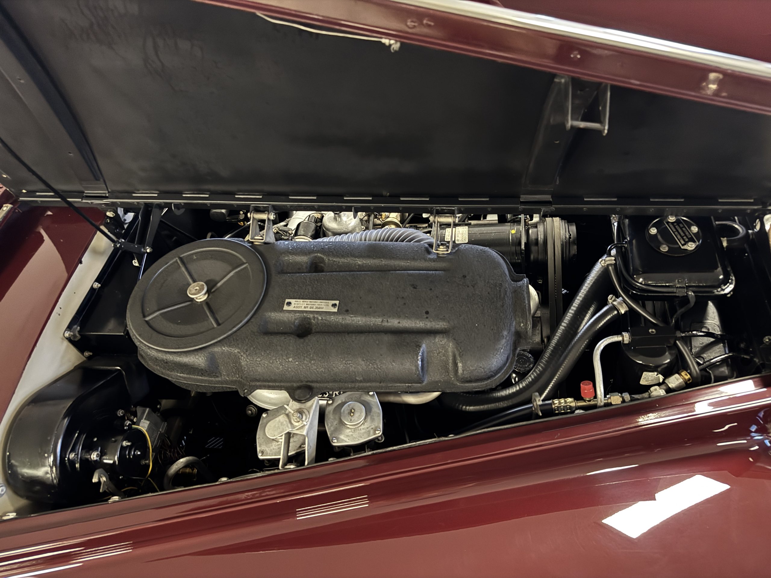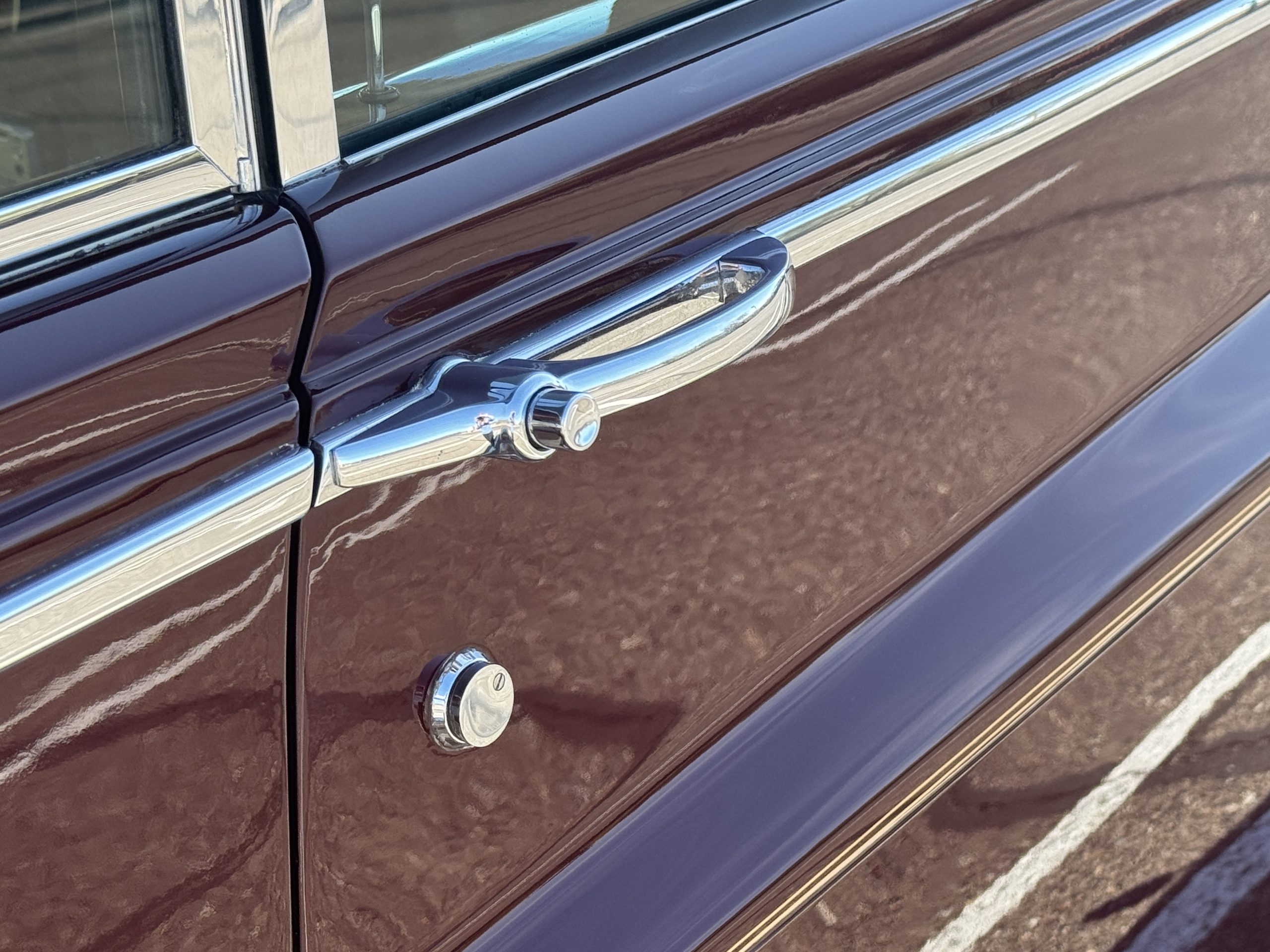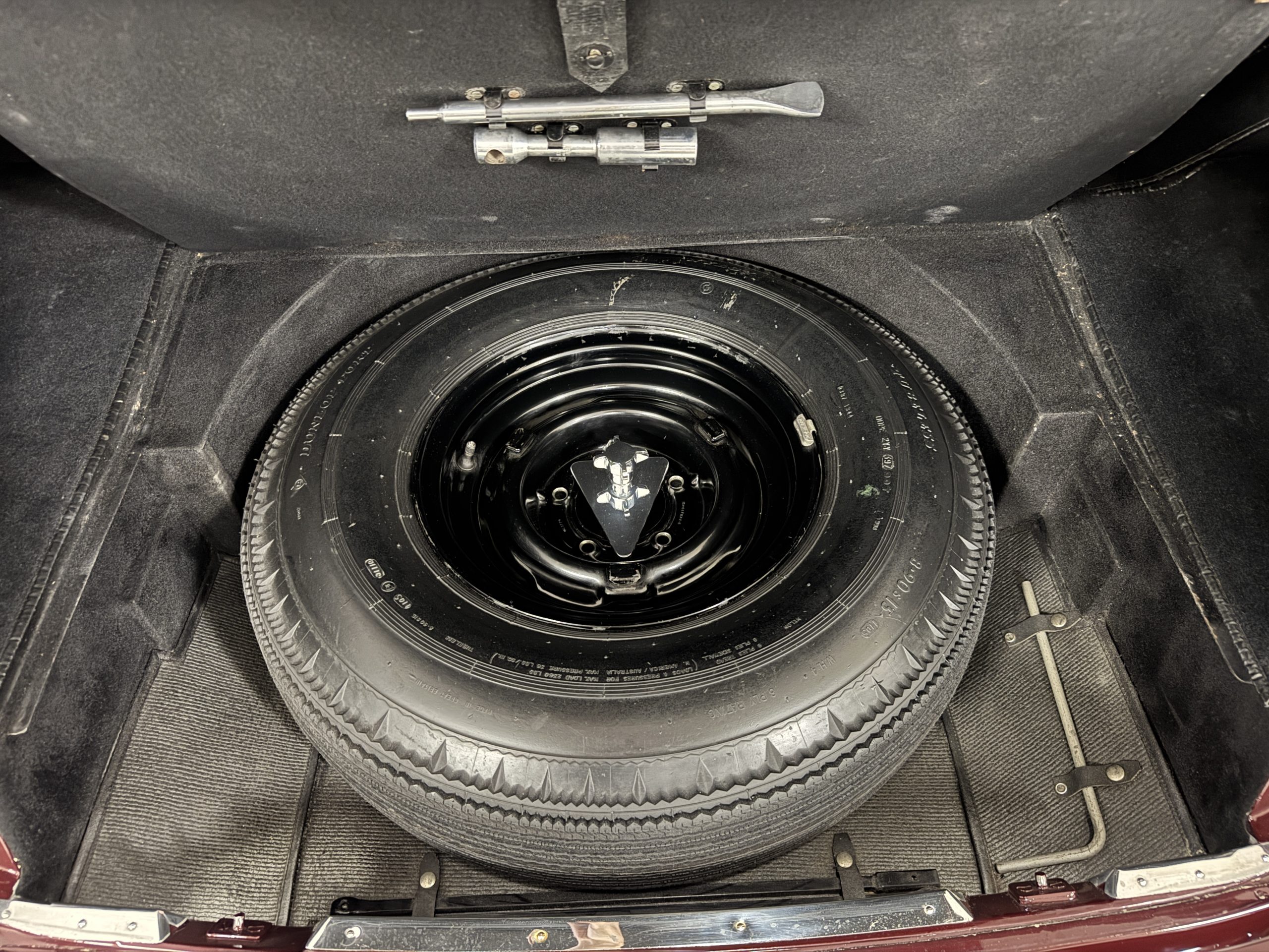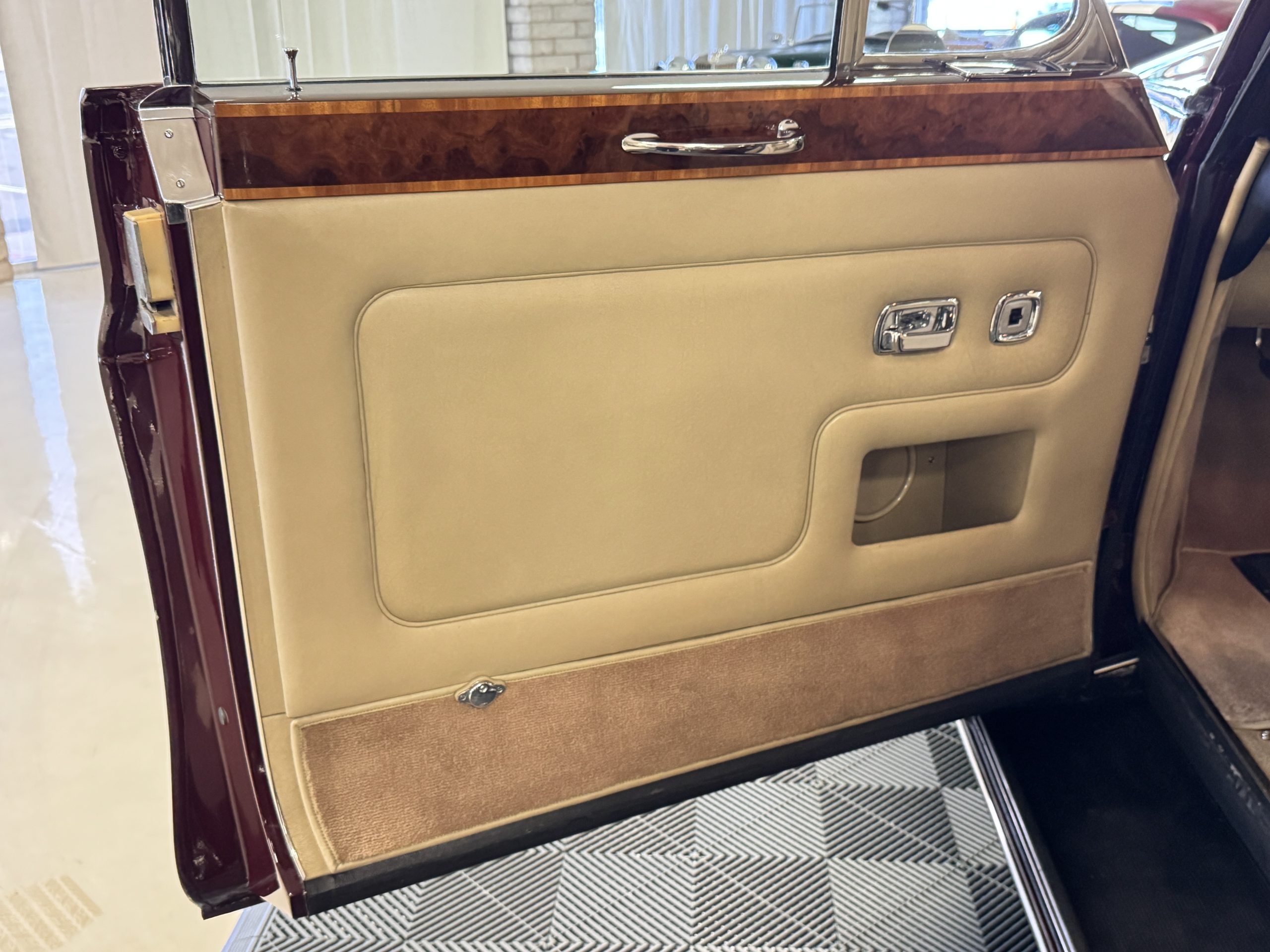 By 1999, the Rolls was treated to a full repaint in Claret metallic and is complimented by fine gold pinstripes. The PPG base-coat clear-coat paintwork is of excellent quality and is in beautiful condition today and was performed by Classic Body Works in Peck, KS. The chrome and stainless-steel trim are in superb condition. The original Lucas fog lights, dual wing mirrors, and the special-order flag mast are all in excellent condition. The chrome wheel covers have the correct Claret trim rings with double gold pinstripes. The correct Dunlap Fort 8.90-15 black walled tires provide the perfect appearance and stature. Overall, the exterior is in concours condition.