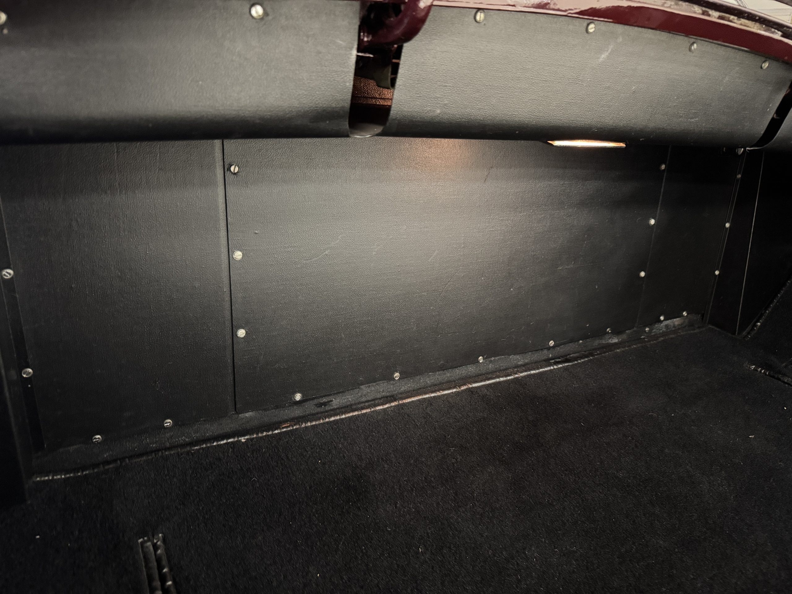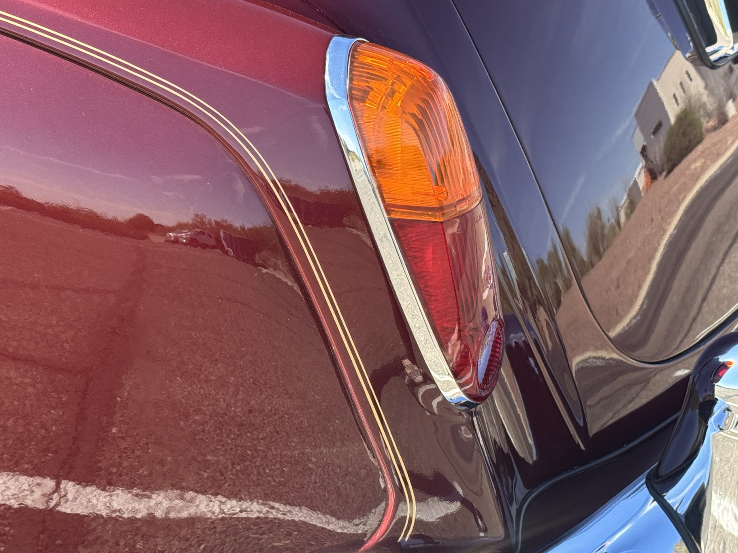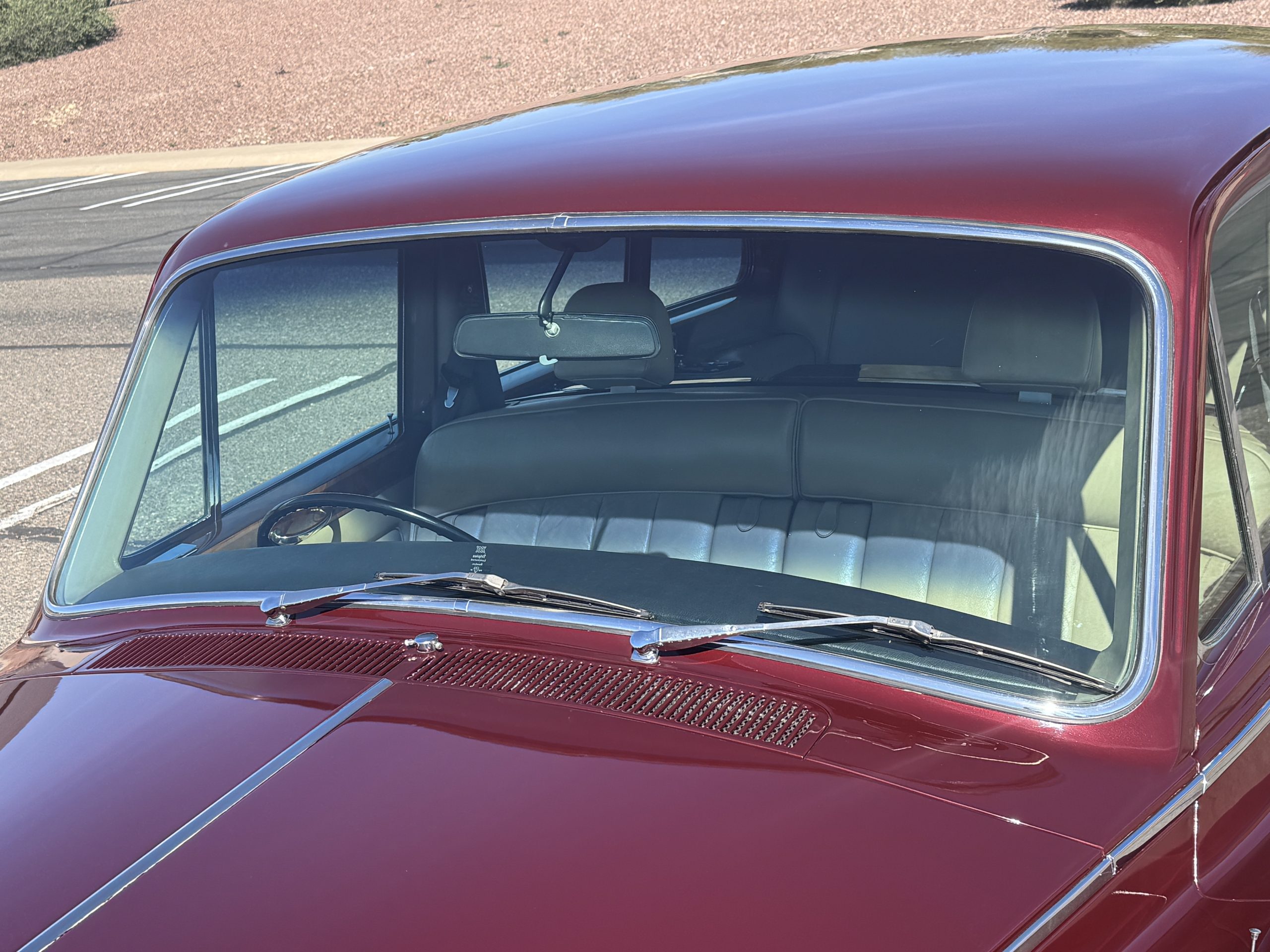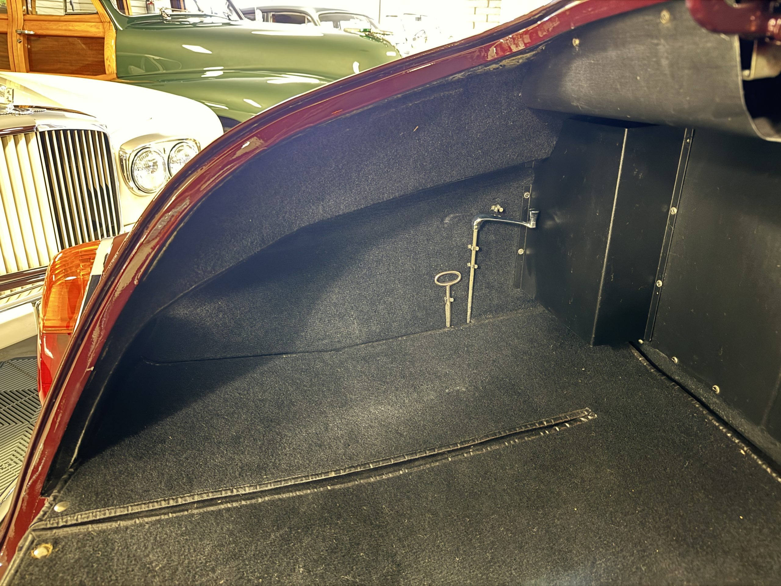 By 1999, the Rolls was treated to a full repaint in Claret metallic and is complimented by fine gold pinstripes. The PPG base-coat clear-coat paintwork is of excellent quality and is in beautiful condition today and was performed by Classic Body Works in Peck, KS. The chrome and stainless-steel trim are in superb condition. The original Lucas fog lights, dual wing mirrors, and the special-order flag mast are all in excellent condition. The chrome wheel covers have the correct Claret trim rings with double gold pinstripes. The correct Dunlap Fort 8.90-15 black walled tires provide the perfect appearance and stature. Overall, the exterior is in concours condition.