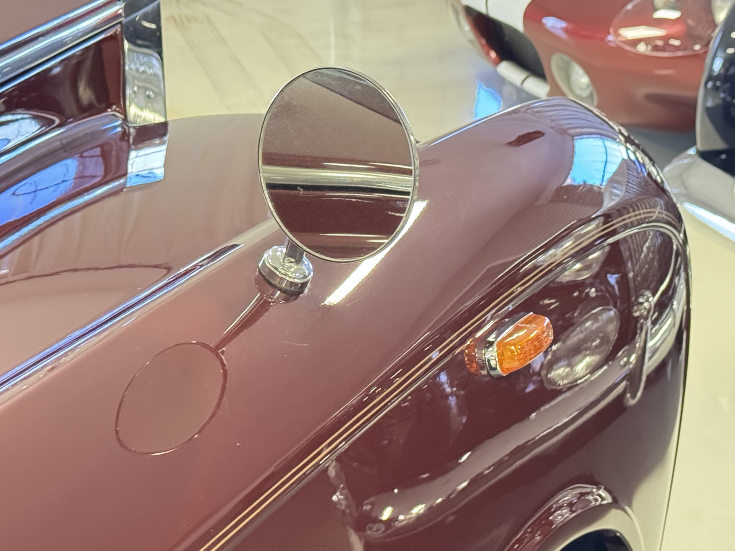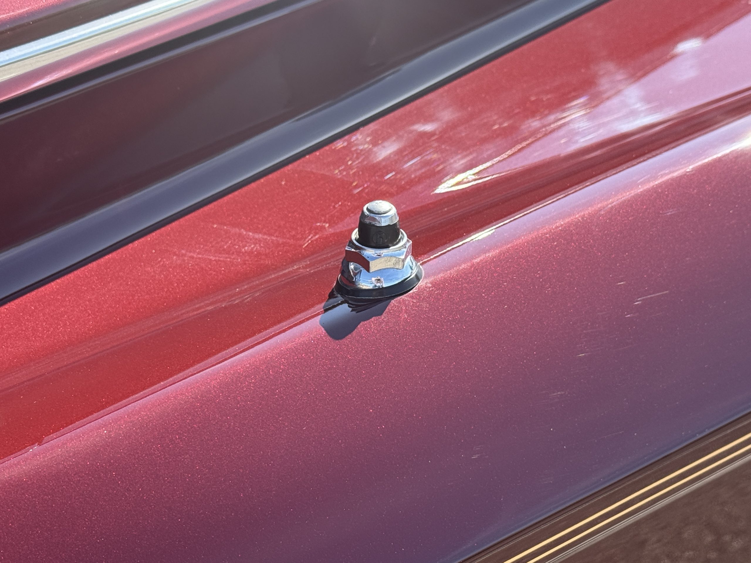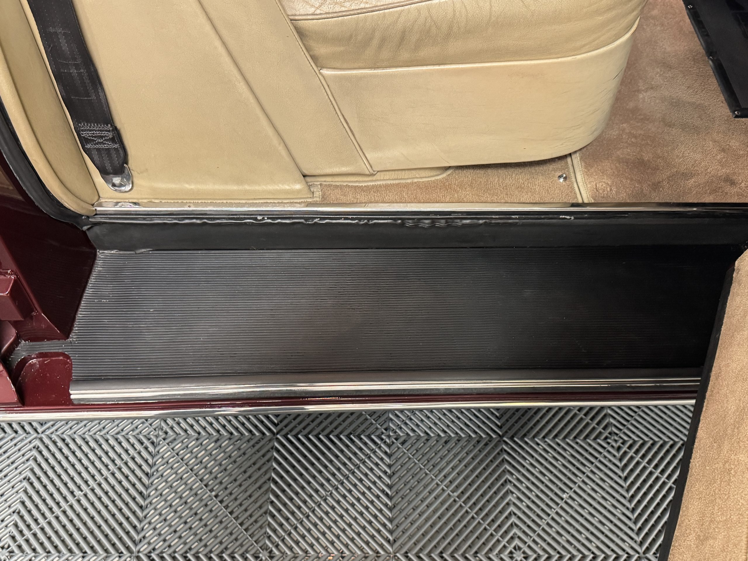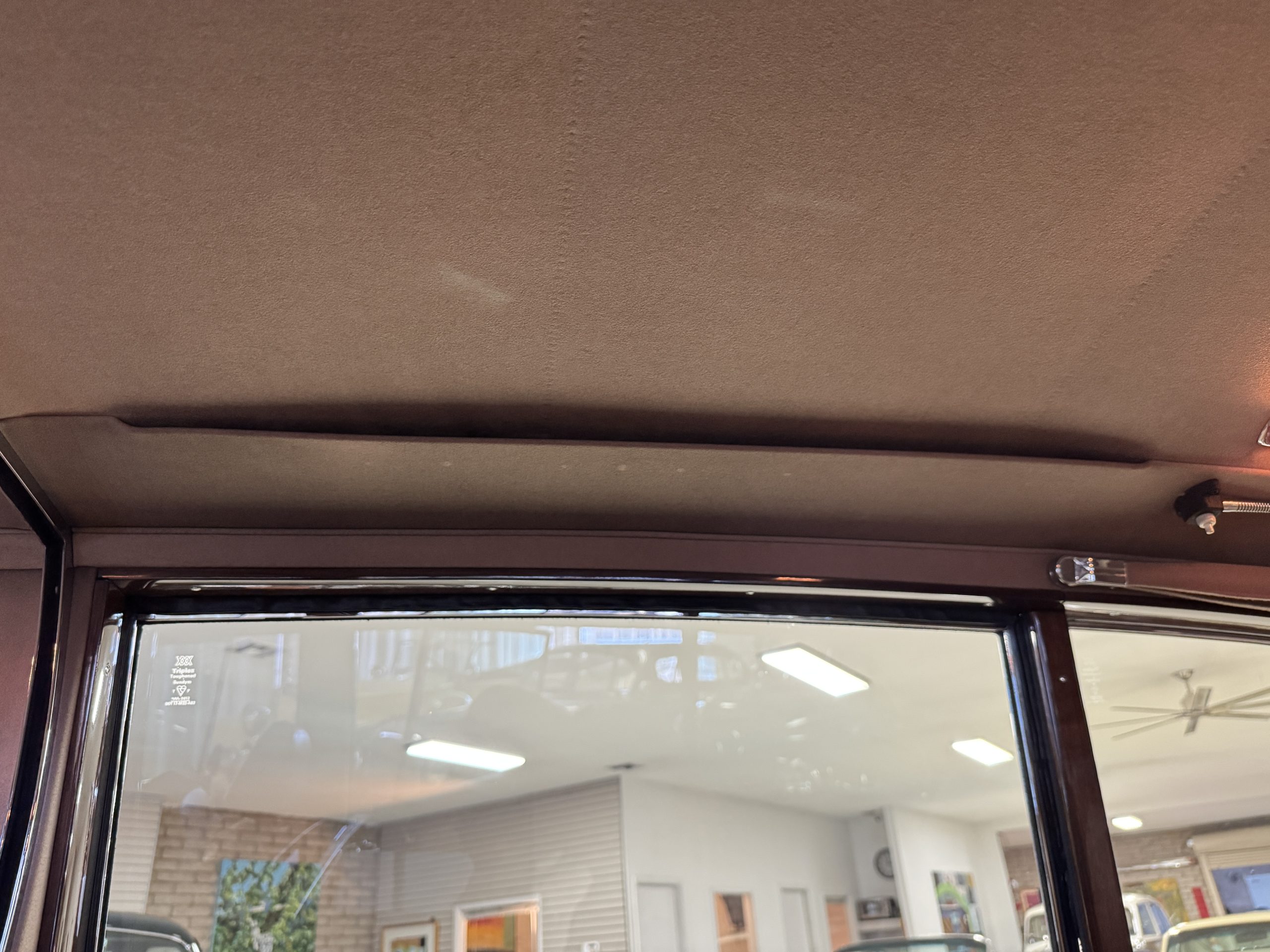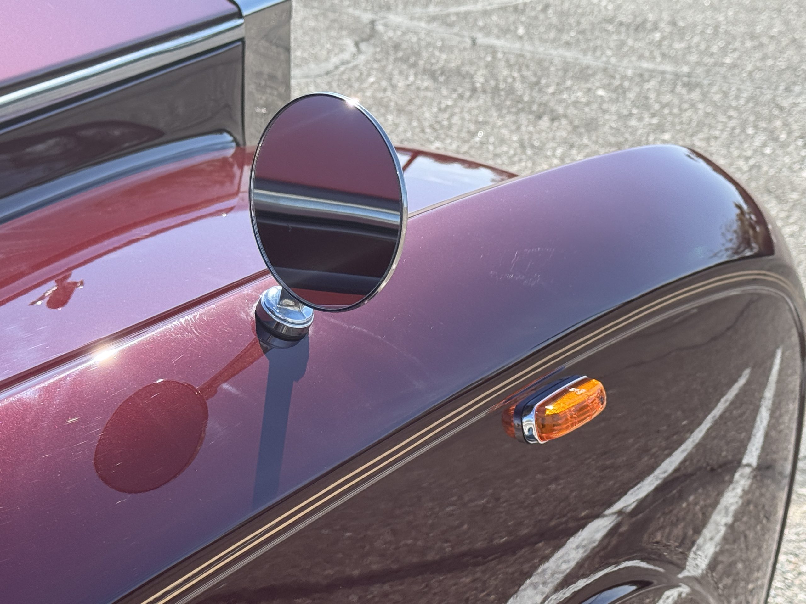 By 1999, the Rolls was treated to a full repaint in Claret metallic and is complimented by fine gold pinstripes. The PPG base-coat clear-coat paintwork is of excellent quality and is in beautiful condition today and was performed by Classic Body Works in Peck, KS. The chrome and stainless-steel trim are in superb condition. The original Lucas fog lights, dual wing mirrors, and the special-order flag mast are all in excellent condition. The chrome wheel covers have the correct Claret trim rings with double gold pinstripes. The correct Dunlap Fort 8.90-15 black walled tires provide the perfect appearance and stature. Overall, the exterior is in concours condition.