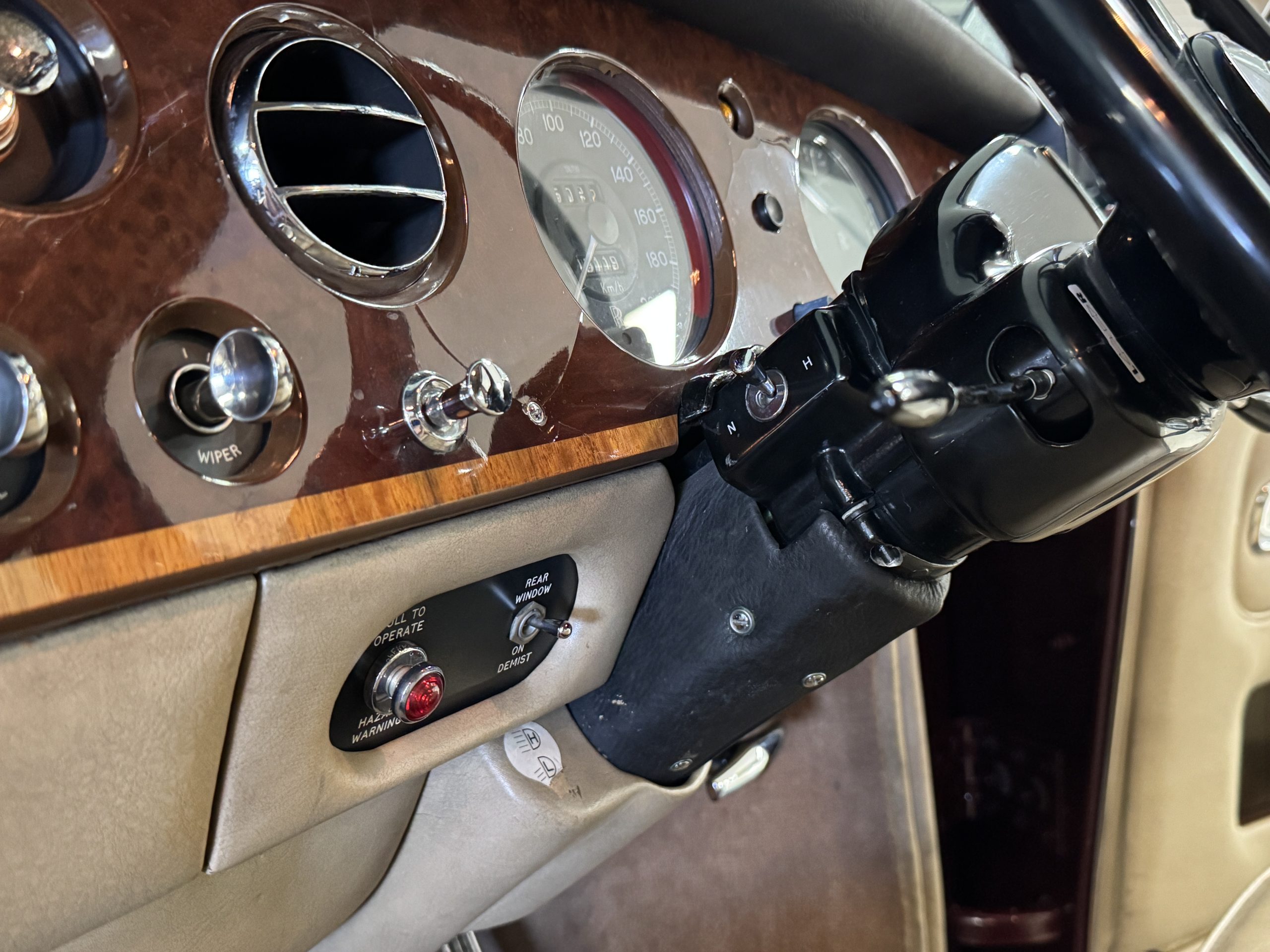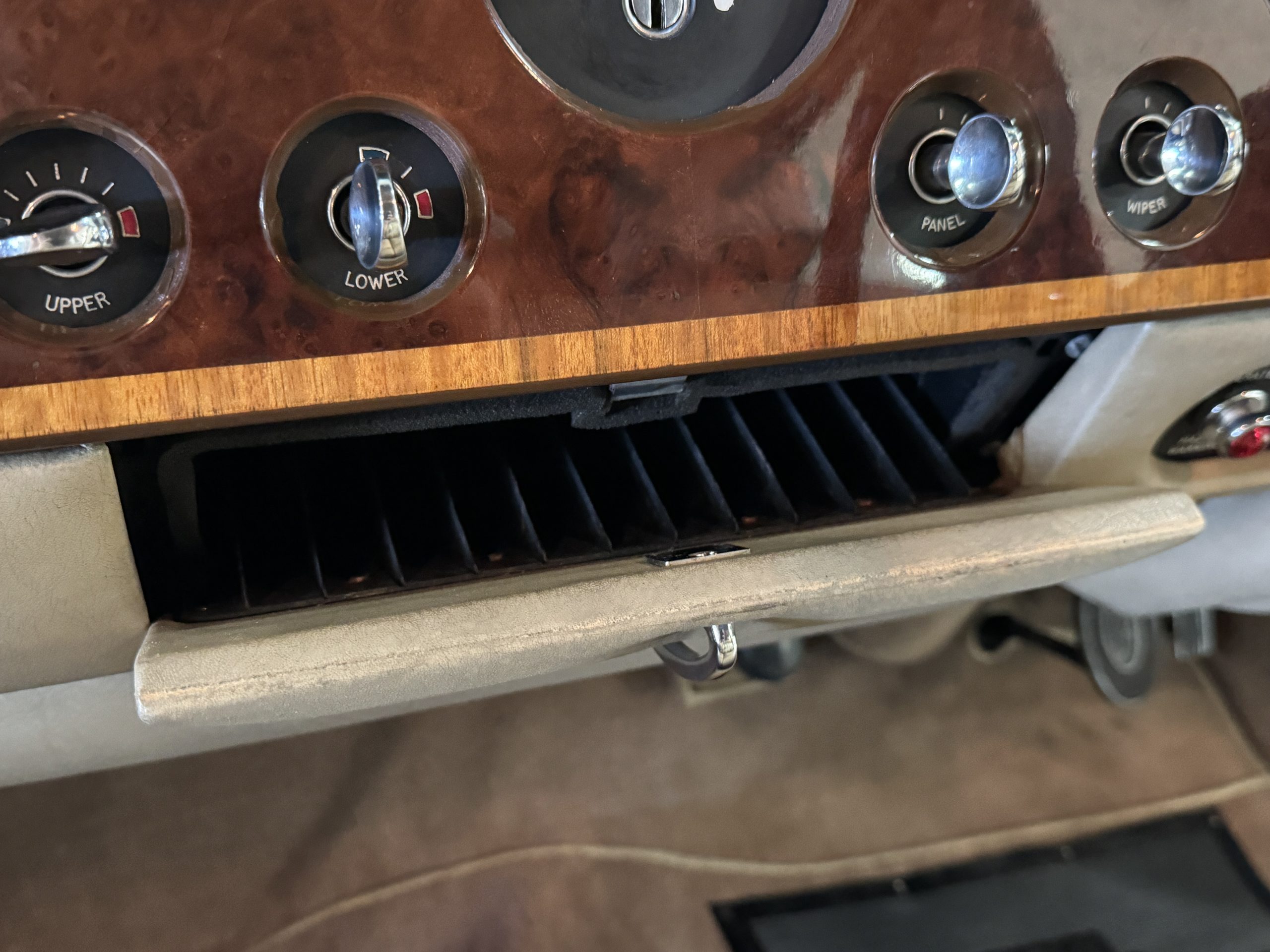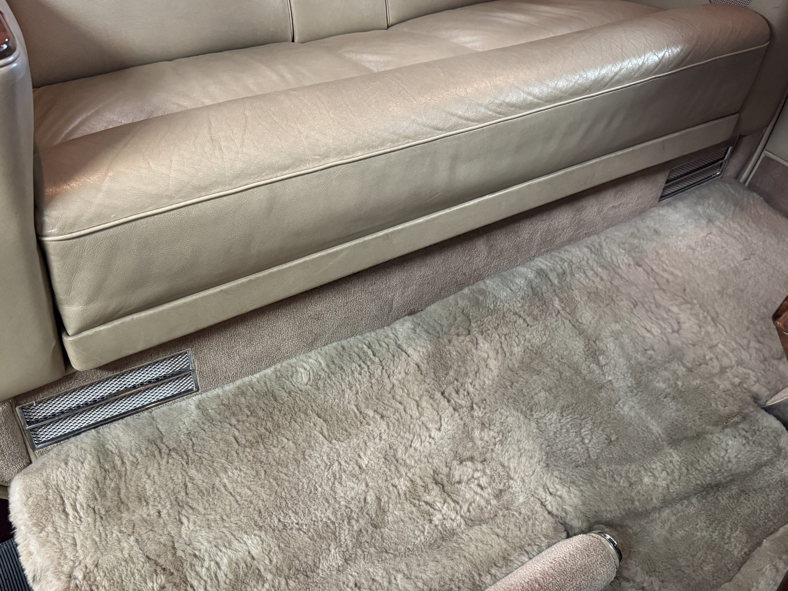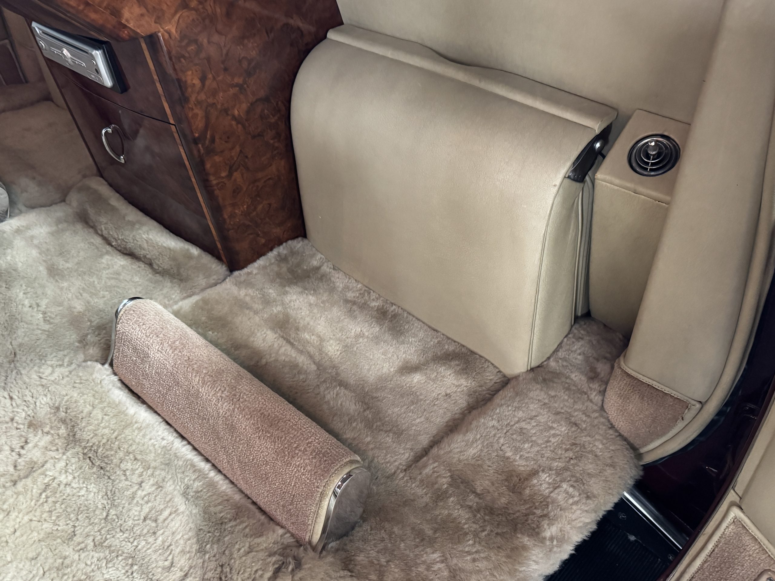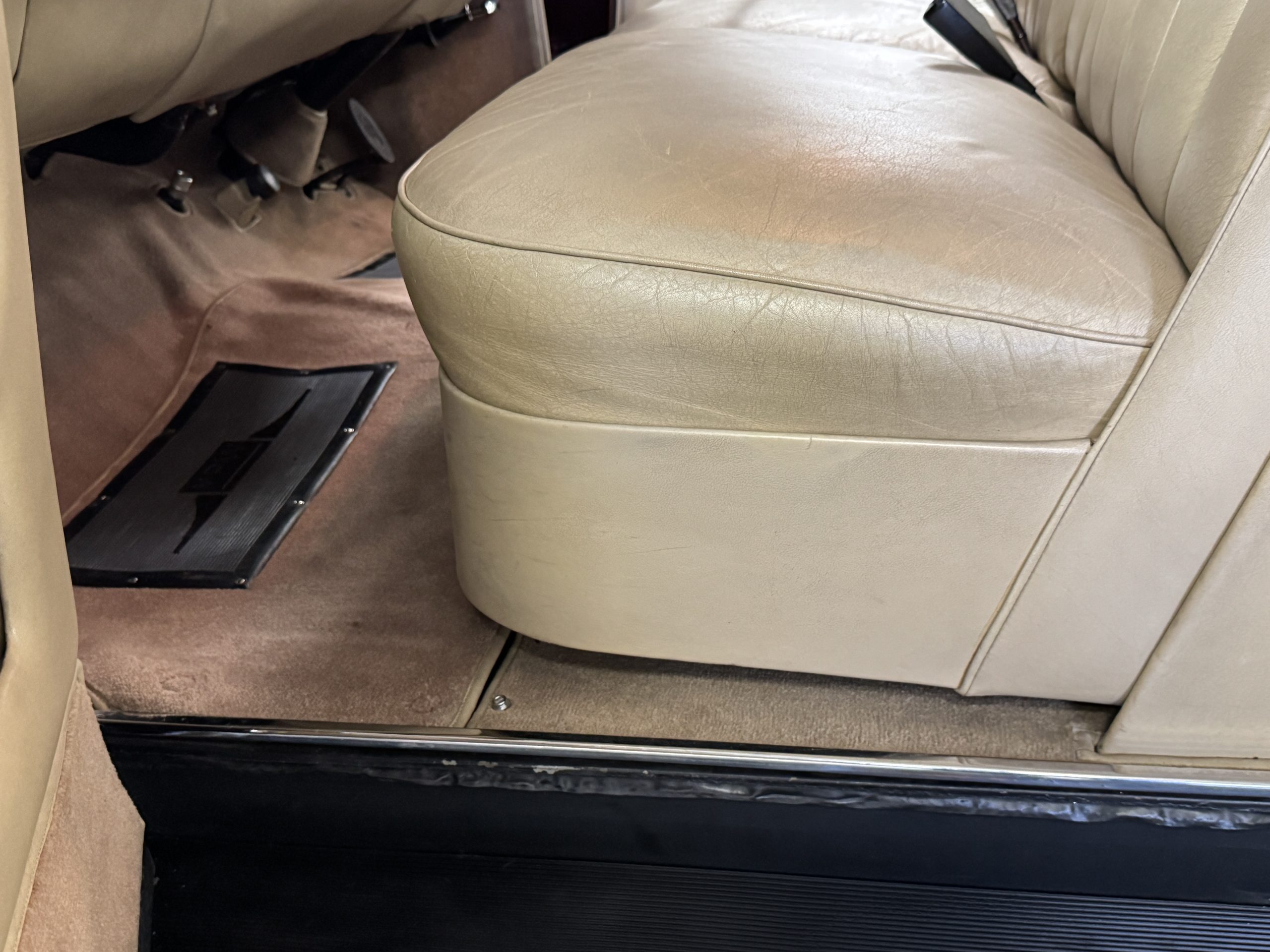 The front passenger compartment also features its original Beige leather and carpeting, and the Phantom comes with its original factory Beige mouton wool overlays. The front seats feature factory leather headrests. The dash facia is from the more modern Silver Shadow series and the gorgeous wood has some minor cracks in the original finish. The interior is overall in beautiful original condition and would be welcomed at any concours event.
