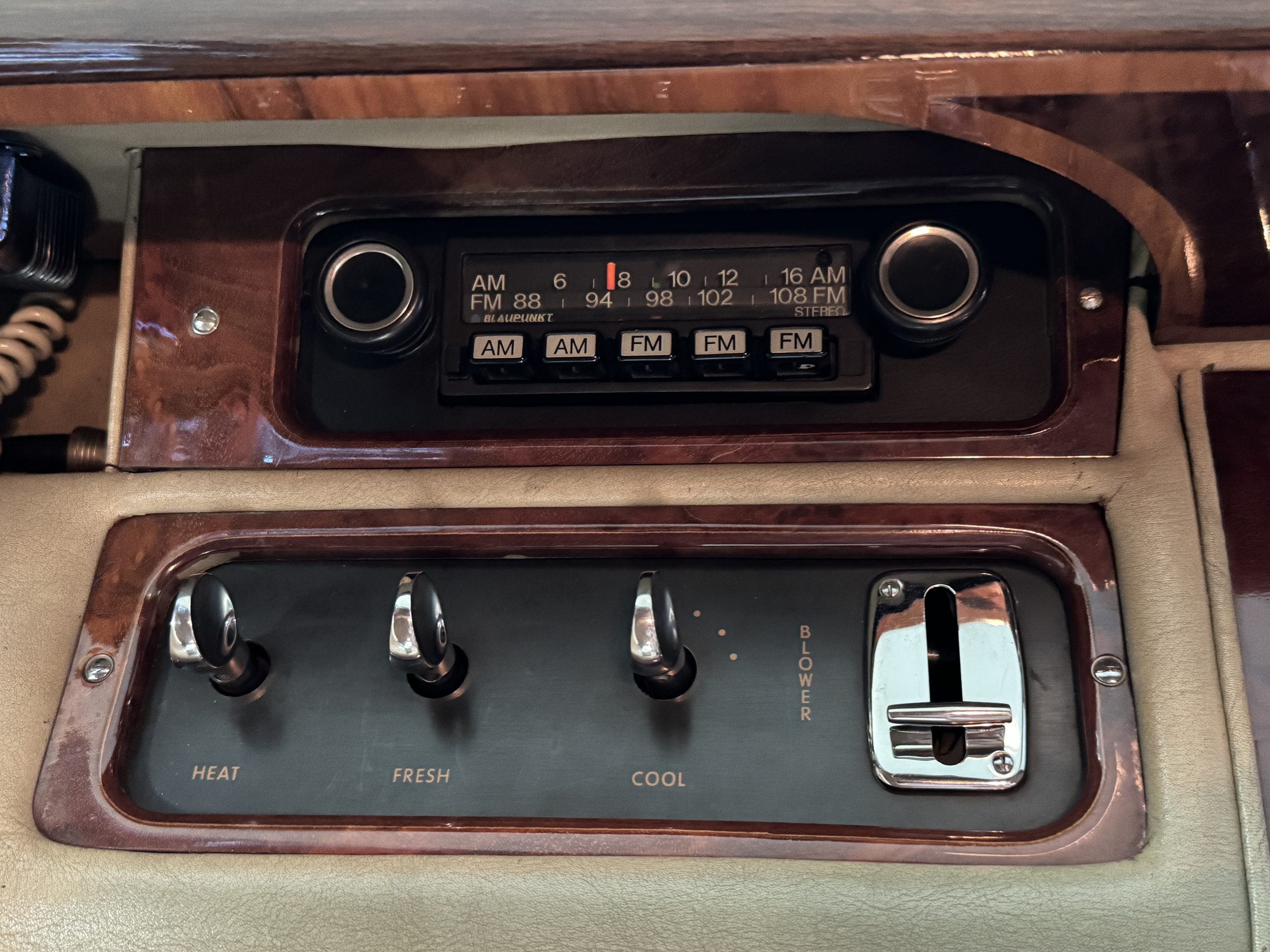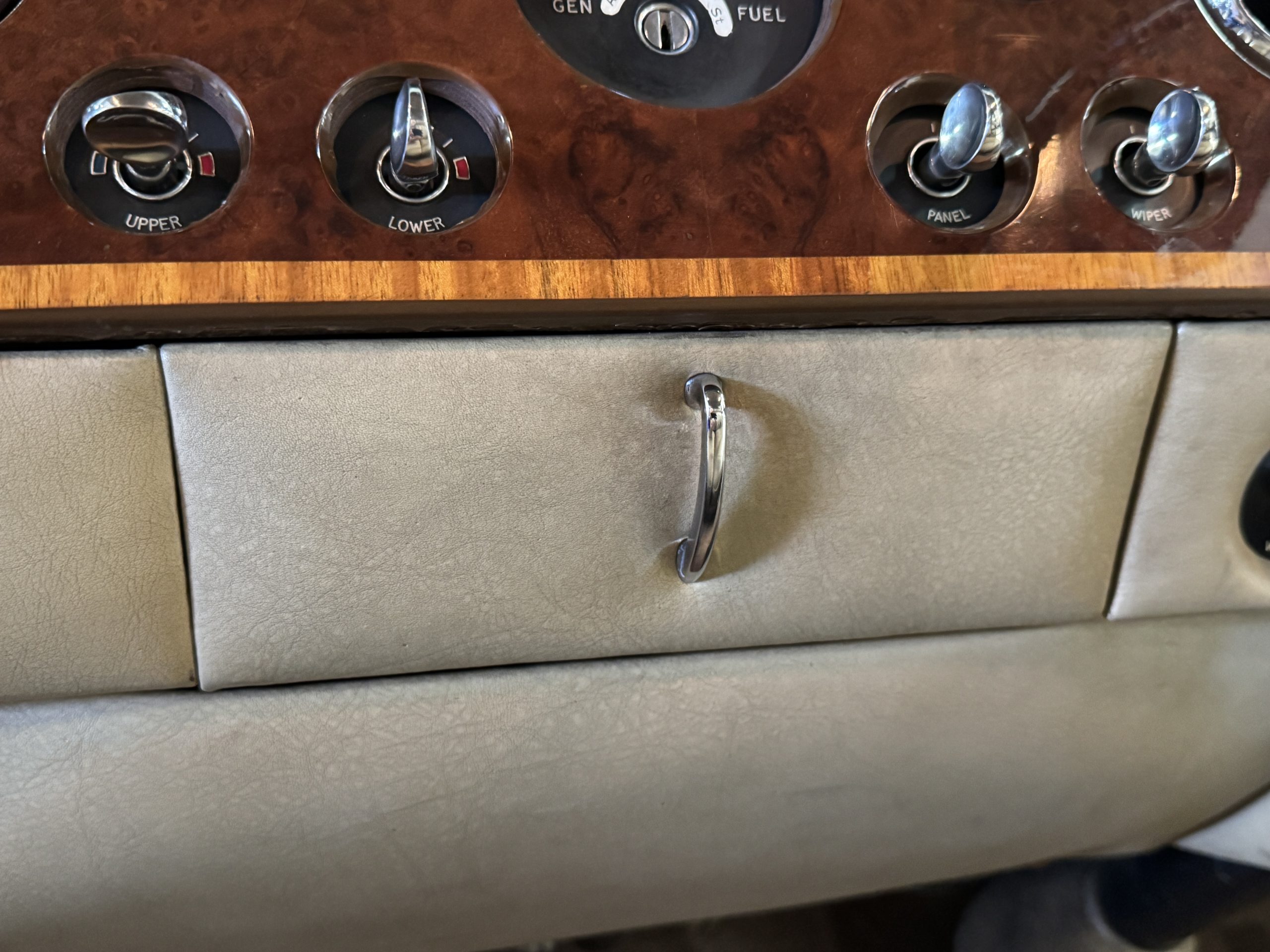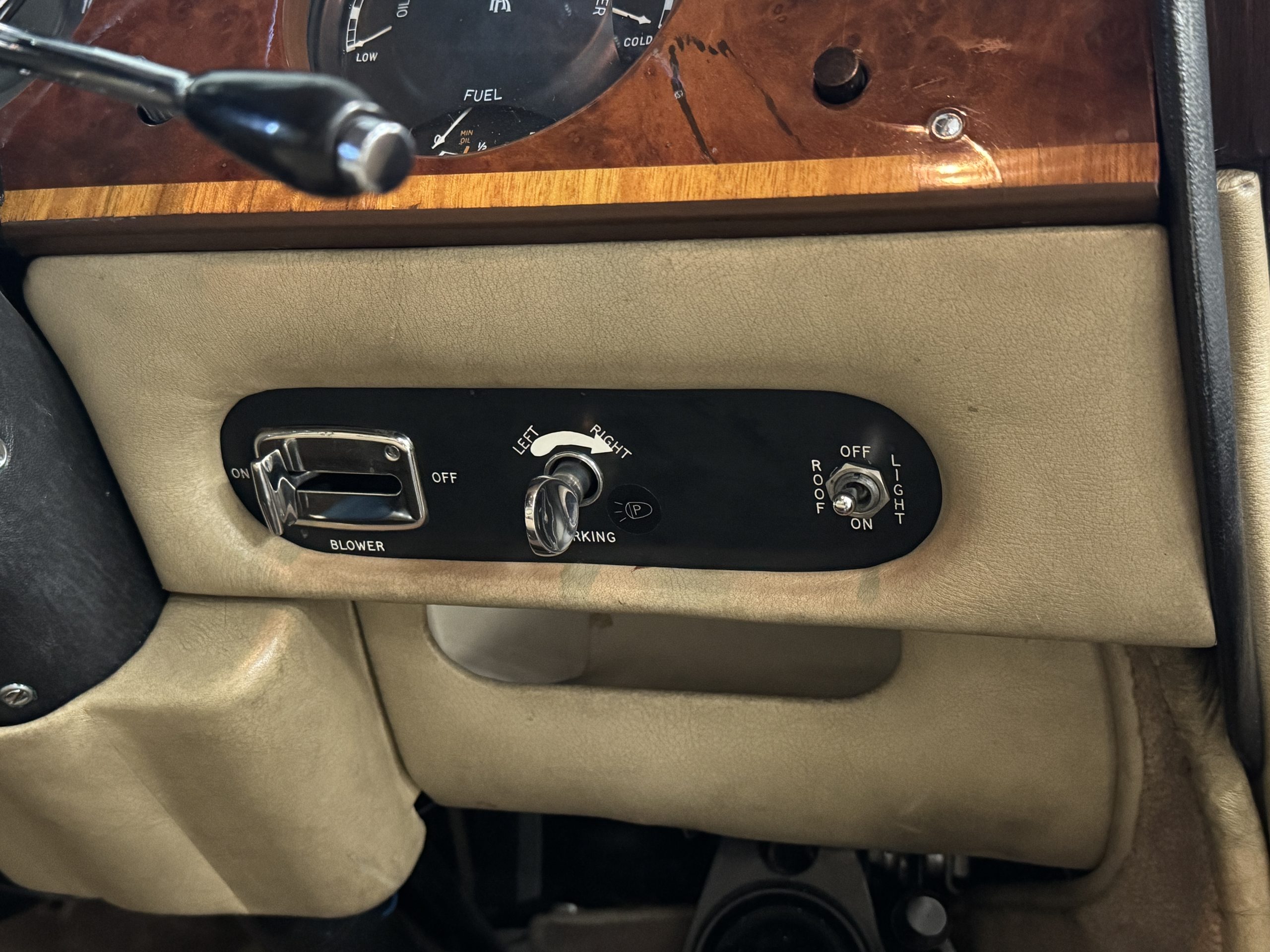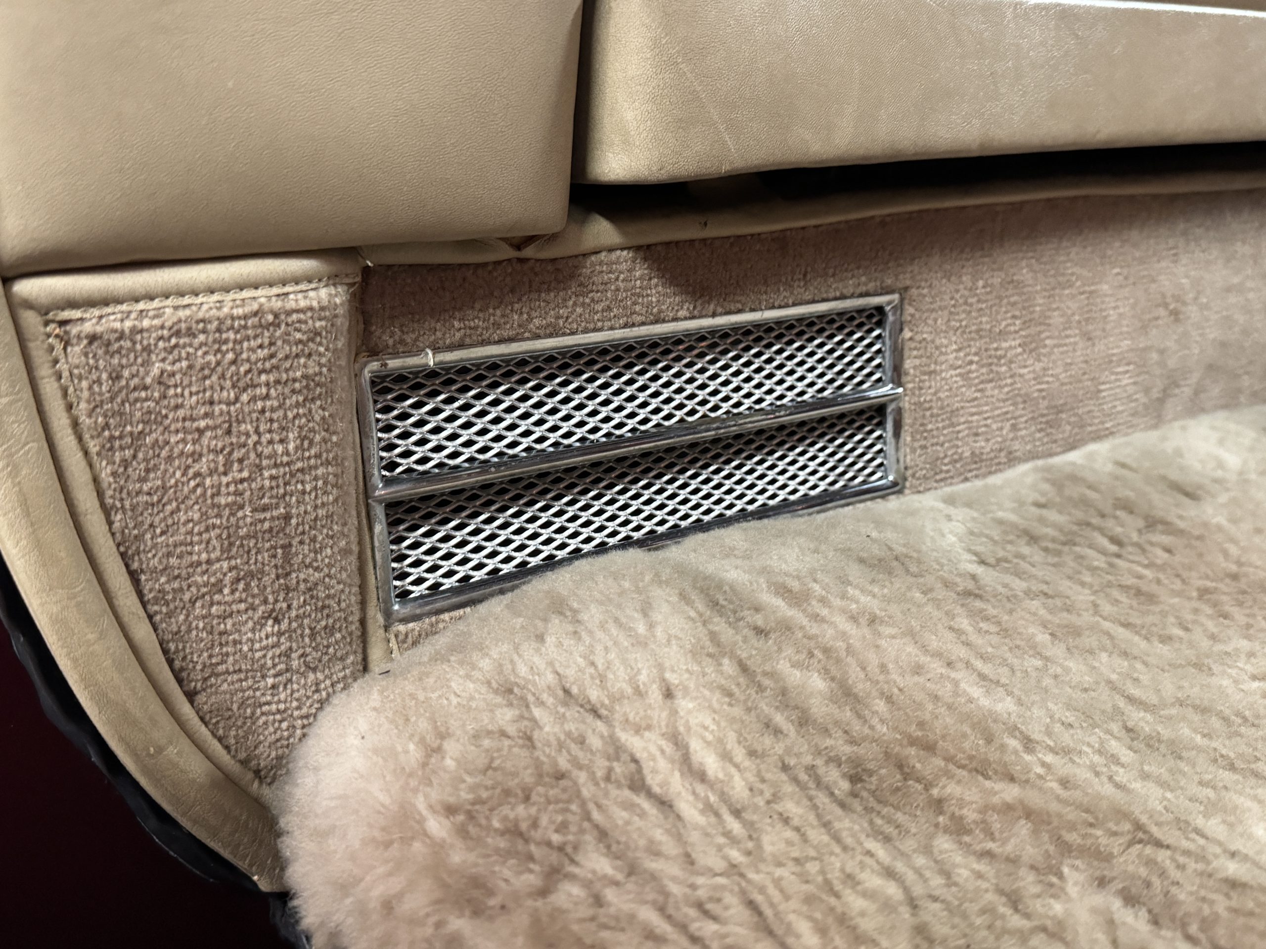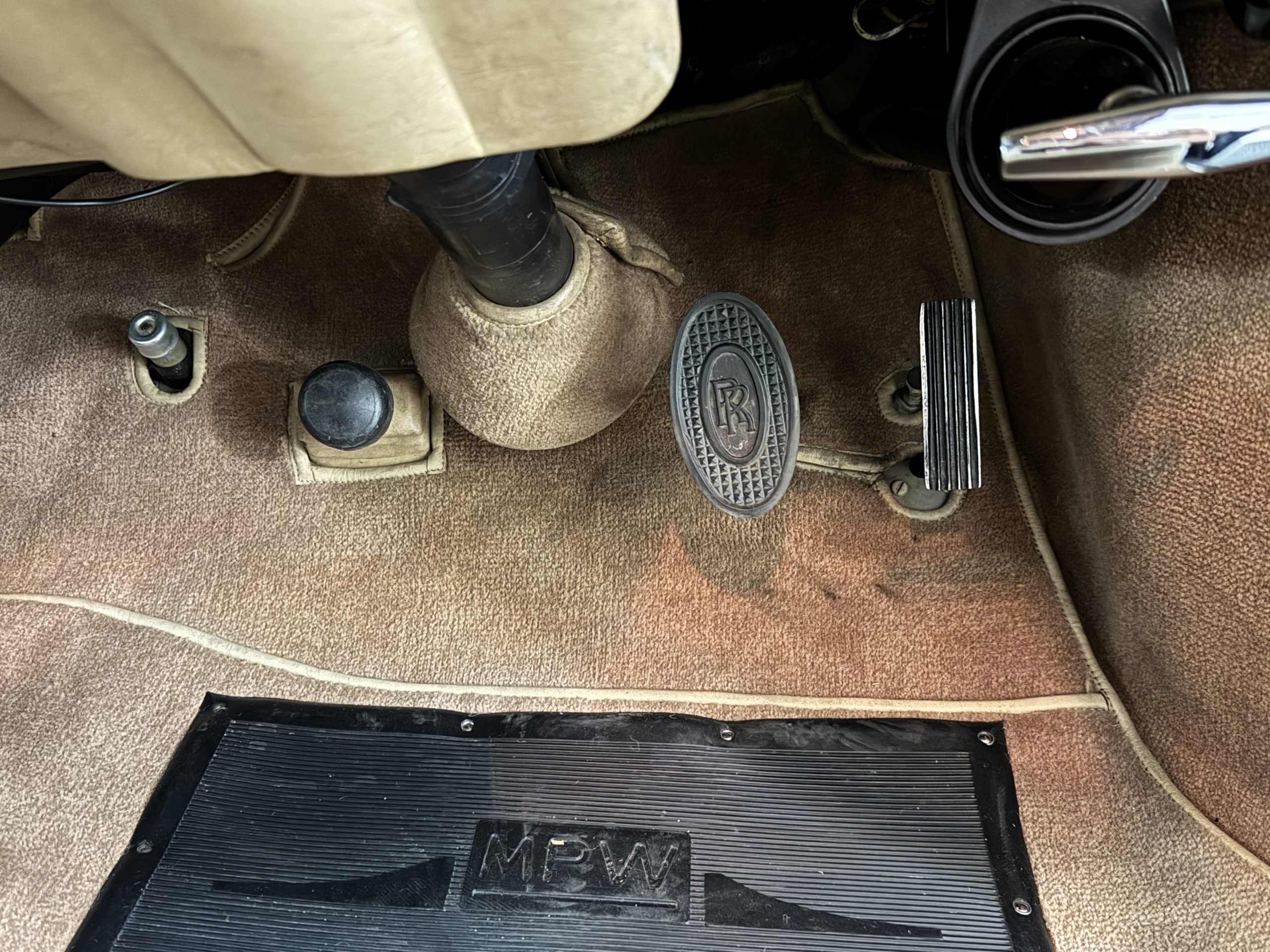 The front passenger compartment also features its original Beige leather and carpeting, and the Phantom comes with its original factory Beige mouton wool overlays. The front seats feature factory leather headrests. The dash facia is from the more modern Silver Shadow series and the gorgeous wood has some minor cracks in the original finish. The interior is overall in beautiful original condition and would be welcomed at any concours event.