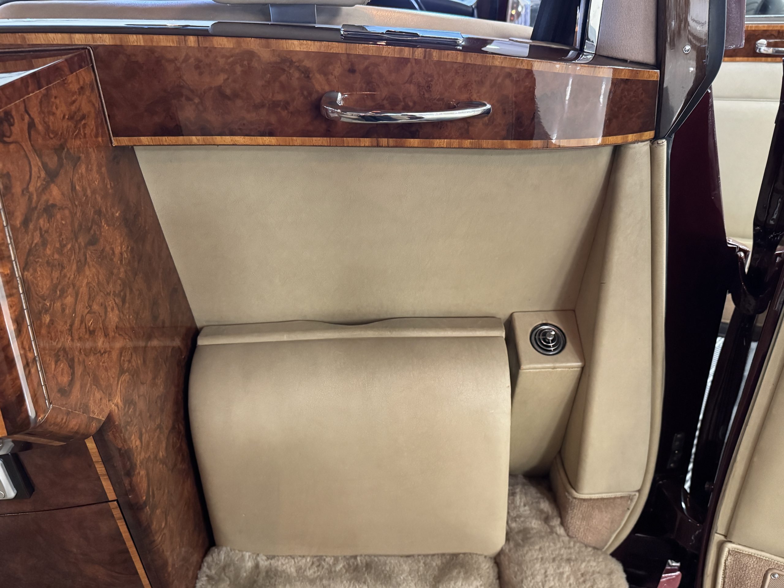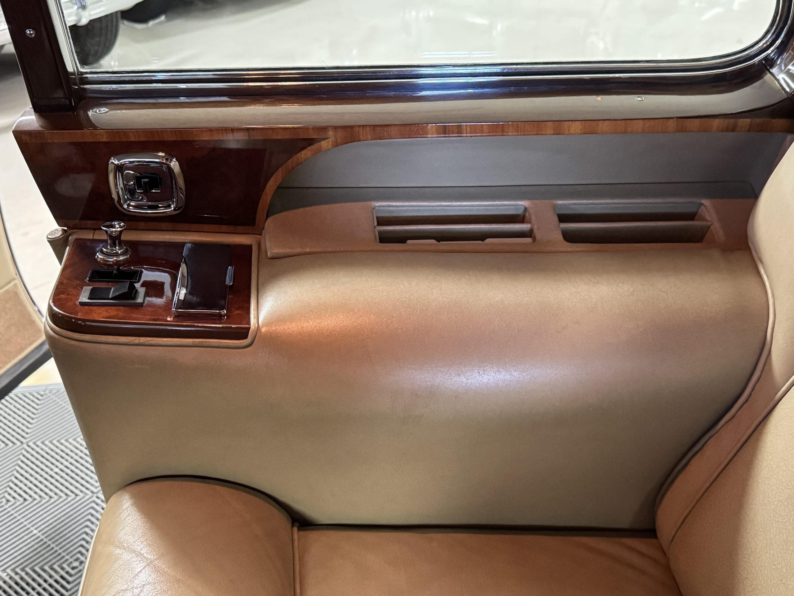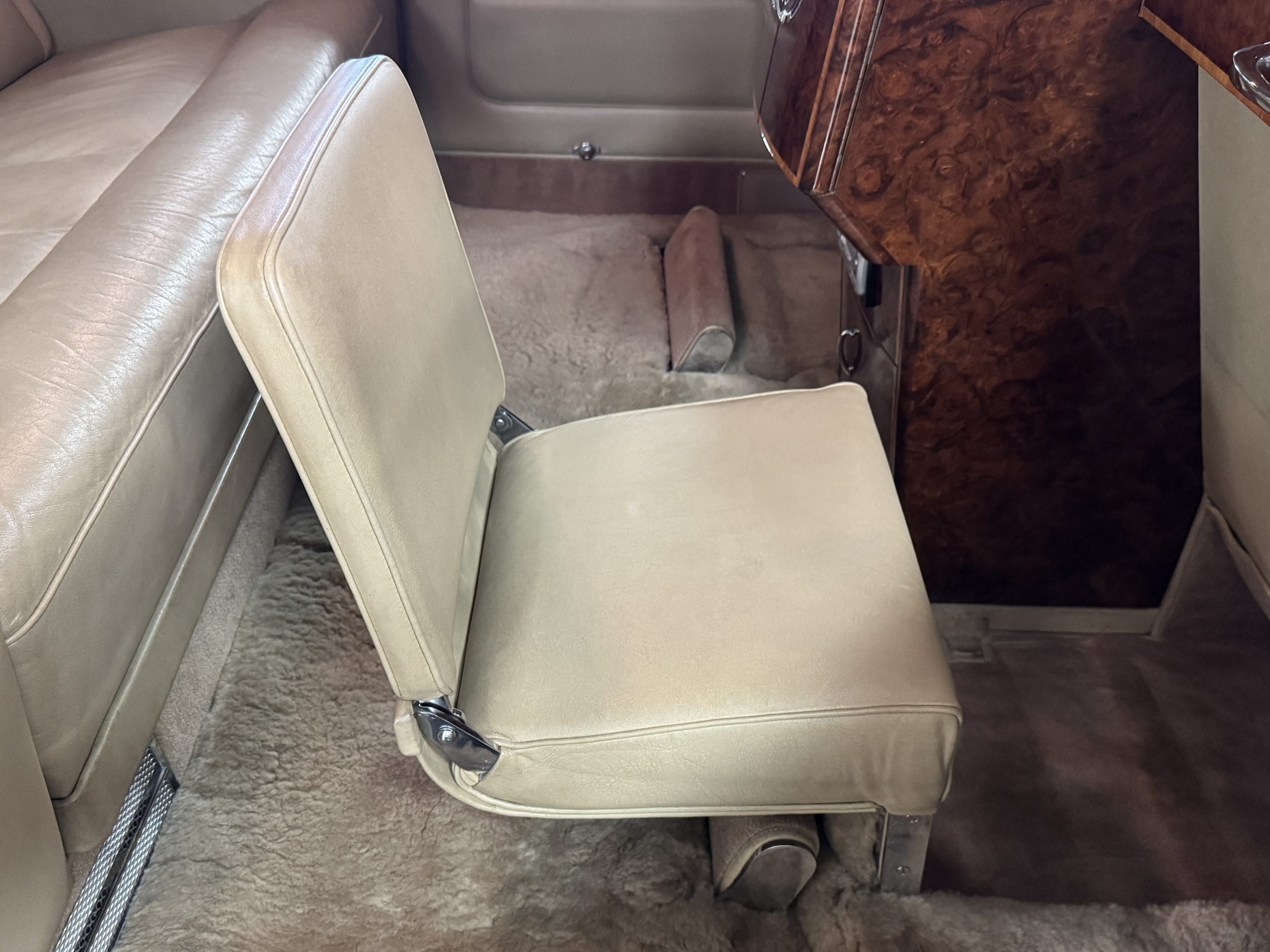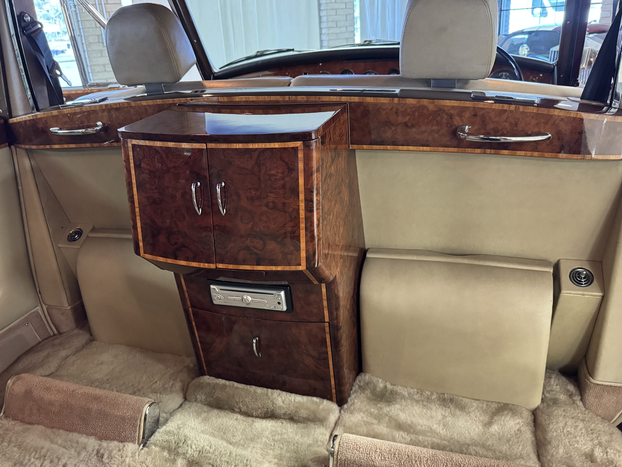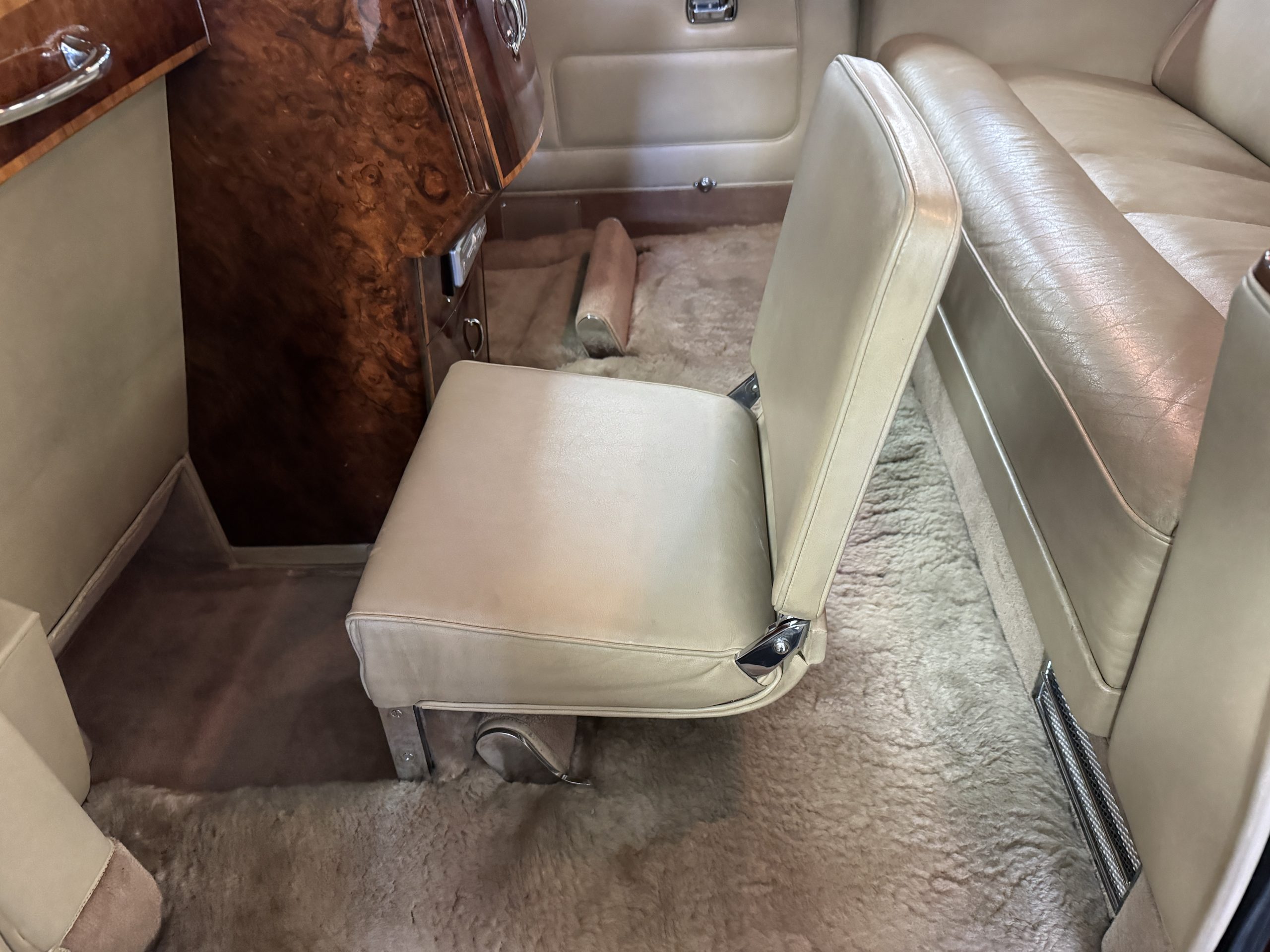 The center division window is electrically operated, and the central cabinet houses a color TV, DVD player and crystal glasses and cocktail items. The Phantom was ordered specifically to have all major controls operated from the left rear seat, which accommodates the intercom, air conditioning controls, division window and the quadraphonic AM-FM 8-track player. There are four reading lights that were added from the factory, and the center armrest has its Rolls-Royce vanity items including a mirrored compact and notebook. Two forward facing opera jump seats make seating five passengers in the rear convenient and comfortable.