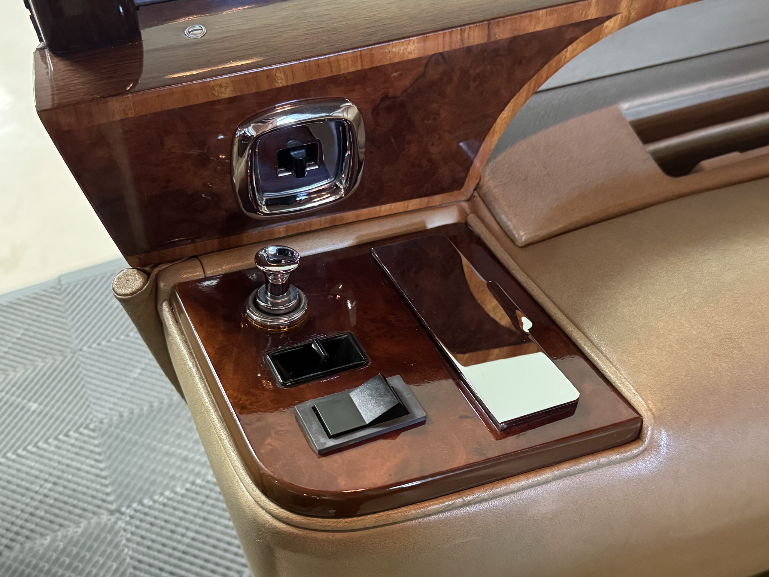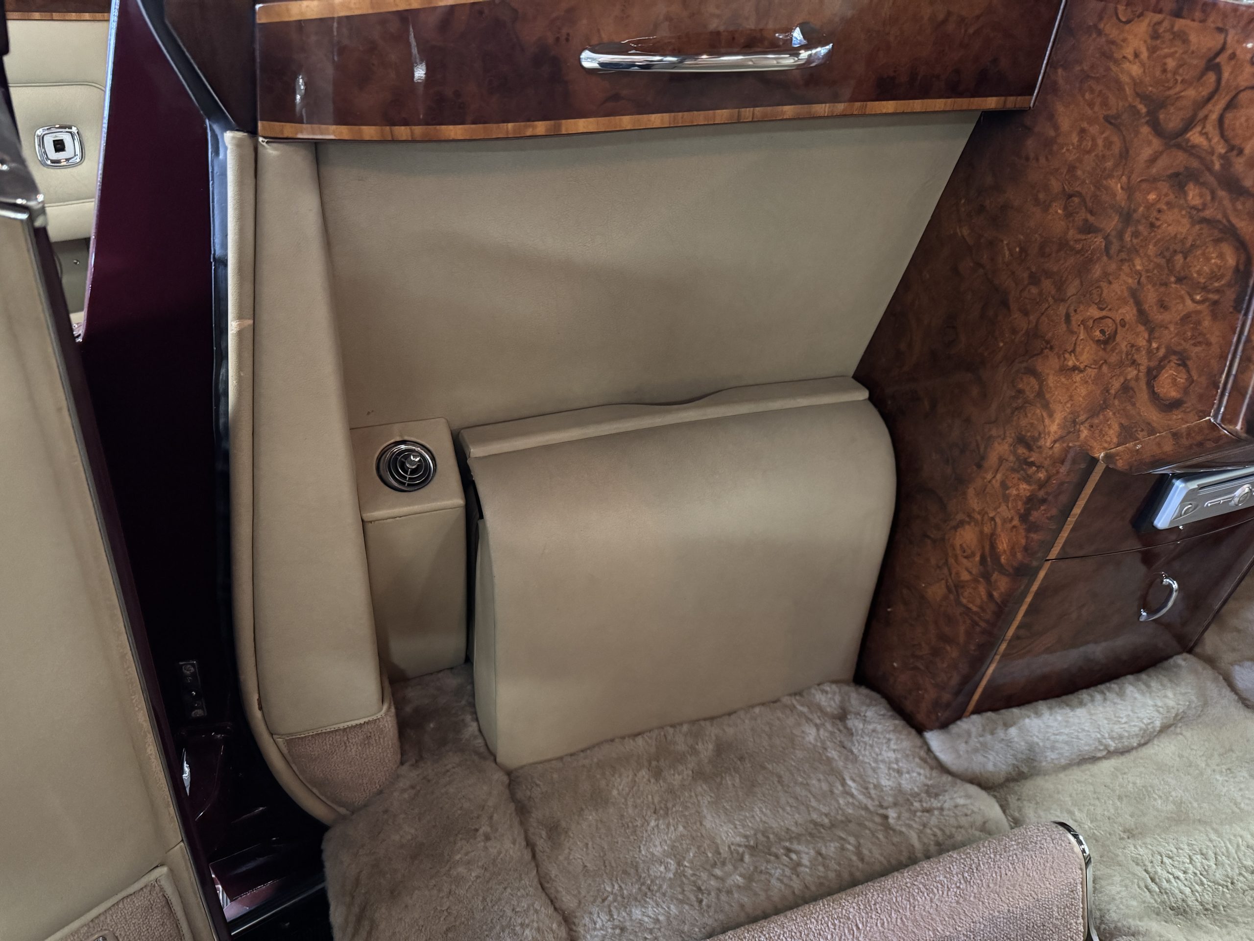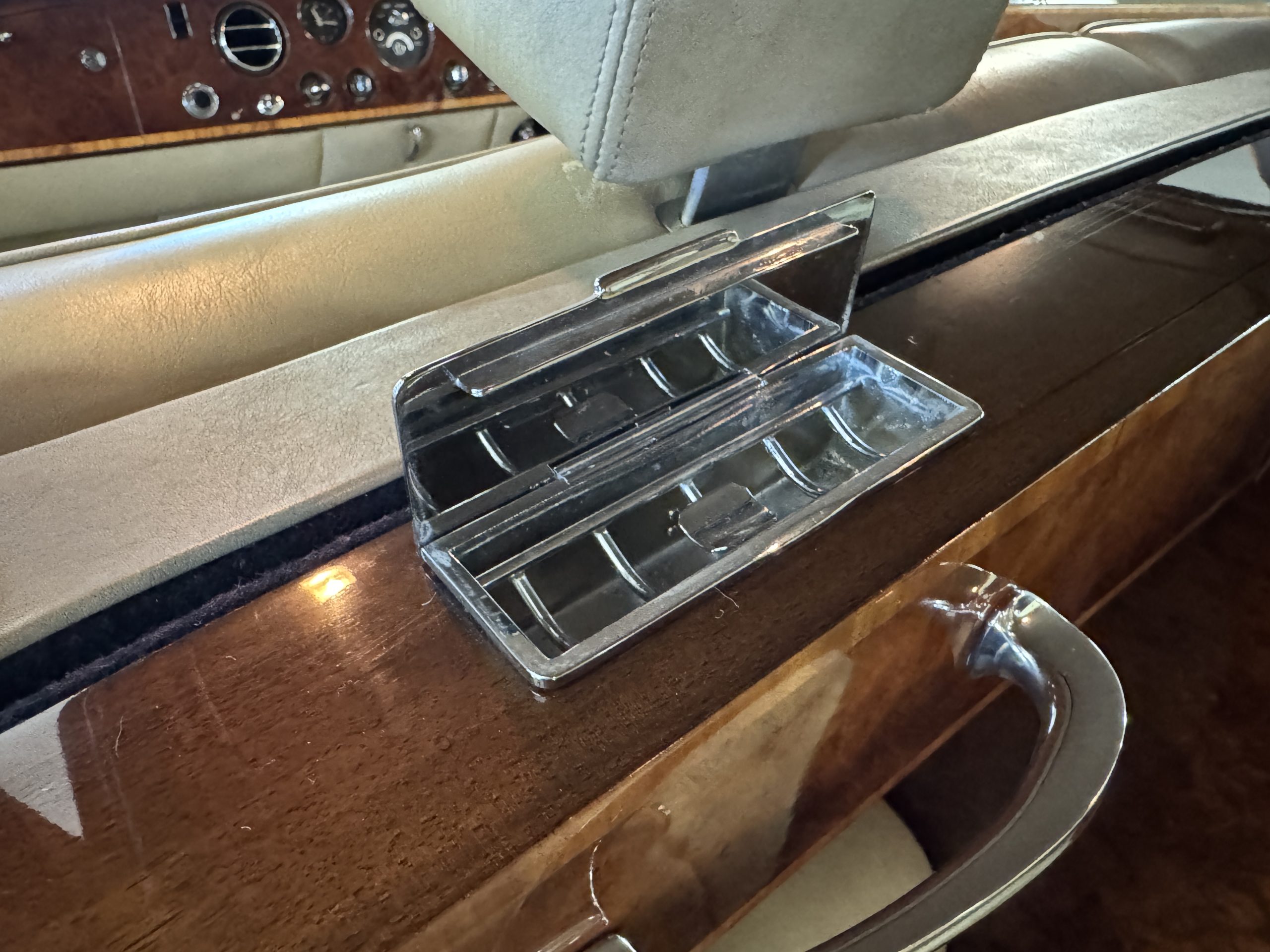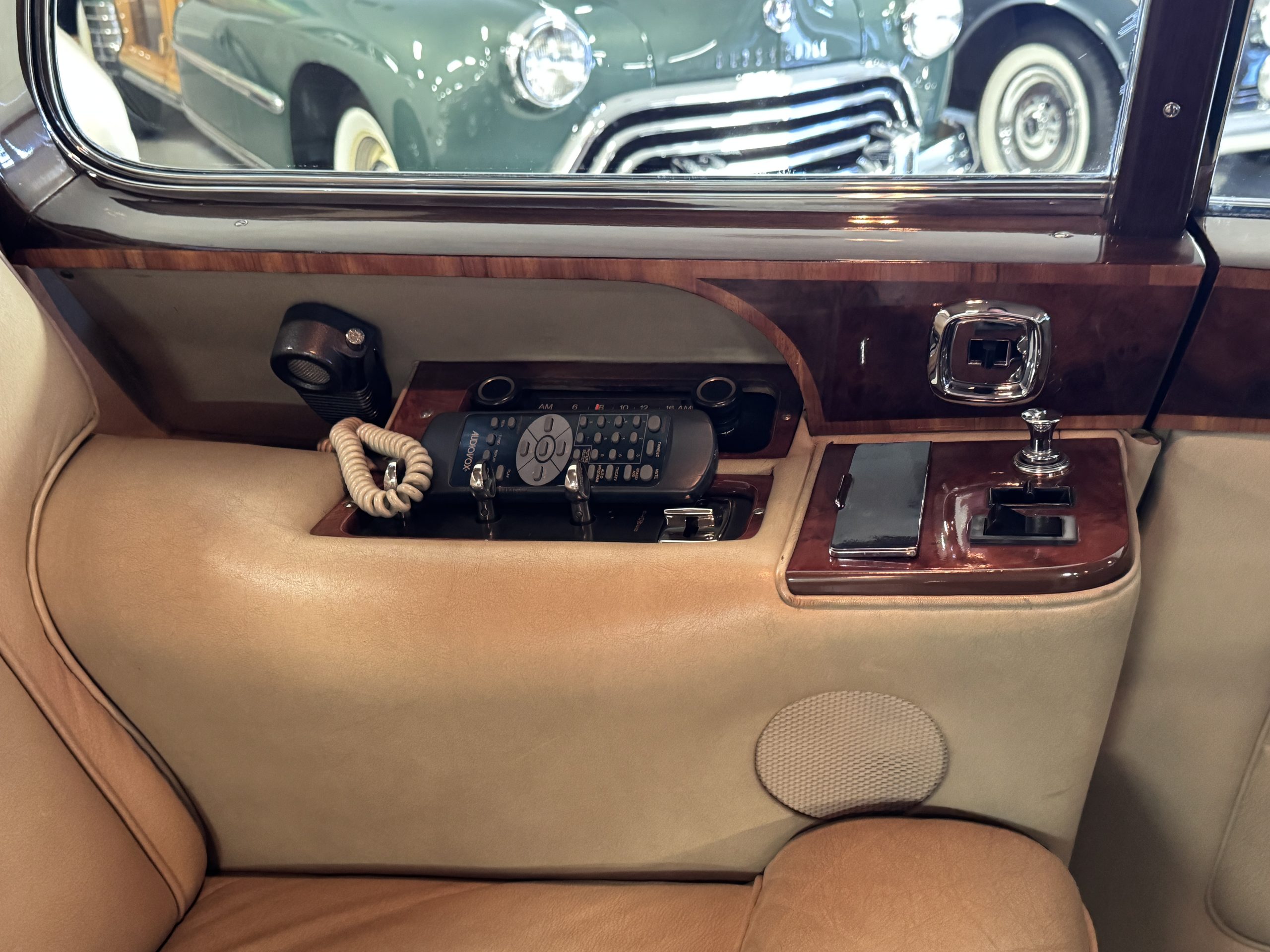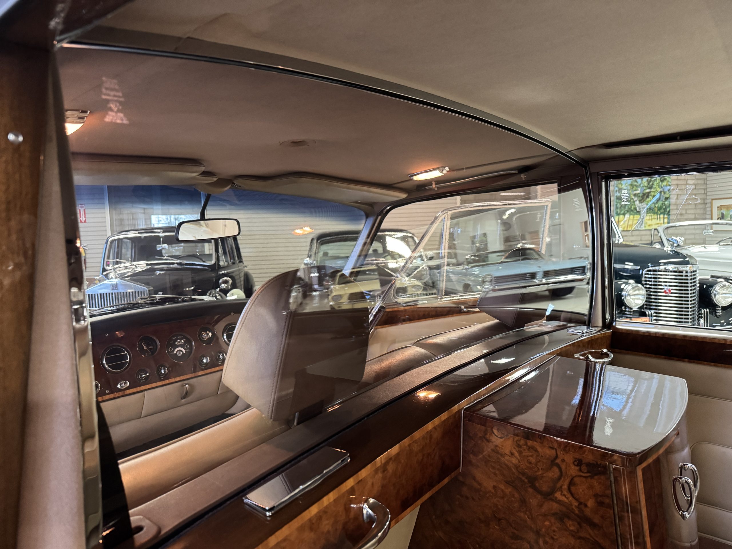 The center division window is electrically operated, and the central cabinet houses a color TV, DVD player and crystal glasses and cocktail items. The Phantom was ordered specifically to have all major controls operated from the left rear seat, which accommodates the intercom, air conditioning controls, division window and the quadraphonic AM-FM 8-track player. There are four reading lights that were added from the factory, and the center armrest has its Rolls-Royce vanity items including a mirrored compact and notebook. Two forward facing opera jump seats make seating five passengers in the rear convenient and comfortable.