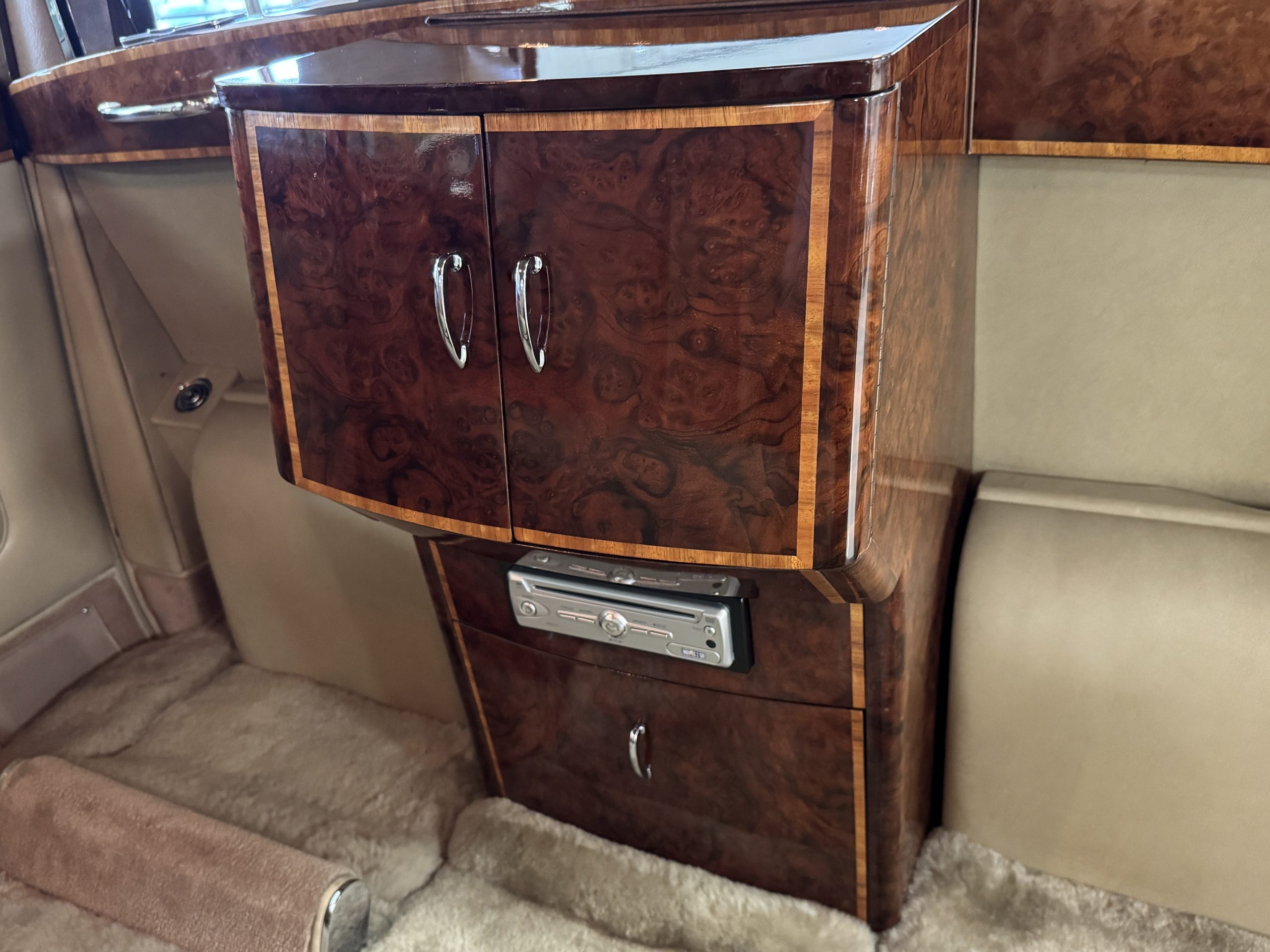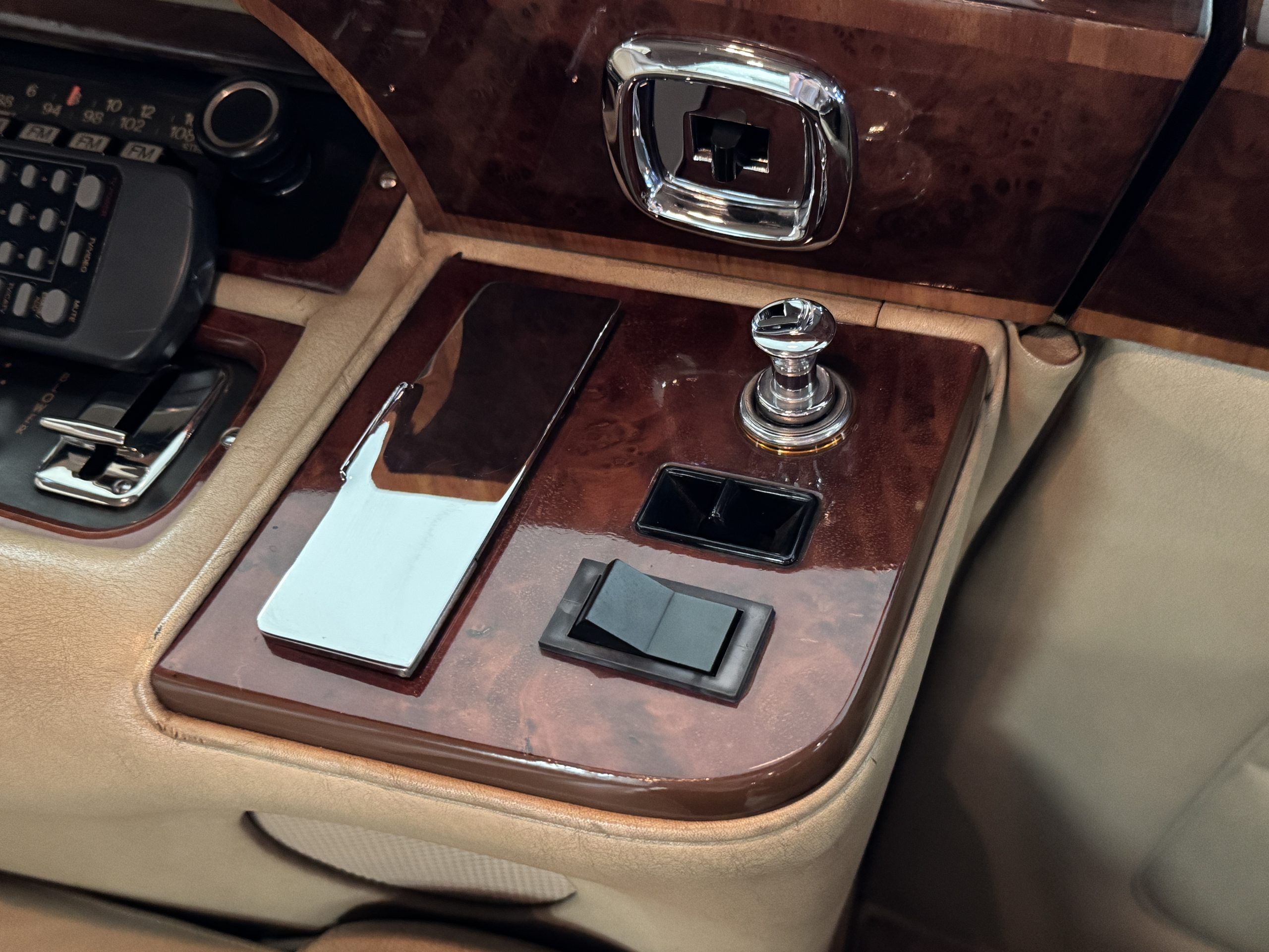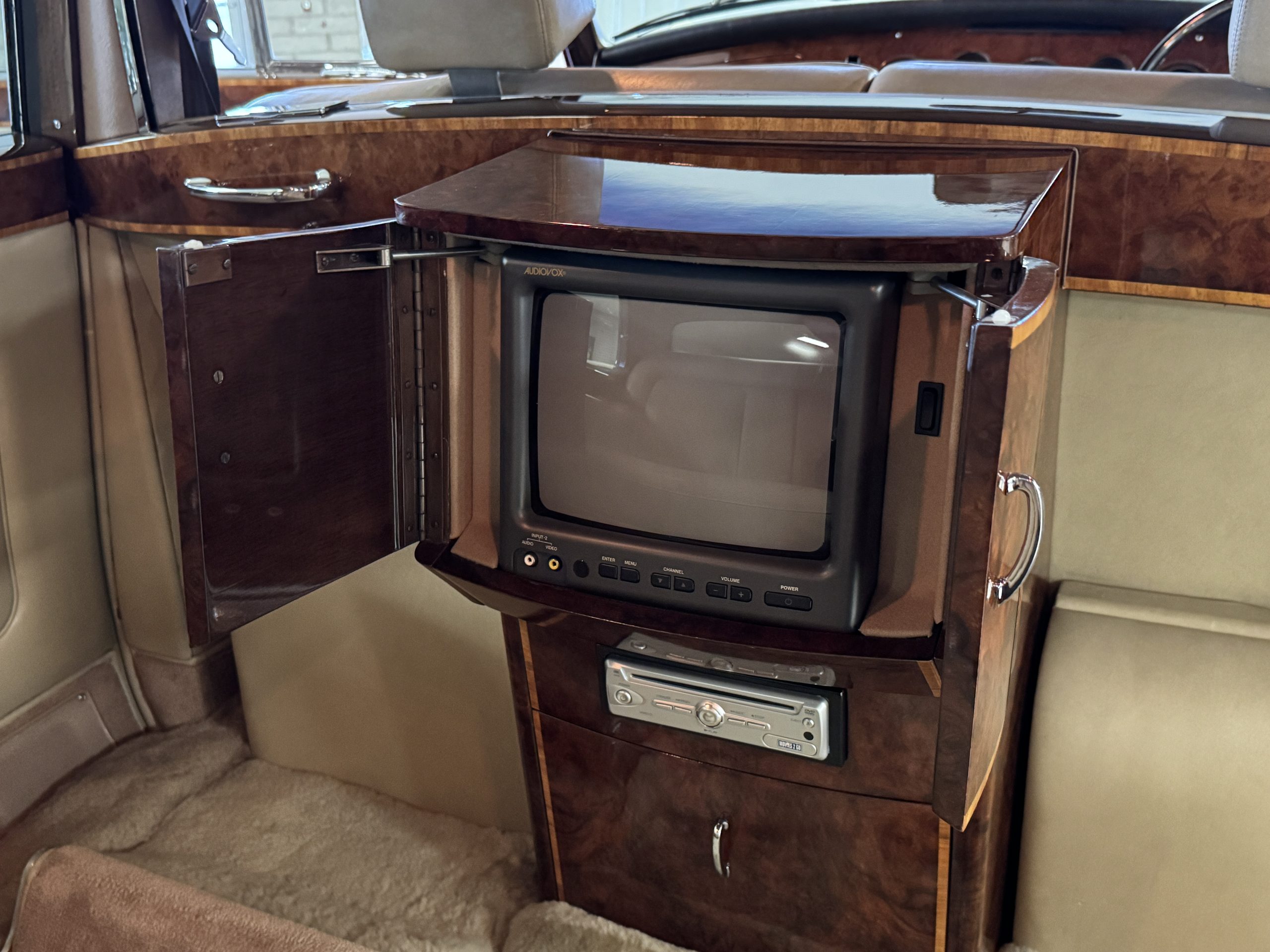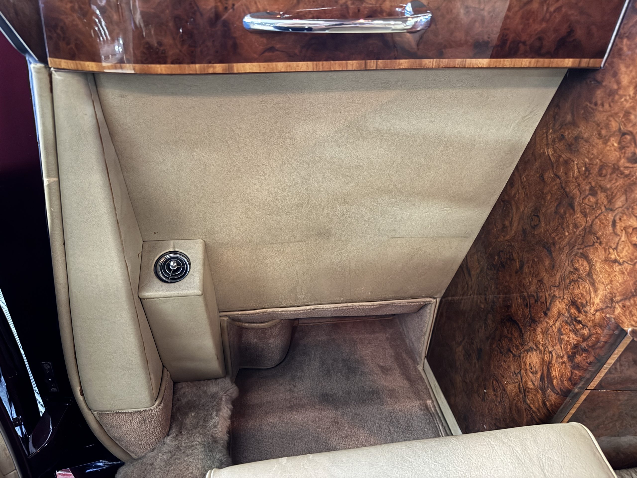 The center division window is electrically operated, and the central cabinet houses a color TV, DVD player and crystal glasses and cocktail items. The Phantom was ordered specifically to have all major controls operated from the left rear seat, which accommodates the intercom, air conditioning controls, division window and the quadraphonic AM-FM 8-track player. There are four reading lights that were added from the factory, and the center armrest has its Rolls-Royce vanity items including a mirrored compact and notebook. Two forward facing opera jump seats make seating five passengers in the rear convenient and comfortable.