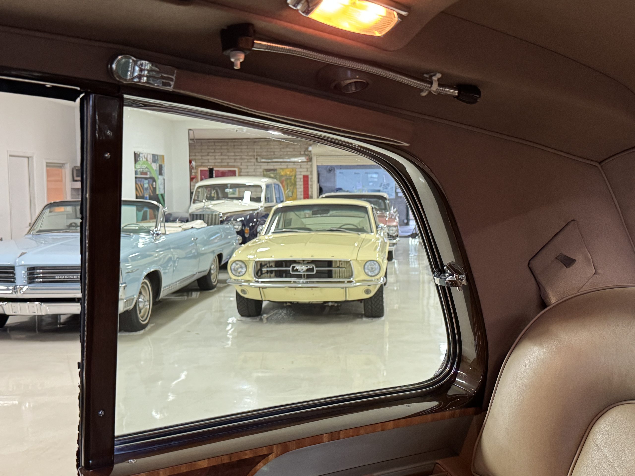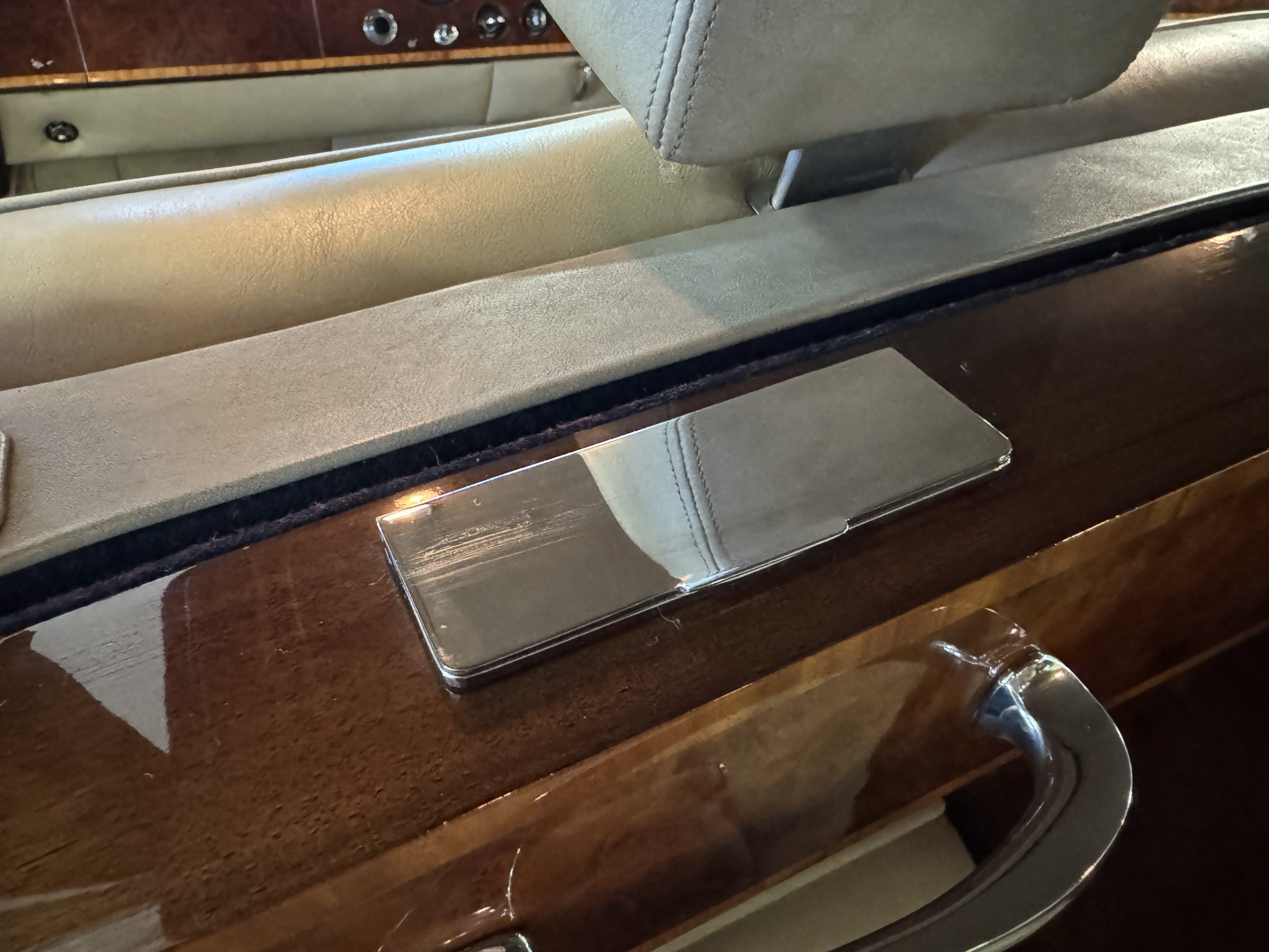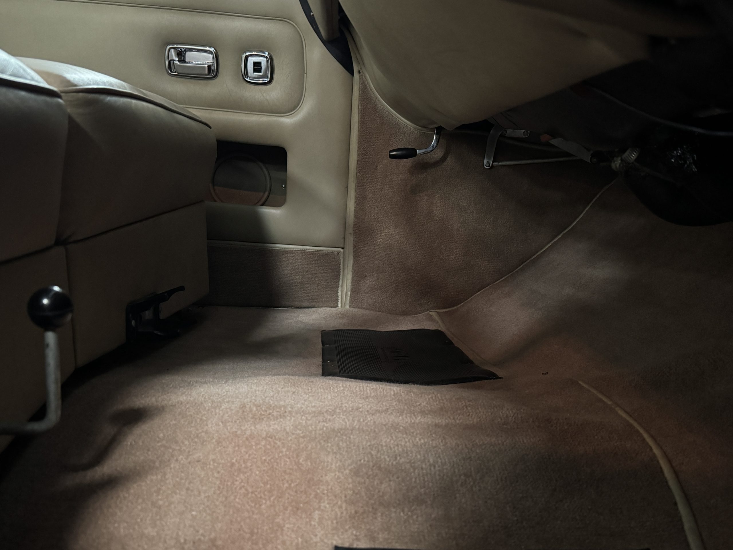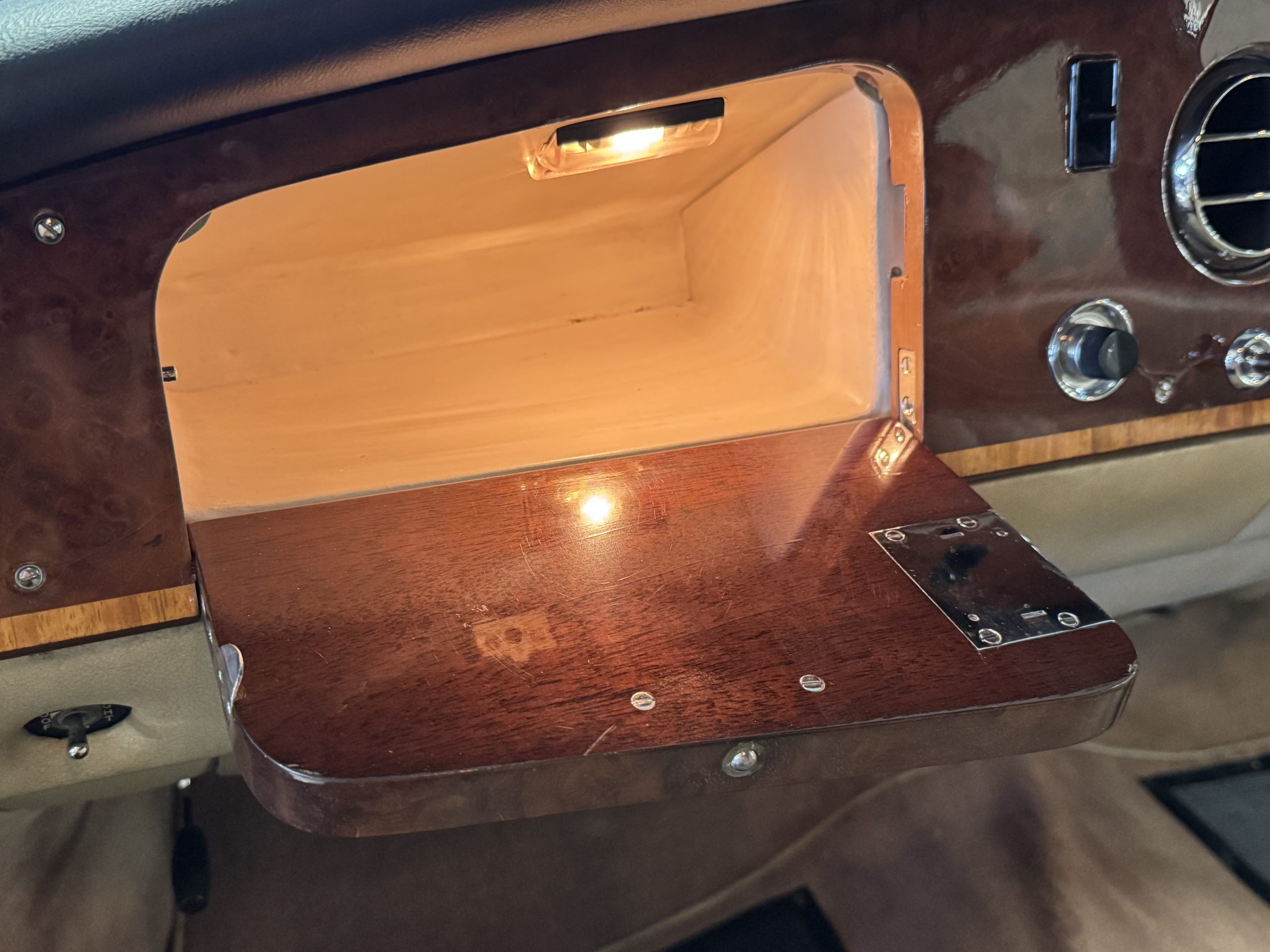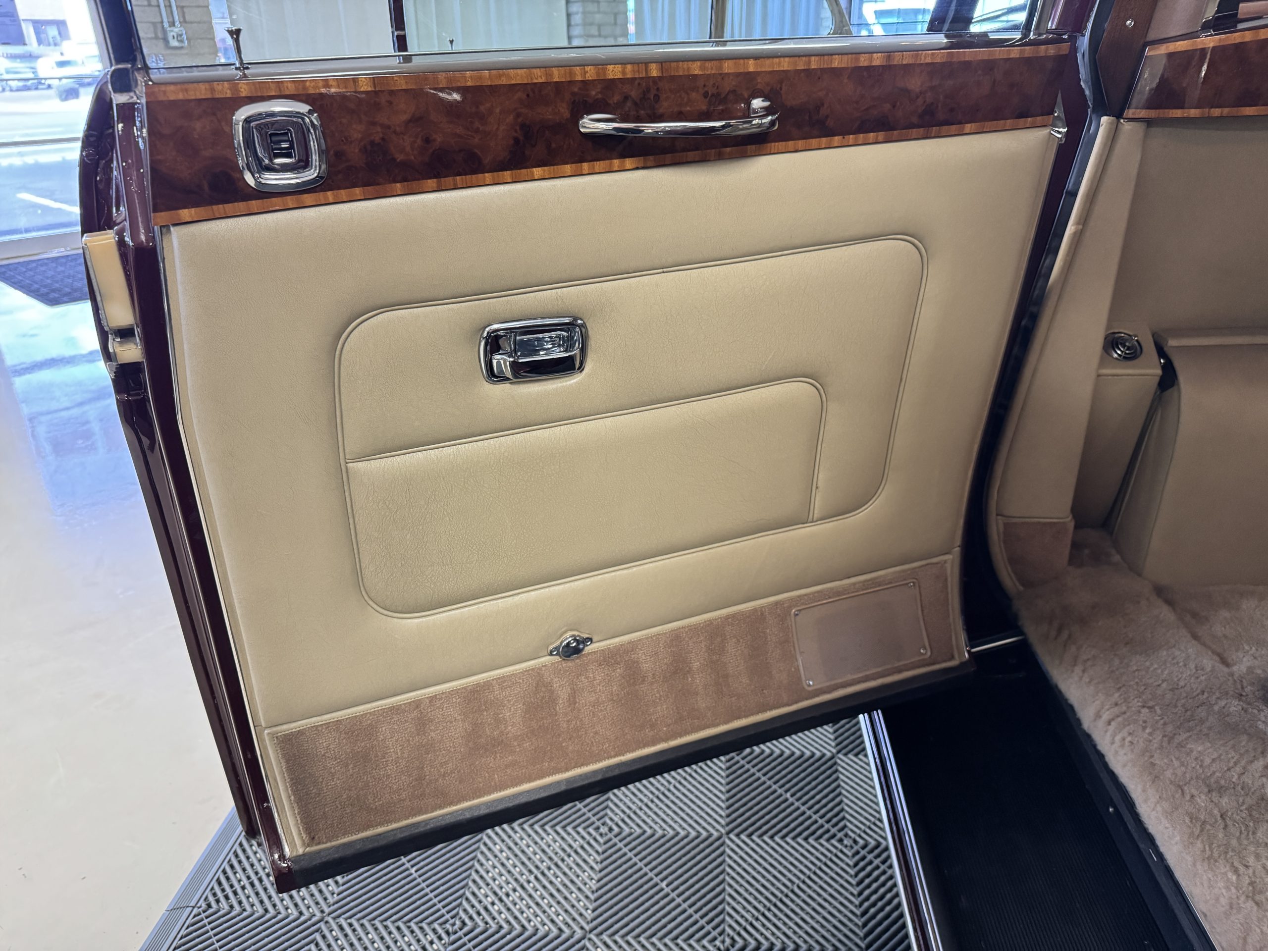 The center division window is electrically operated, and the central cabinet houses a color TV, DVD player and crystal glasses and cocktail items. The Phantom was ordered specifically to have all major controls operated from the left rear seat, which accommodates the intercom, air conditioning controls, division window and the quadraphonic AM-FM 8-track player. There are four reading lights that were added from the factory, and the center armrest has its Rolls-Royce vanity items including a mirrored compact and notebook. Two forward facing opera jump seats make seating five passengers in the rear convenient and comfortable.