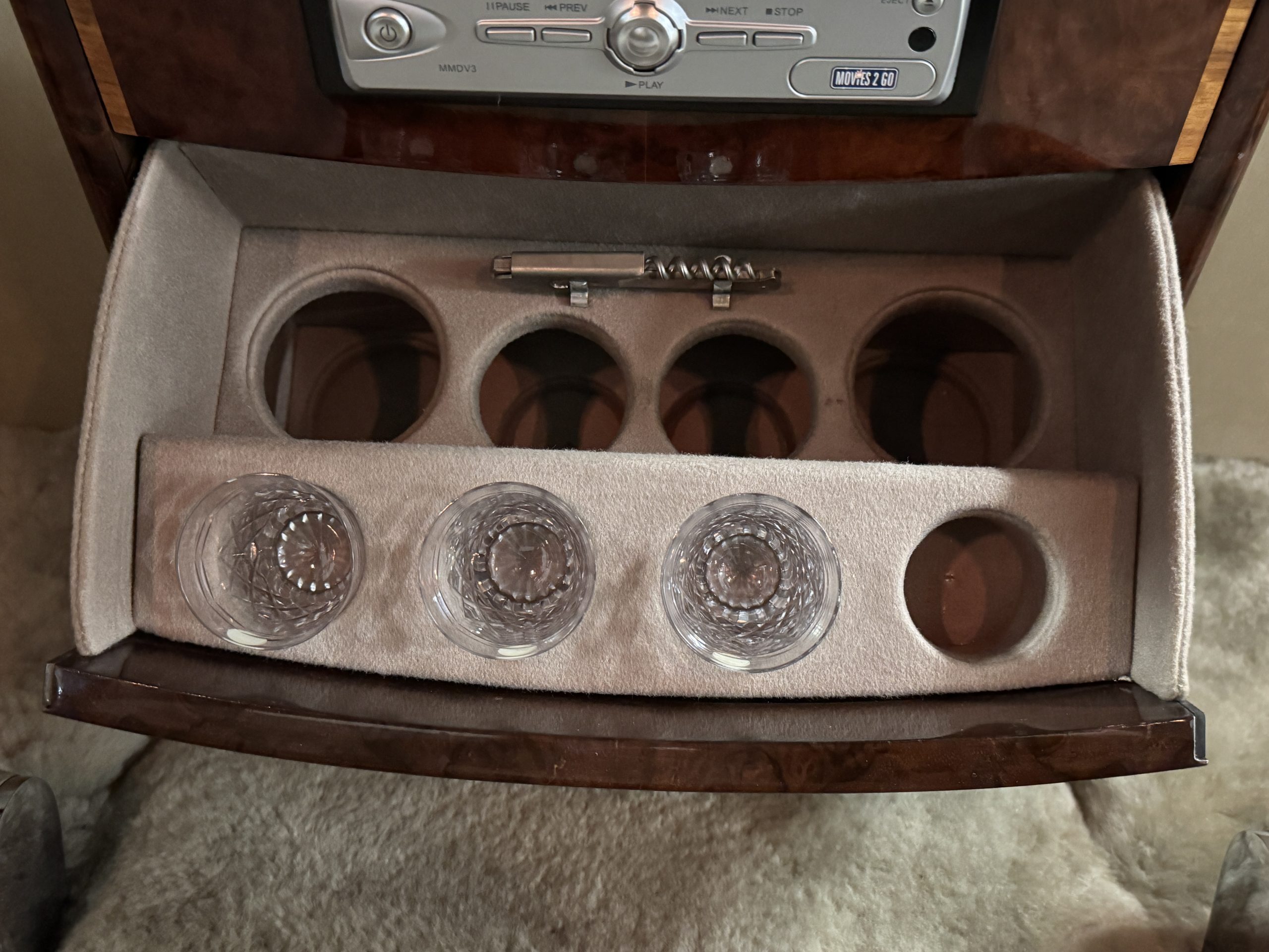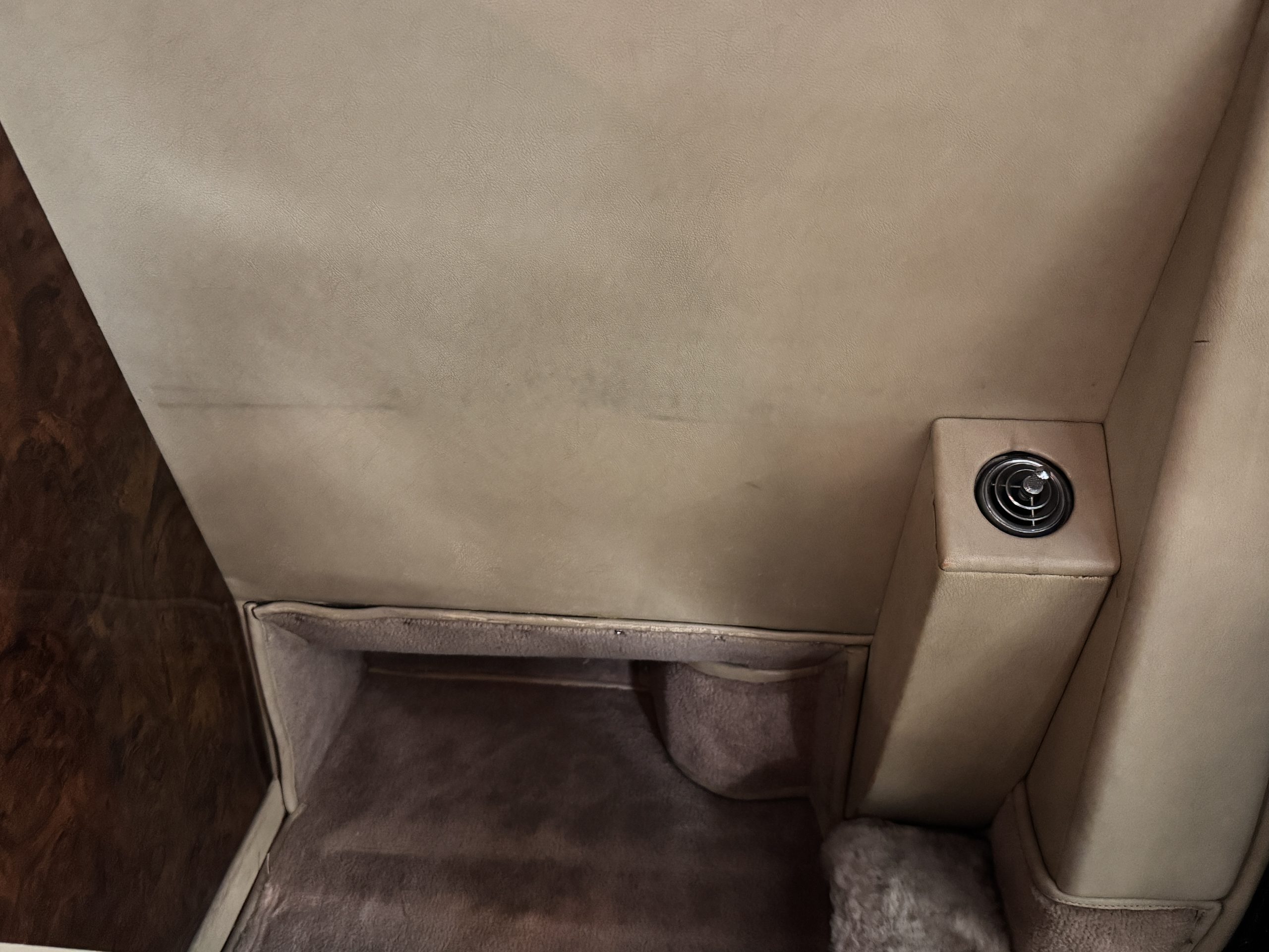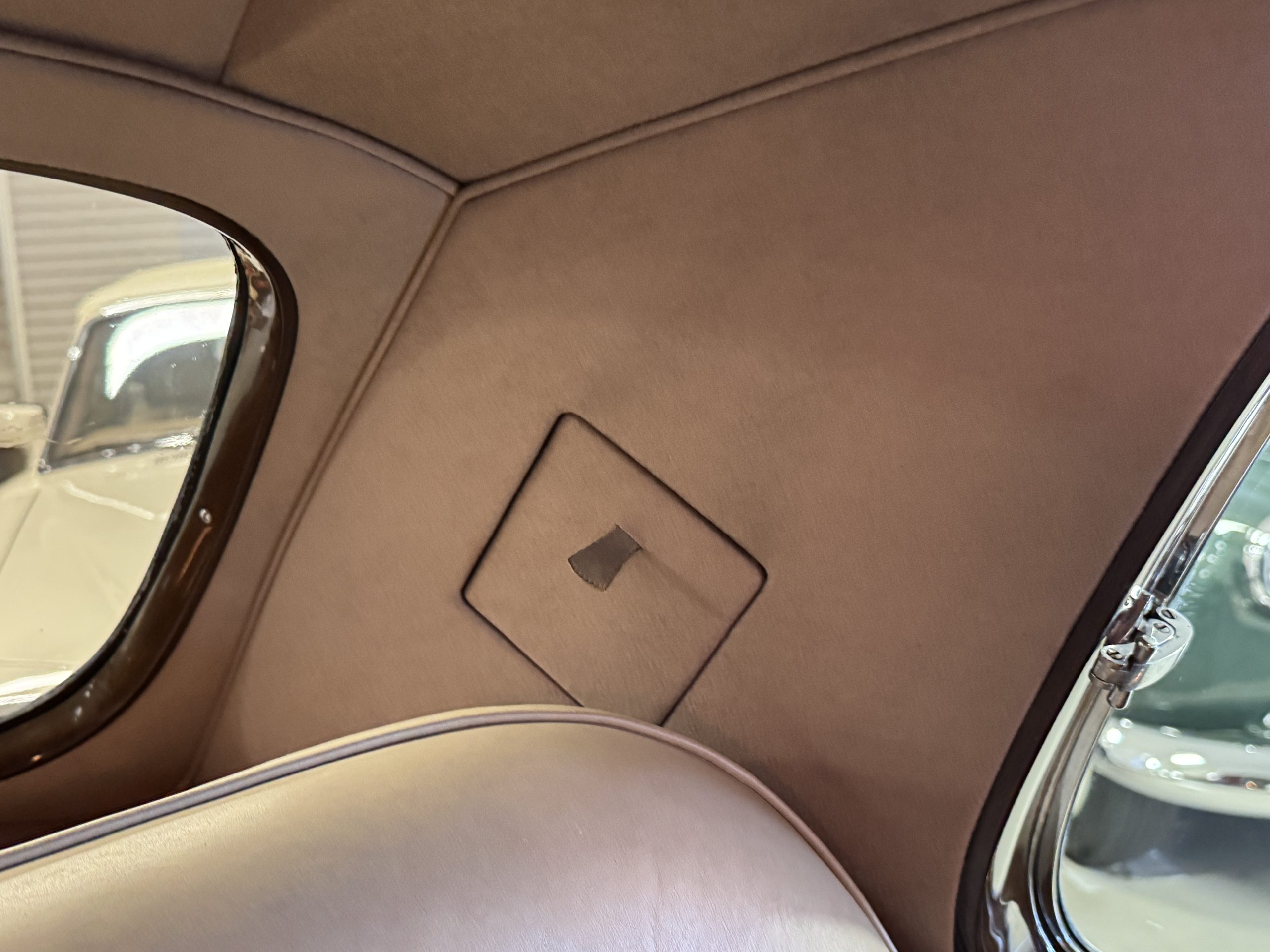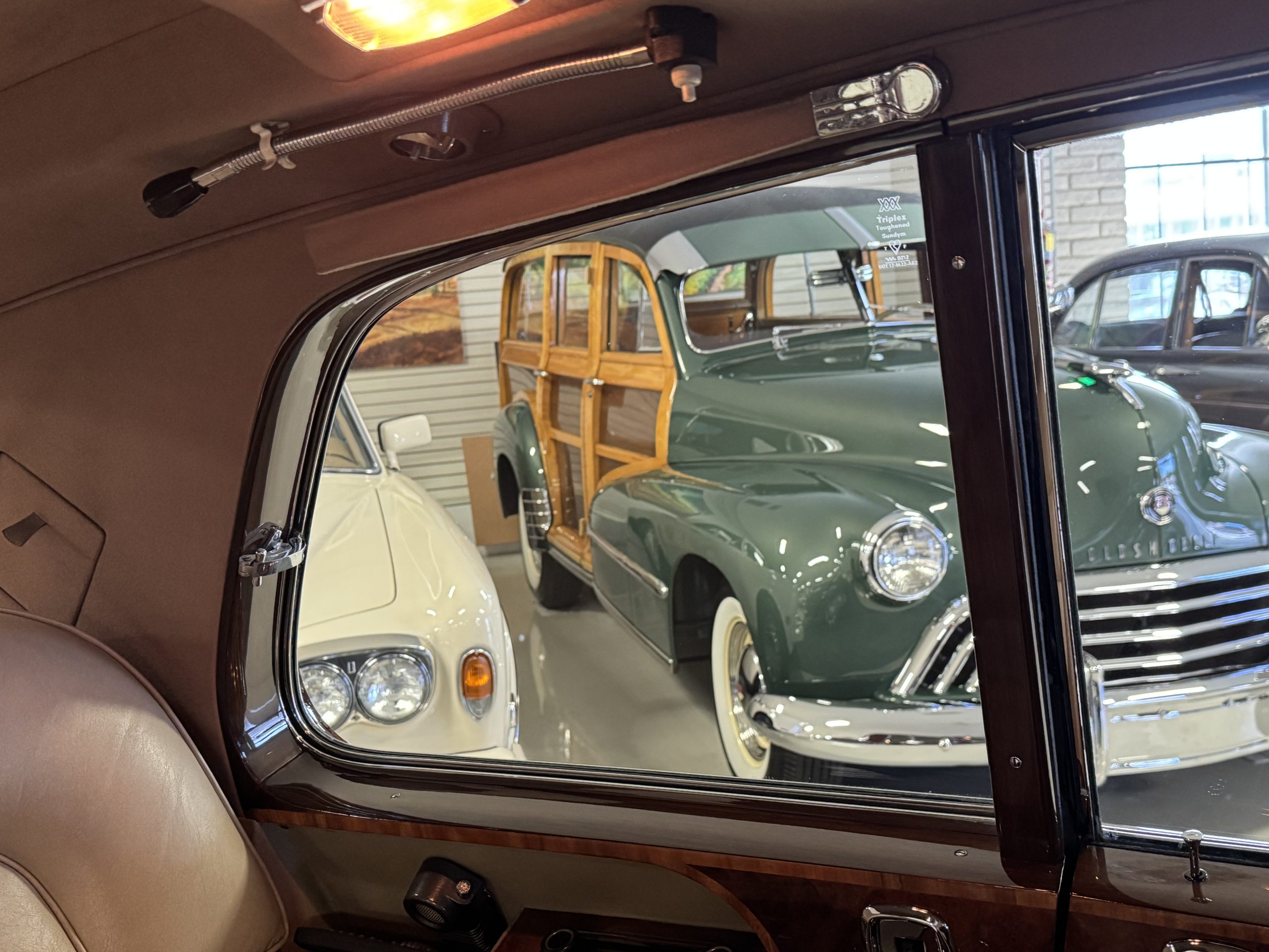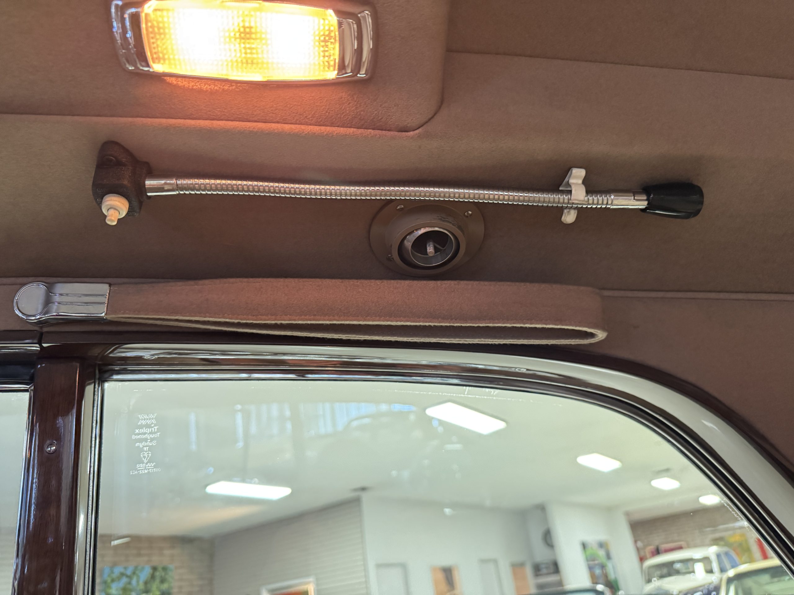 The center division window is electrically operated, and the central cabinet houses a color TV, DVD player and crystal glasses and cocktail items. The Phantom was ordered specifically to have all major controls operated from the left rear seat, which accommodates the intercom, air conditioning controls, division window and the quadraphonic AM-FM 8-track player. There are four reading lights that were added from the factory, and the center armrest has its Rolls-Royce vanity items including a mirrored compact and notebook. Two forward facing opera jump seats make seating five passengers in the rear convenient and comfortable.