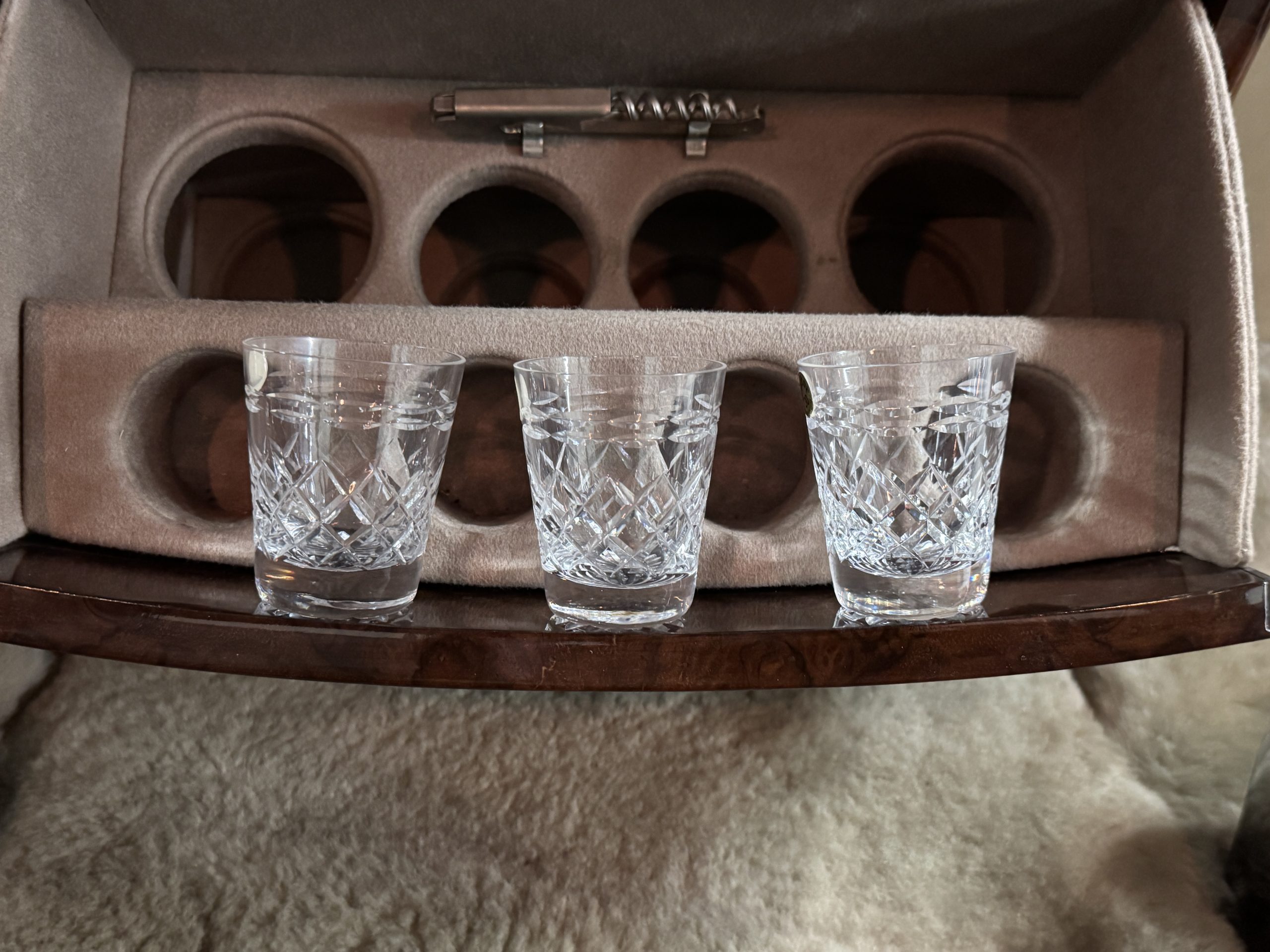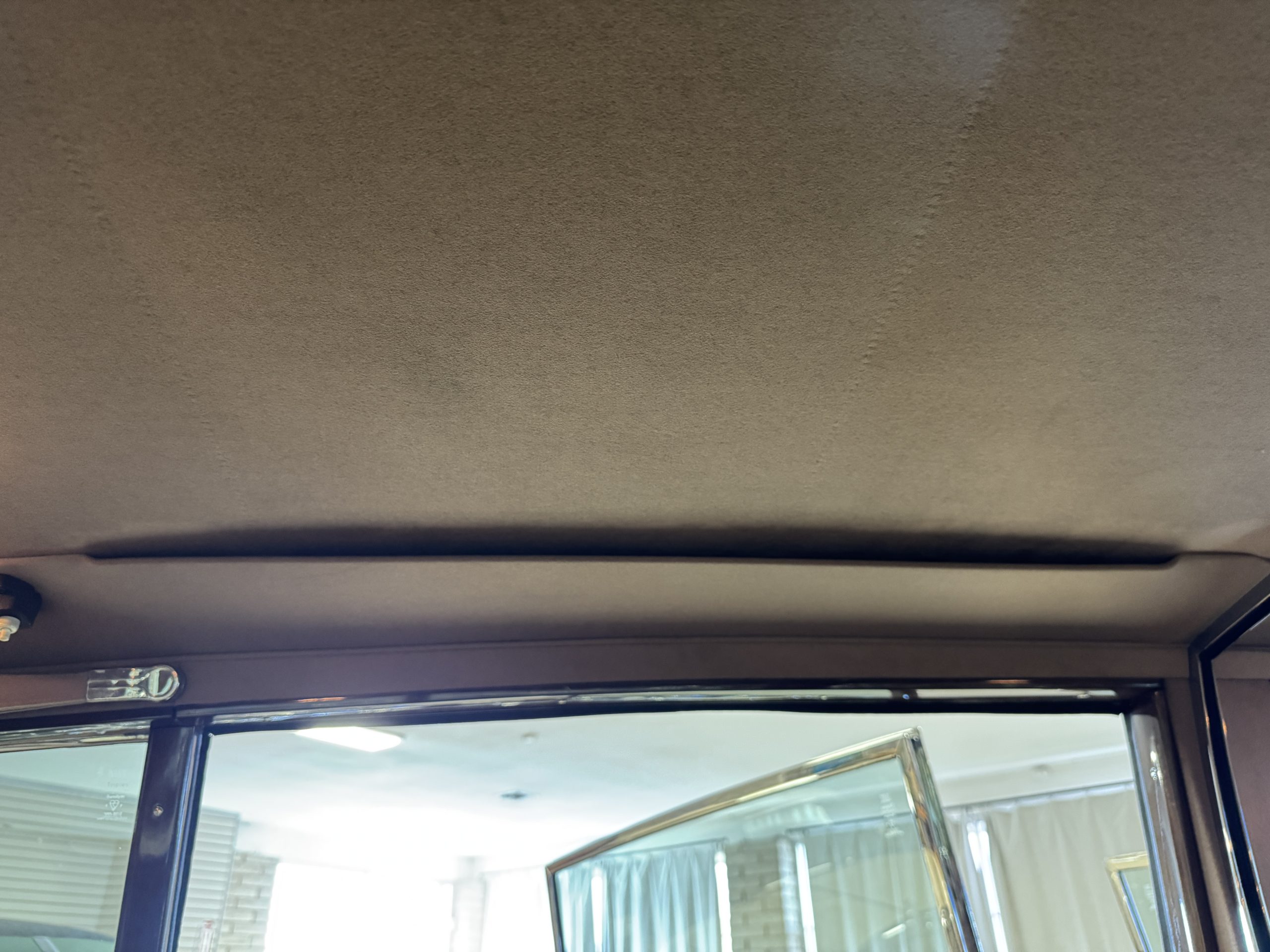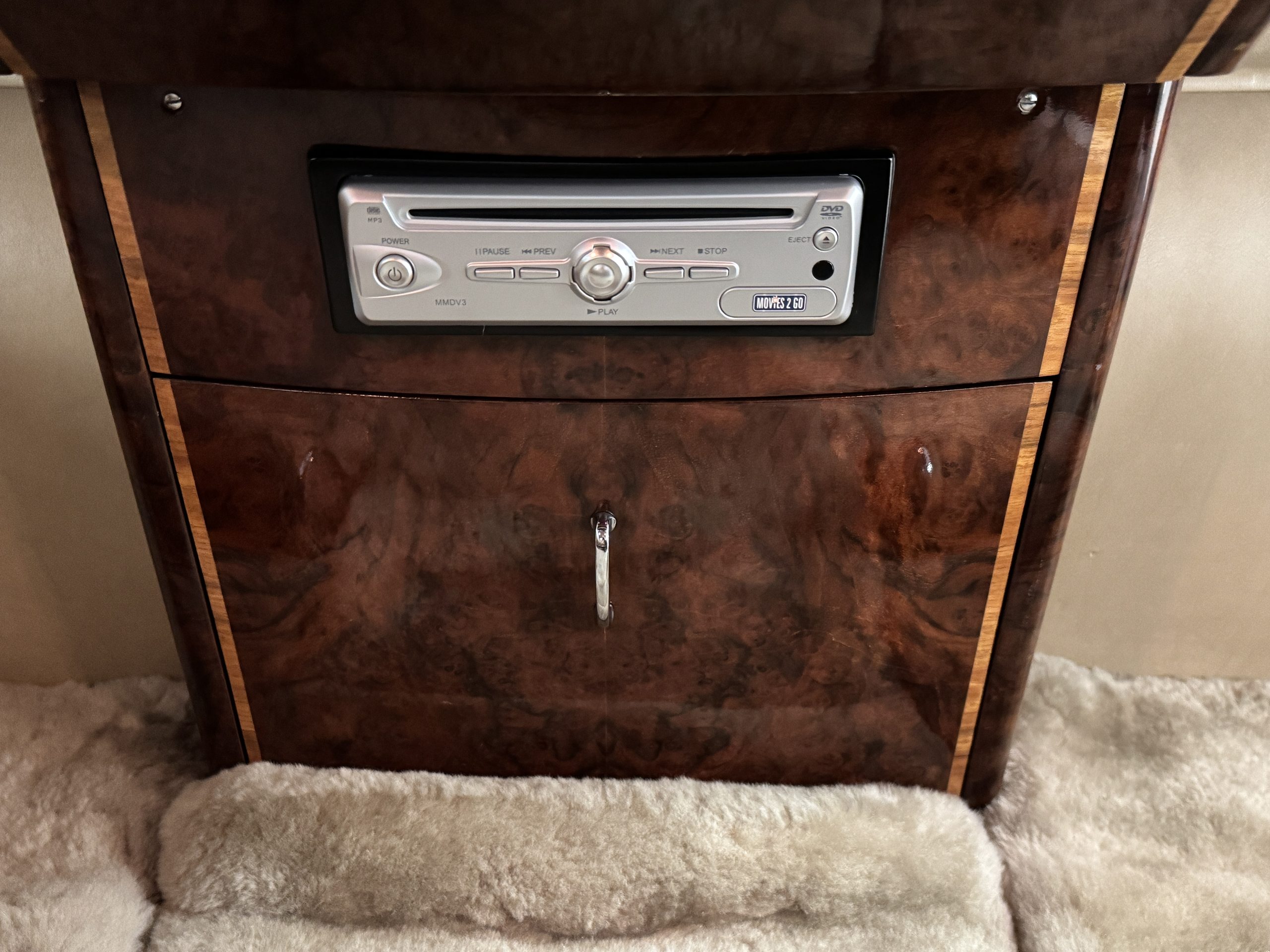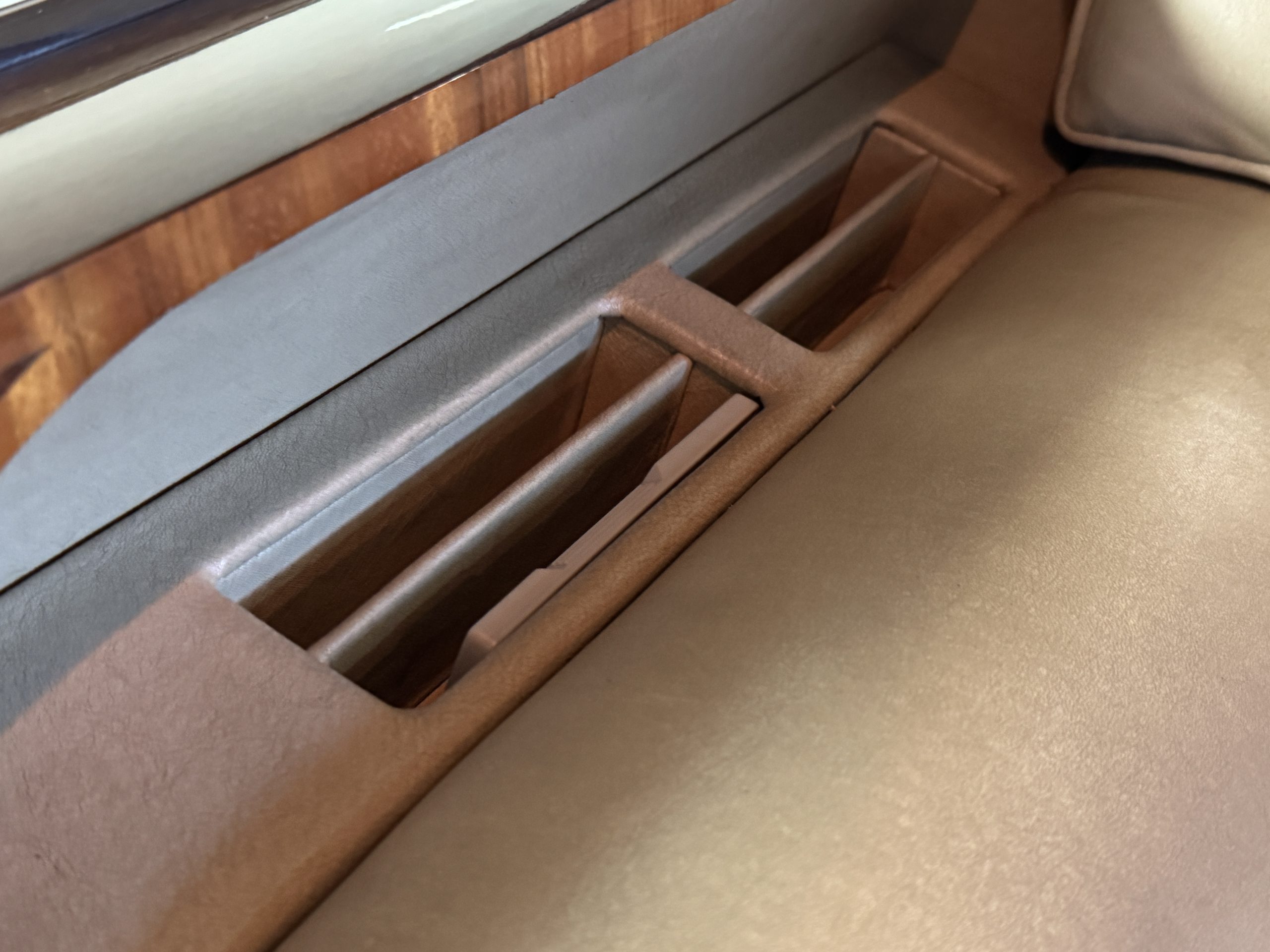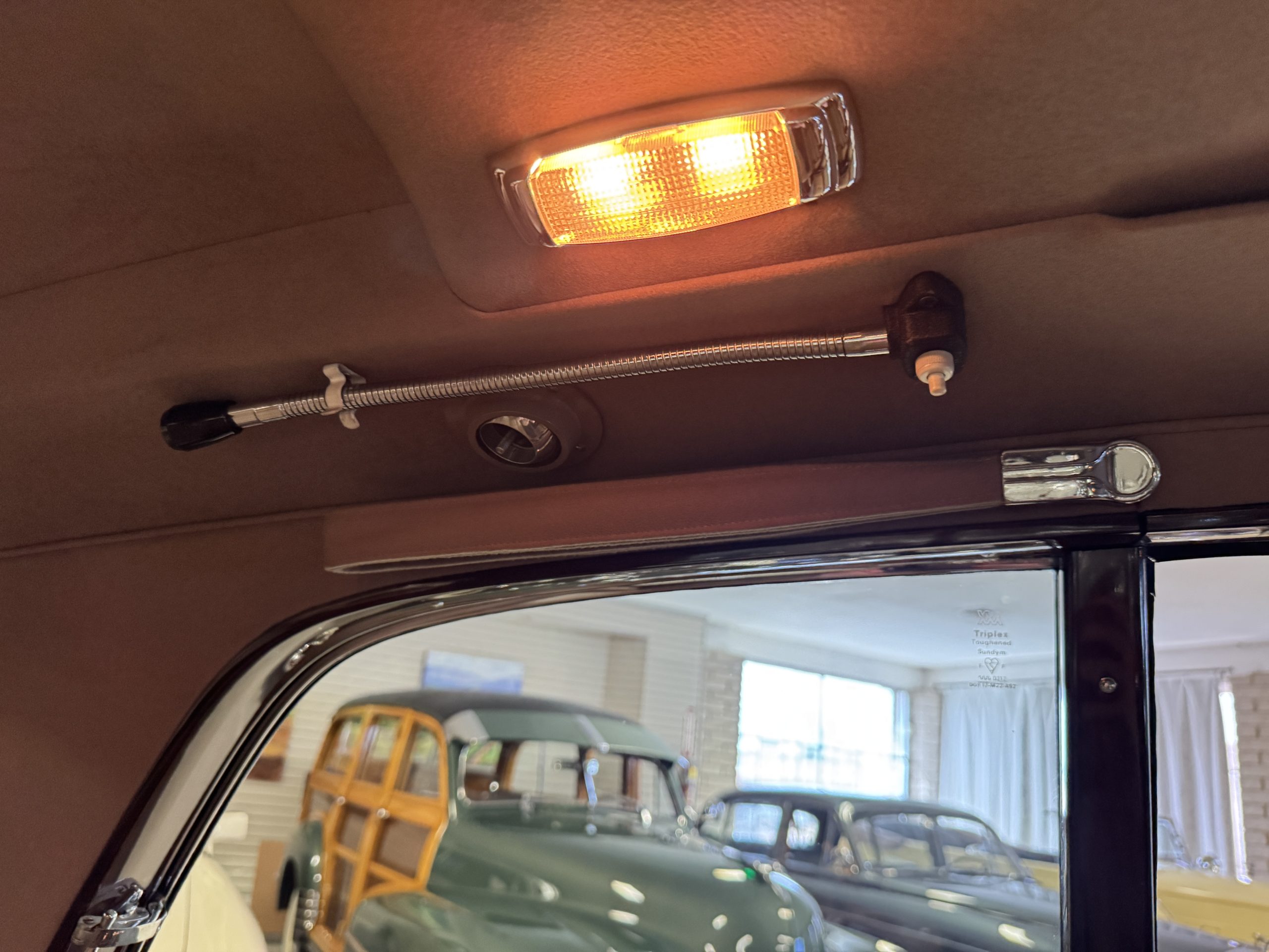 The center division window is electrically operated, and the central cabinet houses a color TV, DVD player and crystal glasses and cocktail items. The Phantom was ordered specifically to have all major controls operated from the left rear seat, which accommodates the intercom, air conditioning controls, division window and the quadraphonic AM-FM 8-track player. There are four reading lights that were added from the factory, and the center armrest has its Rolls-Royce vanity items including a mirrored compact and notebook. Two forward facing opera jump seats make seating five passengers in the rear convenient and comfortable.