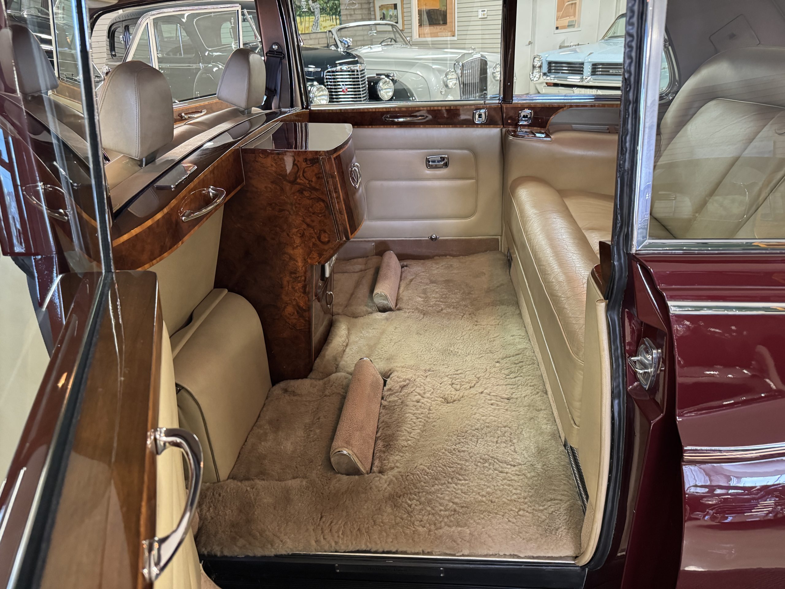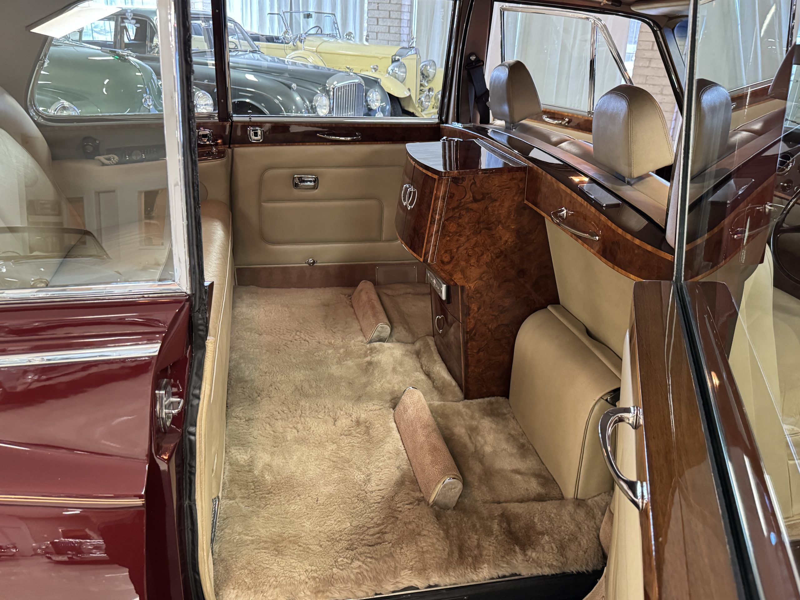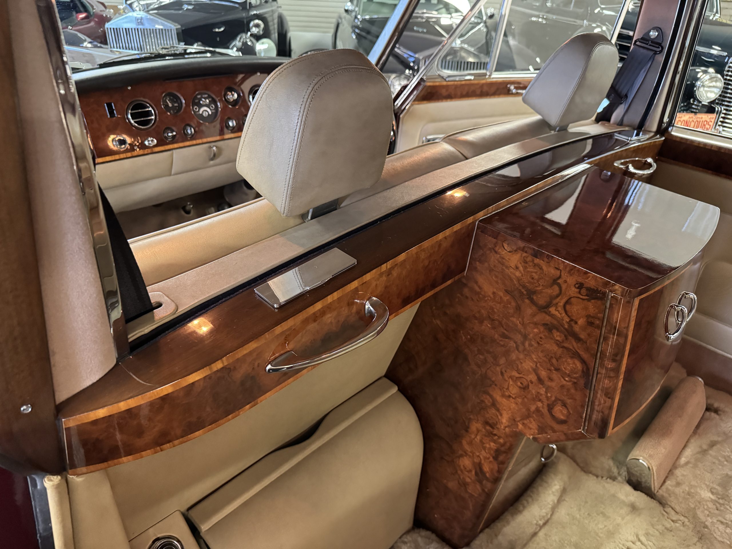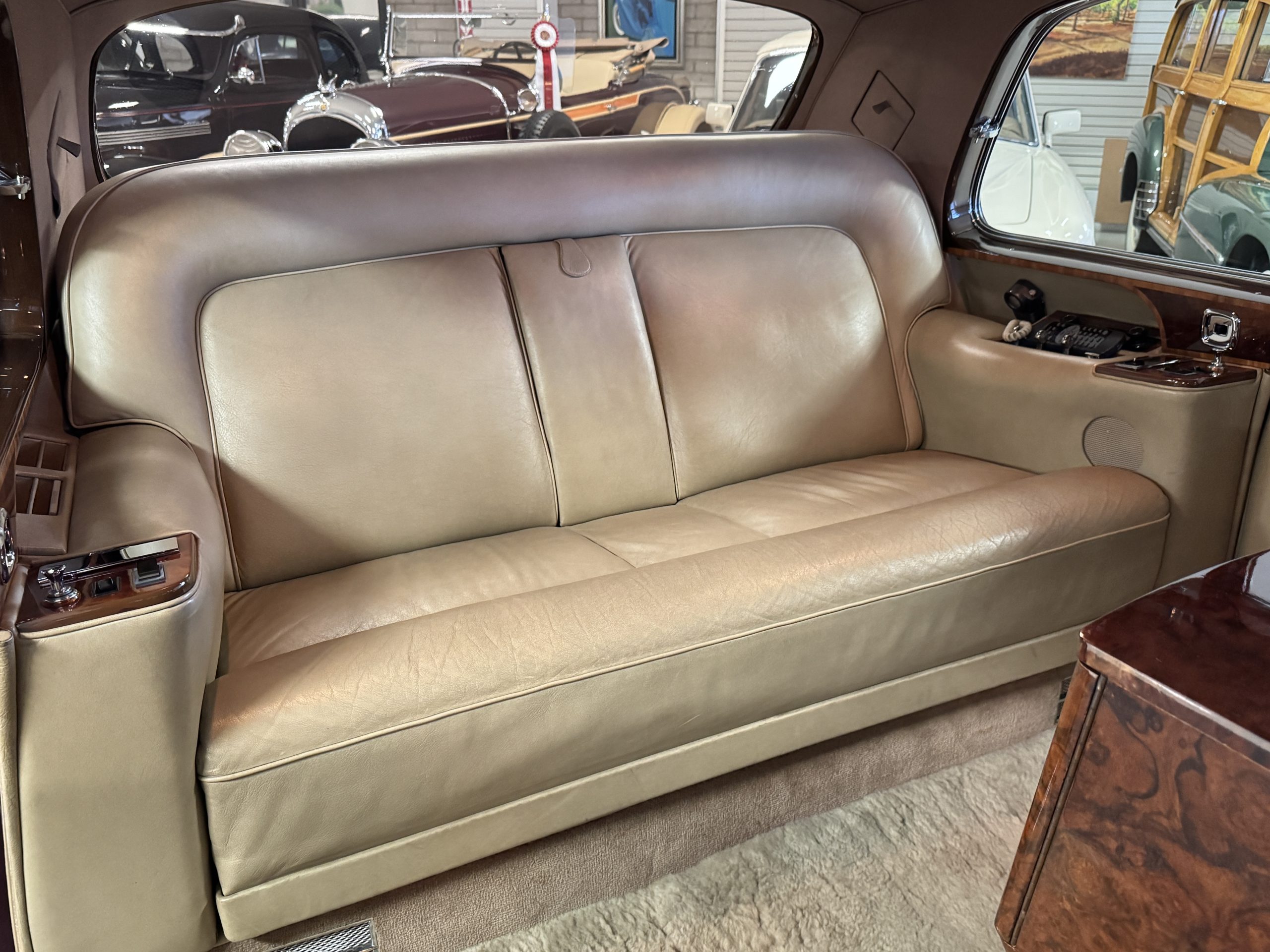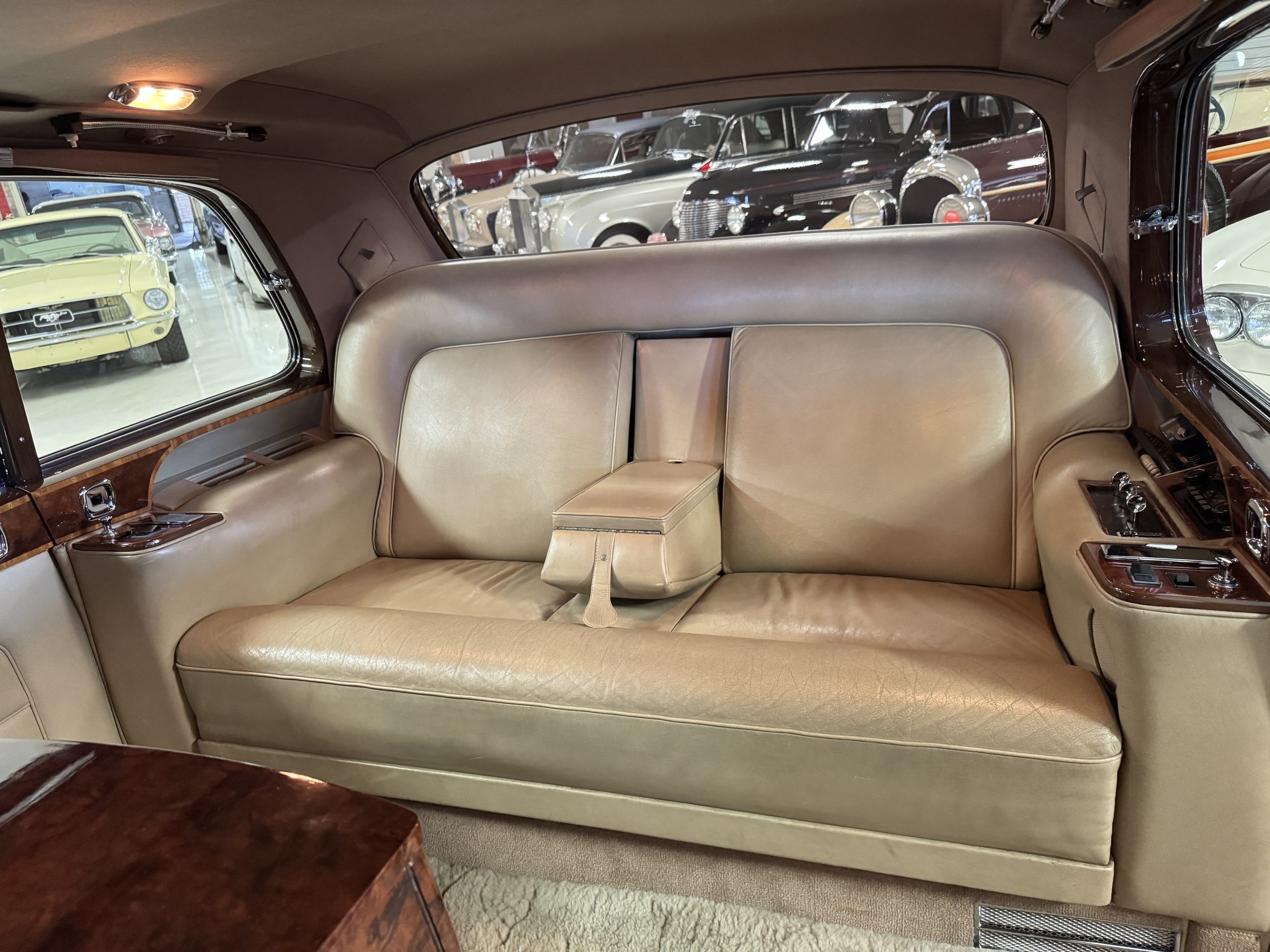 The interior is completely original and is in excellent condition, befitting a 12,000-mile original example that has been well maintained in important collections. The rear passenger compartment features its gorgeous original Beige leather (Trim Code VM3234) and its original Beige Wilton wool carpeting (TRB.66). The leather is soft and supple and shows little wear. The beautiful burl walnut is featured throughout the interior and is cross-banded veneers and is in excellent original condition.