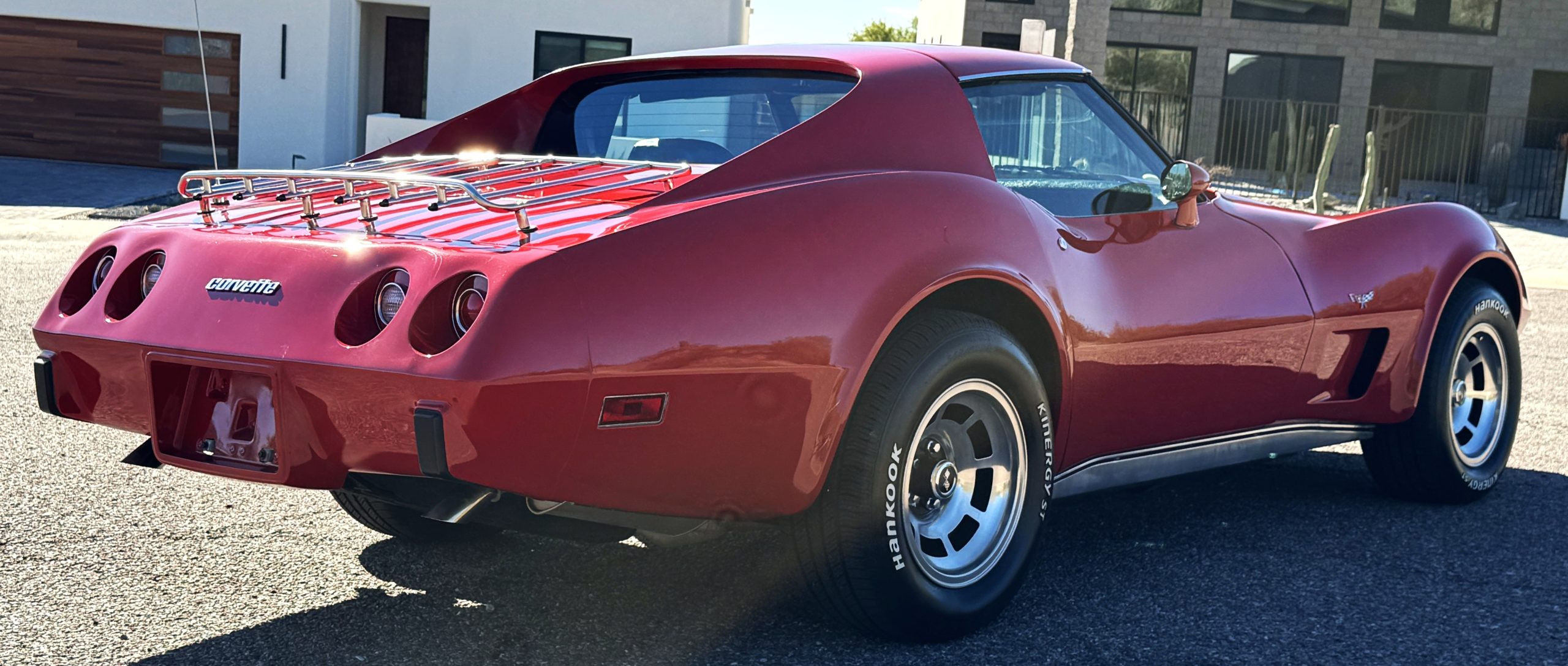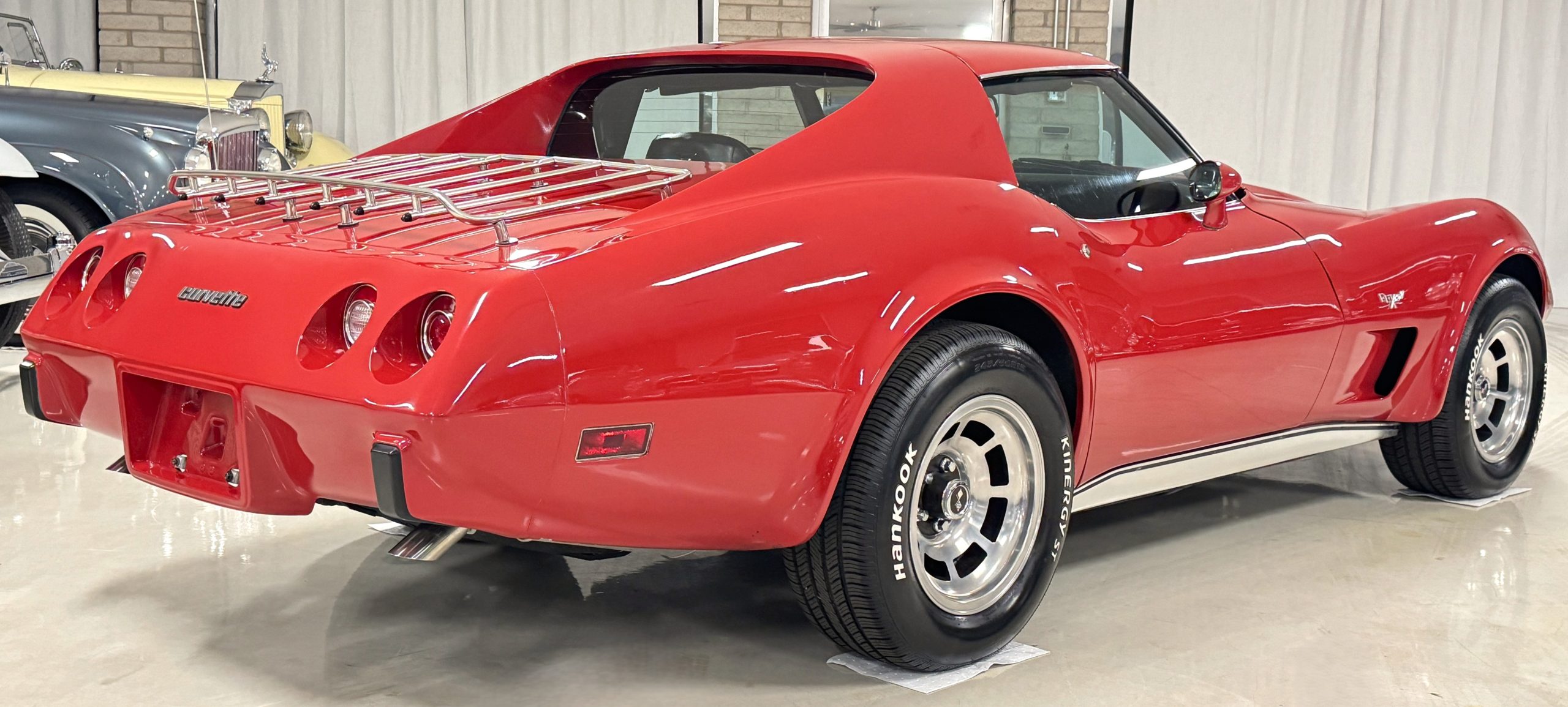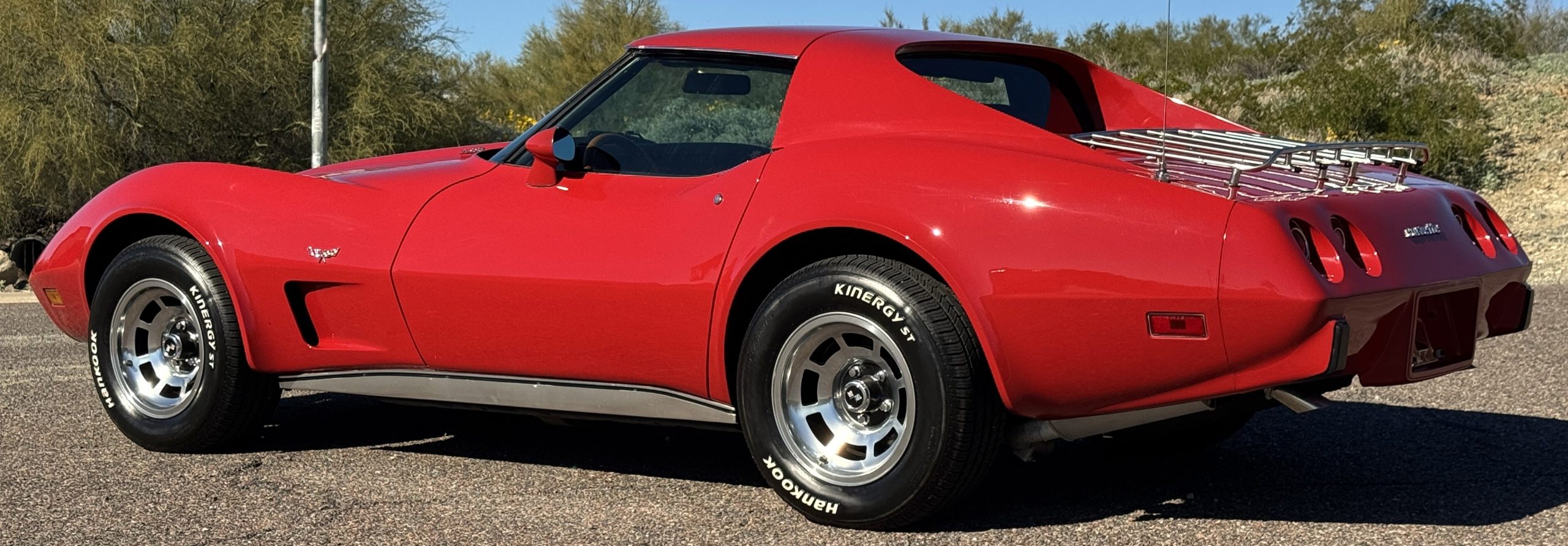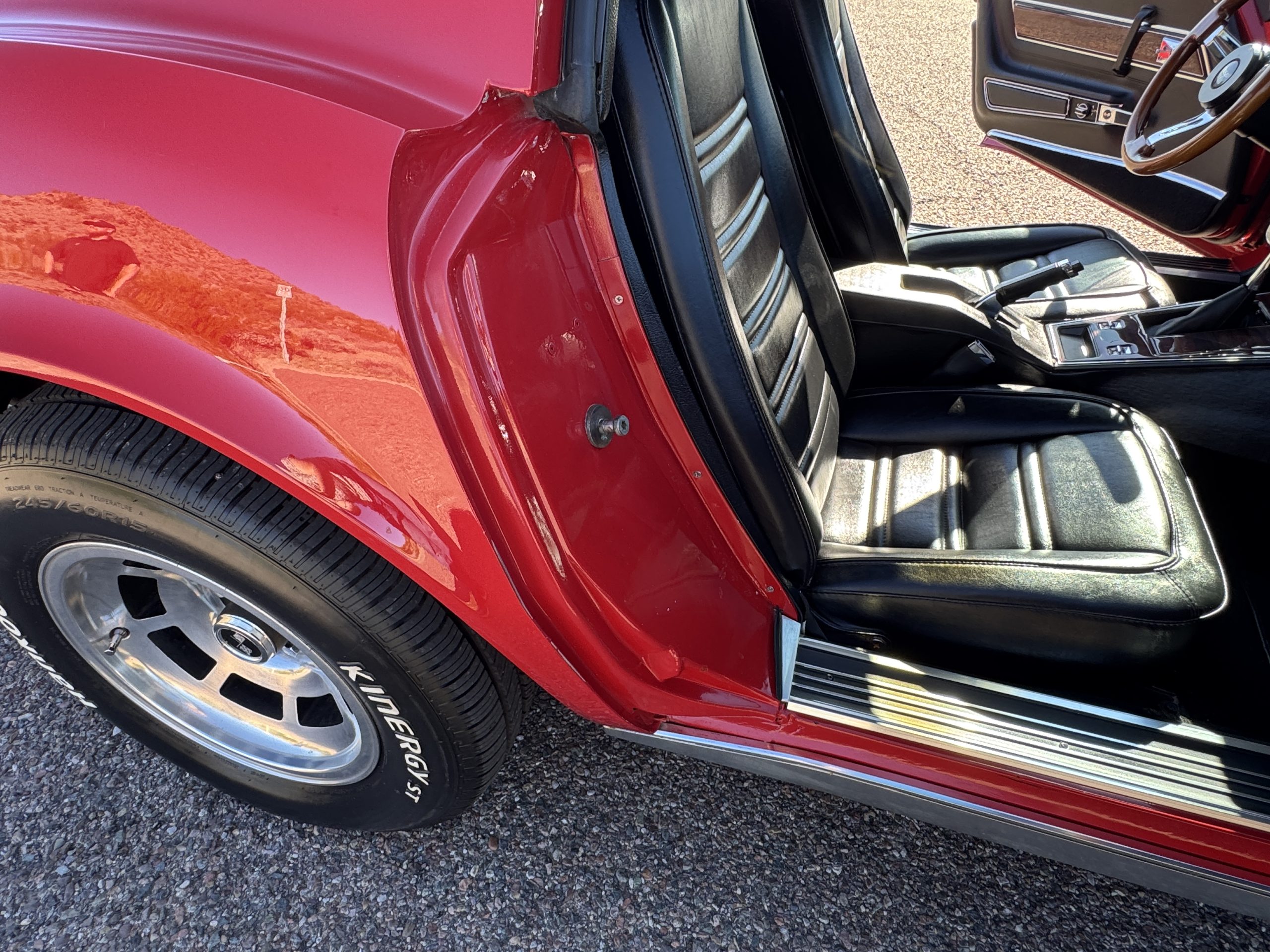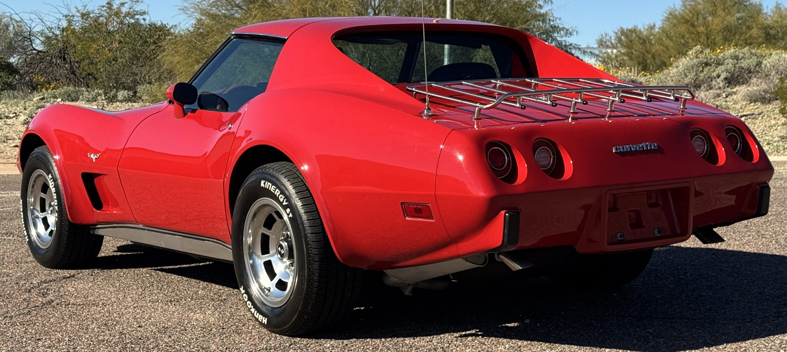 The fiberglass body retains the unmistakable C3 profile with long hood, flared fenders, pop-up headlights, straight and removable T-top roof panels. Originally finished in Black Tuxedo, this Corvette has been refinished in Red Medium which is in good overall condition. There are small paint bubbles, chips, and minor imperfections concentrated toward the front end. Body panels remain in very good overall condition, and the upgraded 15-inch aluminum wheels provide both a visual and weight-saving improvement over stock, wrapped in Hankook Kinergy 245/60R15 tires in very good condition. A rear luggage rack allows convenient T-top storage or additional cargo capacity, and 1977 marks the final year of the distinctive “sugar scoop” rear window design.