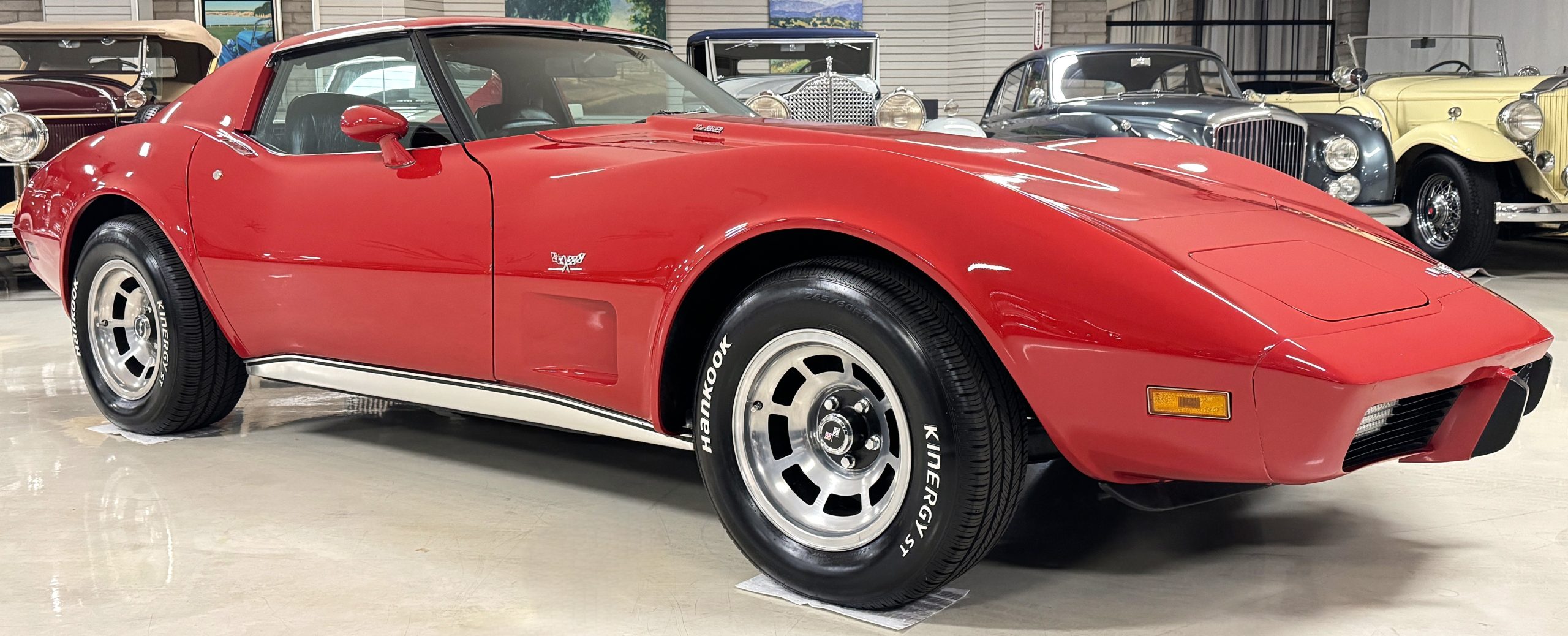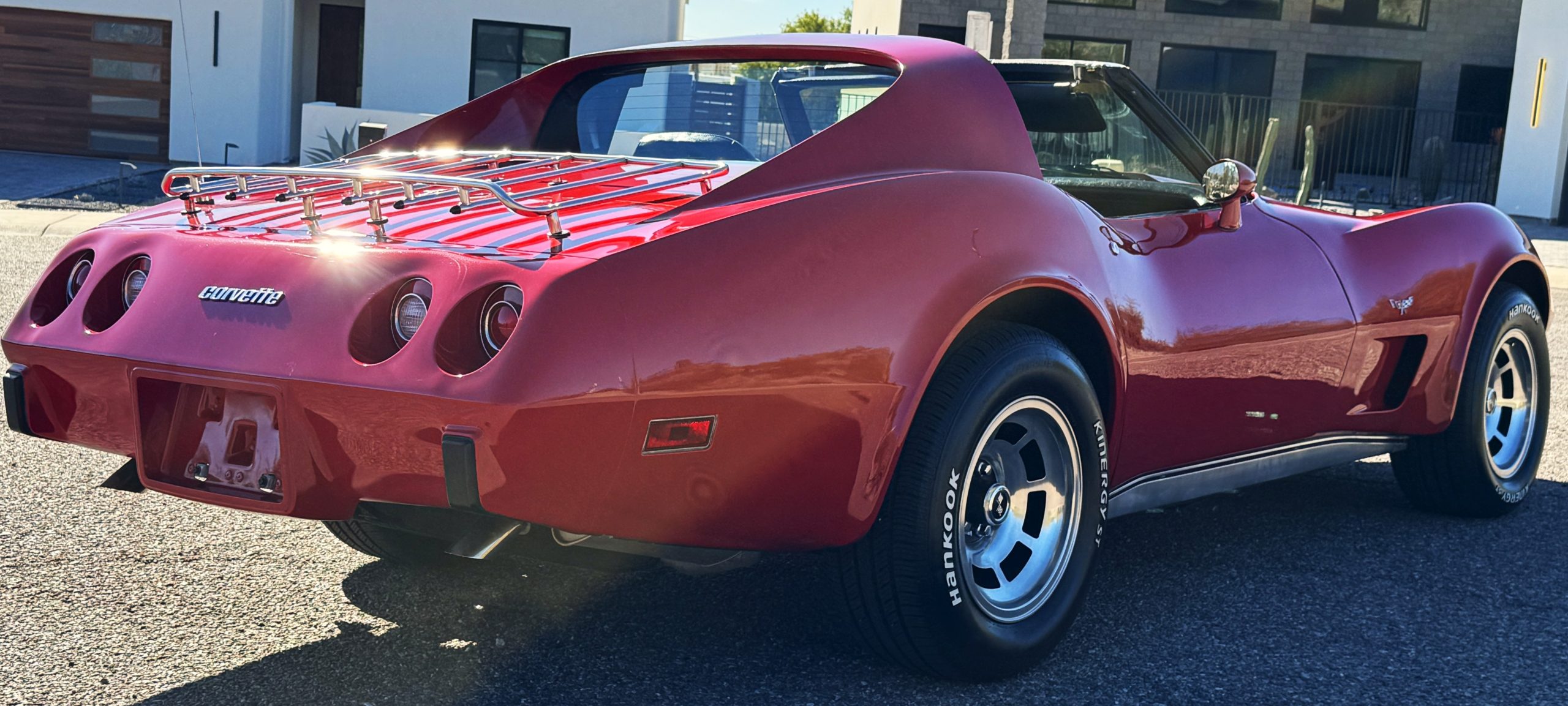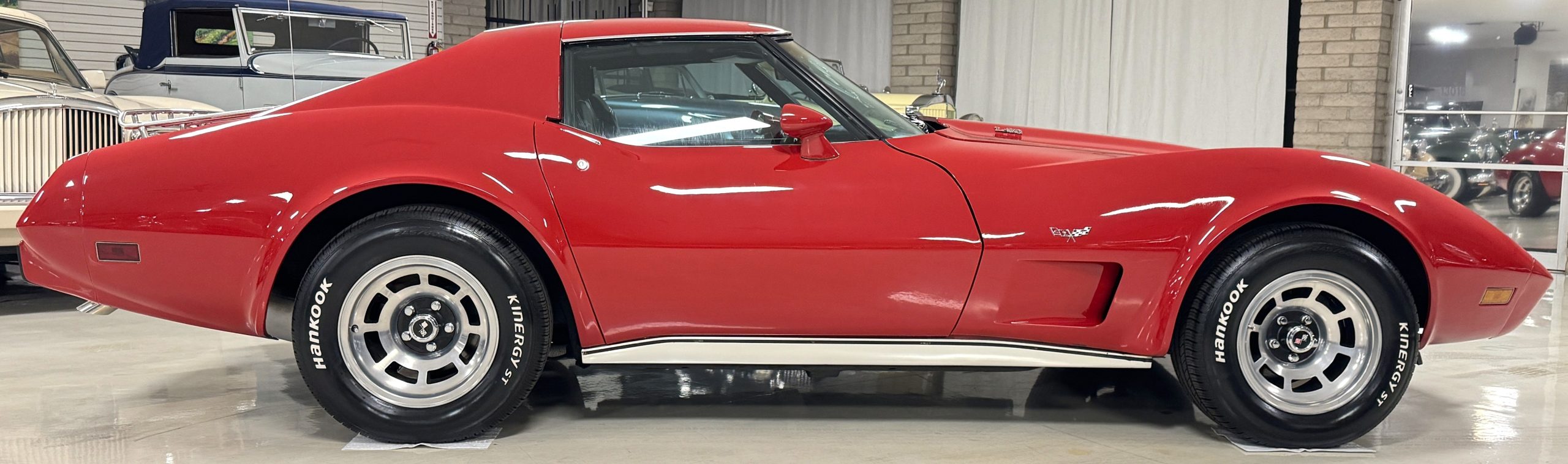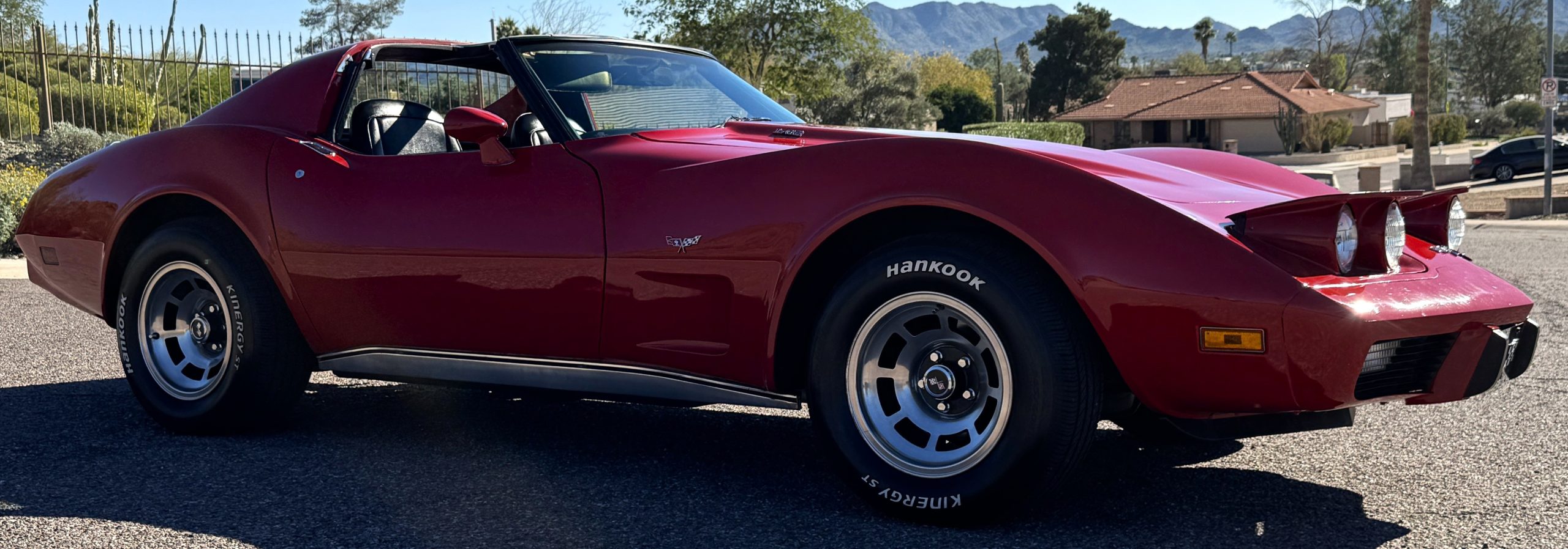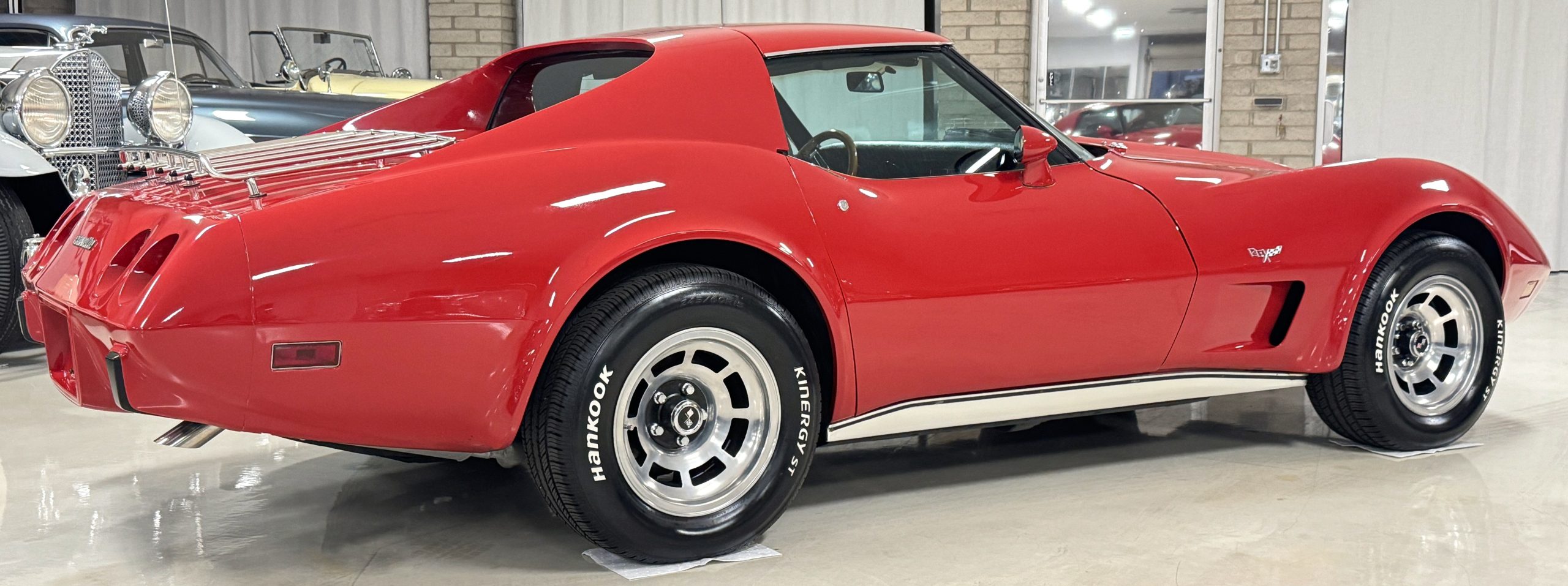The fiberglass body retains the unmistakable C3 profile with long hood, flared fenders, pop-up headlights, straight and removable T-top roof panels. Originally finished in Black Tuxedo, this Corvette has been refinished in Red Medium which is in good overall condition. There are small paint bubbles, chips, and minor imperfections concentrated toward the front end. Body panels remain in very good overall condition, and the upgraded 15-inch aluminum wheels provide both a visual and weight-saving improvement over stock, wrapped in Hankook Kinergy 245/60R15 tires in very good condition. A rear luggage rack allows convenient T-top storage or additional cargo capacity, and 1977 marks the final year of the distinctive “sugar scoop” rear window design.