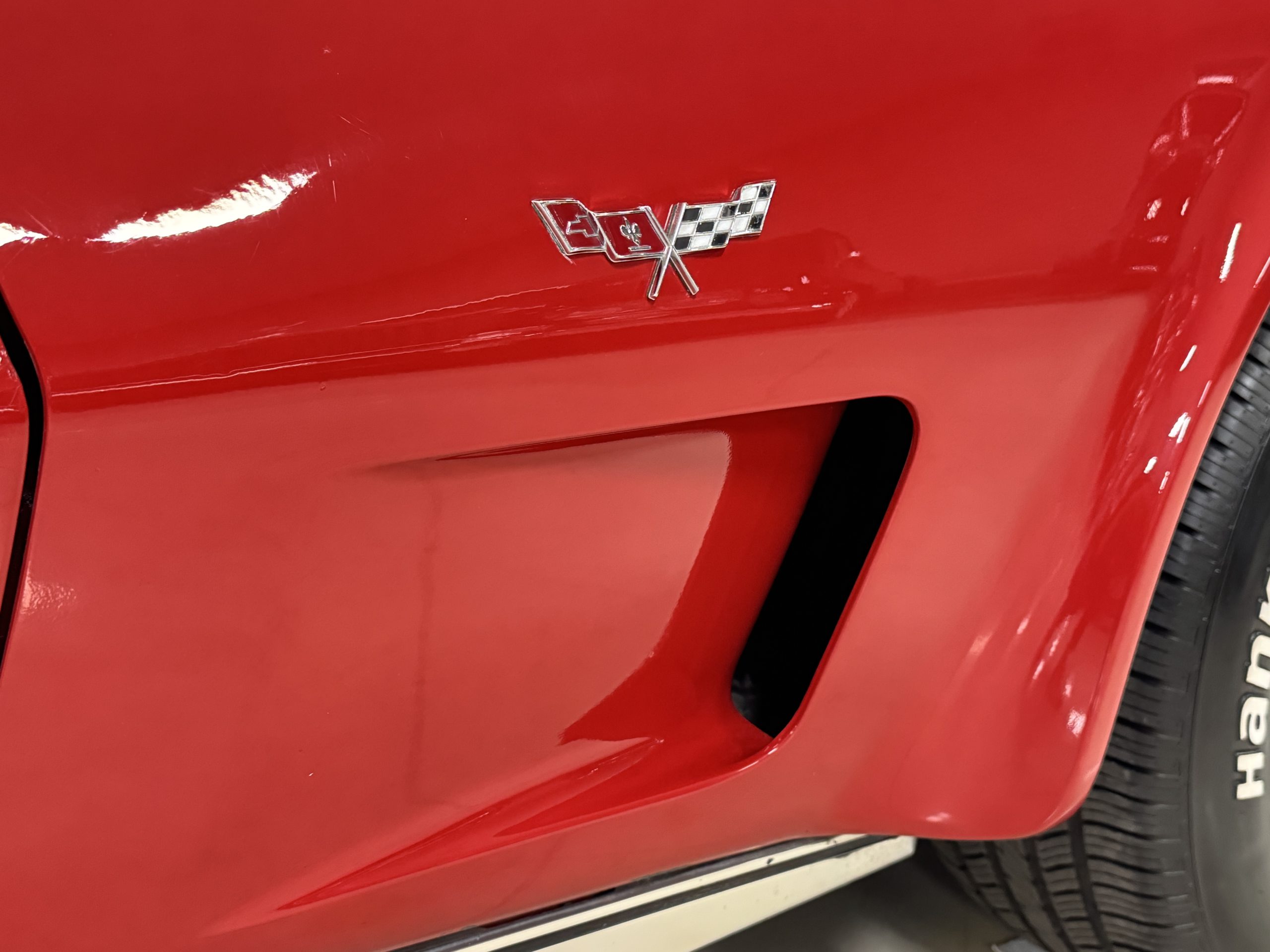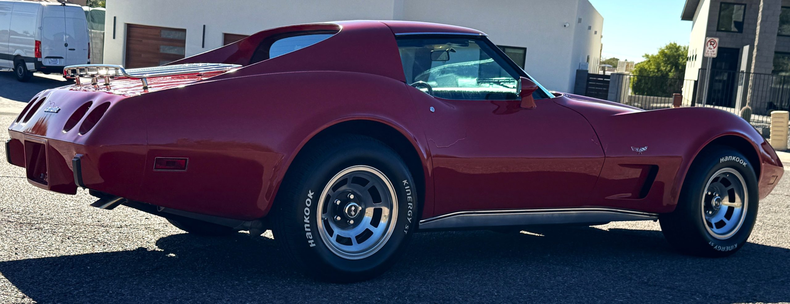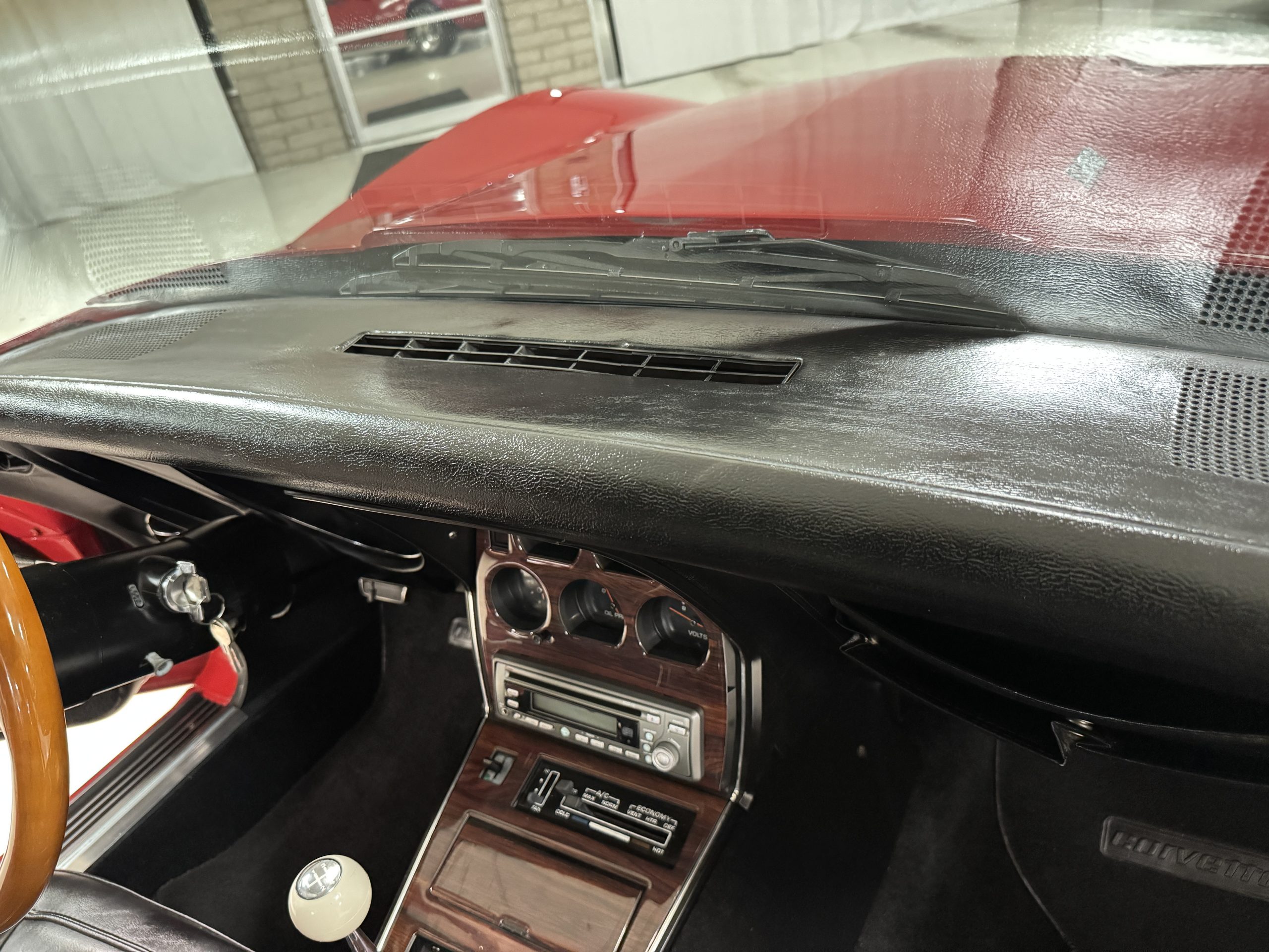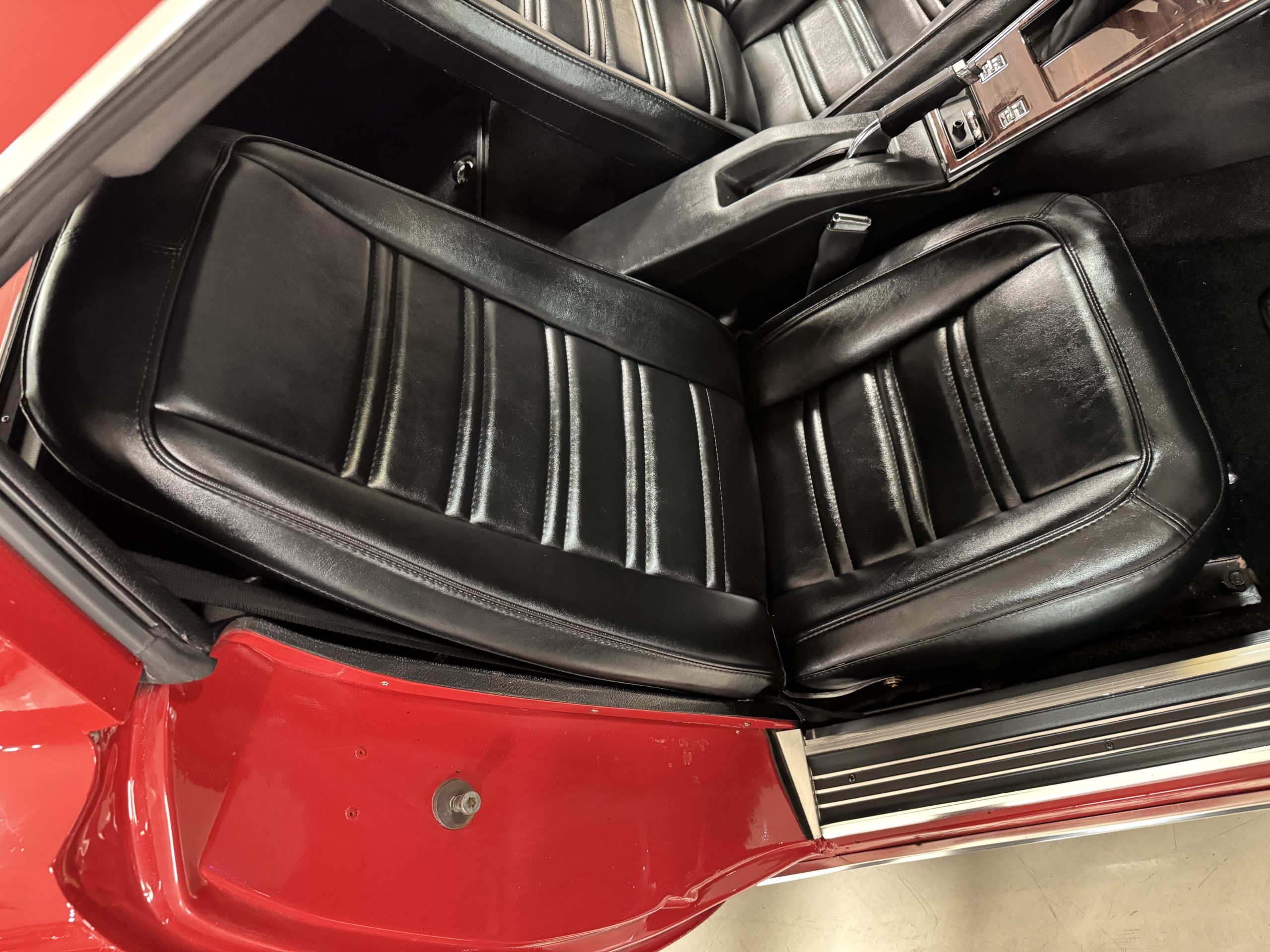 The fiberglass body retains the unmistakable C3 profile with long hood, flared fenders, pop-up headlights, straight and removable T-top roof panels. Originally finished in Black Tuxedo, this Corvette has been refinished in Red Medium which is in good overall condition. There are small paint bubbles, chips, and minor imperfections concentrated toward the front end. Body panels remain in very good overall condition, and the upgraded 15-inch aluminum wheels provide both a visual and weight-saving improvement over stock, wrapped in Hankook Kinergy 245/60R15 tires in very good condition. A rear luggage rack allows convenient T-top storage or additional cargo capacity, and 1977 marks the final year of the distinctive “sugar scoop” rear window design.