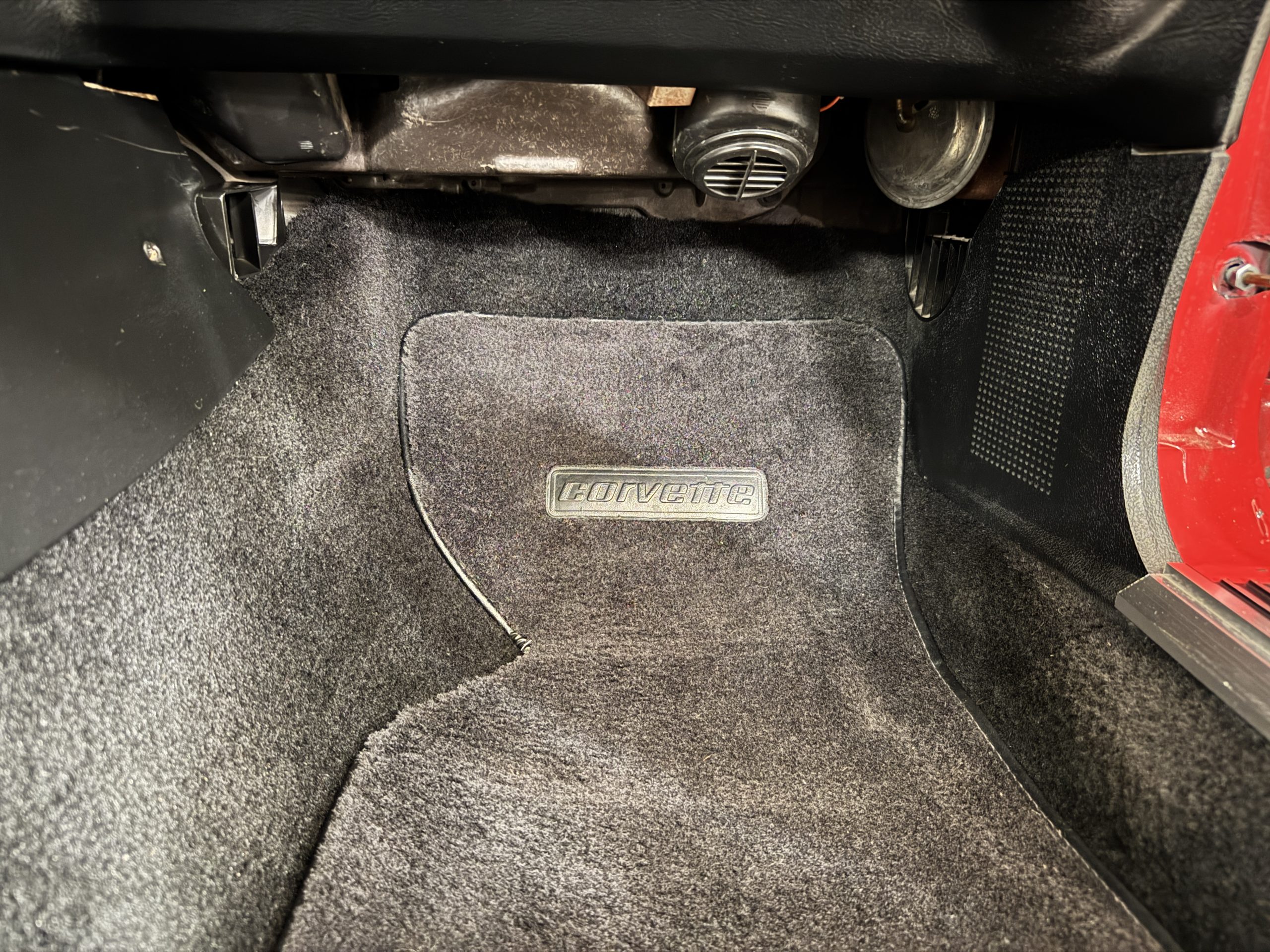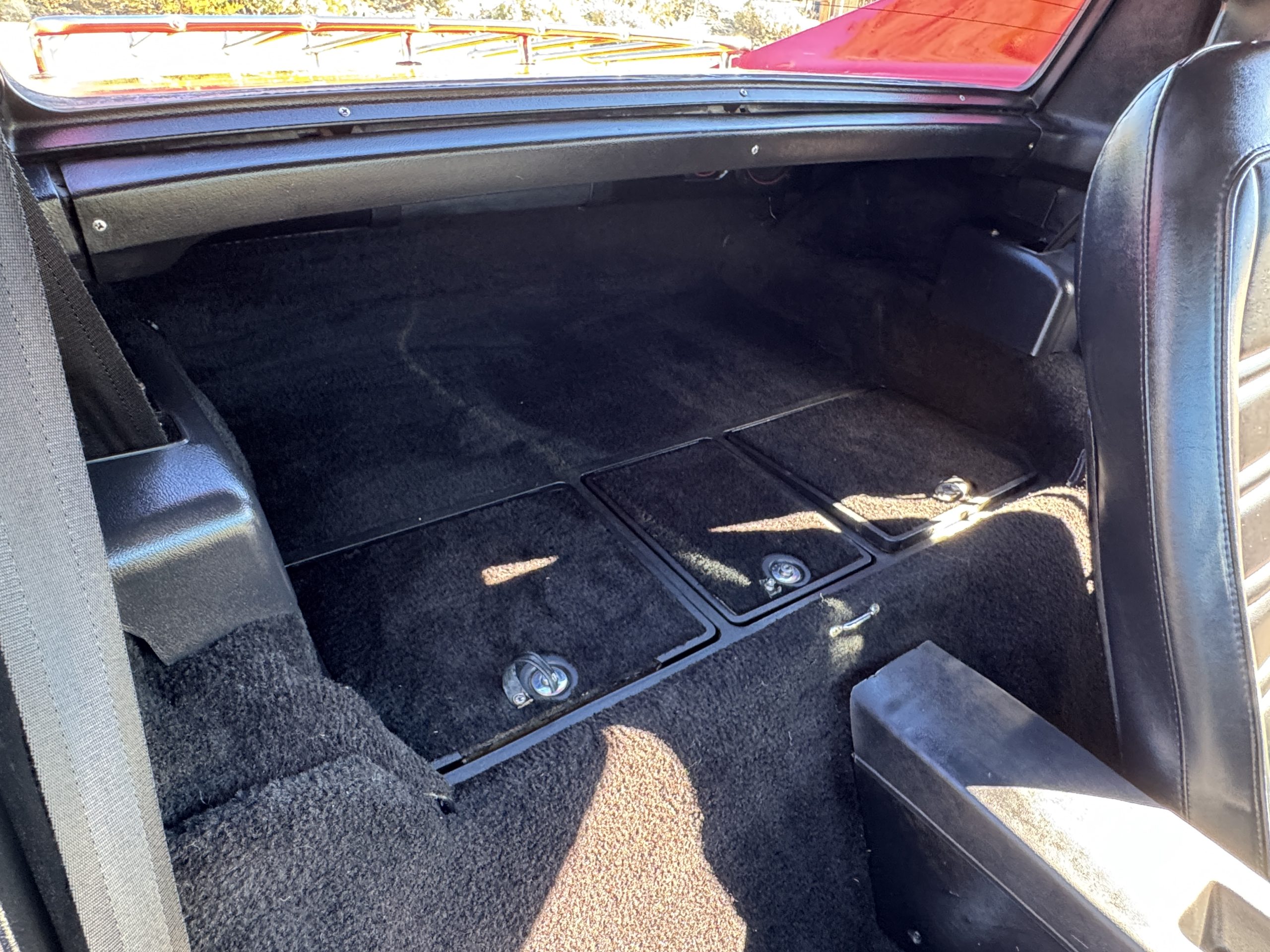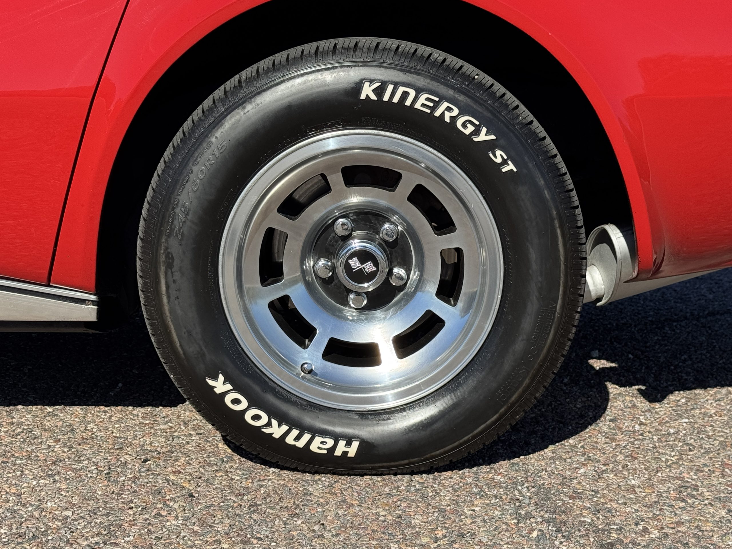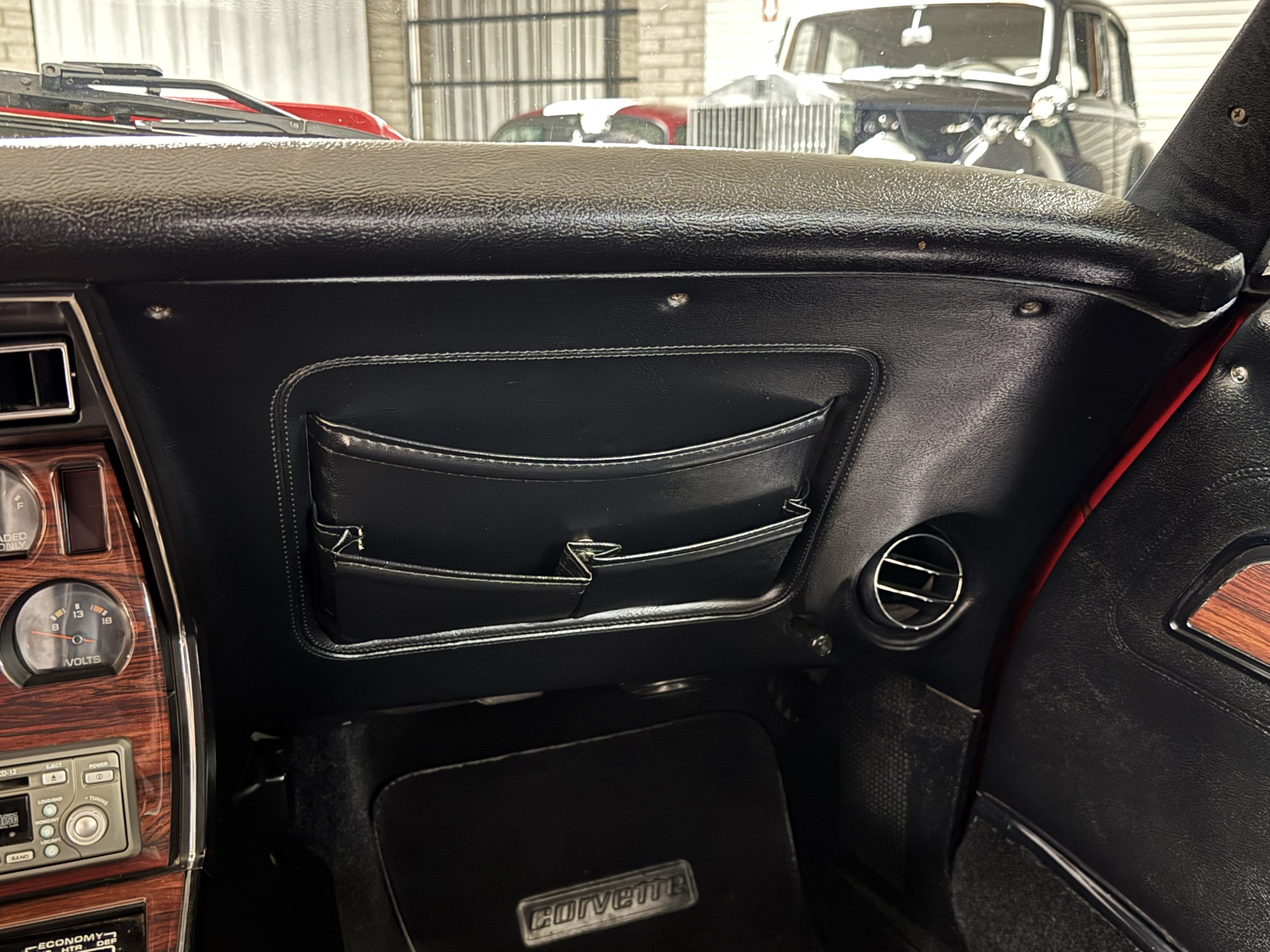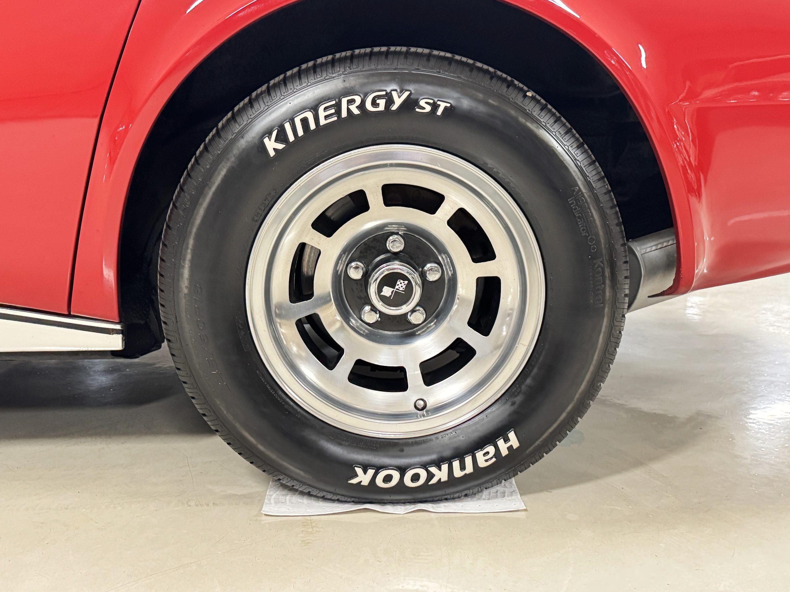 The fiberglass body retains the unmistakable C3 profile with long hood, flared fenders, pop-up headlights, straight and removable T-top roof panels. Originally finished in Black Tuxedo, this Corvette has been refinished in Red Medium which is in good overall condition. There are small paint bubbles, chips, and minor imperfections concentrated toward the front end. Body panels remain in very good overall condition, and the upgraded 15-inch aluminum wheels provide both a visual and weight-saving improvement over stock, wrapped in Hankook Kinergy 245/60R15 tires in very good condition. A rear luggage rack allows convenient T-top storage or additional cargo capacity, and 1977 marks the final year of the distinctive “sugar scoop” rear window design.