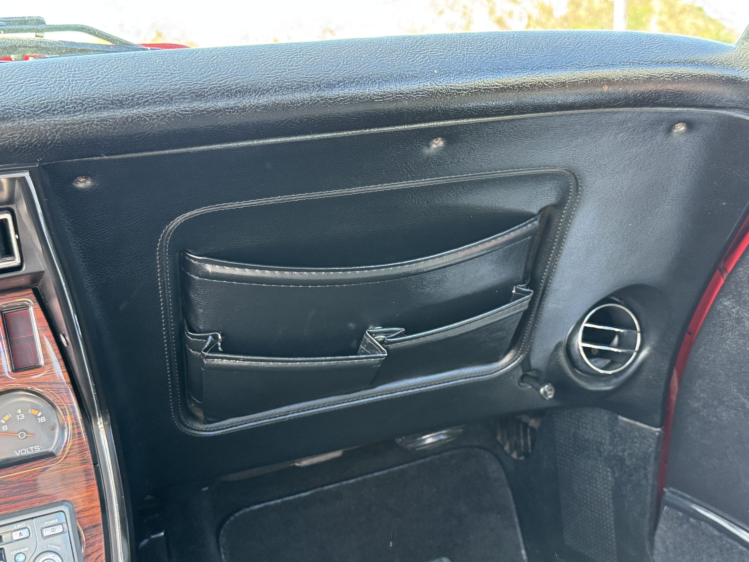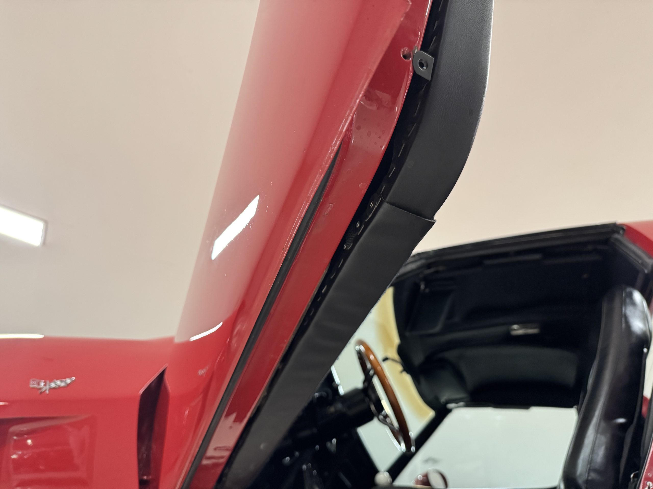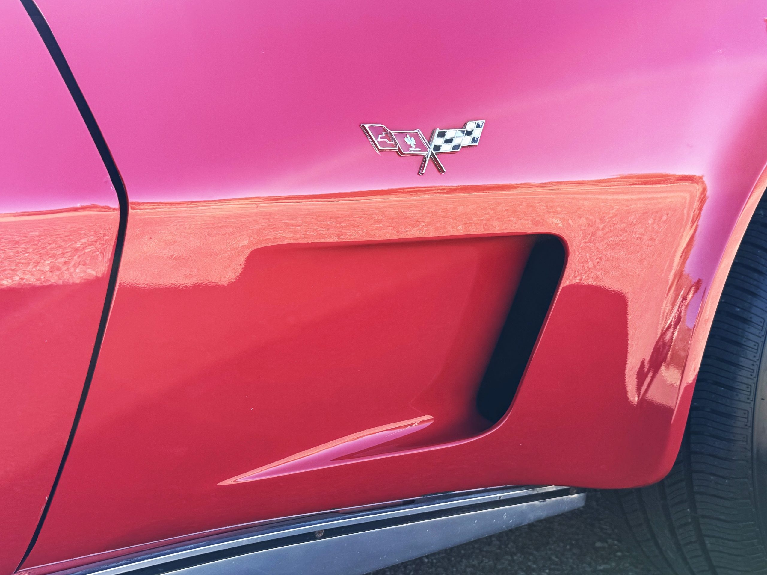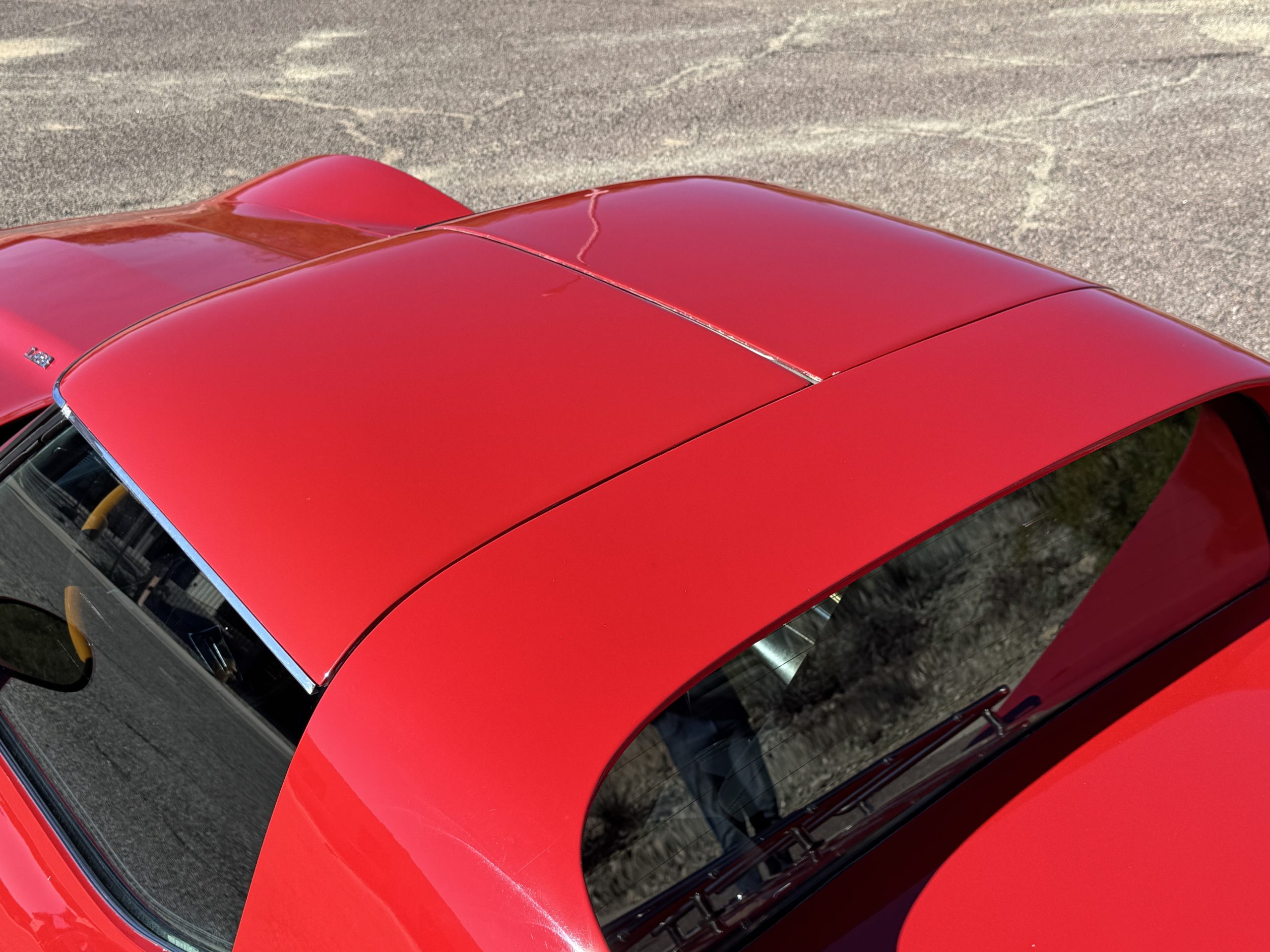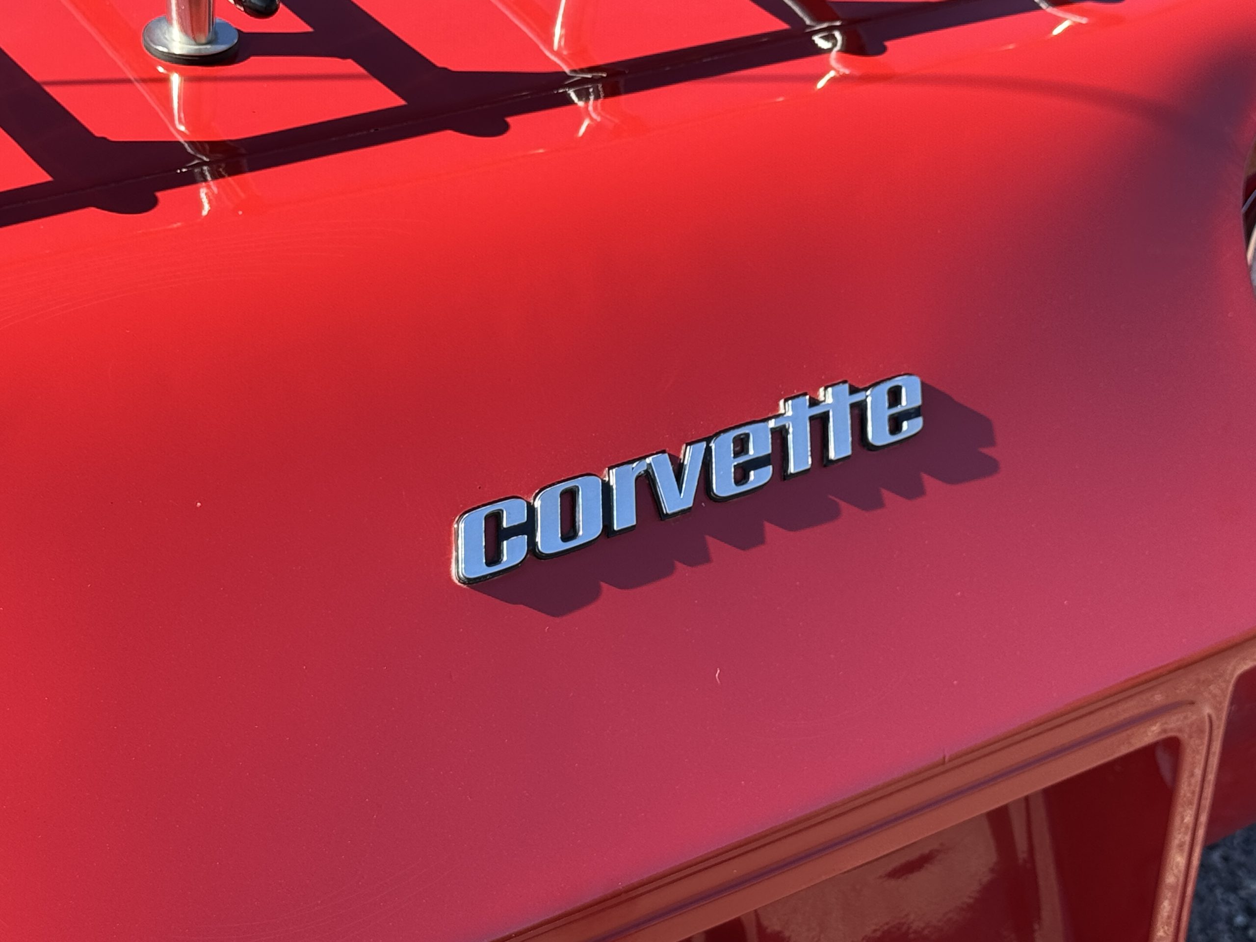 The fiberglass body retains the unmistakable C3 profile with long hood, flared fenders, pop-up headlights, straight and removable T-top roof panels. Originally finished in Black Tuxedo, this Corvette has been refinished in Red Medium which is in good overall condition. There are small paint bubbles, chips, and minor imperfections concentrated toward the front end. Body panels remain in very good overall condition, and the upgraded 15-inch aluminum wheels provide both a visual and weight-saving improvement over stock, wrapped in Hankook Kinergy 245/60R15 tires in very good condition. A rear luggage rack allows convenient T-top storage or additional cargo capacity, and 1977 marks the final year of the distinctive “sugar scoop” rear window design.