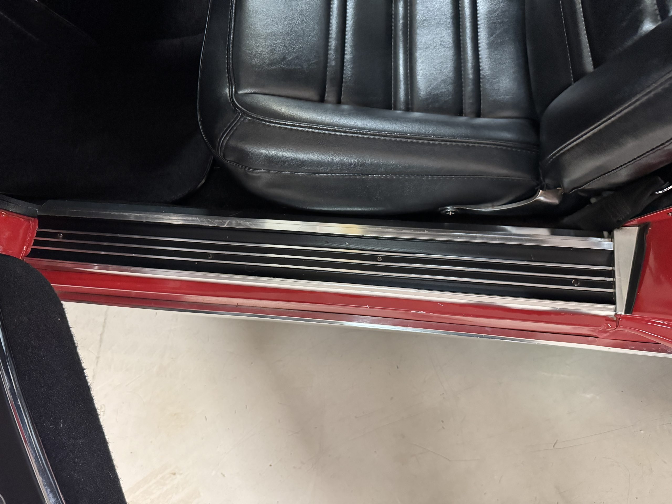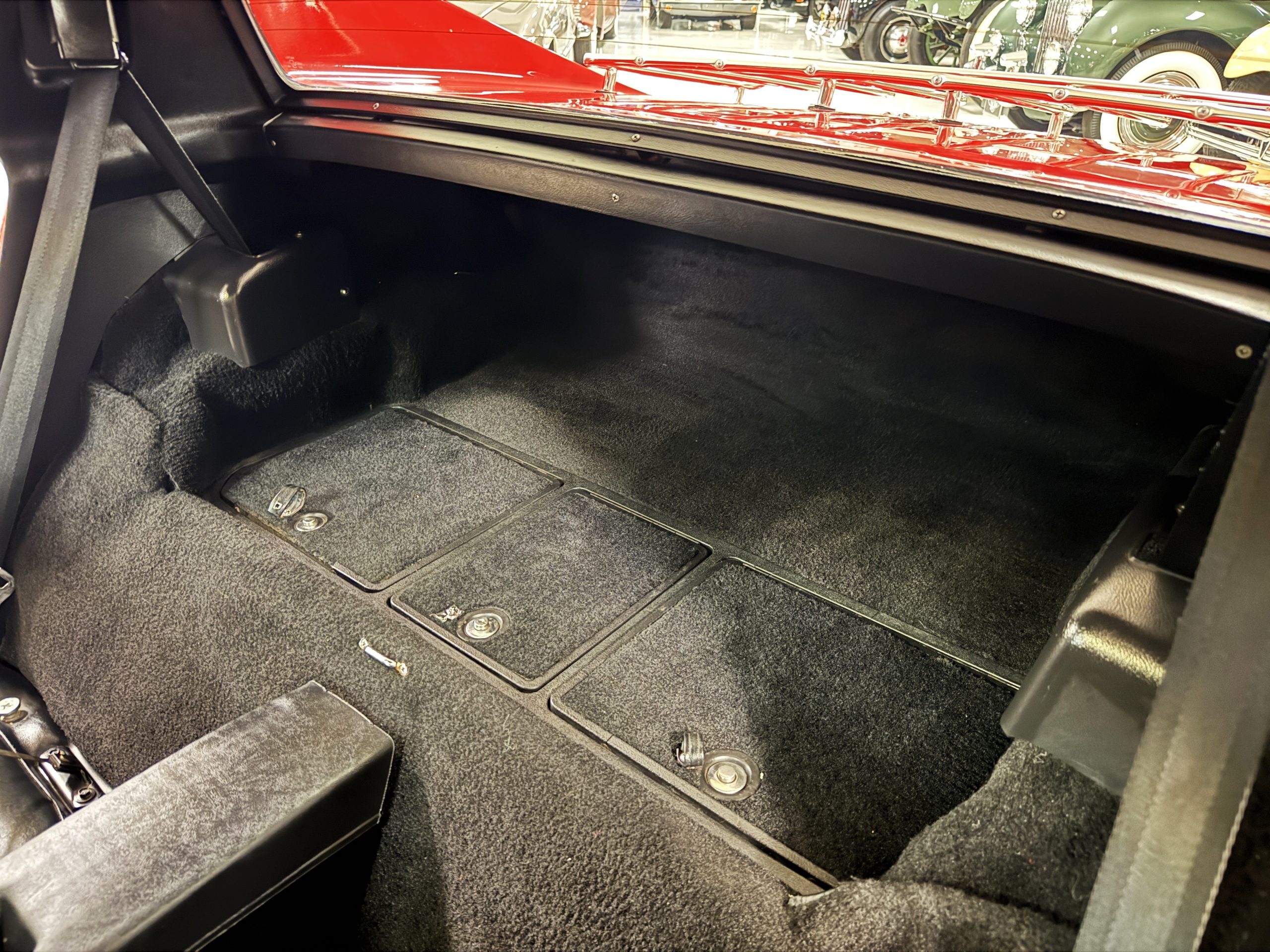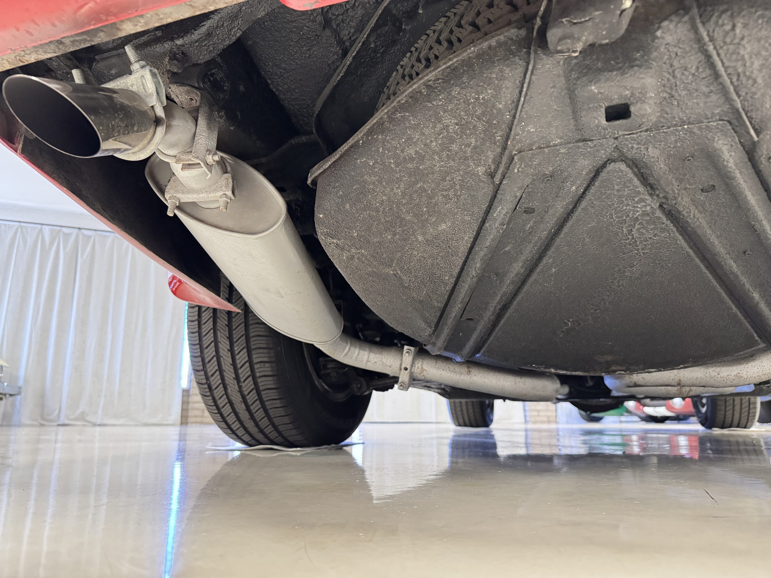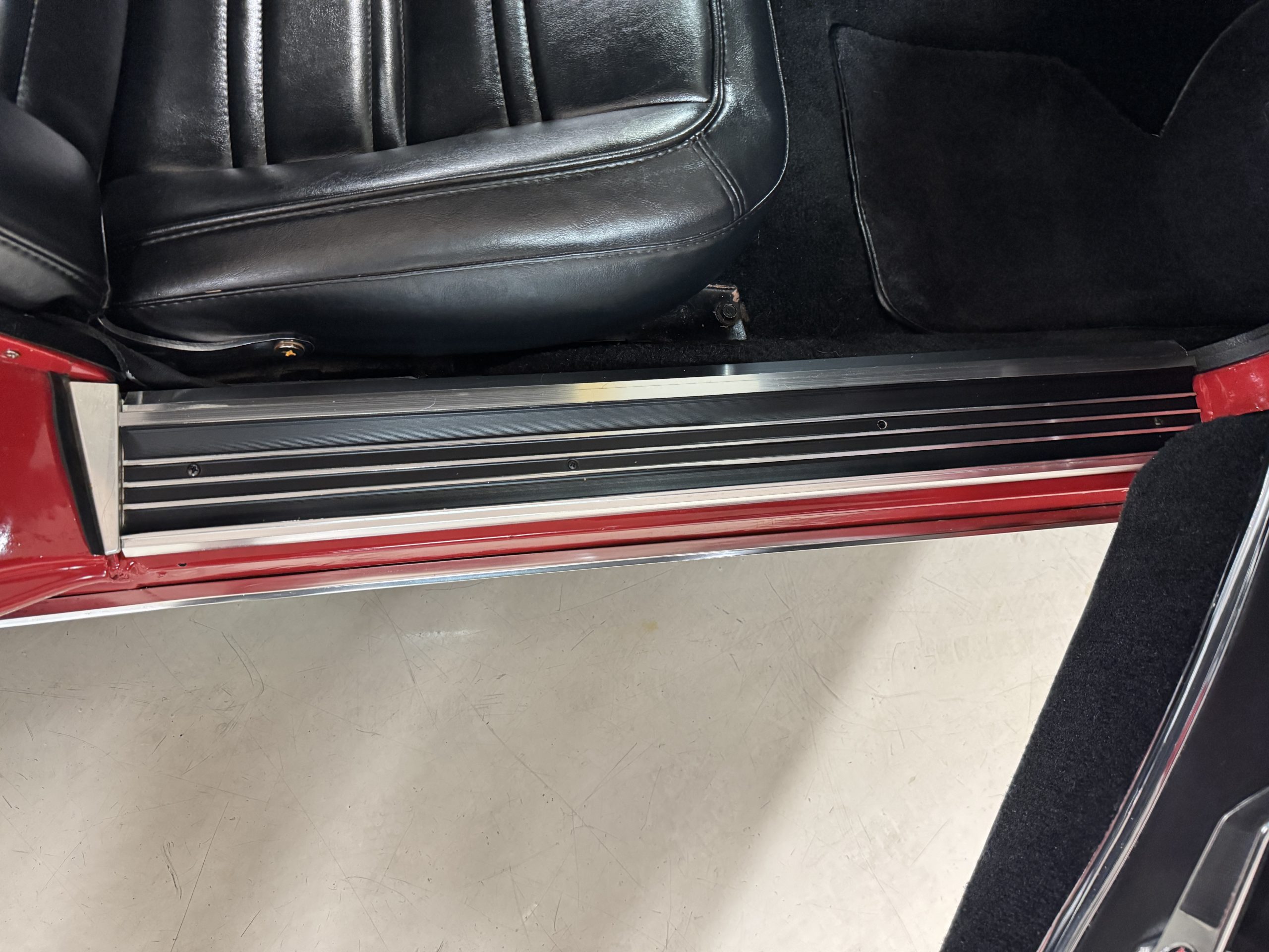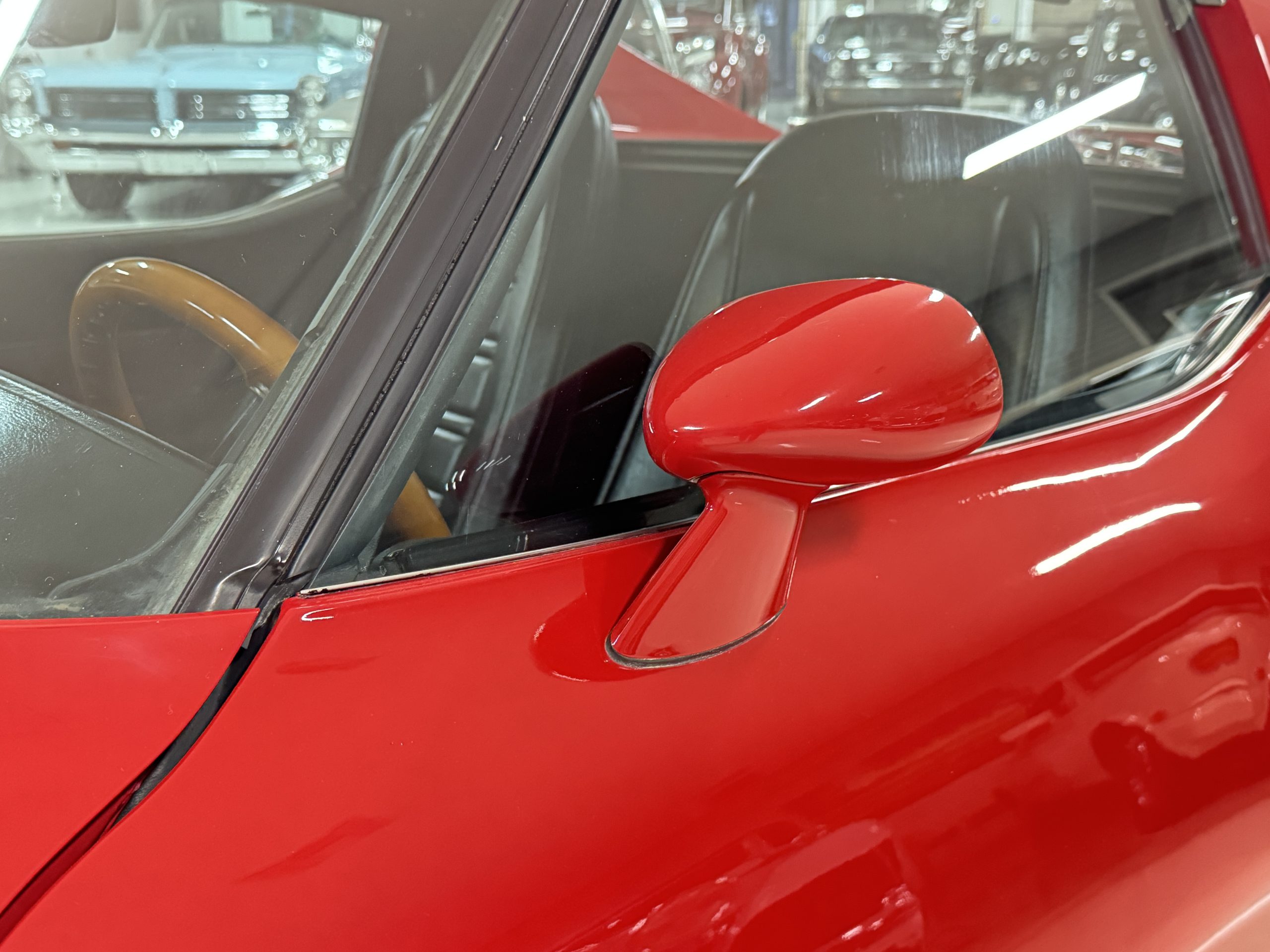 The fiberglass body retains the unmistakable C3 profile with long hood, flared fenders, pop-up headlights, straight and removable T-top roof panels. Originally finished in Black Tuxedo, this Corvette has been refinished in Red Medium which is in good overall condition. There are small paint bubbles, chips, and minor imperfections concentrated toward the front end. Body panels remain in very good overall condition, and the upgraded 15-inch aluminum wheels provide both a visual and weight-saving improvement over stock, wrapped in Hankook Kinergy 245/60R15 tires in very good condition. A rear luggage rack allows convenient T-top storage or additional cargo capacity, and 1977 marks the final year of the distinctive “sugar scoop” rear window design.
