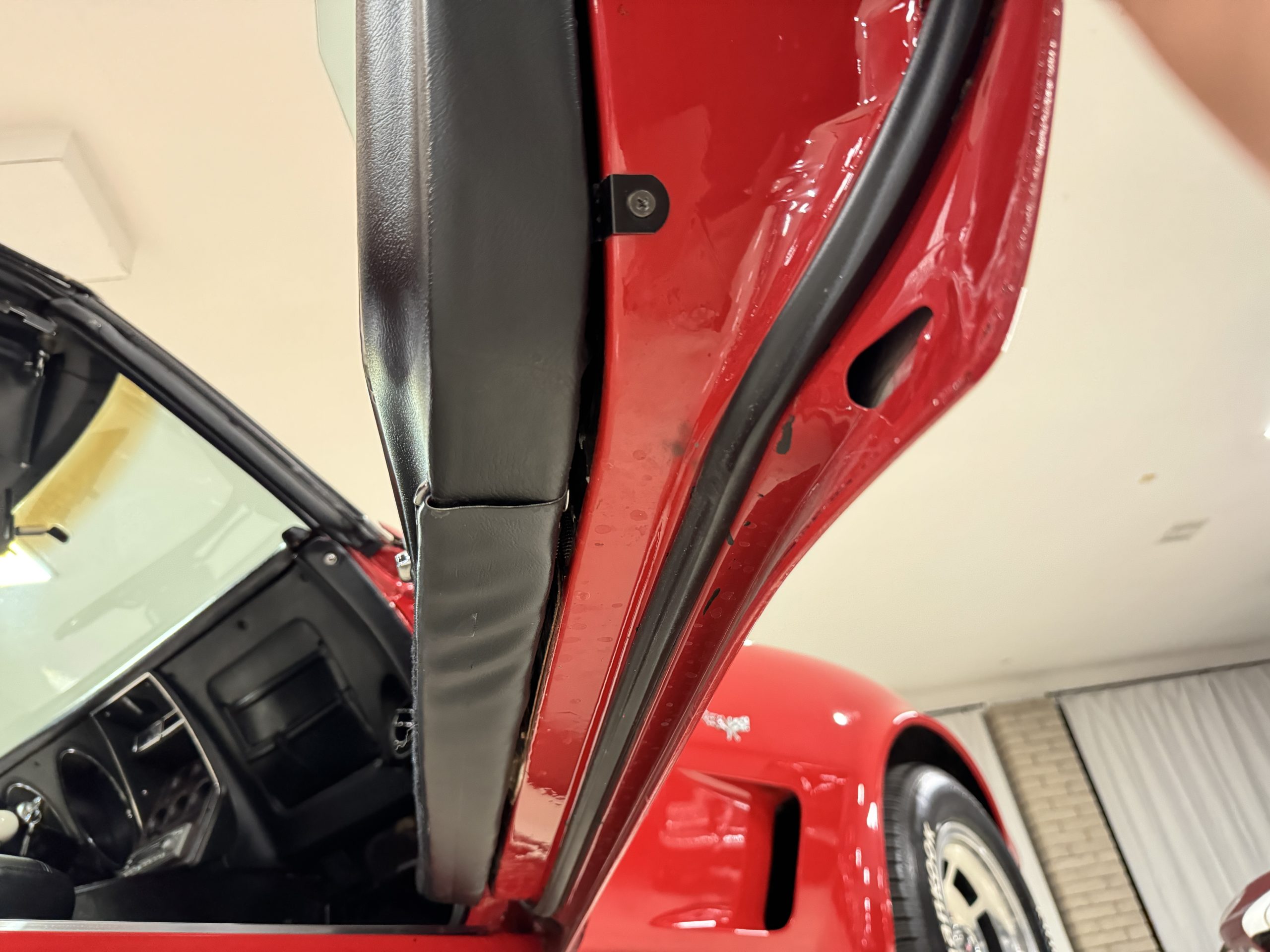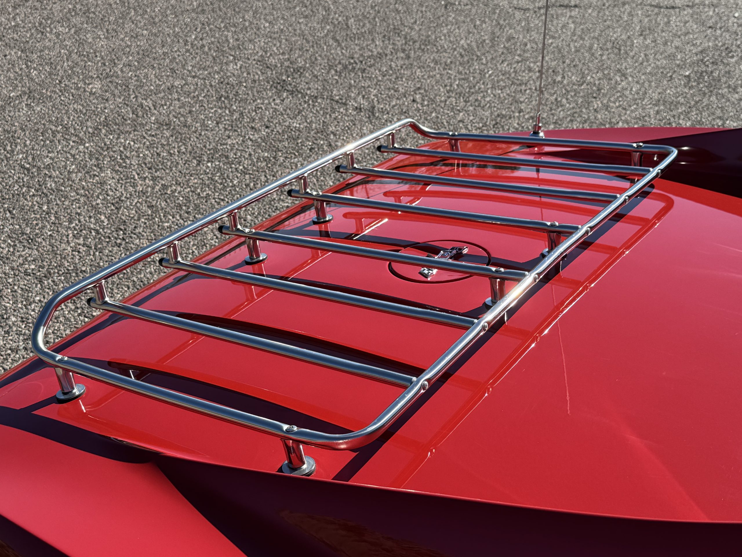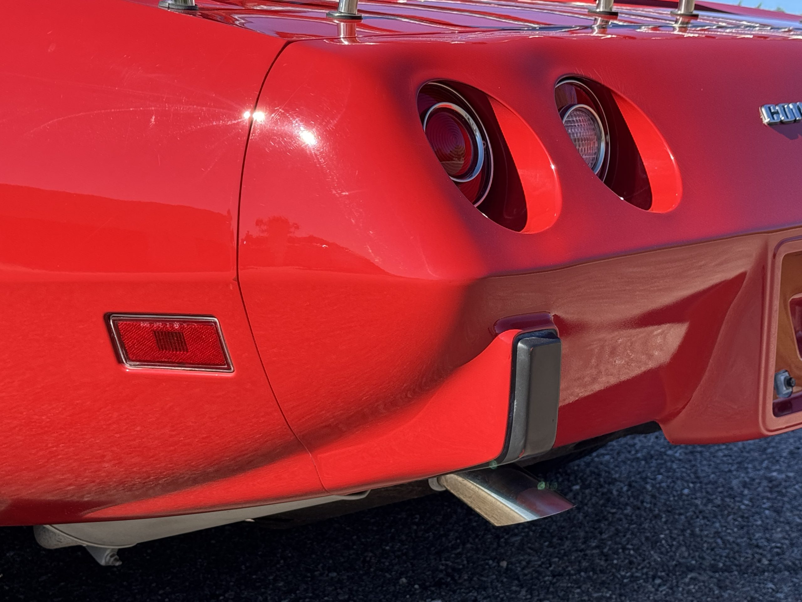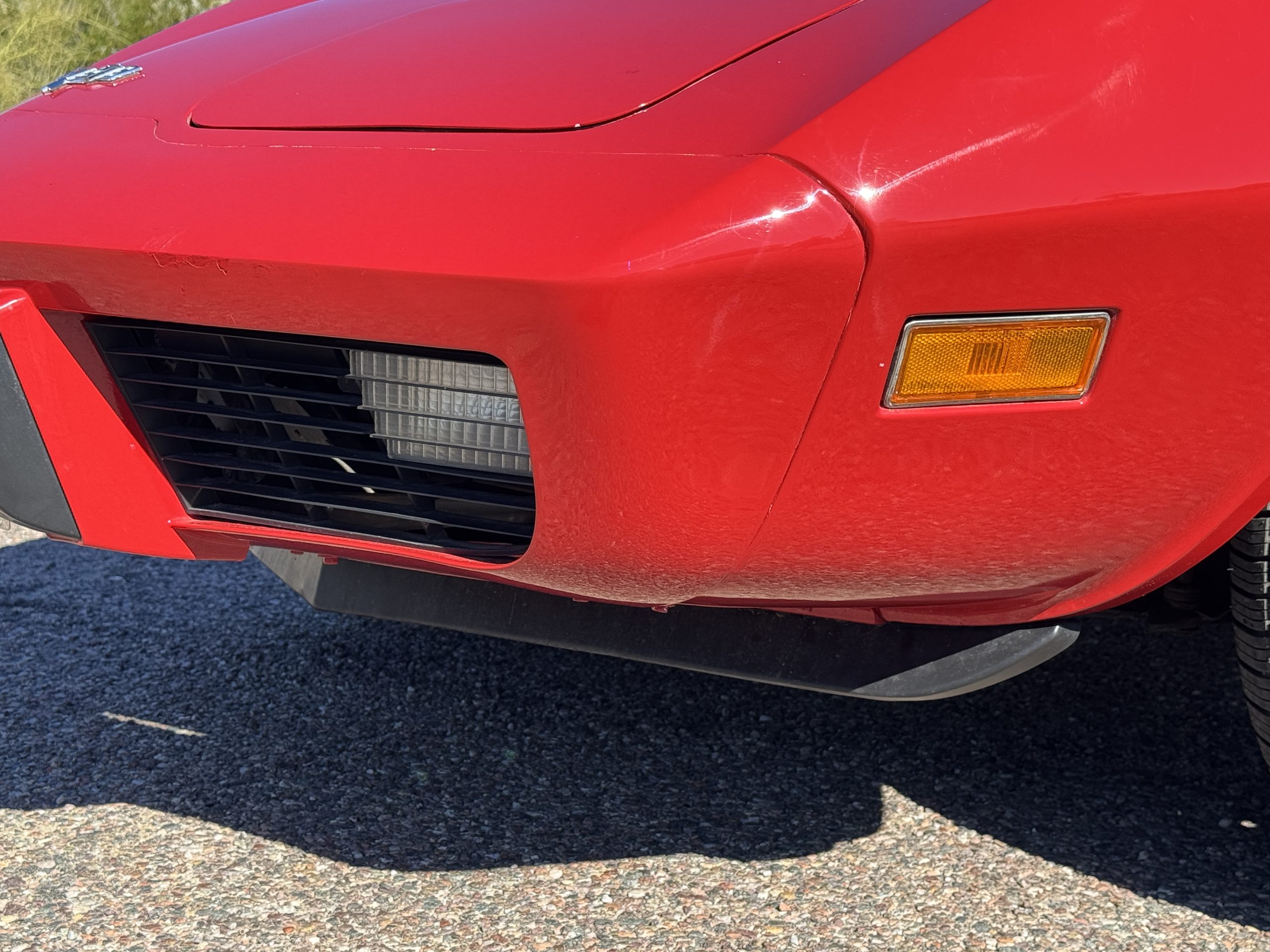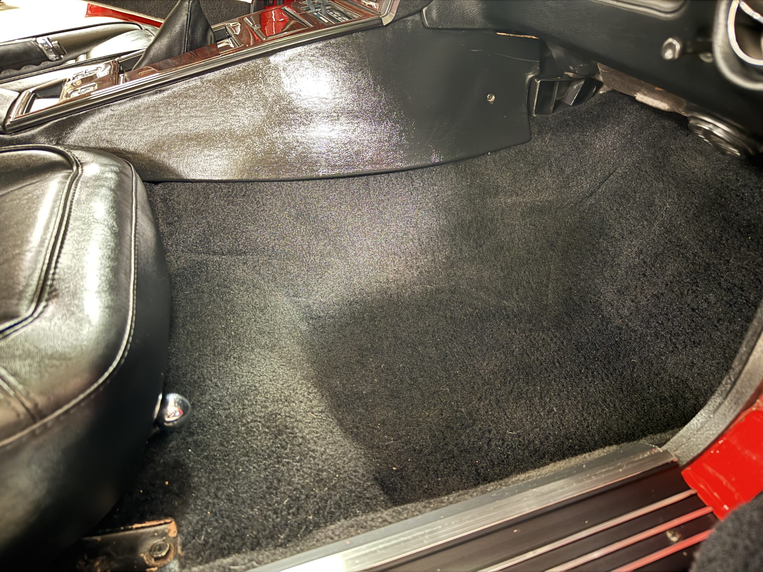The fiberglass body retains the unmistakable C3 profile with long hood, flared fenders, pop-up headlights, straight and removable T-top roof panels. Originally finished in Black Tuxedo, this Corvette has been refinished in Red Medium which is in good overall condition. There are small paint bubbles, chips, and minor imperfections concentrated toward the front end. Body panels remain in very good overall condition, and the upgraded 15-inch aluminum wheels provide both a visual and weight-saving improvement over stock, wrapped in Hankook Kinergy 245/60R15 tires in very good condition. A rear luggage rack allows convenient T-top storage or additional cargo capacity, and 1977 marks the final year of the distinctive “sugar scoop” rear window design.
