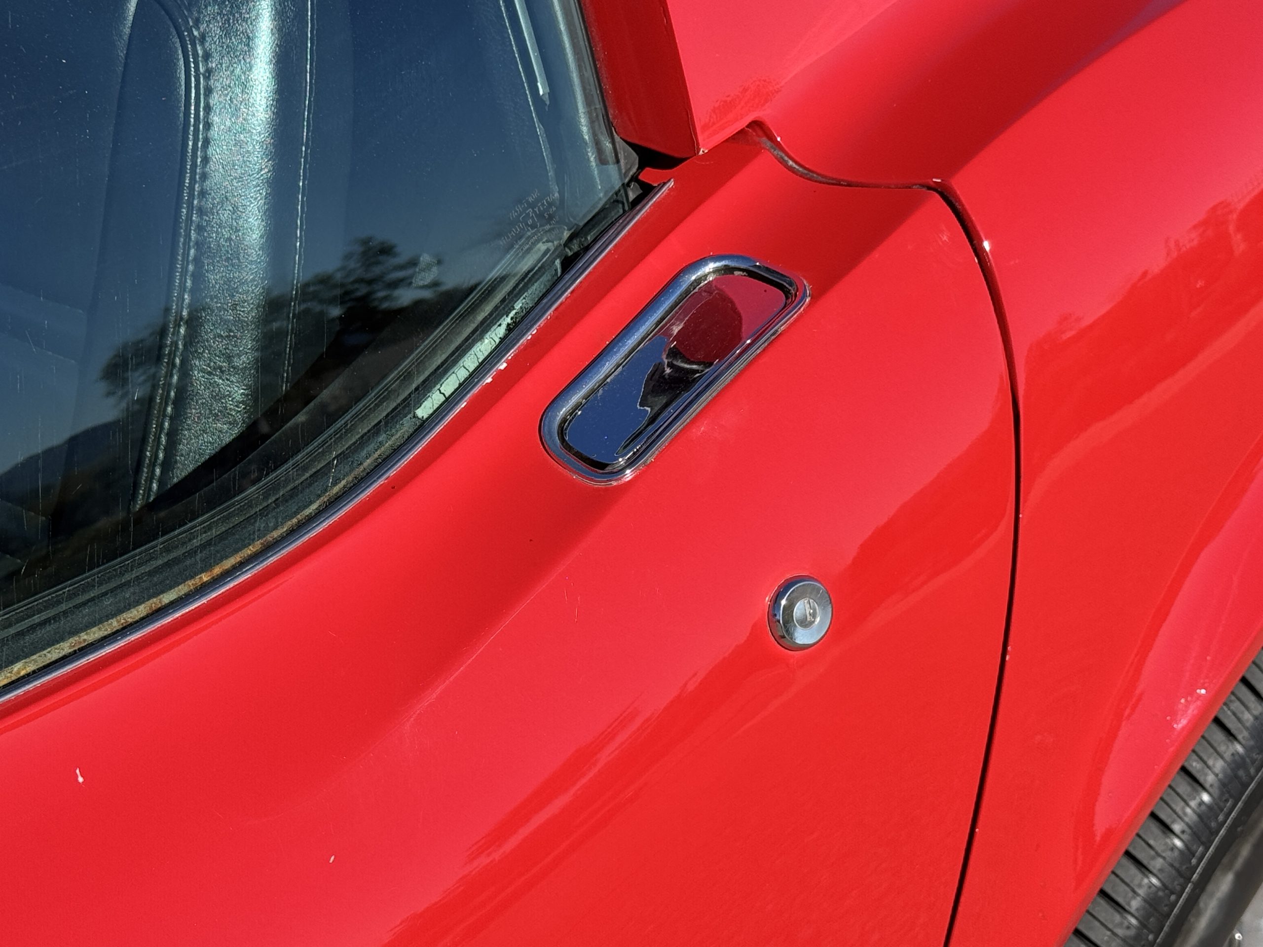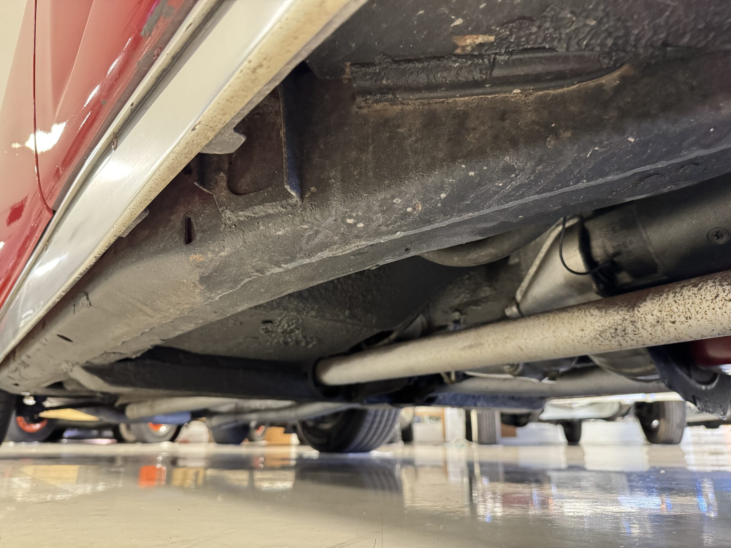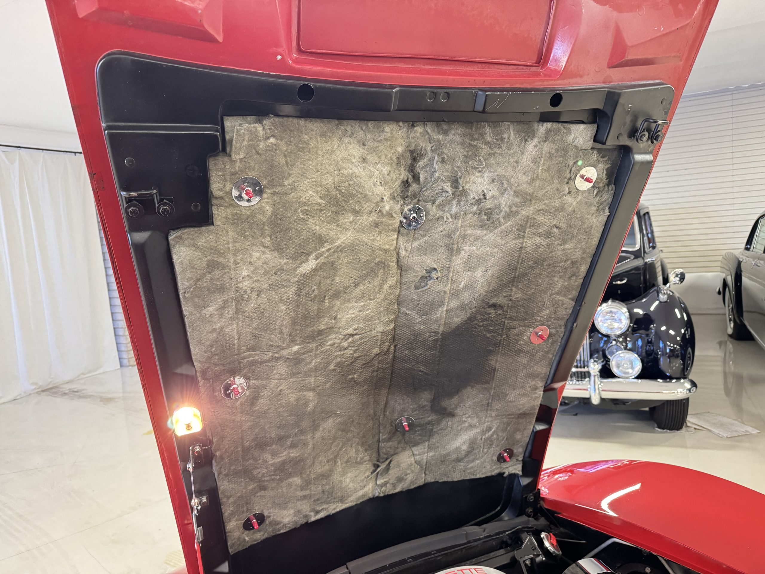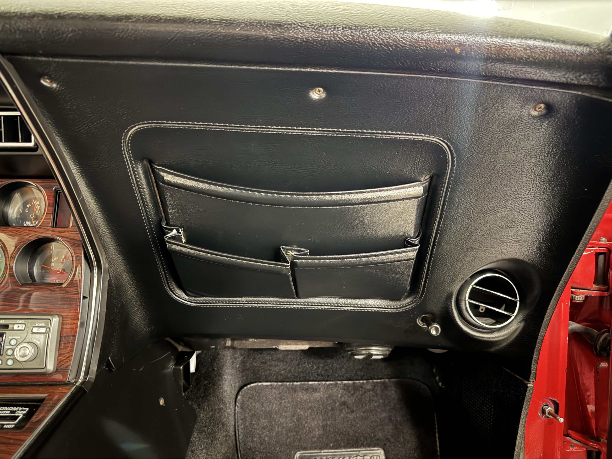 The fiberglass body retains the unmistakable C3 profile with long hood, flared fenders, pop-up headlights, straight and removable T-top roof panels. Originally finished in Black Tuxedo, this Corvette has been refinished in Red Medium which is in good overall condition. There are small paint bubbles, chips, and minor imperfections concentrated toward the front end. Body panels remain in very good overall condition, and the upgraded 15-inch aluminum wheels provide both a visual and weight-saving improvement over stock, wrapped in Hankook Kinergy 245/60R15 tires in very good condition. A rear luggage rack allows convenient T-top storage or additional cargo capacity, and 1977 marks the final year of the distinctive “sugar scoop” rear window design.