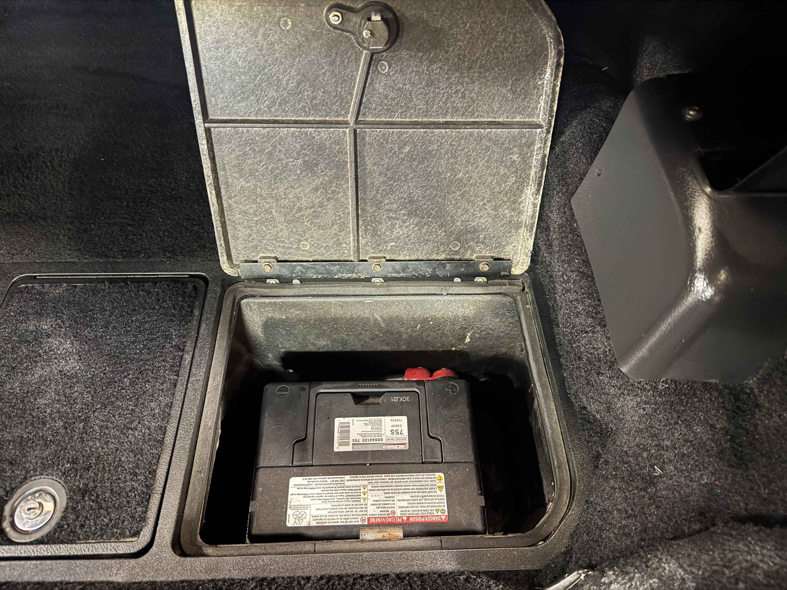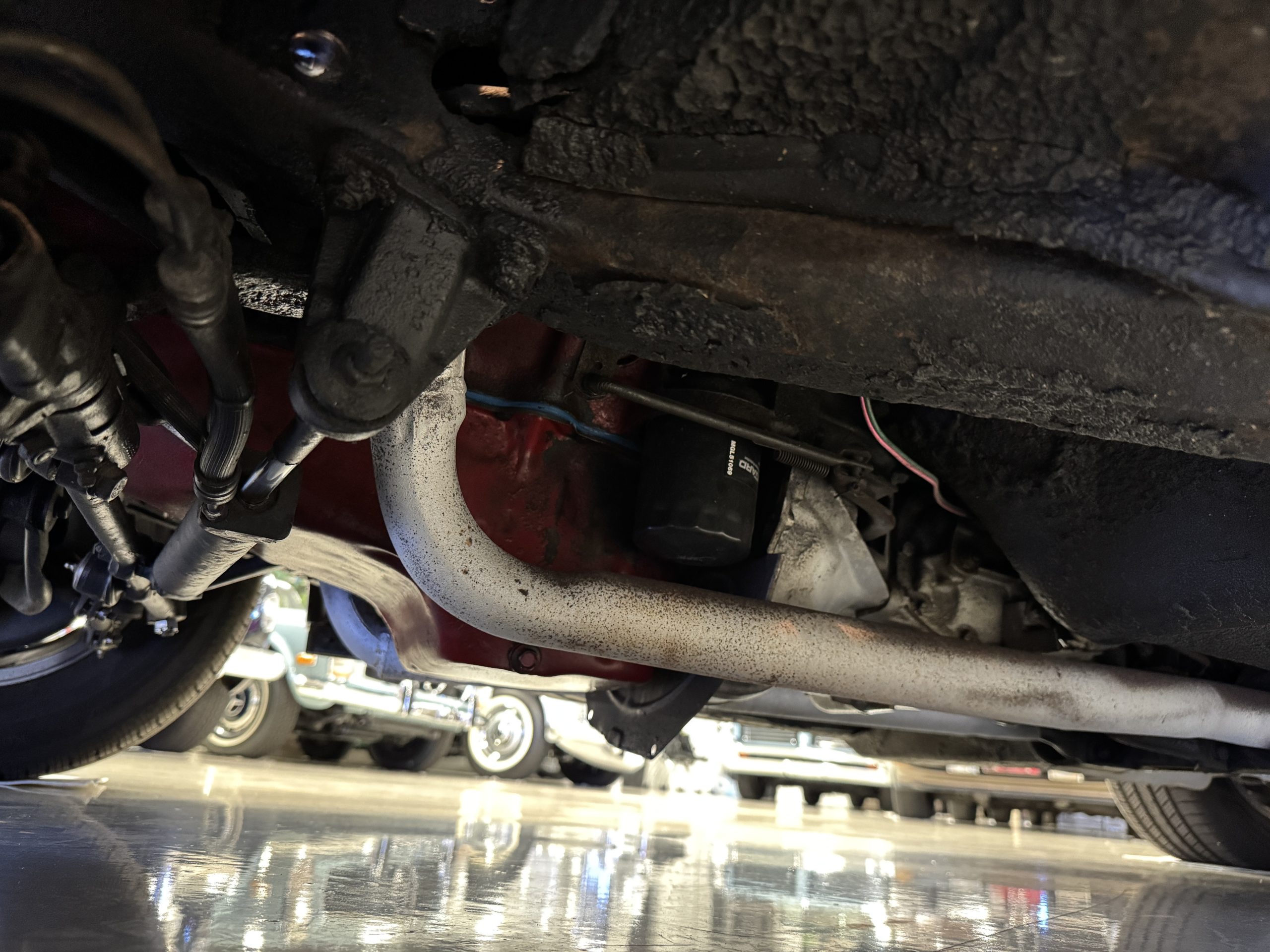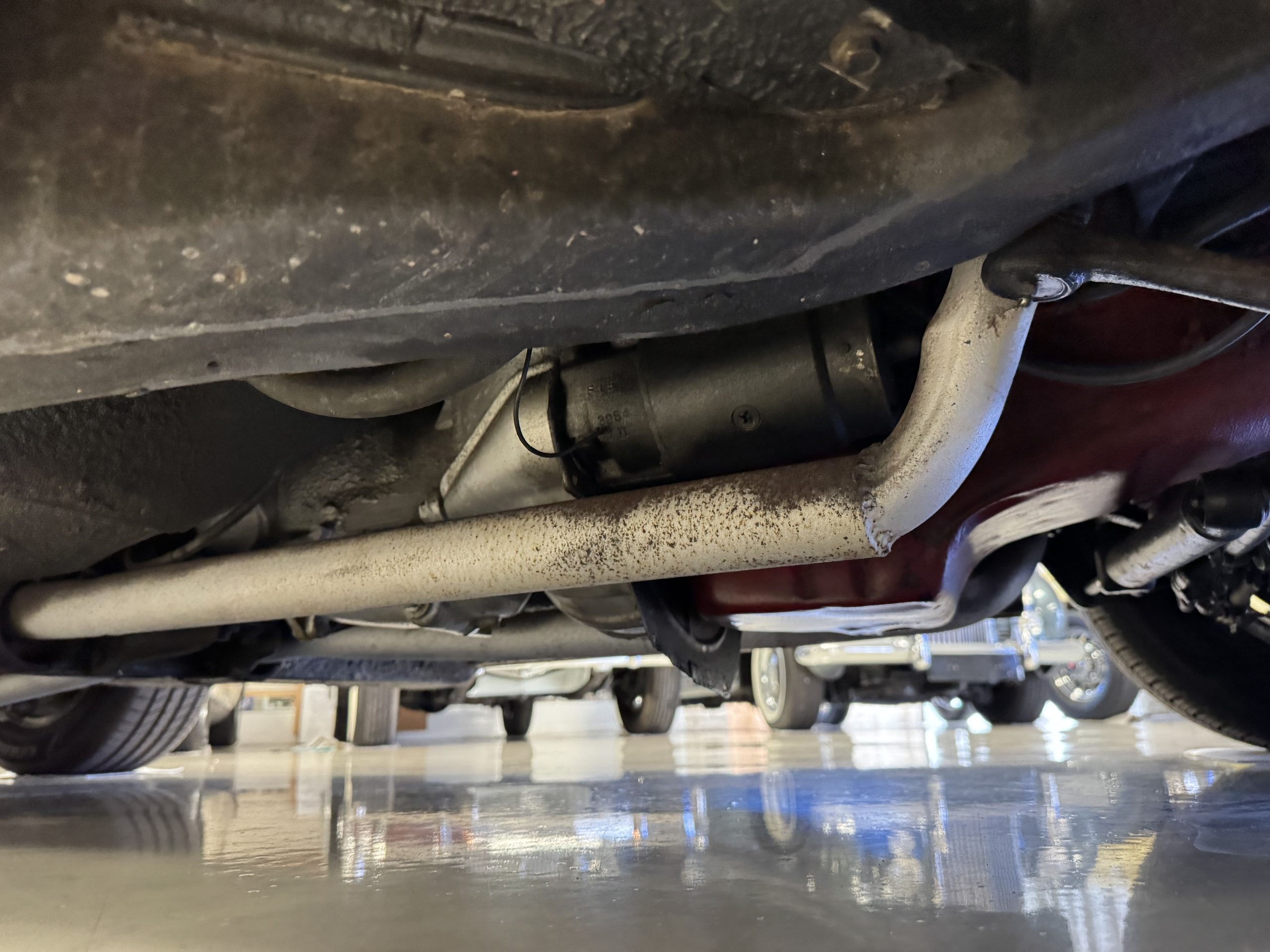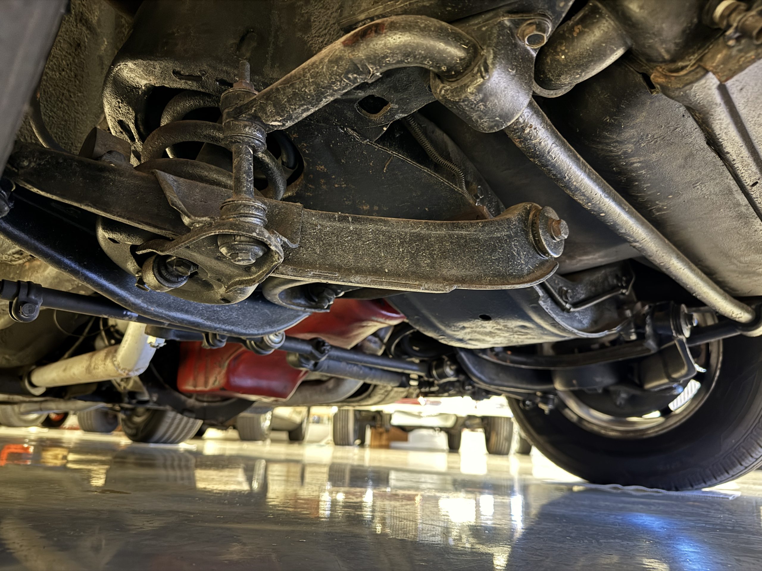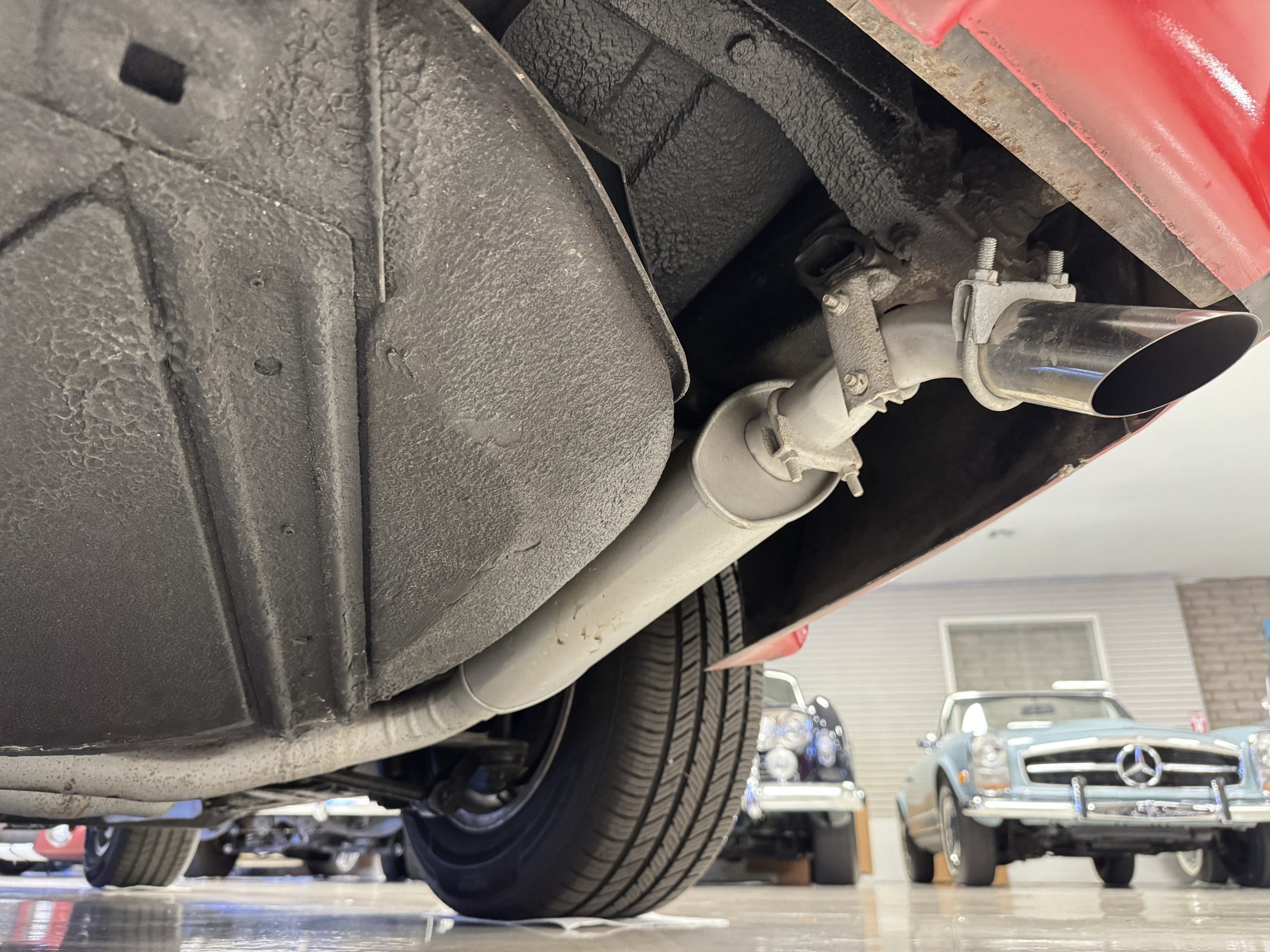 The fiberglass body retains the unmistakable C3 profile with long hood, flared fenders, pop-up headlights, straight and removable T-top roof panels. Originally finished in Black Tuxedo, this Corvette has been refinished in Red Medium which is in good overall condition. There are small paint bubbles, chips, and minor imperfections concentrated toward the front end. Body panels remain in very good overall condition, and the upgraded 15-inch aluminum wheels provide both a visual and weight-saving improvement over stock, wrapped in Hankook Kinergy 245/60R15 tires in very good condition. A rear luggage rack allows convenient T-top storage or additional cargo capacity, and 1977 marks the final year of the distinctive “sugar scoop” rear window design.