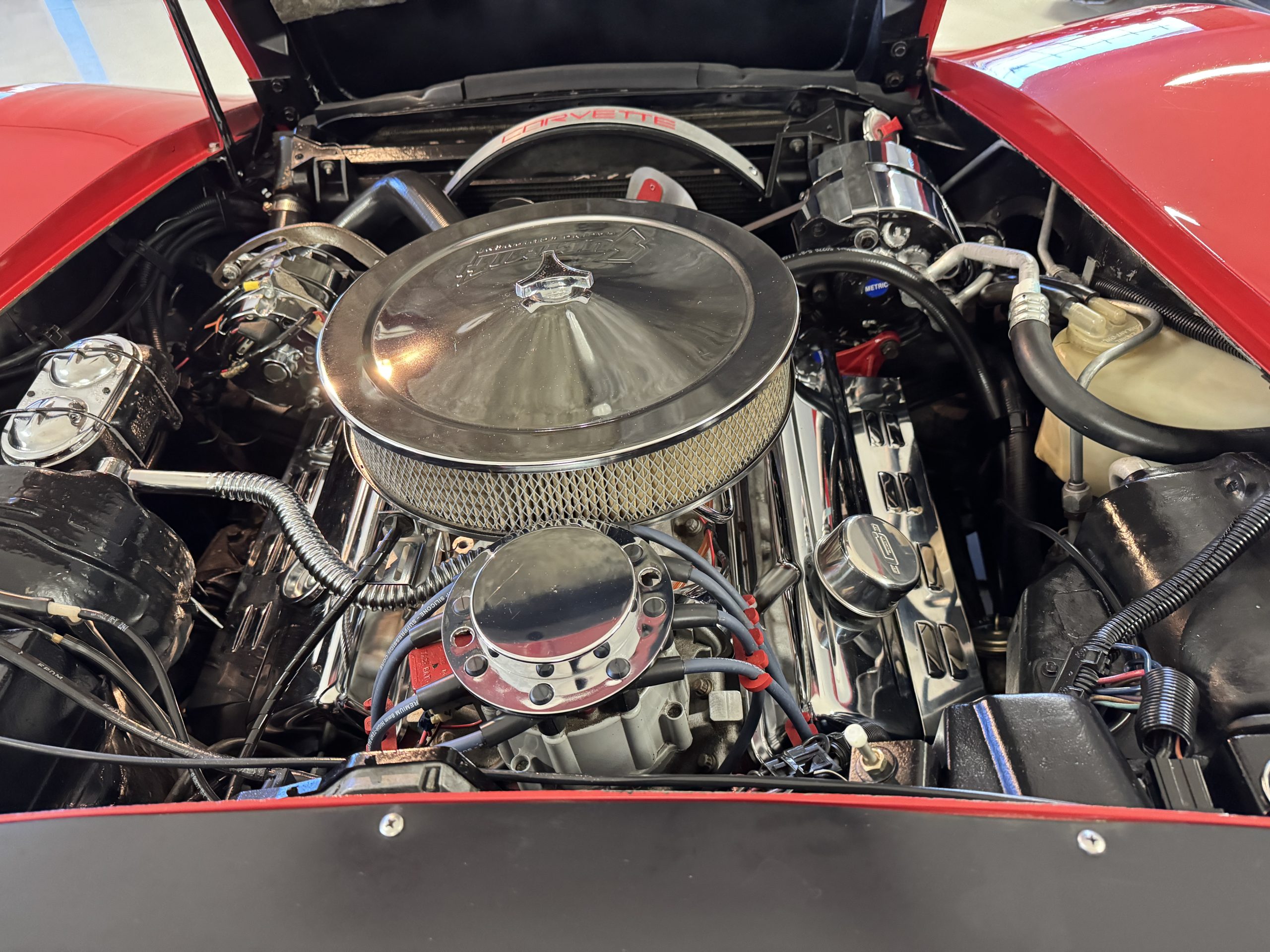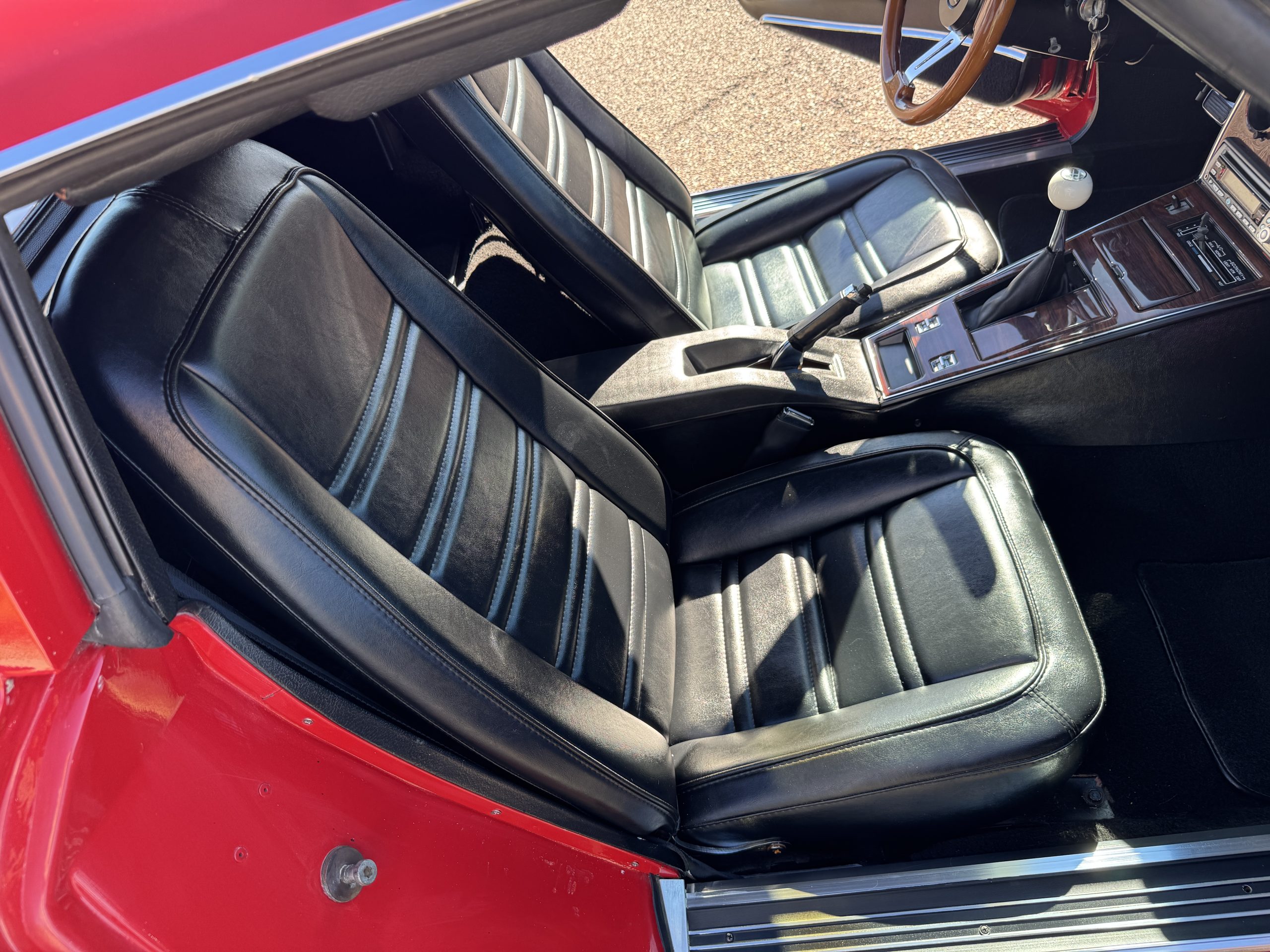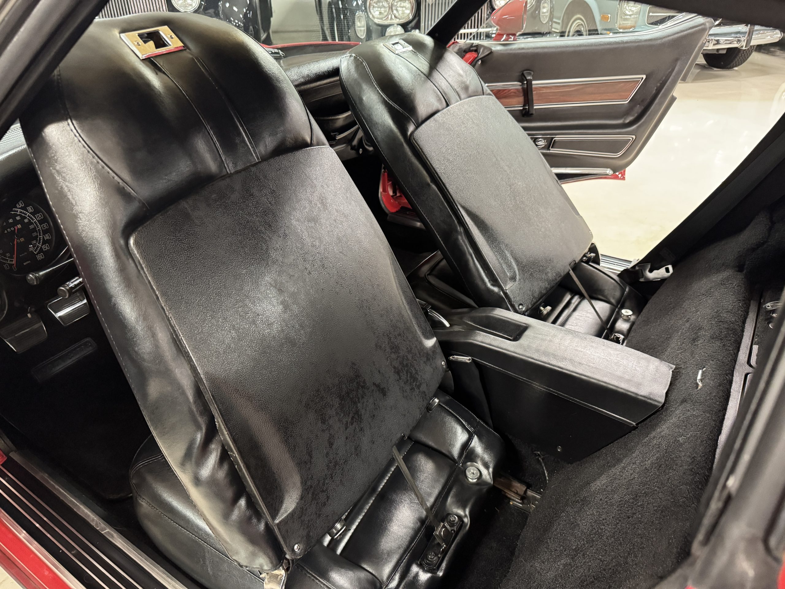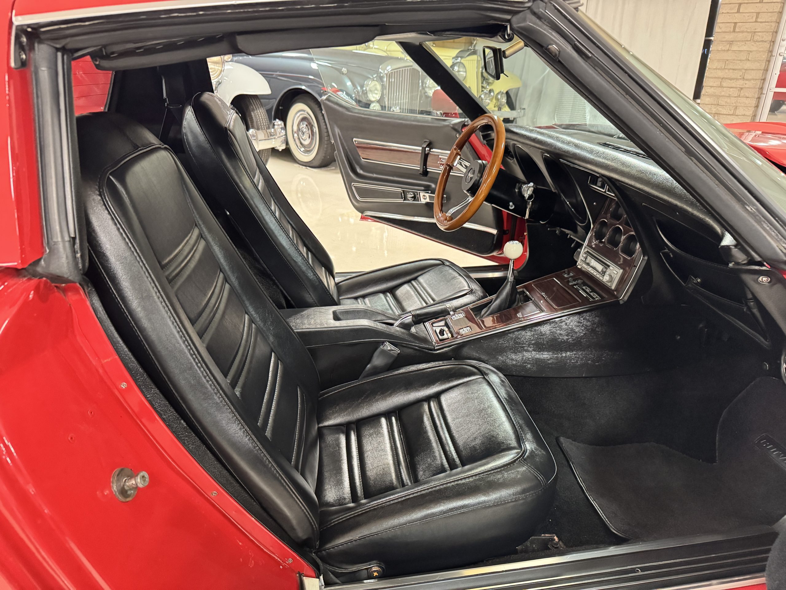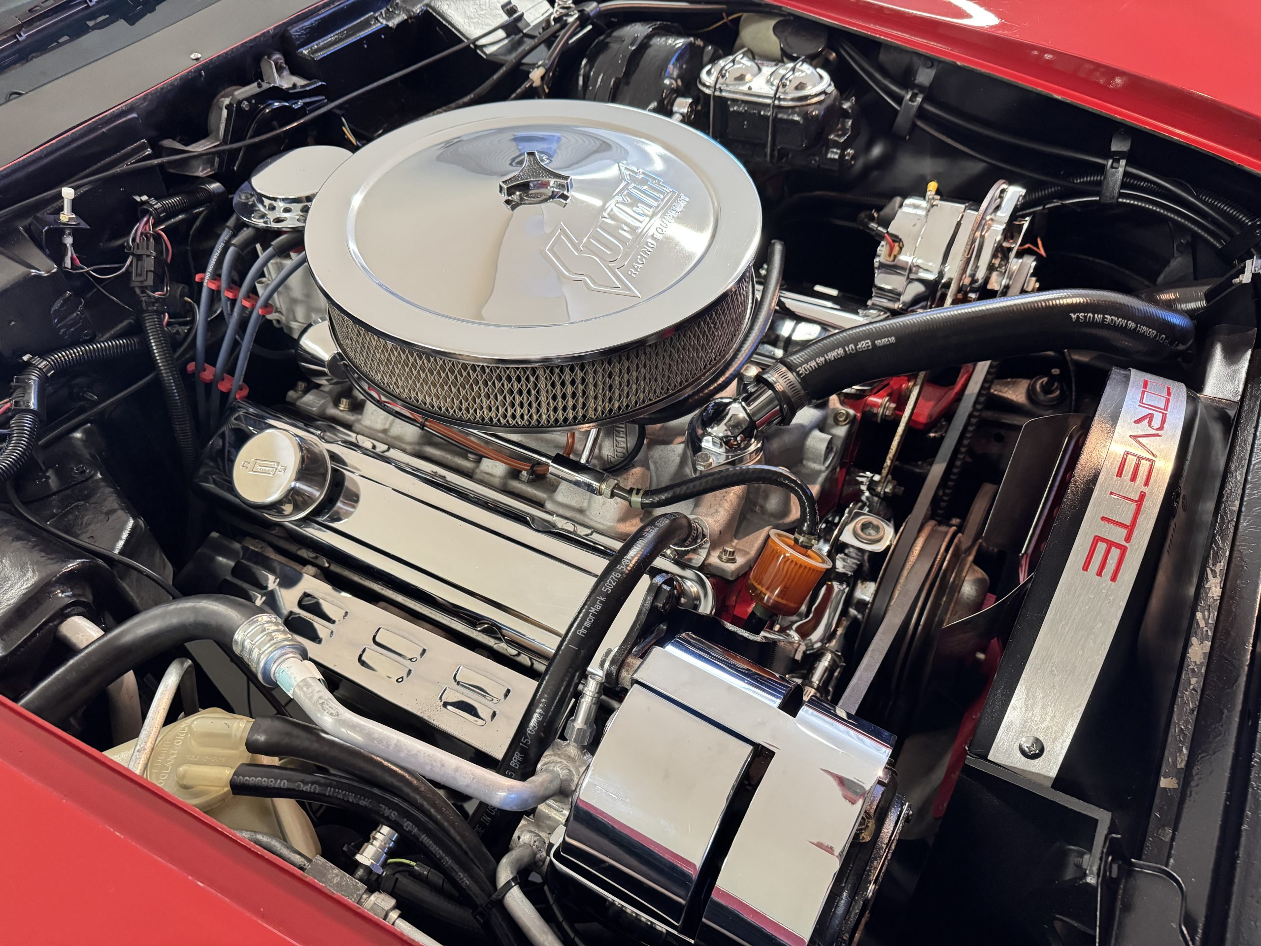 Power comes from the optional L82 350 cubic inch V8, producing 210 horsepower and delivers a noticeable step up in performance over the base L48. The engine is paired with a four-speed manual transmission, engaging through the shorter center-console shifter introduced for improved ergonomics. Key performance attributes for the L82 include four-bolt-main construction, four-barrel carburetor, and higher compression ratio. Dual exhaust provides the unmistakable small-block V8 sound, while independent suspension, power steering, and four-wheel power disc brakes deliver balanced handling and confident stopping power. The Corvette retains its factory safety features, including energy-absorbing steering column and dual seat and shoulder belts, rounding out an enjoyable C3 Corvette package.