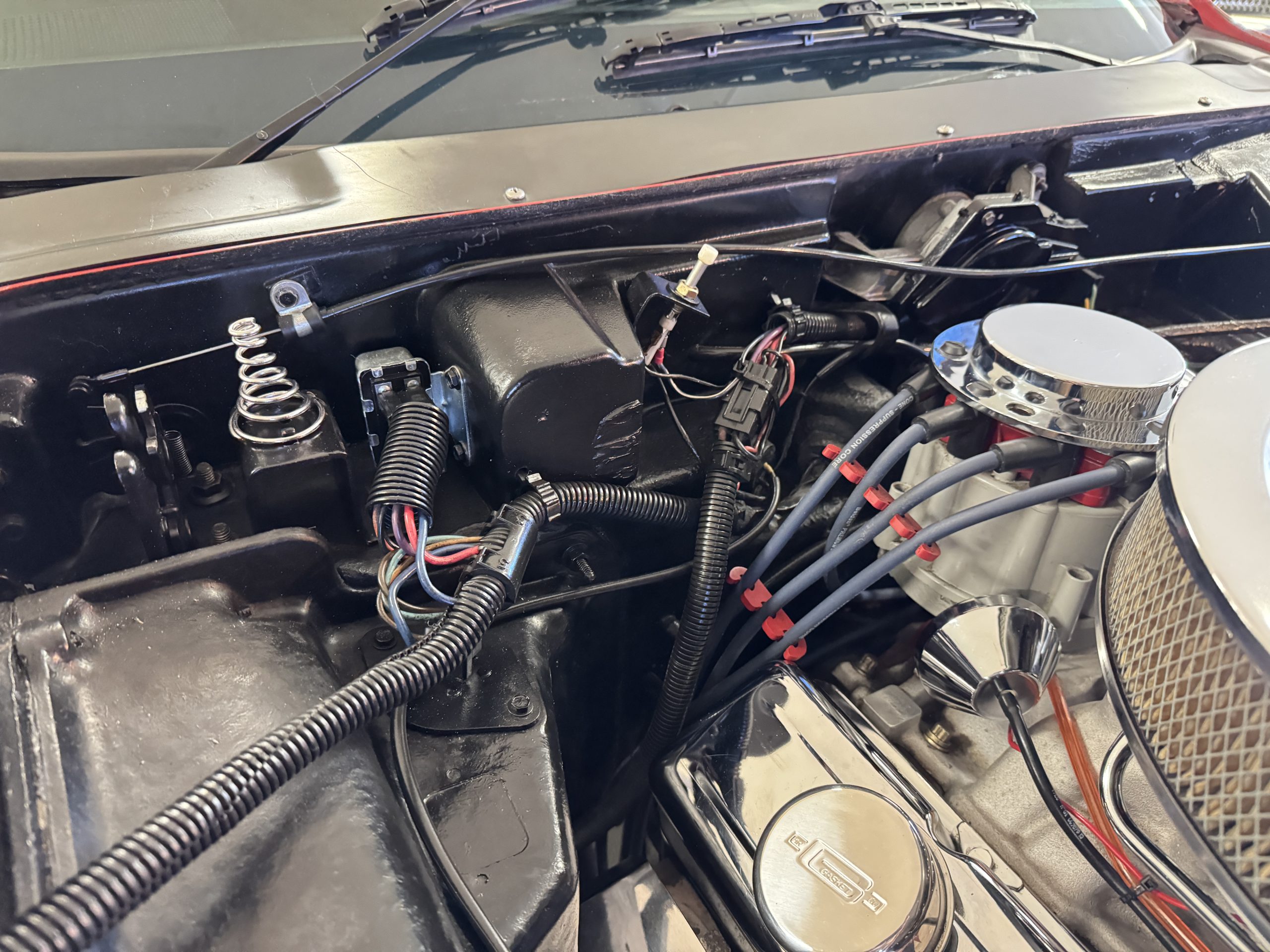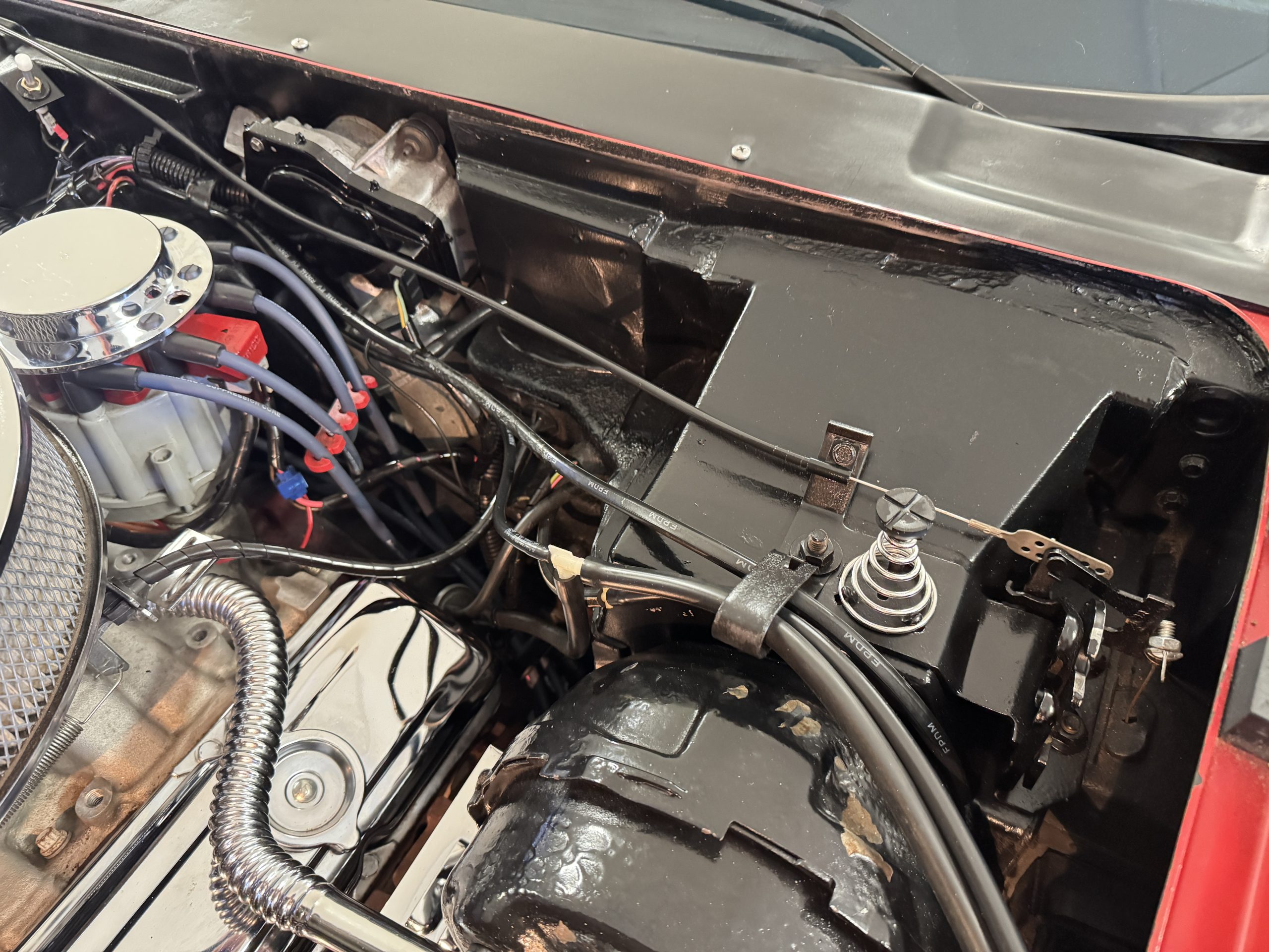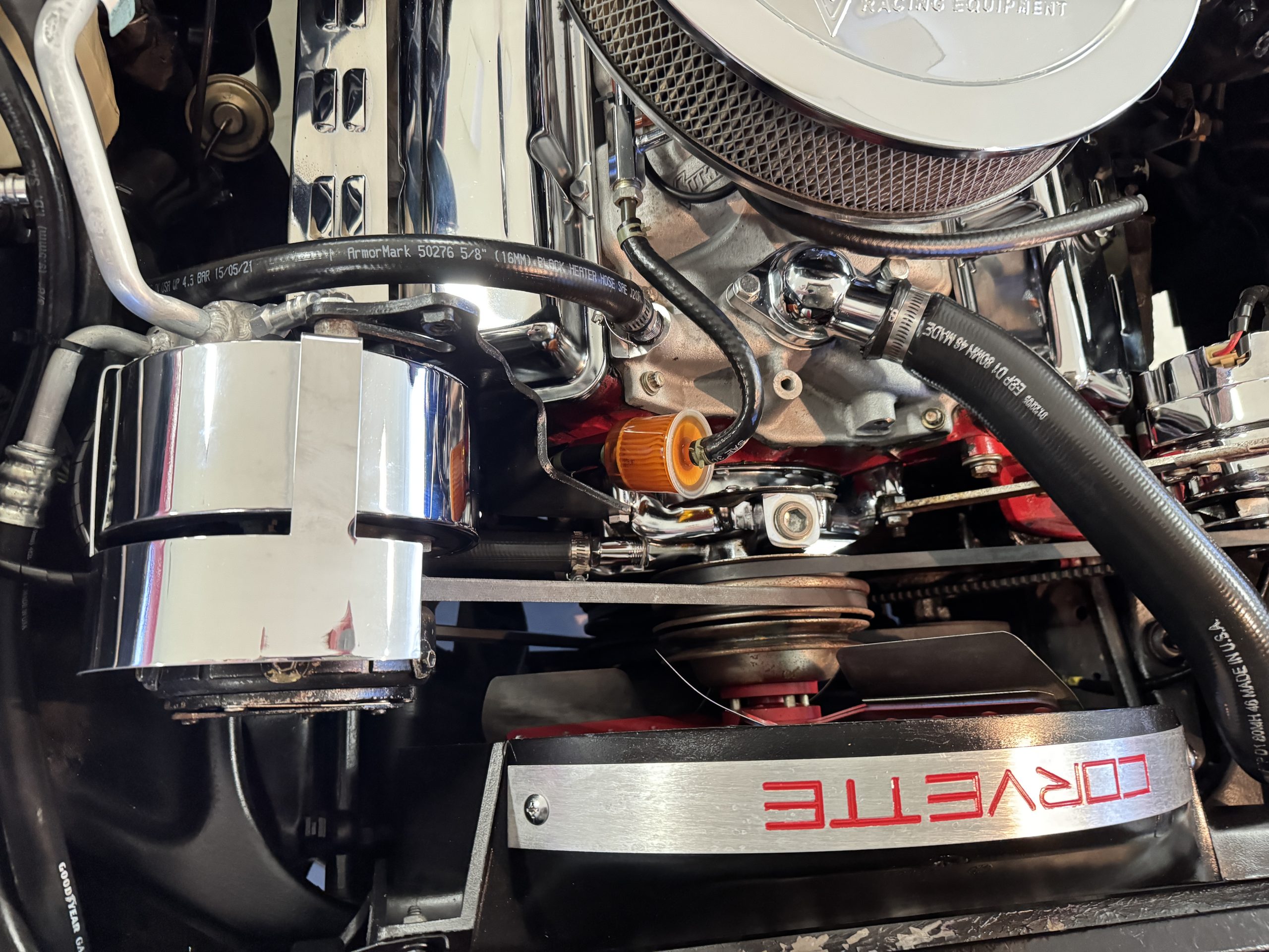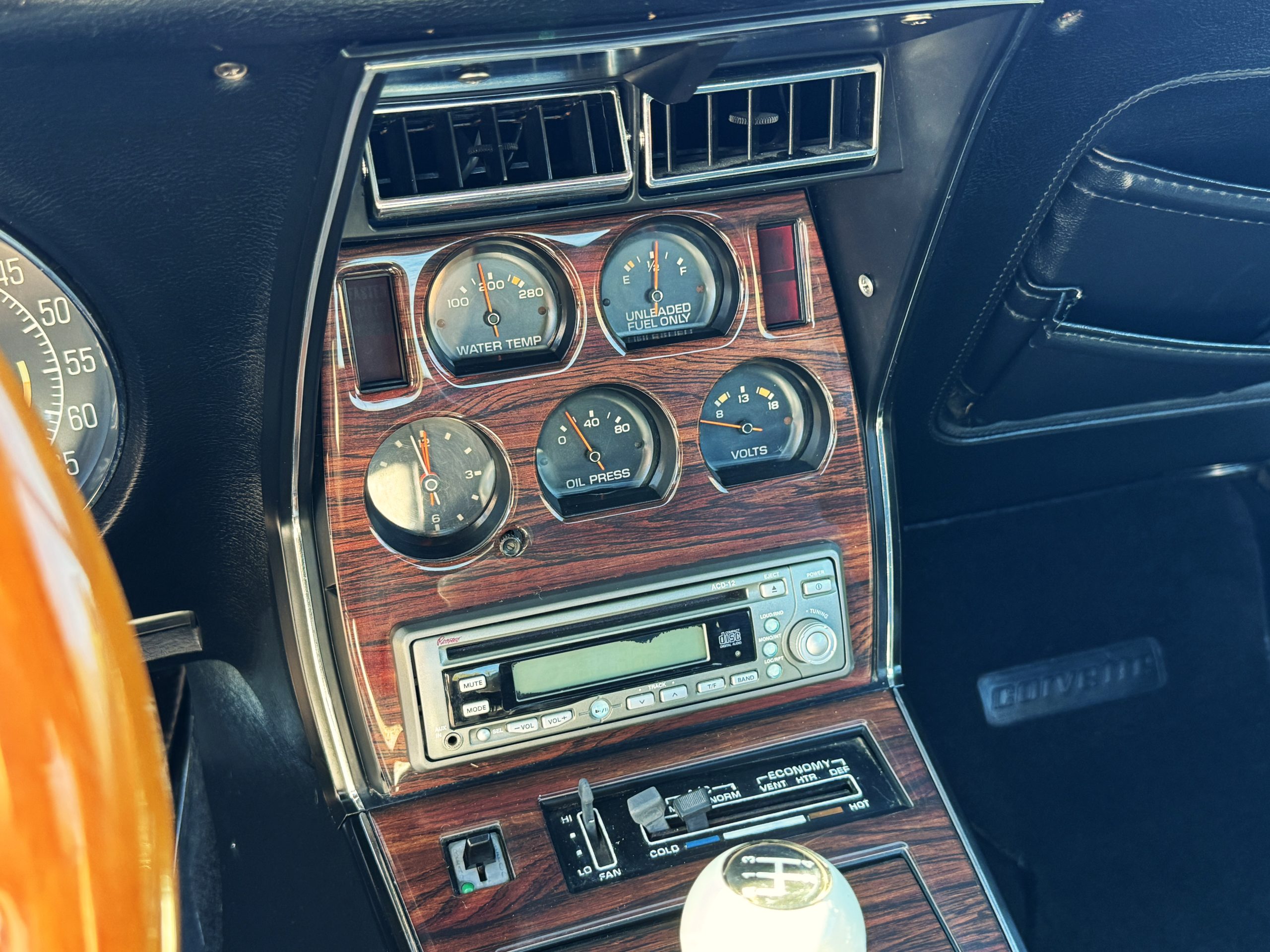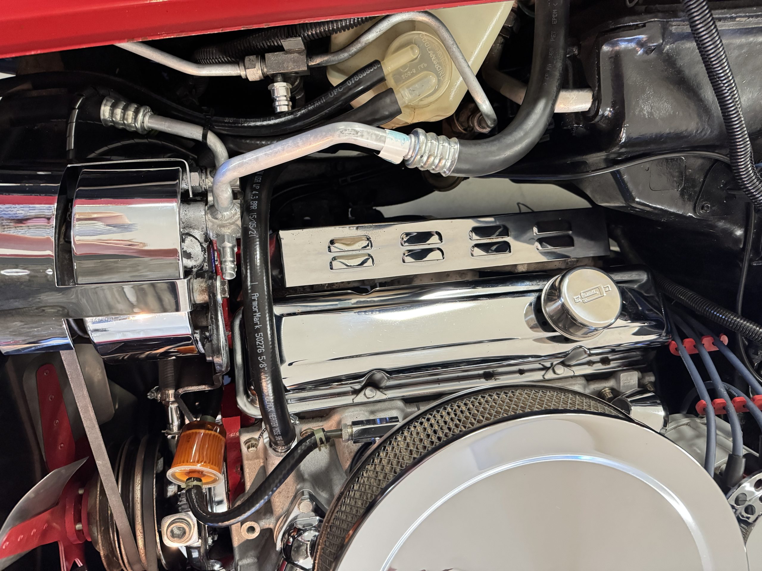 Power comes from the optional L82 350 cubic inch V8, producing 210 horsepower and delivers a noticeable step up in performance over the base L48. The engine is paired with a four-speed manual transmission, engaging through the shorter center-console shifter introduced for improved ergonomics. Key performance attributes for the L82 include four-bolt-main construction, four-barrel carburetor, and higher compression ratio. Dual exhaust provides the unmistakable small-block V8 sound, while independent suspension, power steering, and four-wheel power disc brakes deliver balanced handling and confident stopping power. The Corvette retains its factory safety features, including energy-absorbing steering column and dual seat and shoulder belts, rounding out an enjoyable C3 Corvette package.