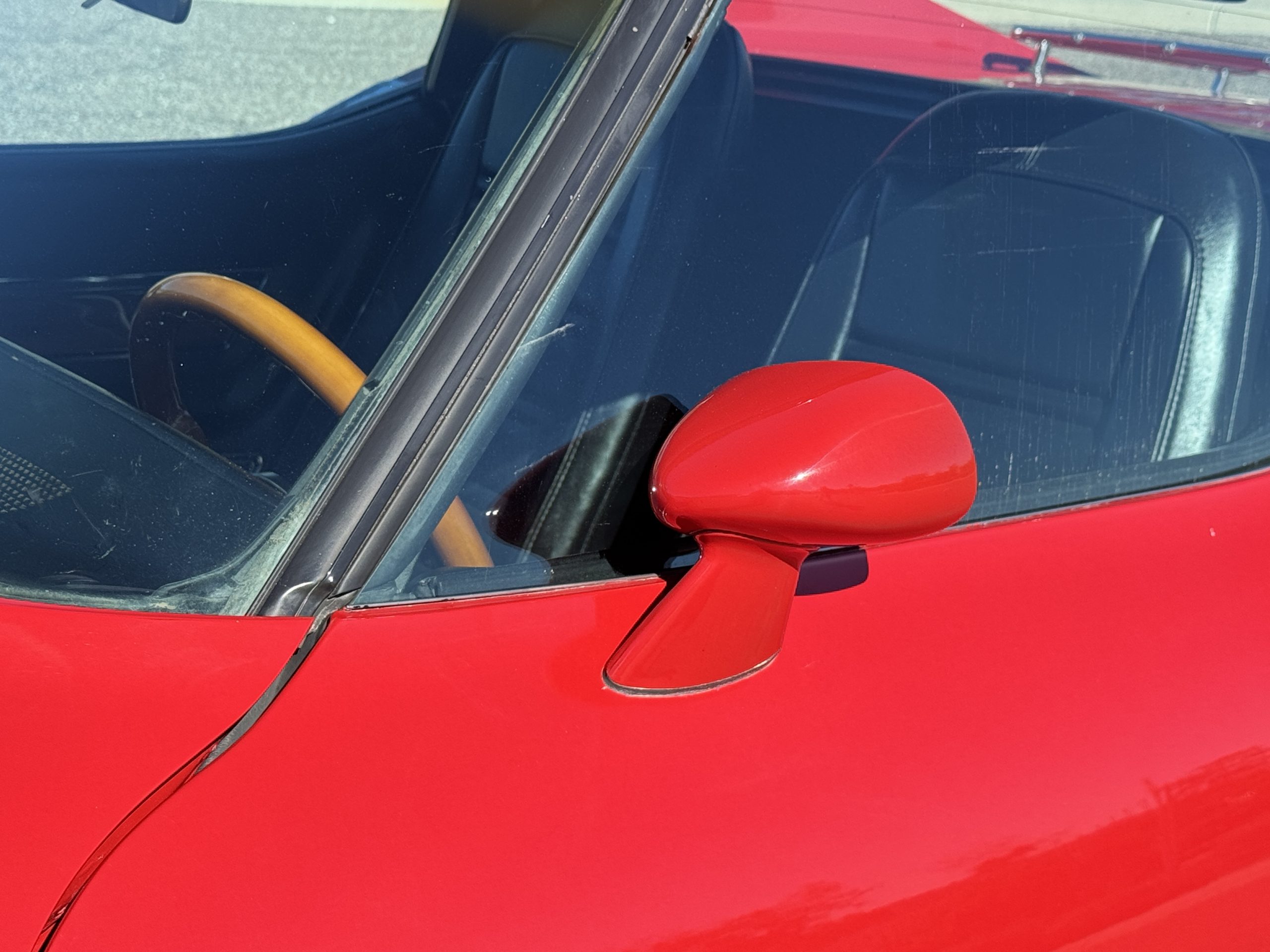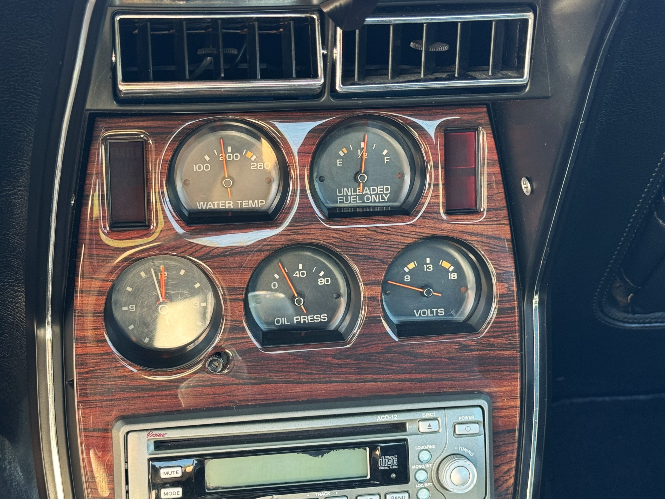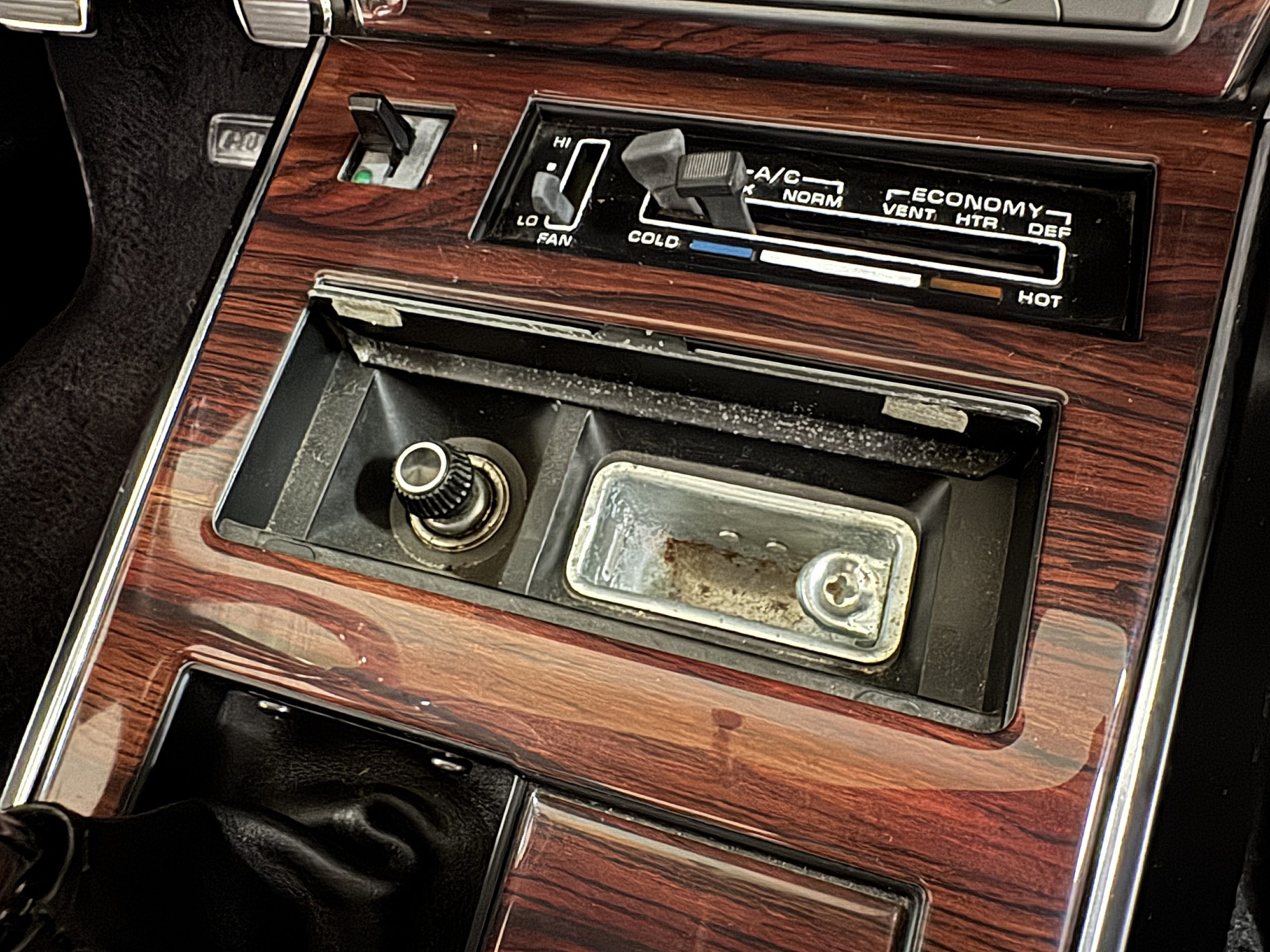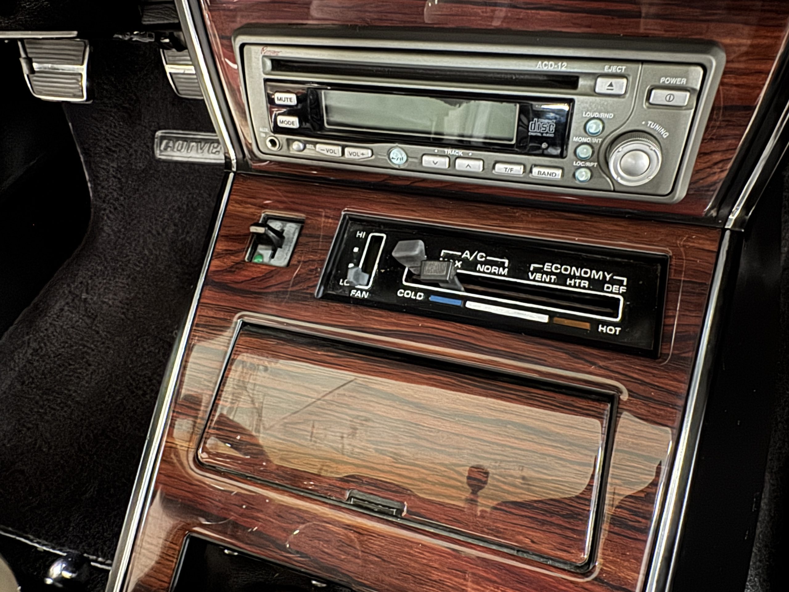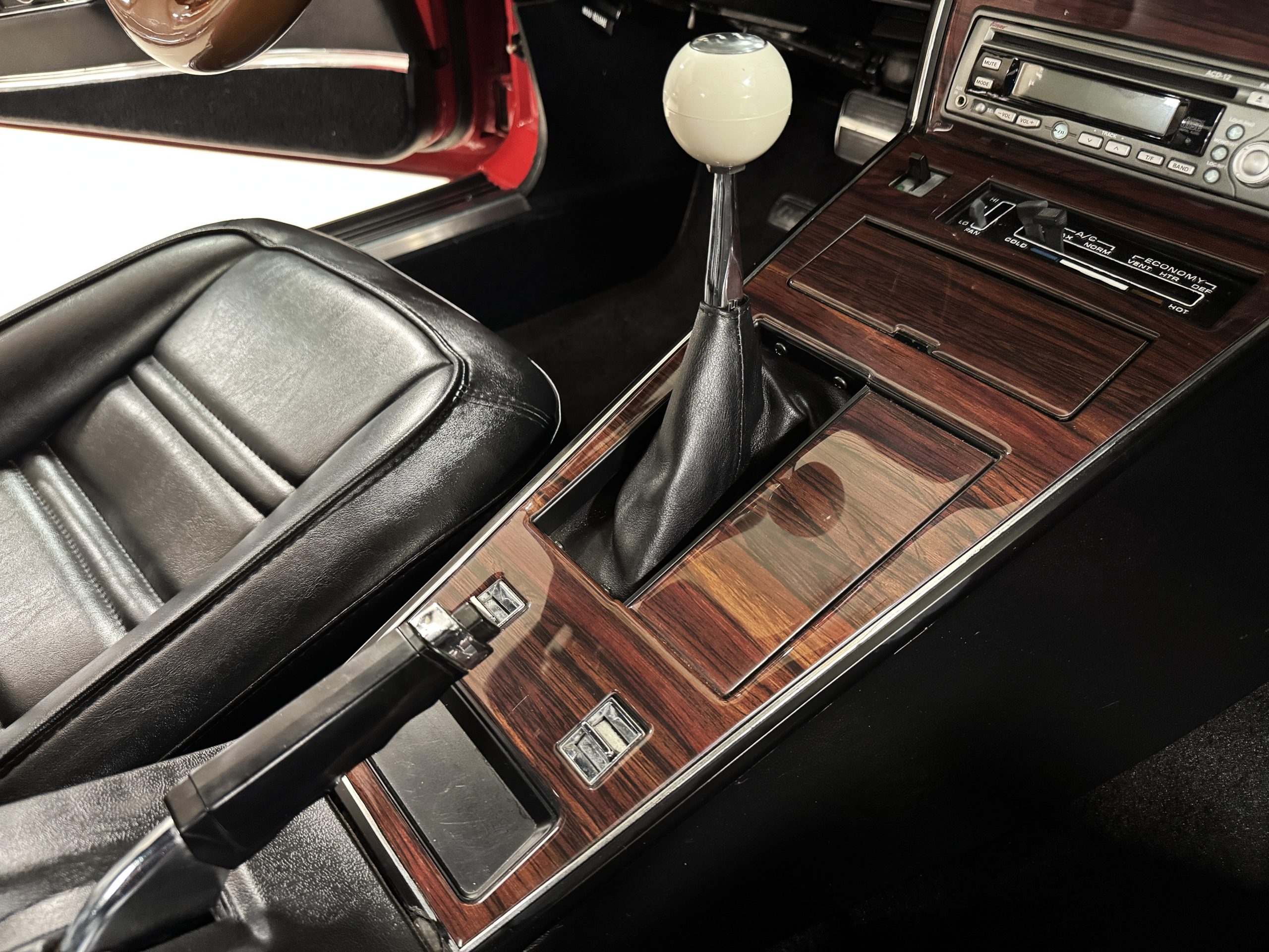 The interior features black leather bucket seats that are in excellent condition. Black cut-pile carpeting presents well, and the woodgrain center console houses a full complement of working gauges with a tilt-telescopic three-spoke steering wheel. Power windows, heat, and air conditioning are in working condition, while the upgraded AM/FM/CD radio functions despite an inoperative display.