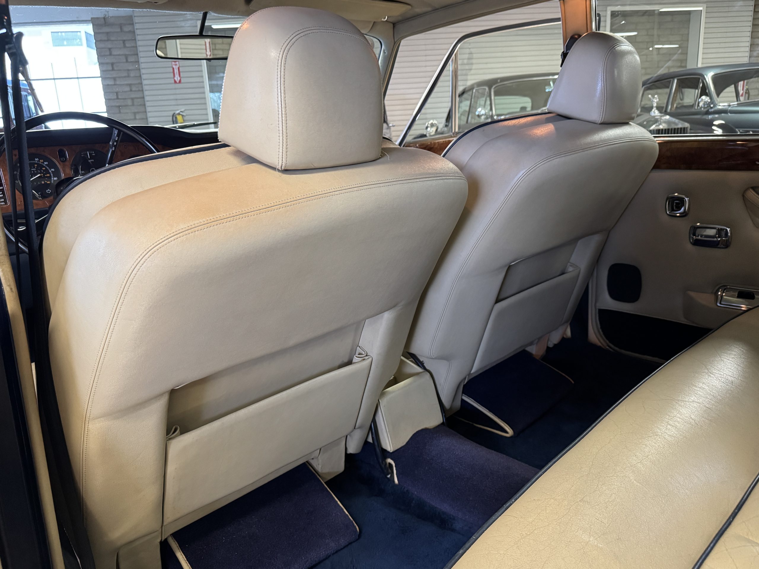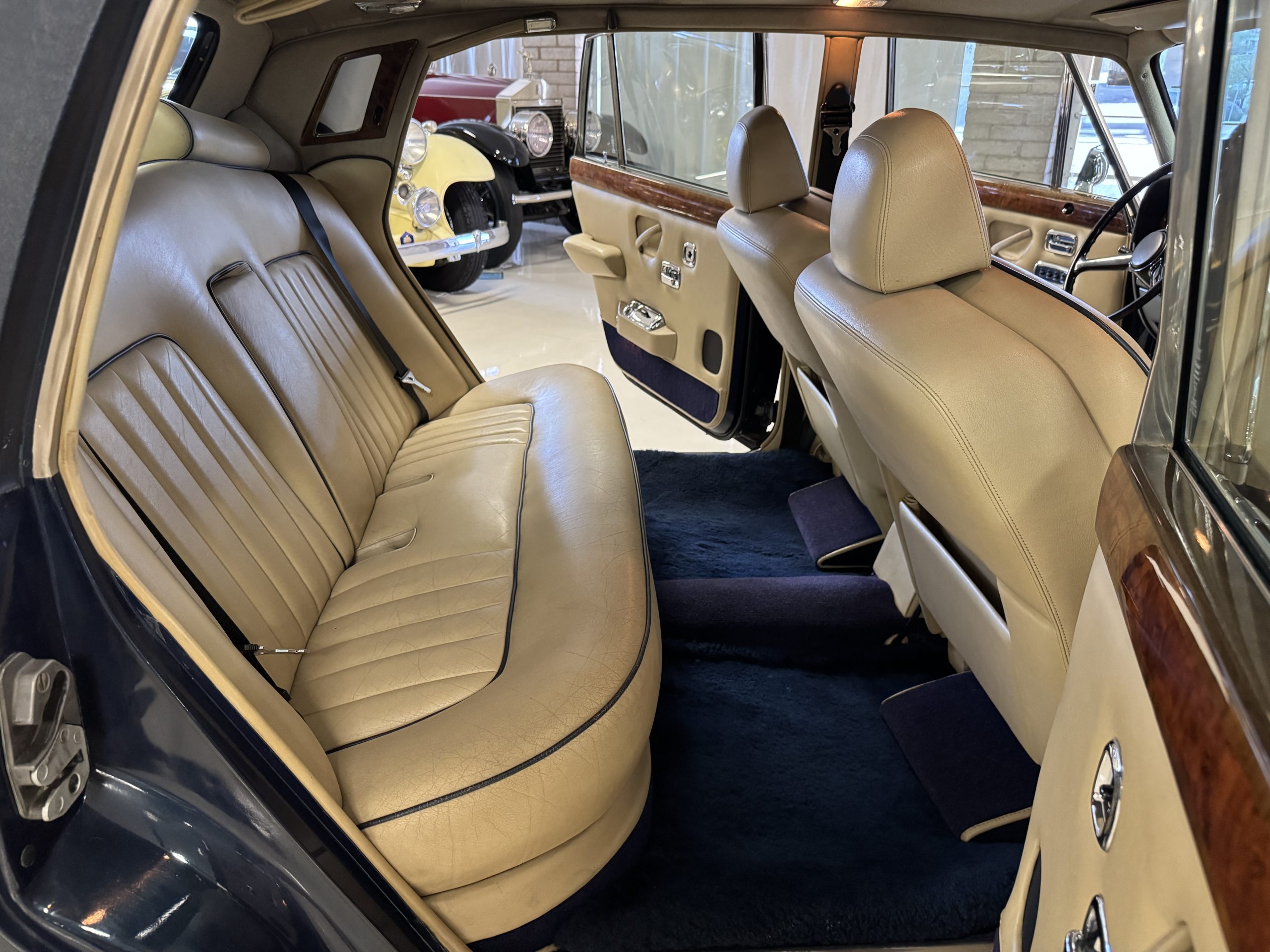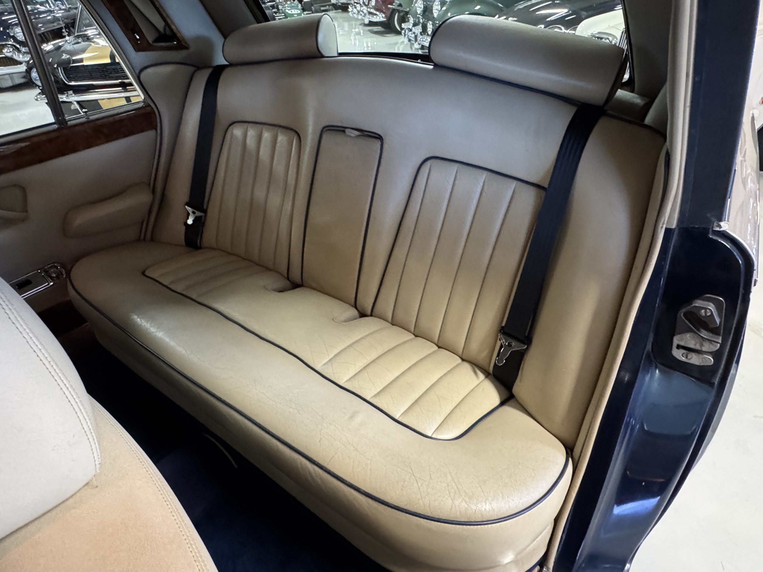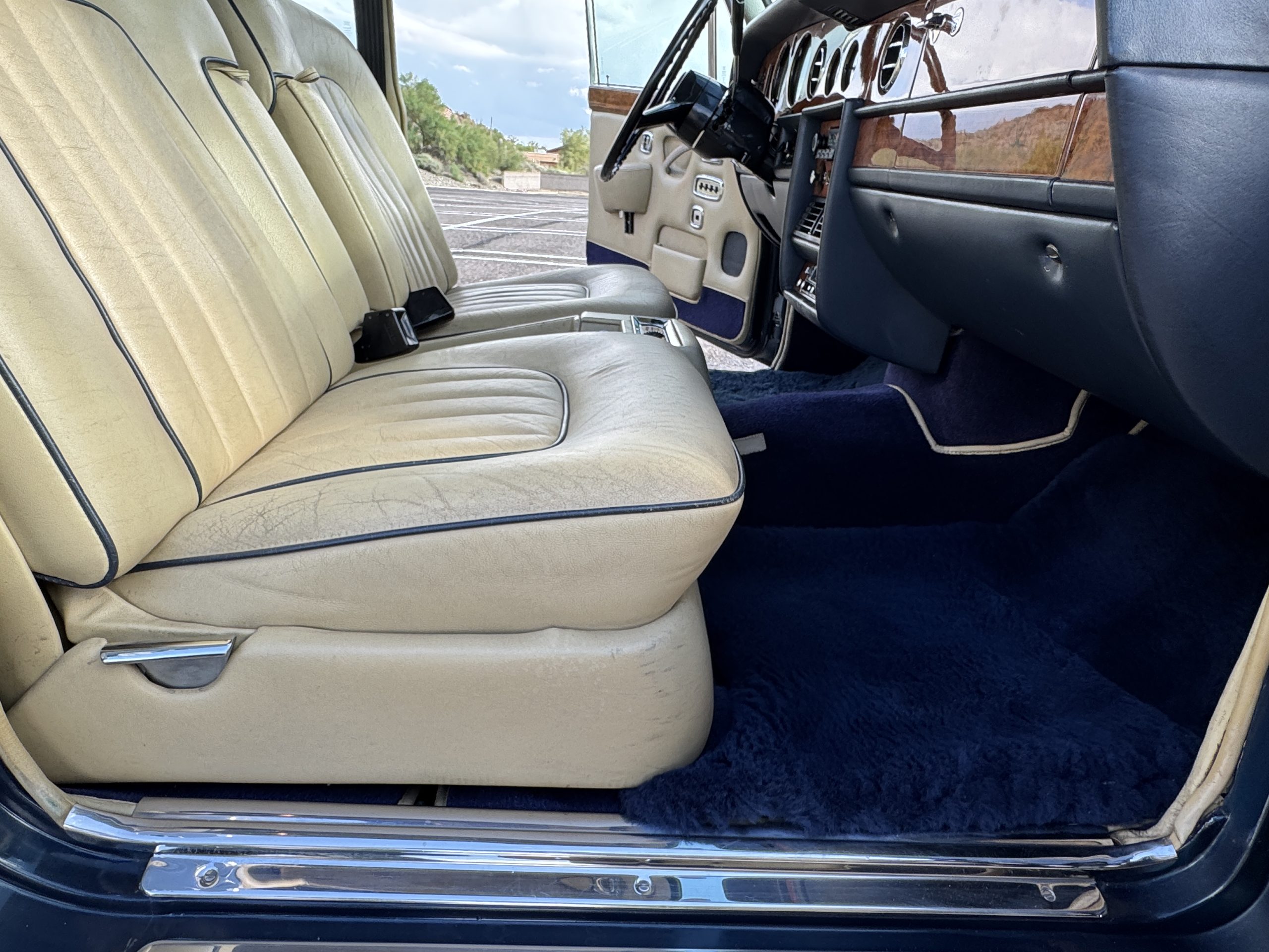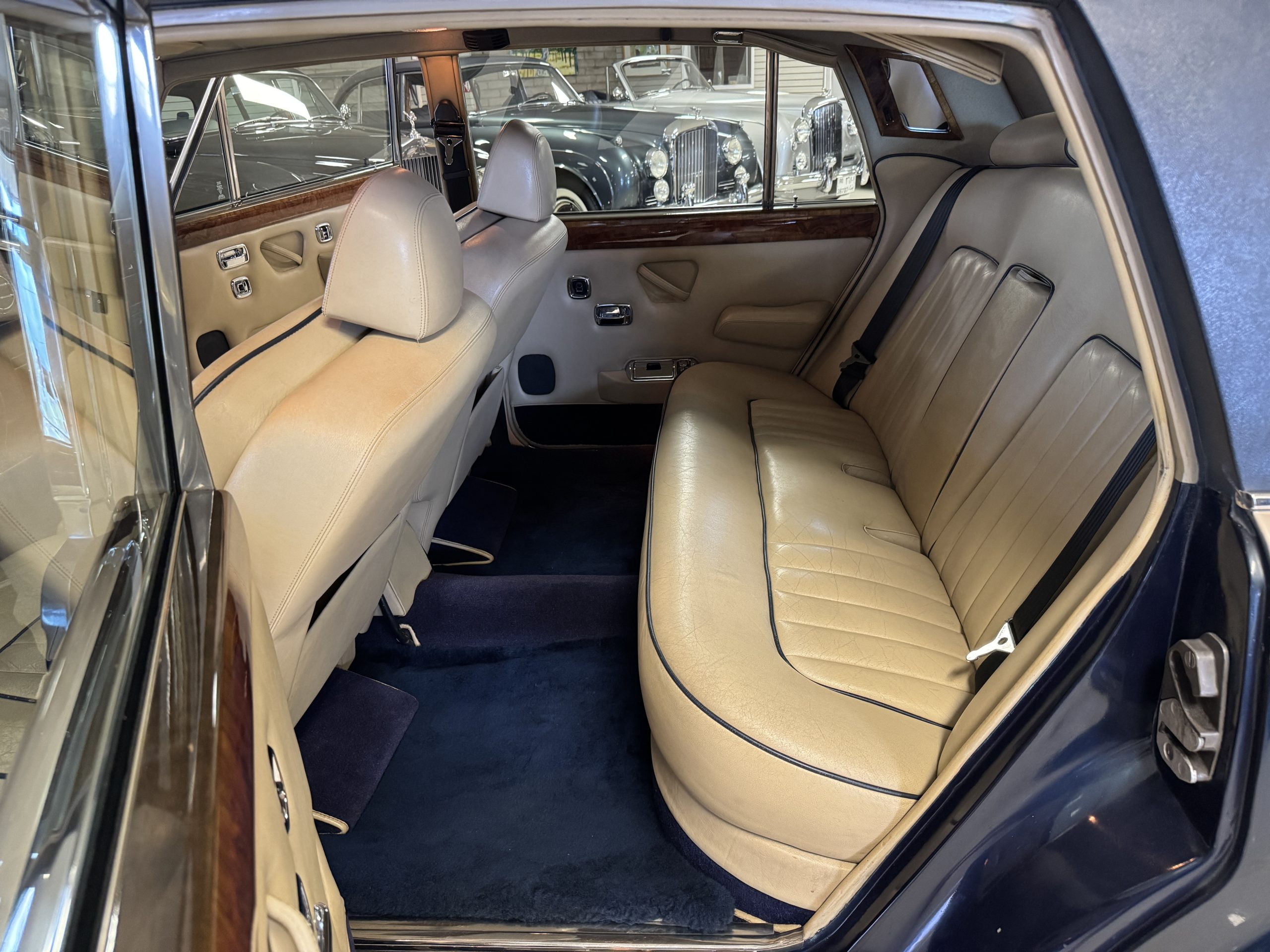 Inside, the Rolls-Royce presents the serene luxury expected of the brand. The cabin features original Beige Connolly hides with Dark Blue piping accents, showing gentle creasing consistent with age, complemented by beautifully preserved rich Lombardy walnut veneers. The Wilton wool carpeting and Dark Blue Mouton lambswool overlays remain in very good condition, reflecting careful ownership. The hides display the rich depth and texture typical of Connolly Vaumol leather with Luxan Grain, a natural, hand-rubbed finish that gives the leather its subtle burnished tones. Soft, supple, and well-preserved, the leather presents with just the slightest, correct patina. Every surface reflects the care of its owners, and the quality craftsmanship Rolls-Royce is known for. Interior amenities include dual-zone automatic climate control with functioning cold air conditioning, a Blaupunkt AM/FM stereo with Pioneer cassette deck, power locks and cruise control. Overall, the interior remains a warm, inviting environment that reflects both craftsmanship and comfort.