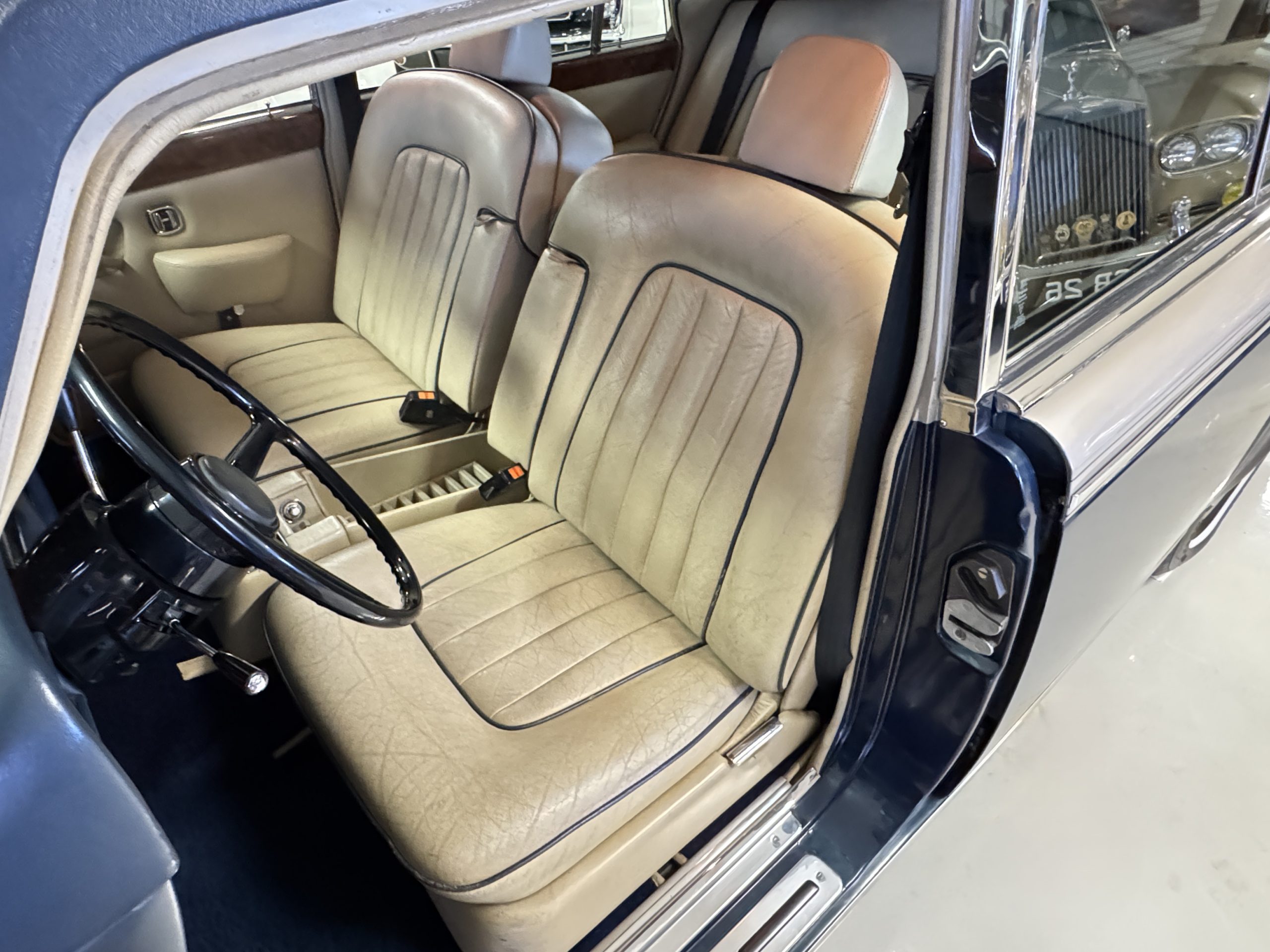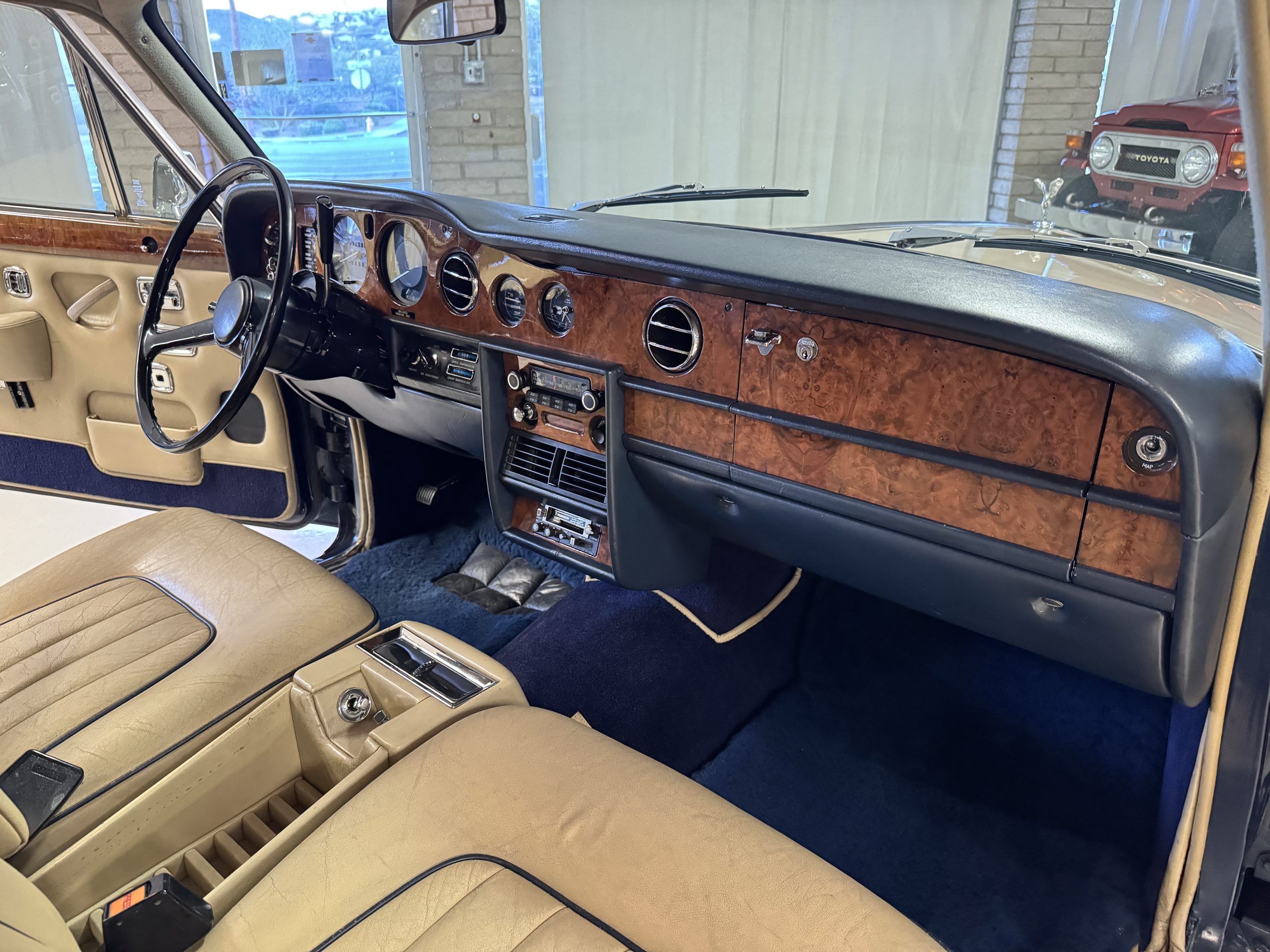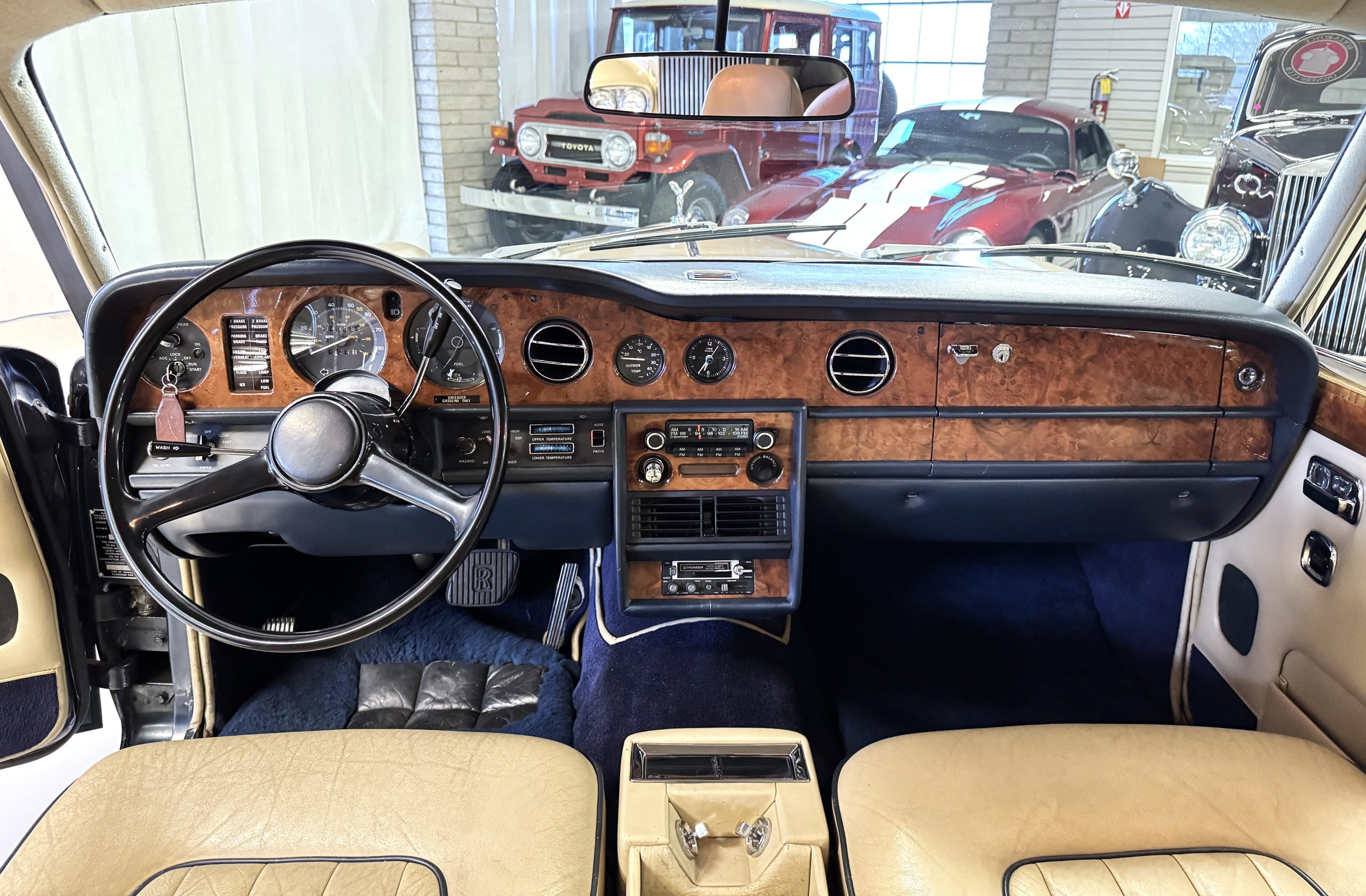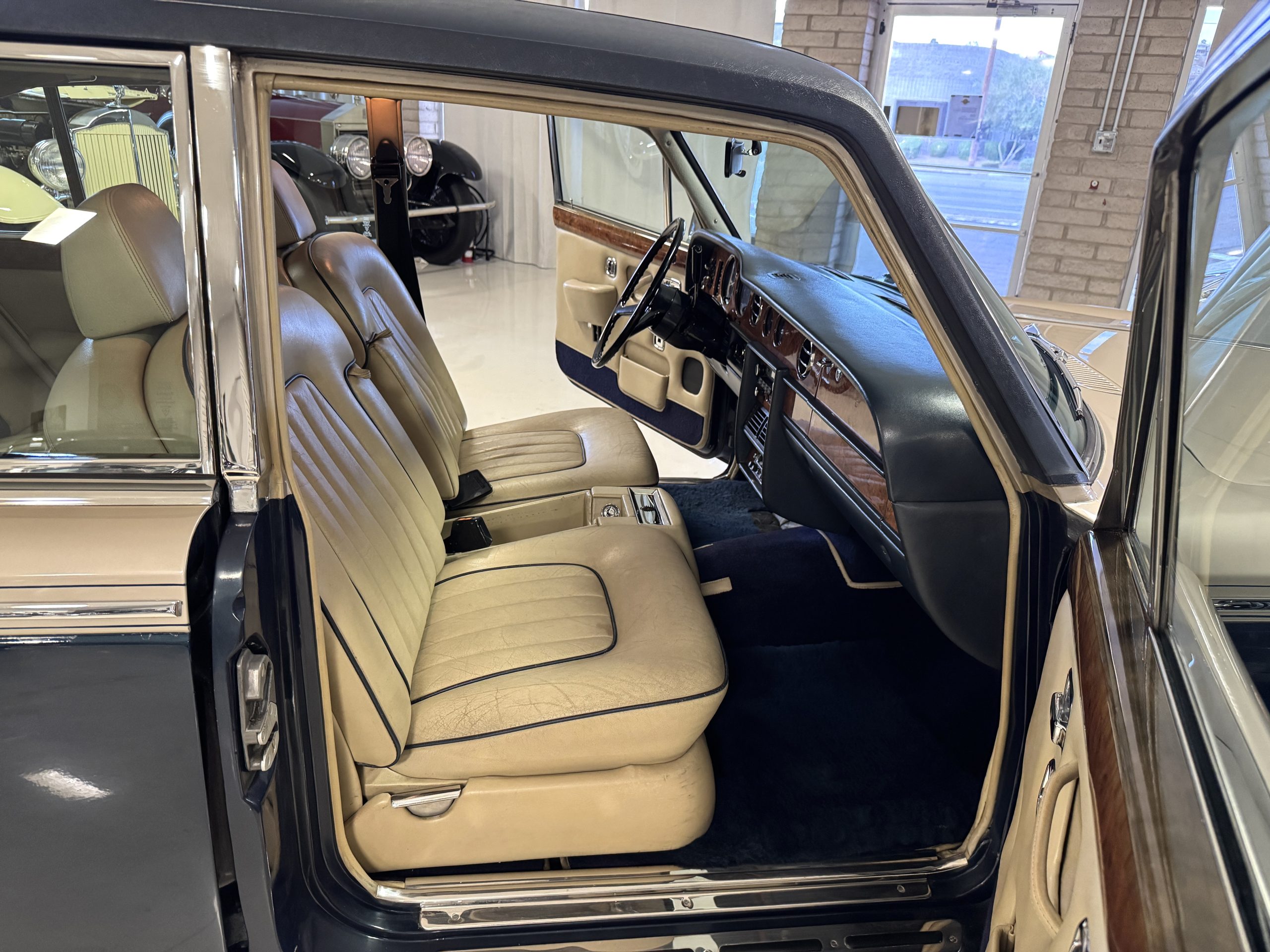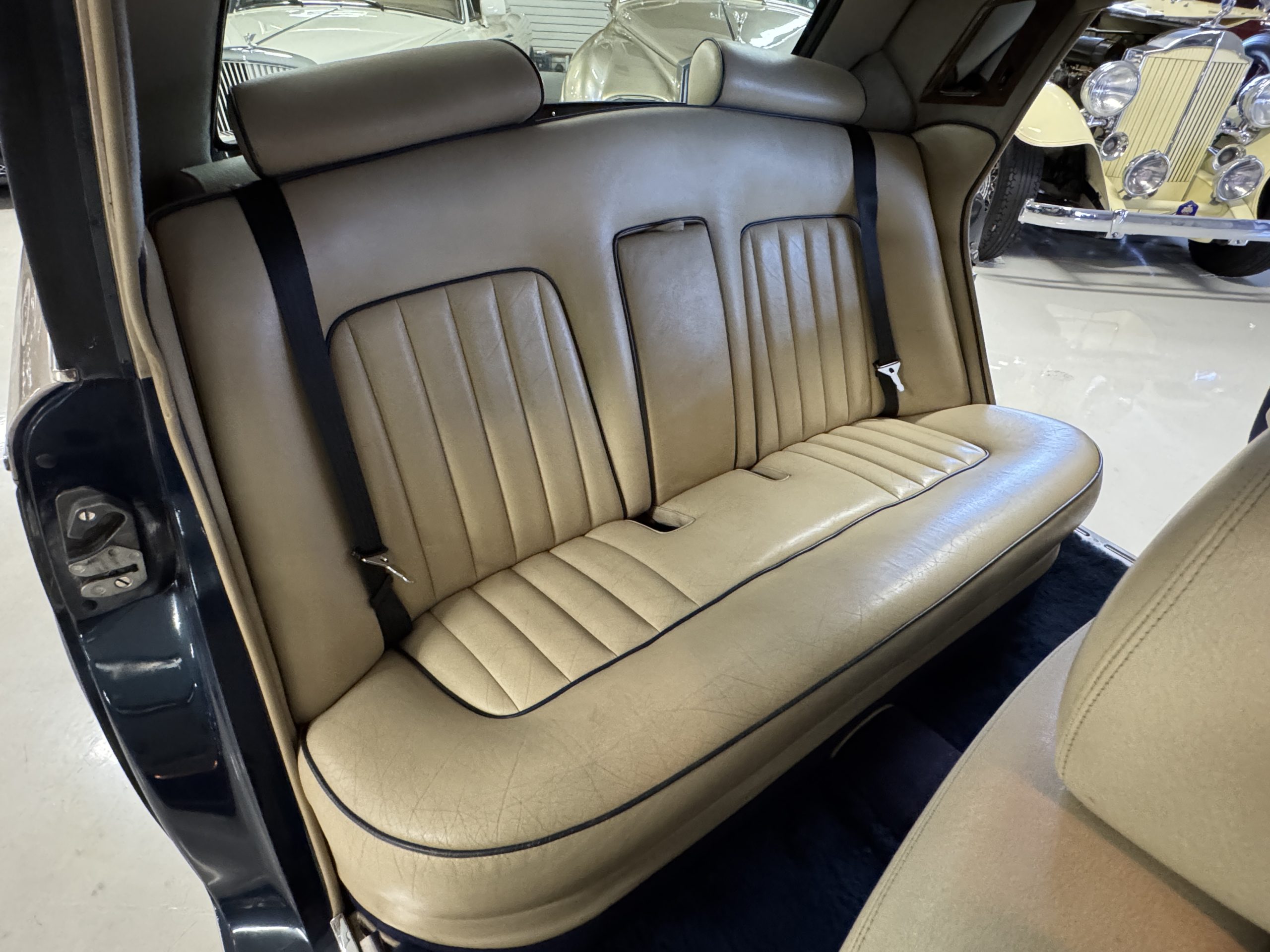 Inside, the Rolls-Royce presents the serene luxury expected of the brand. The cabin features original Beige Connolly hides with Dark Blue piping accents, showing gentle creasing consistent with age, complemented by beautifully preserved rich Lombardy walnut veneers. The Wilton wool carpeting and Dark Blue Mouton lambswool overlays remain in very good condition, reflecting careful ownership. The hides display the rich depth and texture typical of Connolly Vaumol leather with Luxan Grain, a natural, hand-rubbed finish that gives the leather its subtle burnished tones. Soft, supple, and well-preserved, the leather presents with just the slightest, correct patina. Every surface reflects the care of its owners, and the quality craftsmanship Rolls-Royce is known for. Interior amenities include dual-zone automatic climate control with functioning cold air conditioning, a Blaupunkt AM/FM stereo with Pioneer cassette deck, power locks and cruise control. Overall, the interior remains a warm, inviting environment that reflects both craftsmanship and comfort.