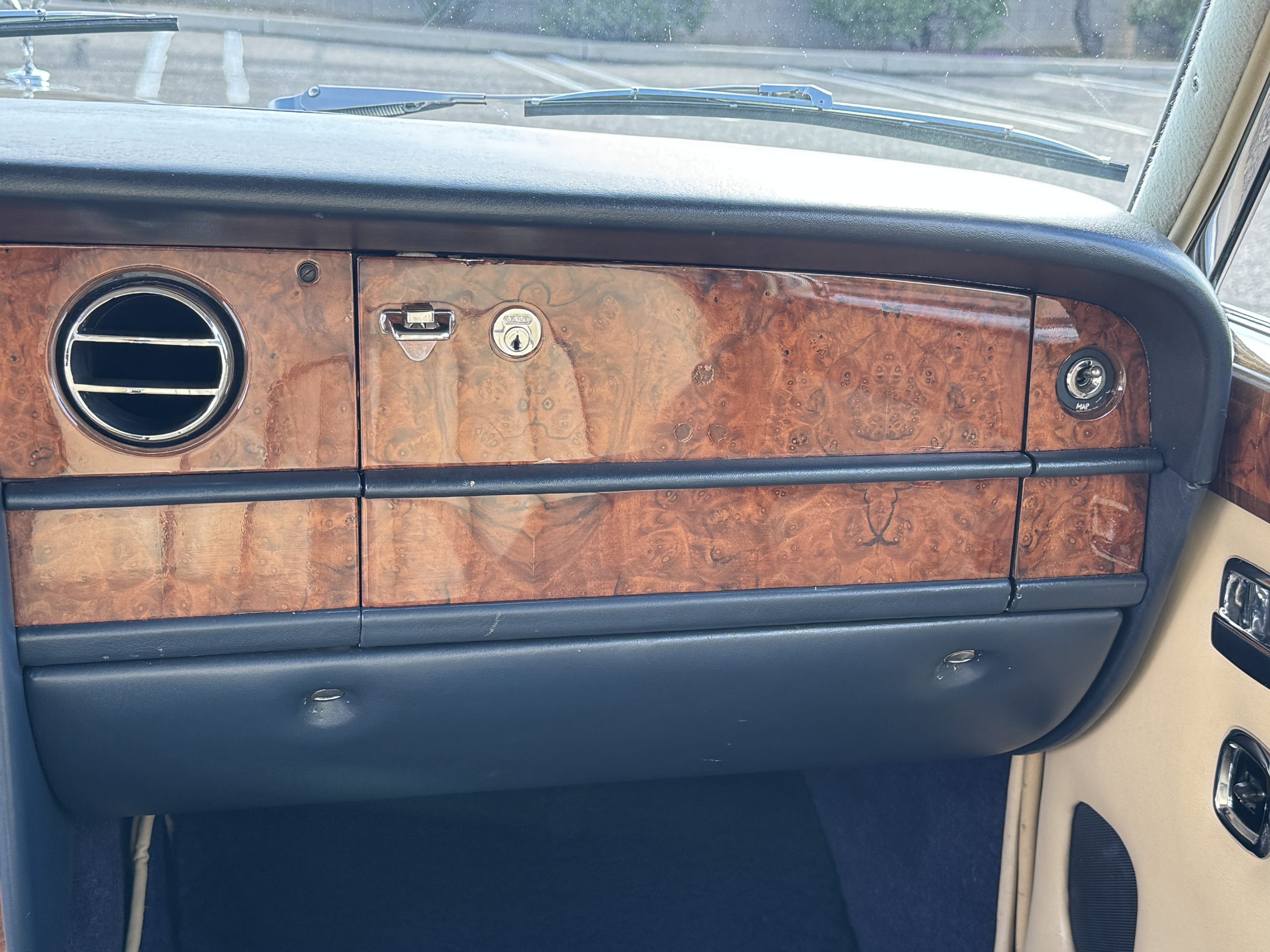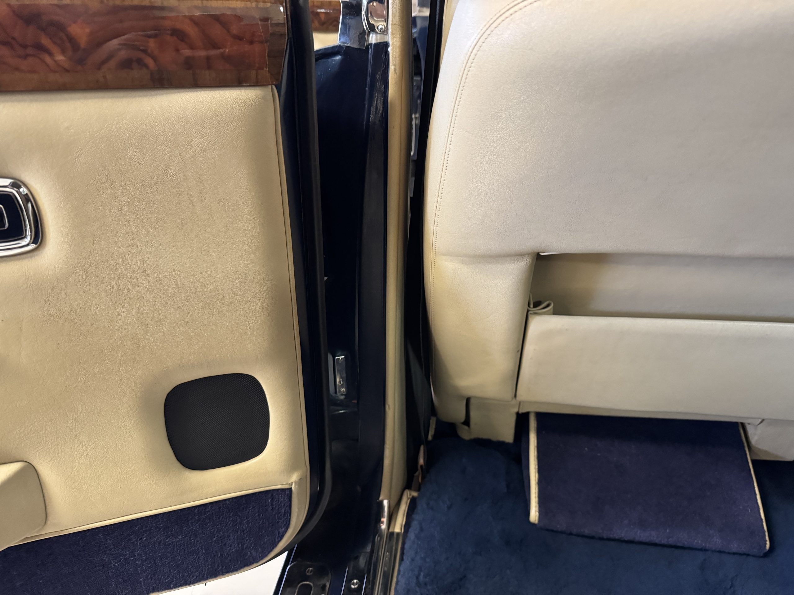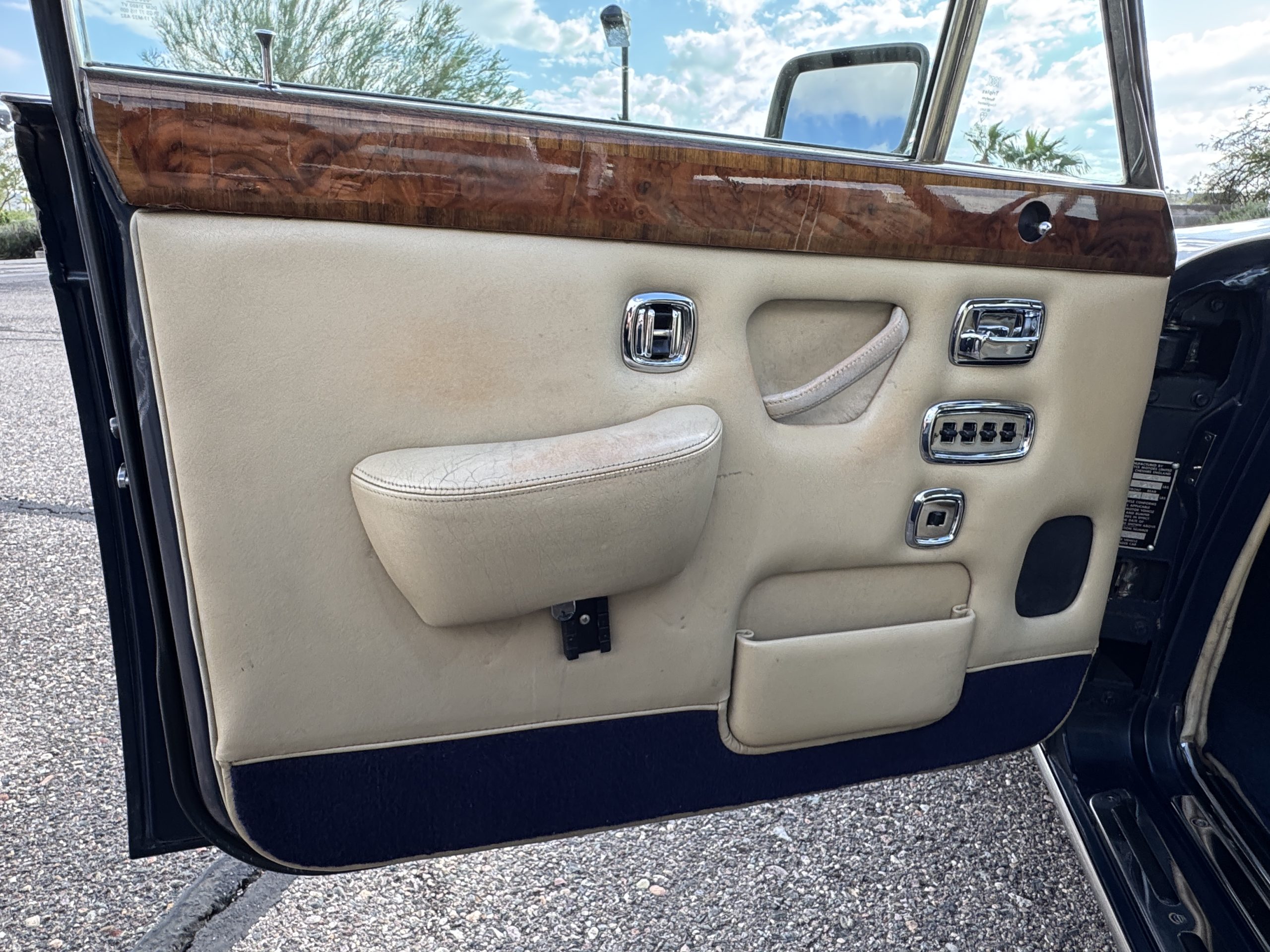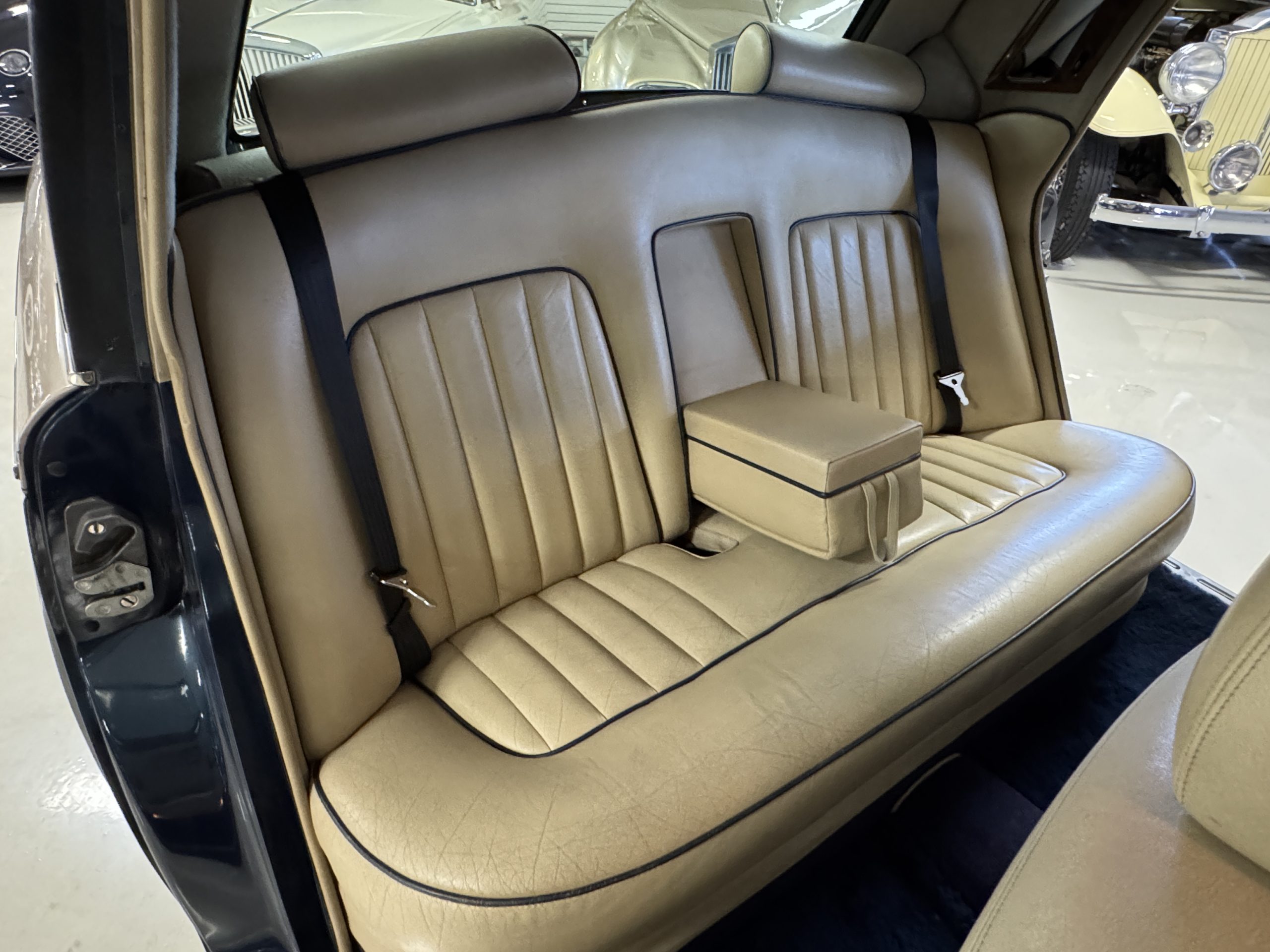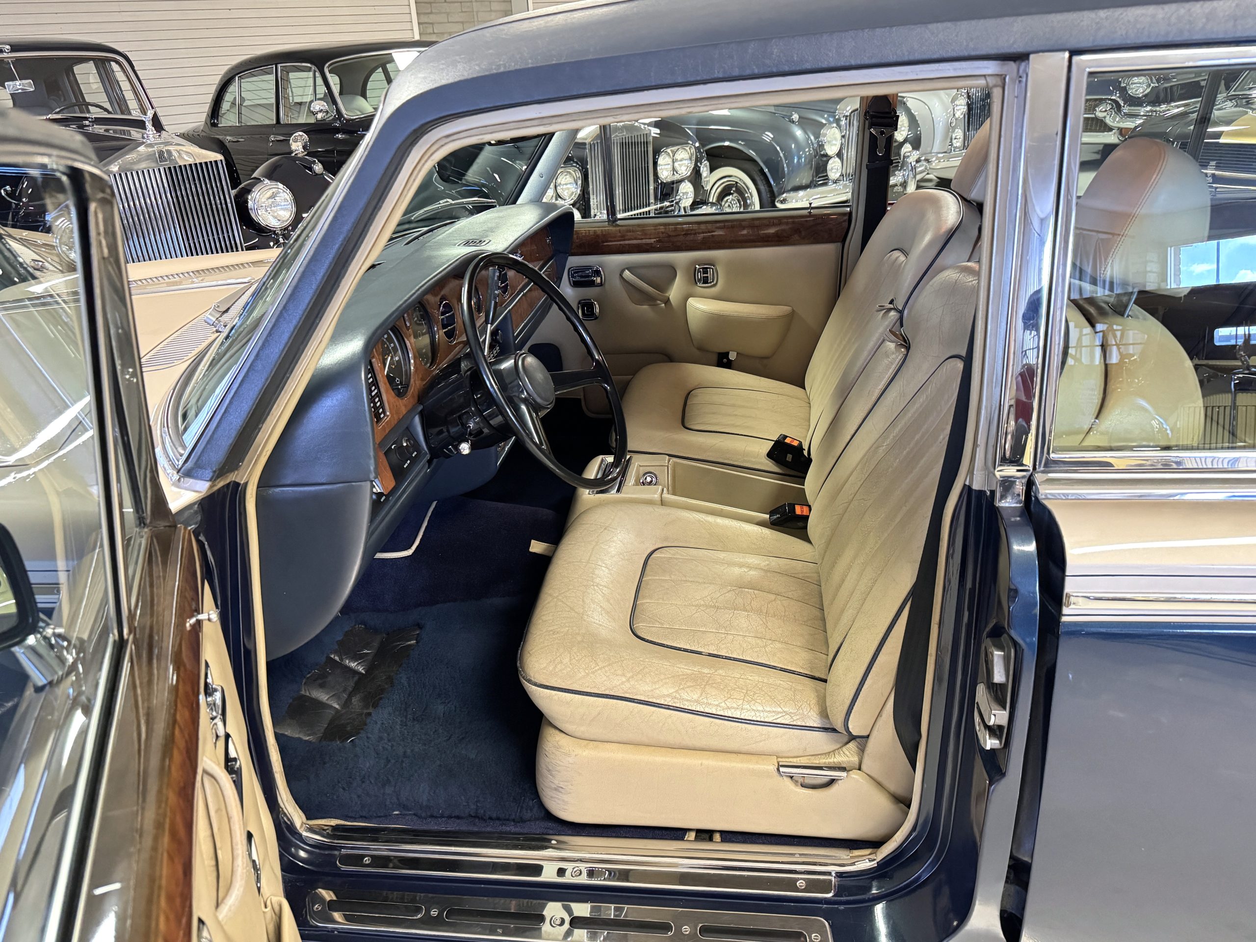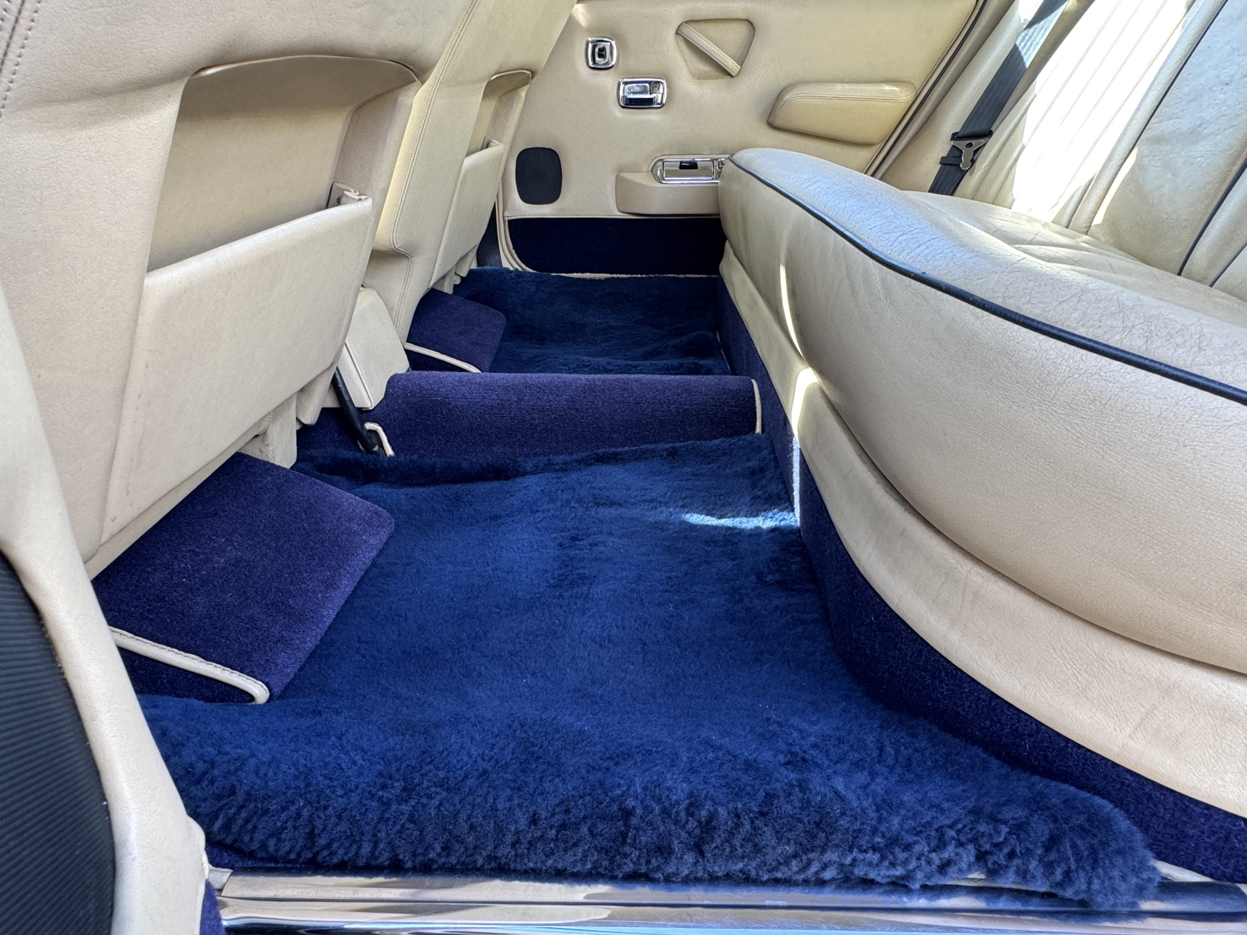 Inside, the Rolls-Royce presents the serene luxury expected of the brand. The cabin features original Beige Connolly hides with Dark Blue piping accents, showing gentle creasing consistent with age, complemented by beautifully preserved rich Lombardy walnut veneers. The Wilton wool carpeting and Dark Blue Mouton lambswool overlays remain in very good condition, reflecting careful ownership. The hides display the rich depth and texture typical of Connolly Vaumol leather with Luxan Grain, a natural, hand-rubbed finish that gives the leather its subtle burnished tones. Soft, supple, and well-preserved, the leather presents with just the slightest, correct patina. Every surface reflects the care of its owners, and the quality craftsmanship Rolls-Royce is known for. Interior amenities include dual-zone automatic climate control with functioning cold air conditioning, a Blaupunkt AM/FM stereo with Pioneer cassette deck, power locks and cruise control. Overall, the interior remains a warm, inviting environment that reflects both craftsmanship and comfort.