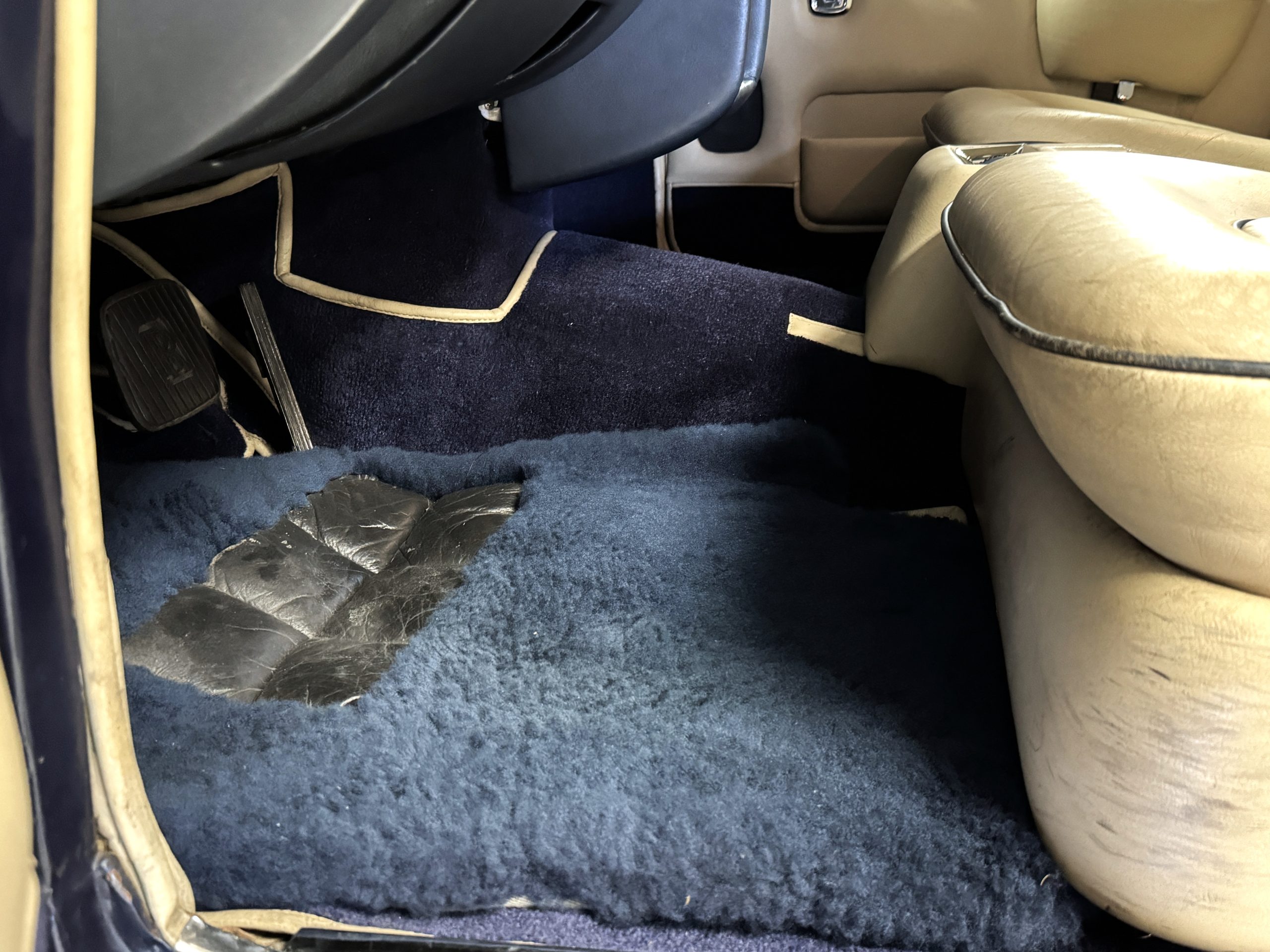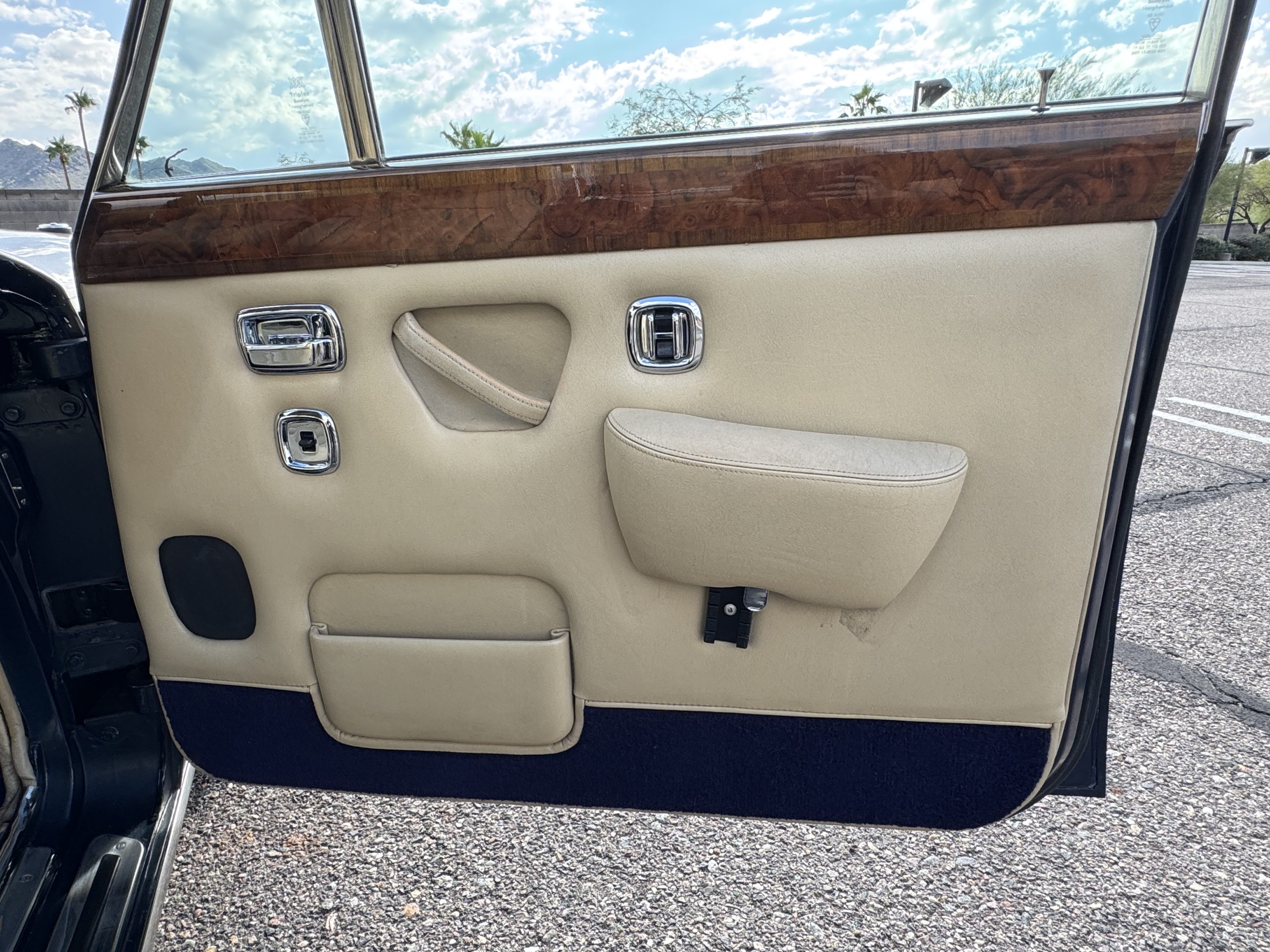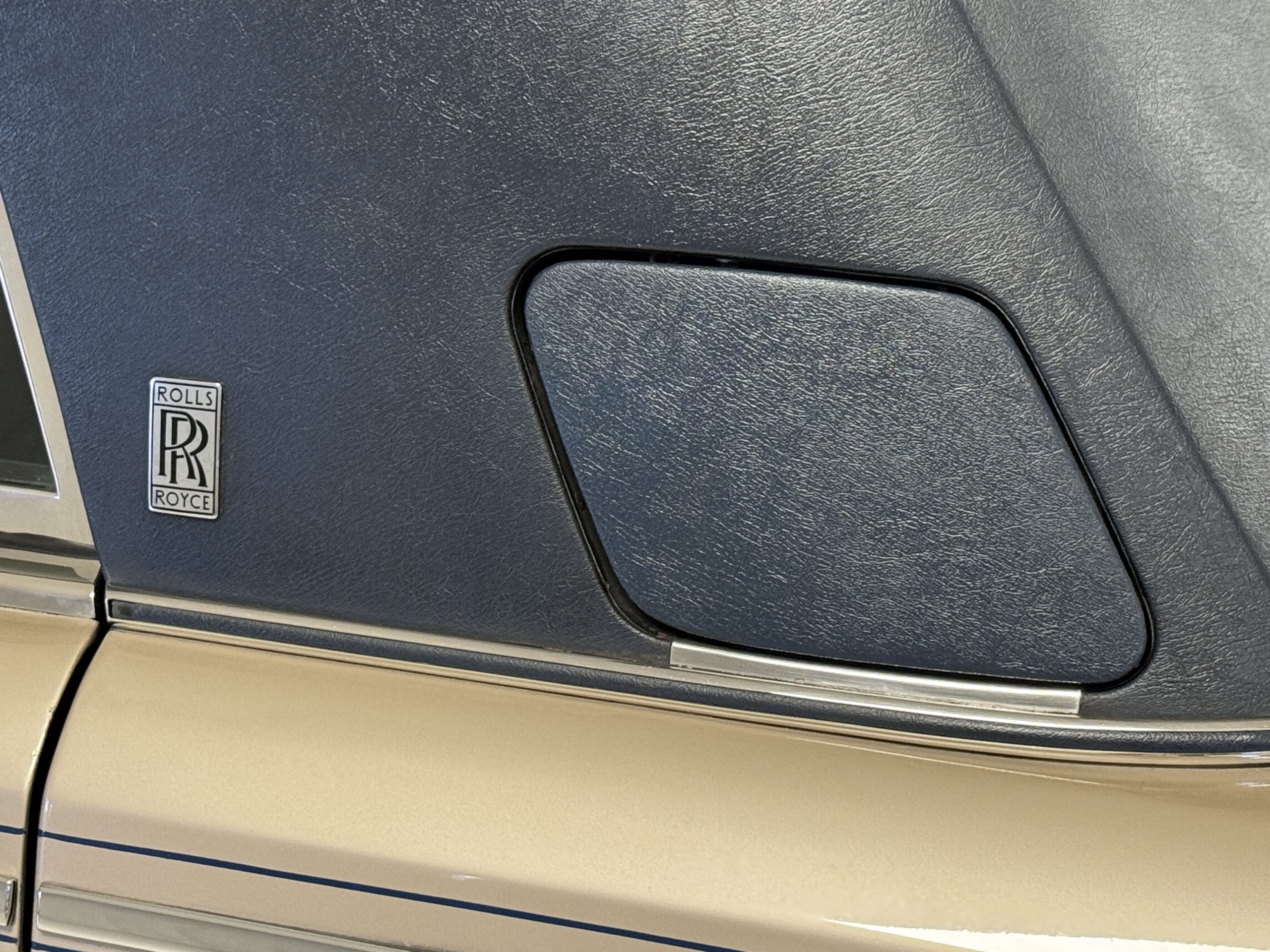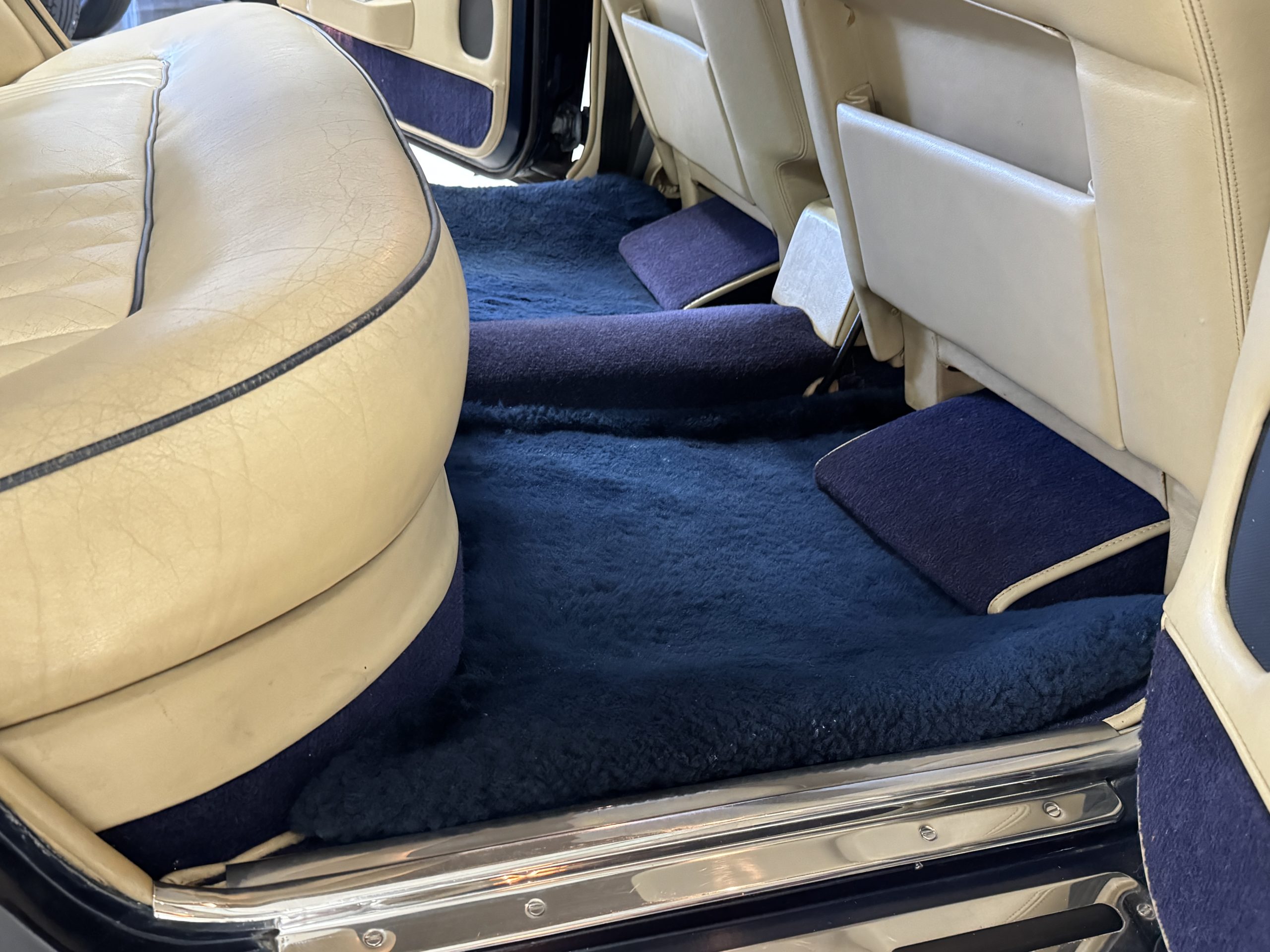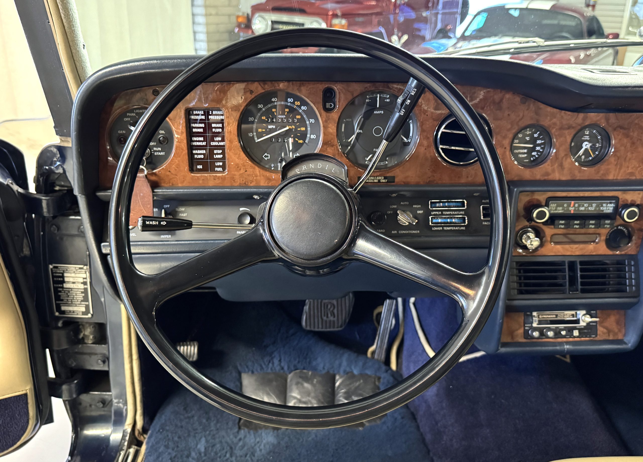 Inside, the Rolls-Royce presents the serene luxury expected of the brand. The cabin features original Beige Connolly hides with Dark Blue piping accents, showing gentle creasing consistent with age, complemented by beautifully preserved rich Lombardy walnut veneers. The Wilton wool carpeting and Dark Blue Mouton lambswool overlays remain in very good condition, reflecting careful ownership. The hides display the rich depth and texture typical of Connolly Vaumol leather with Luxan Grain, a natural, hand-rubbed finish that gives the leather its subtle burnished tones. Soft, supple, and well-preserved, the leather presents with just the slightest, correct patina. Every surface reflects the care of its owners, and the quality craftsmanship Rolls-Royce is known for. Interior amenities include dual-zone automatic climate control with functioning cold air conditioning, a Blaupunkt AM/FM stereo with Pioneer cassette deck, power locks and cruise control. Overall, the interior remains a warm, inviting environment that reflects both craftsmanship and comfort.