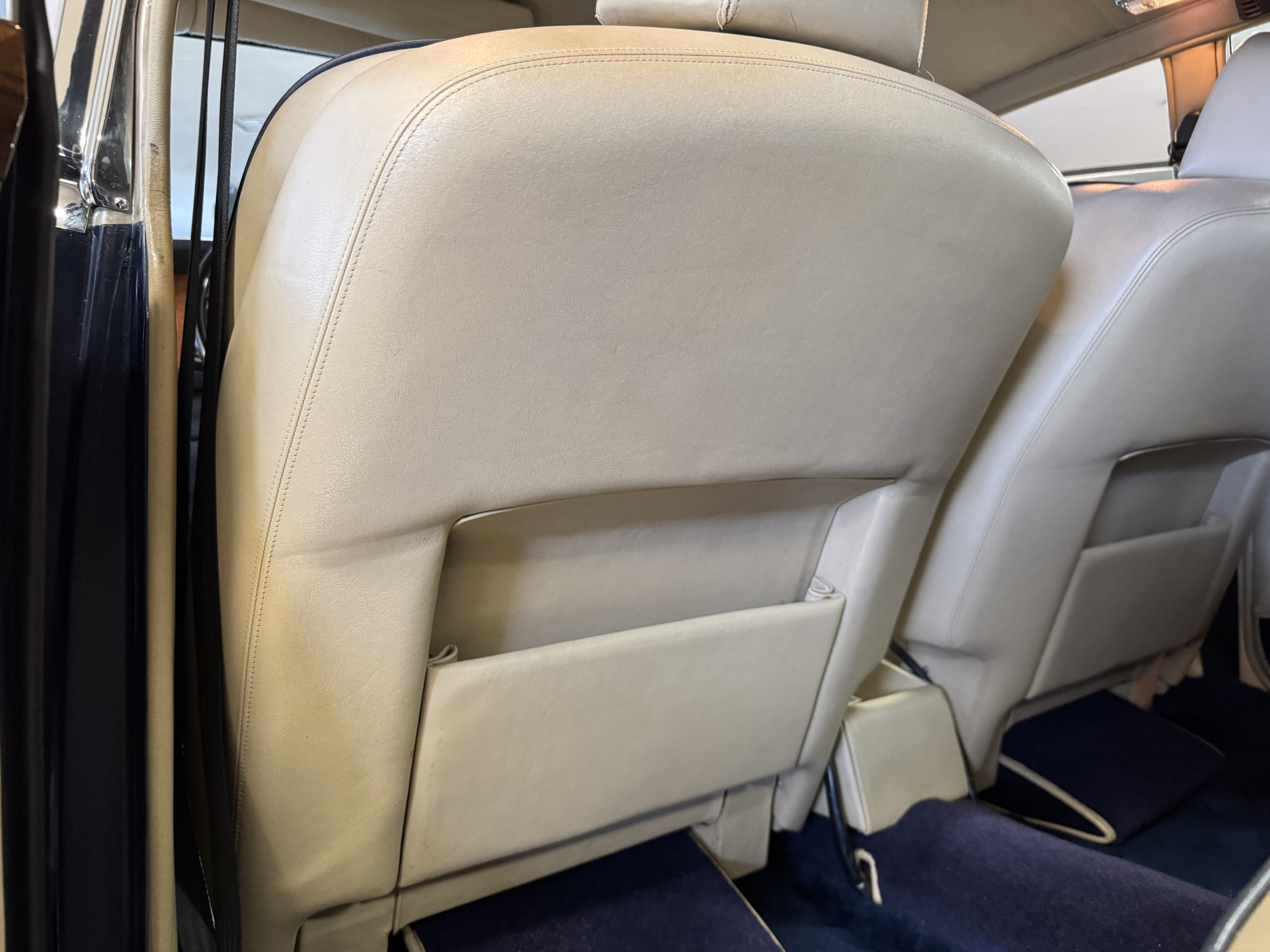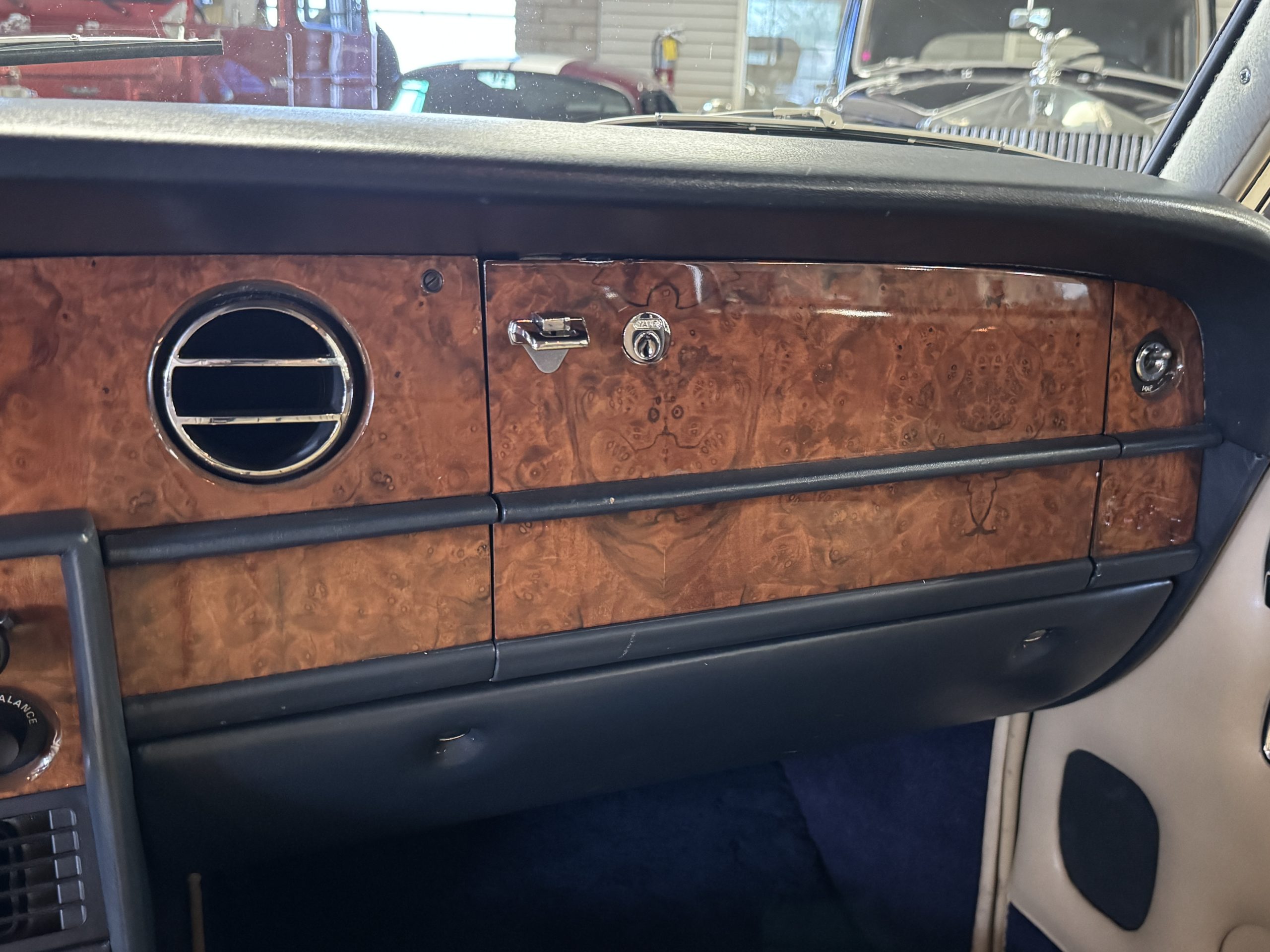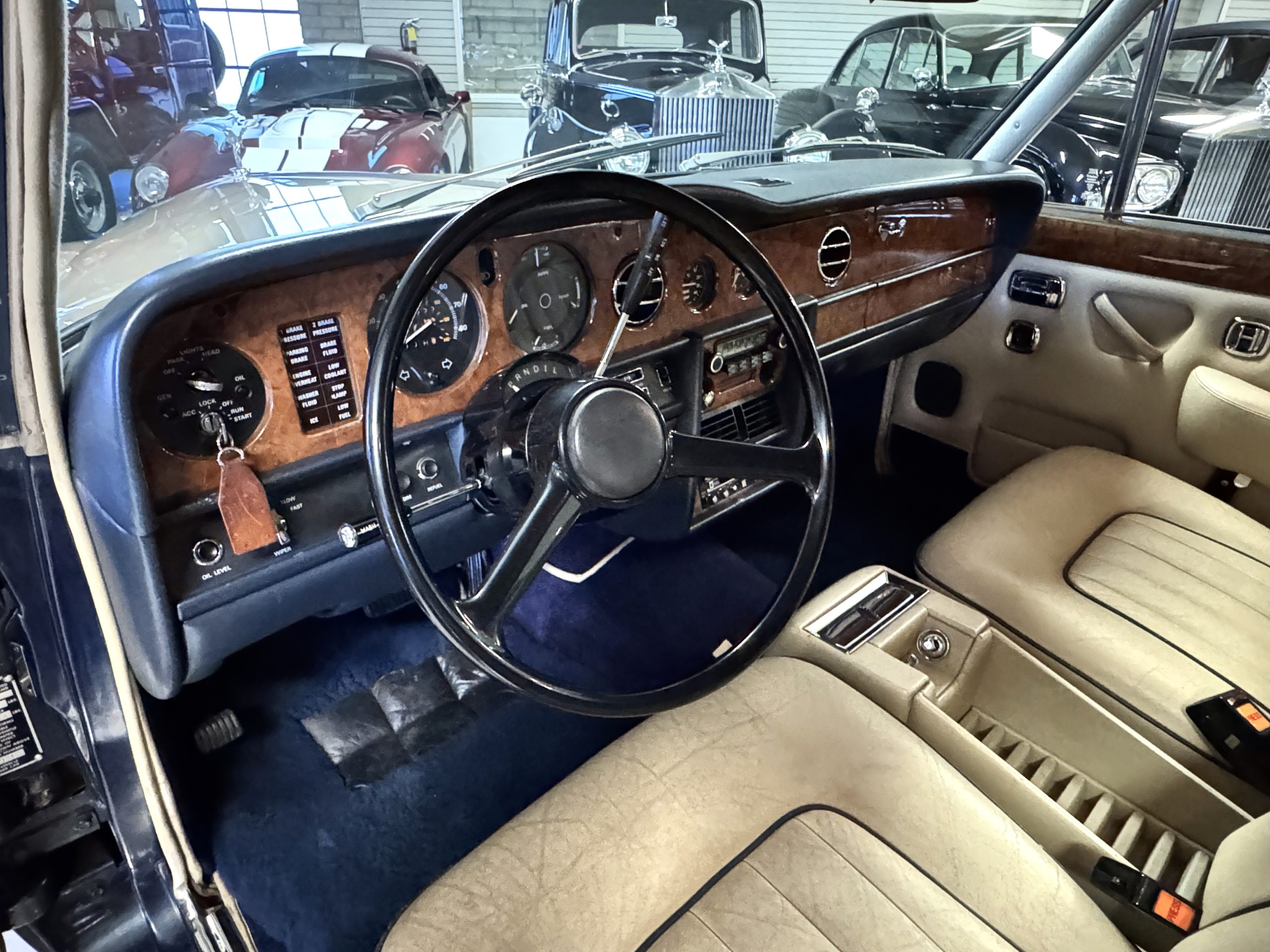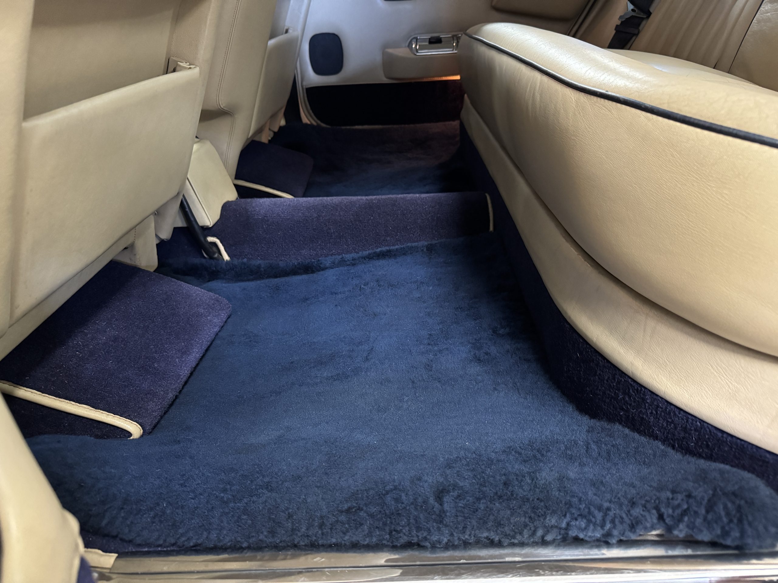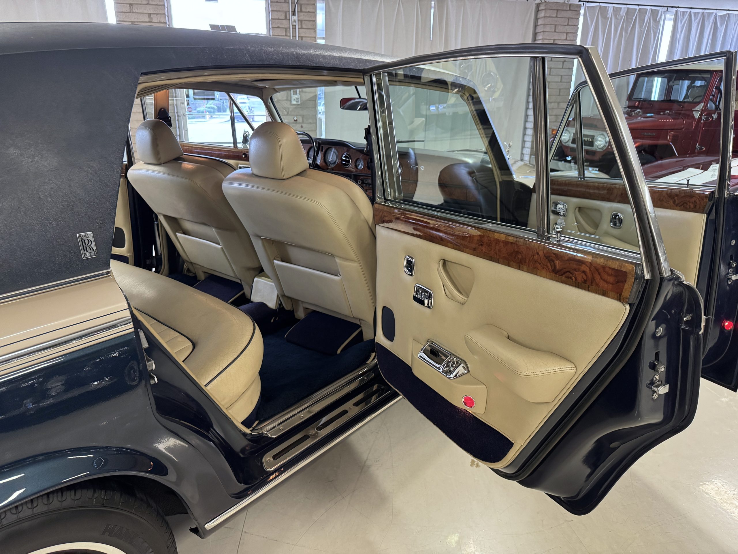 Inside, the Rolls-Royce presents the serene luxury expected of the brand. The cabin features original Beige Connolly hides with Dark Blue piping accents, showing gentle creasing consistent with age, complemented by beautifully preserved rich Lombardy walnut veneers. The Wilton wool carpeting and Dark Blue Mouton lambswool overlays remain in very good condition, reflecting careful ownership. The hides display the rich depth and texture typical of Connolly Vaumol leather with Luxan Grain, a natural, hand-rubbed finish that gives the leather its subtle burnished tones. Soft, supple, and well-preserved, the leather presents with just the slightest, correct patina. Every surface reflects the care of its owners, and the quality craftsmanship Rolls-Royce is known for. Interior amenities include dual-zone automatic climate control with functioning cold air conditioning, a Blaupunkt AM/FM stereo with Pioneer cassette deck, power locks and cruise control. Overall, the interior remains a warm, inviting environment that reflects both craftsmanship and comfort.
