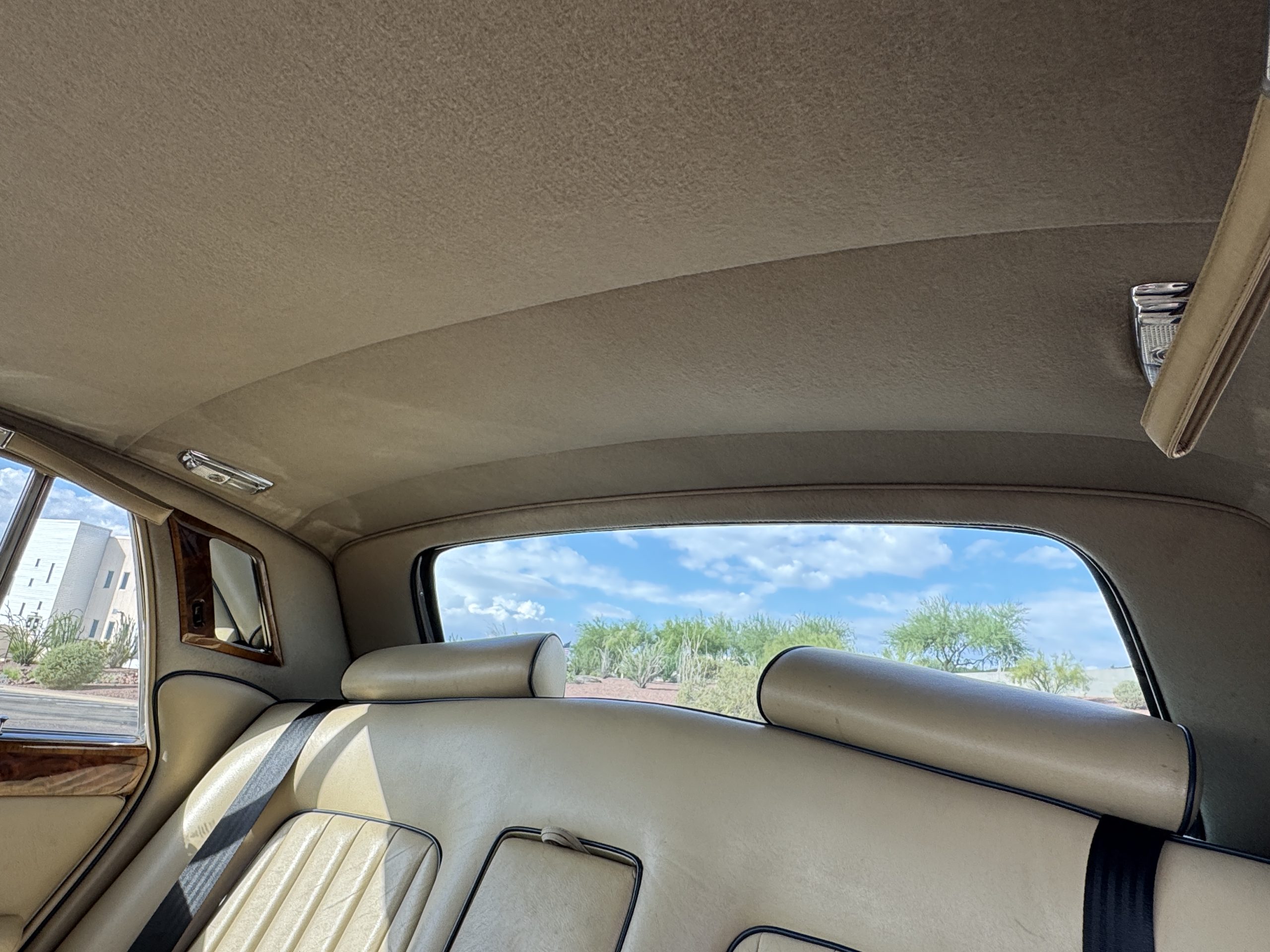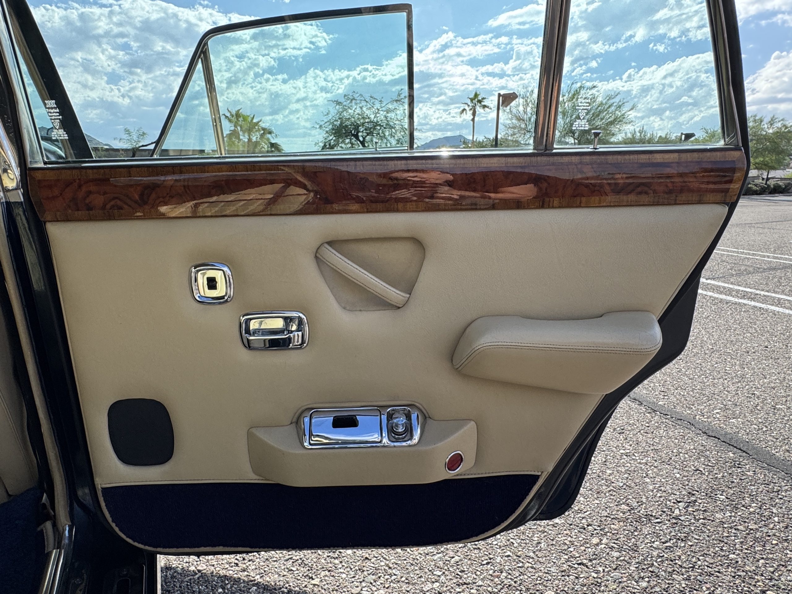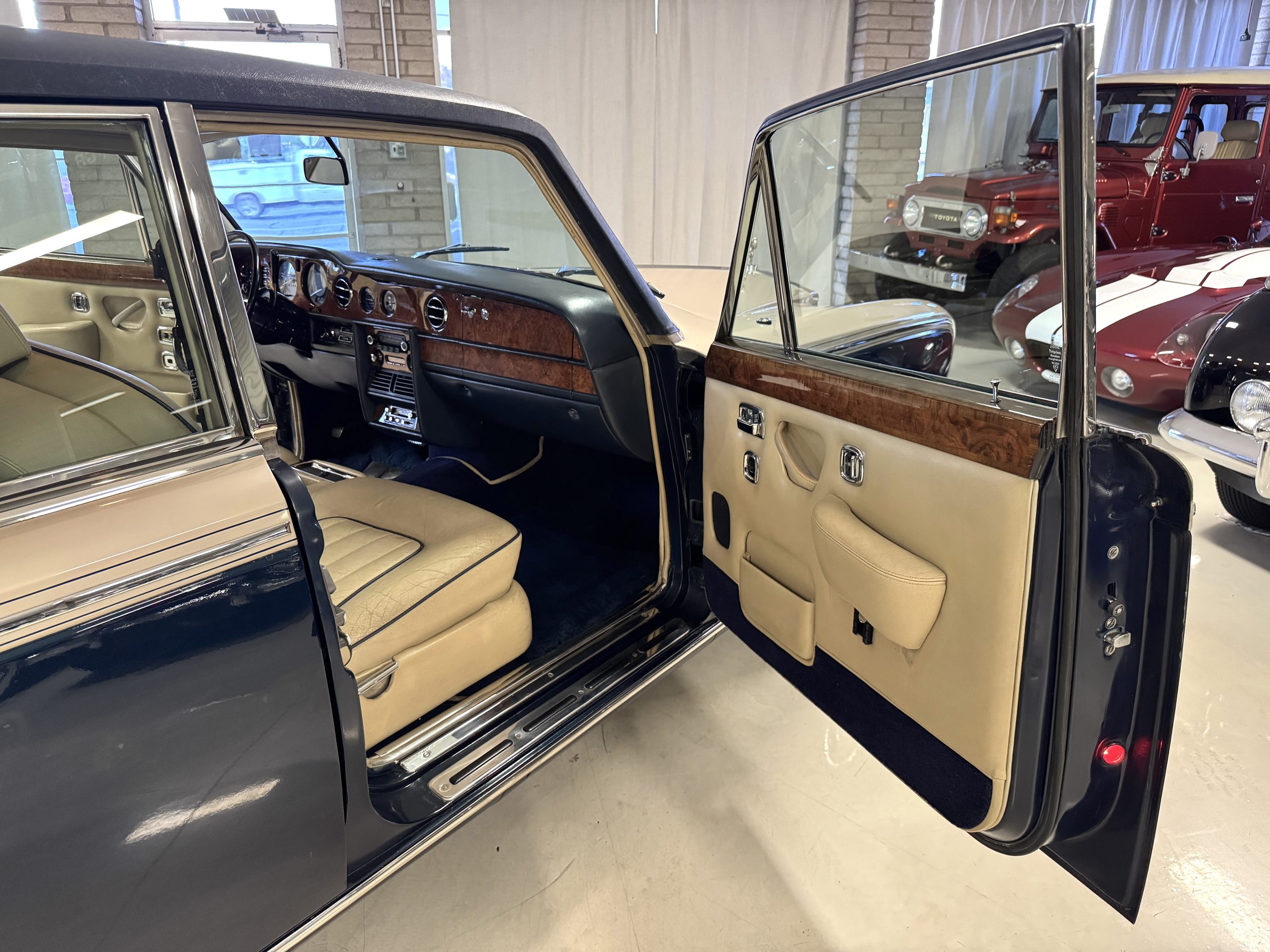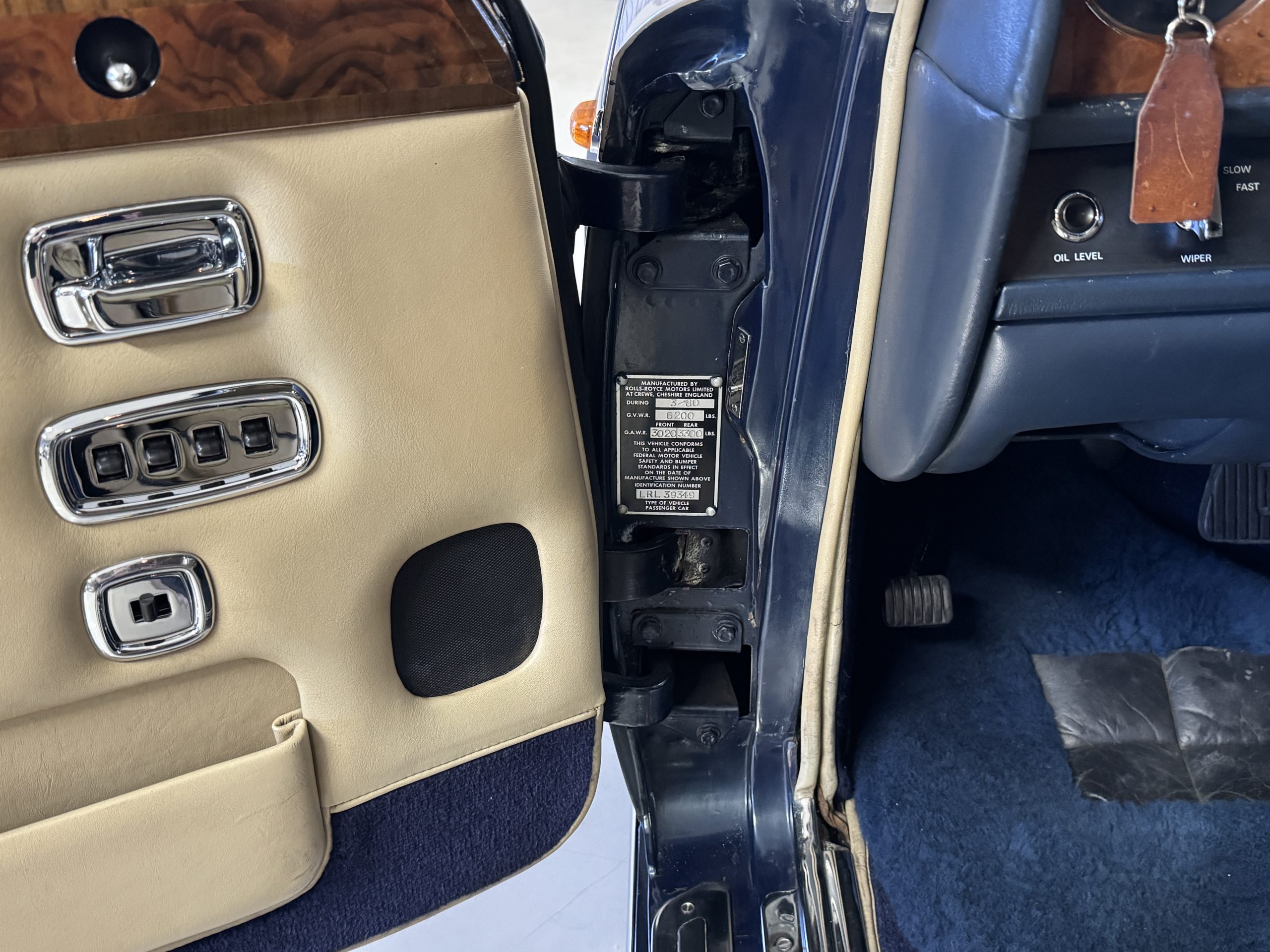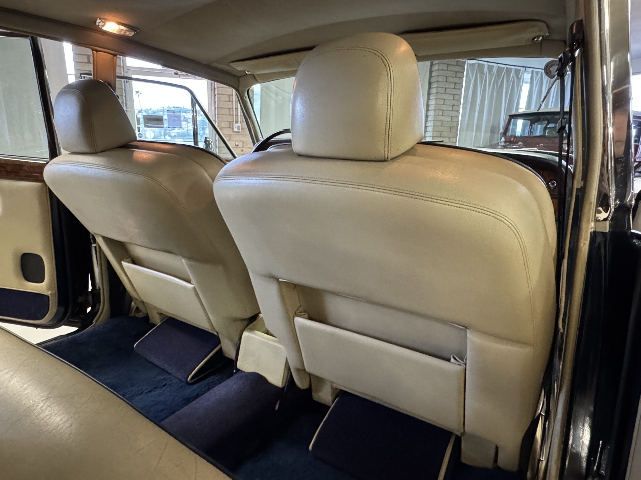 Inside, the Rolls-Royce presents the serene luxury expected of the brand. The cabin features original Beige Connolly hides with Dark Blue piping accents, showing gentle creasing consistent with age, complemented by beautifully preserved rich Lombardy walnut veneers. The Wilton wool carpeting and Dark Blue Mouton lambswool overlays remain in very good condition, reflecting careful ownership. The hides display the rich depth and texture typical of Connolly Vaumol leather with Luxan Grain, a natural, hand-rubbed finish that gives the leather its subtle burnished tones. Soft, supple, and well-preserved, the leather presents with just the slightest, correct patina. Every surface reflects the care of its owners, and the quality craftsmanship Rolls-Royce is known for. Interior amenities include dual-zone automatic climate control with functioning cold air conditioning, a Blaupunkt AM/FM stereo with Pioneer cassette deck, power locks and cruise control. Overall, the interior remains a warm, inviting environment that reflects both craftsmanship and comfort.