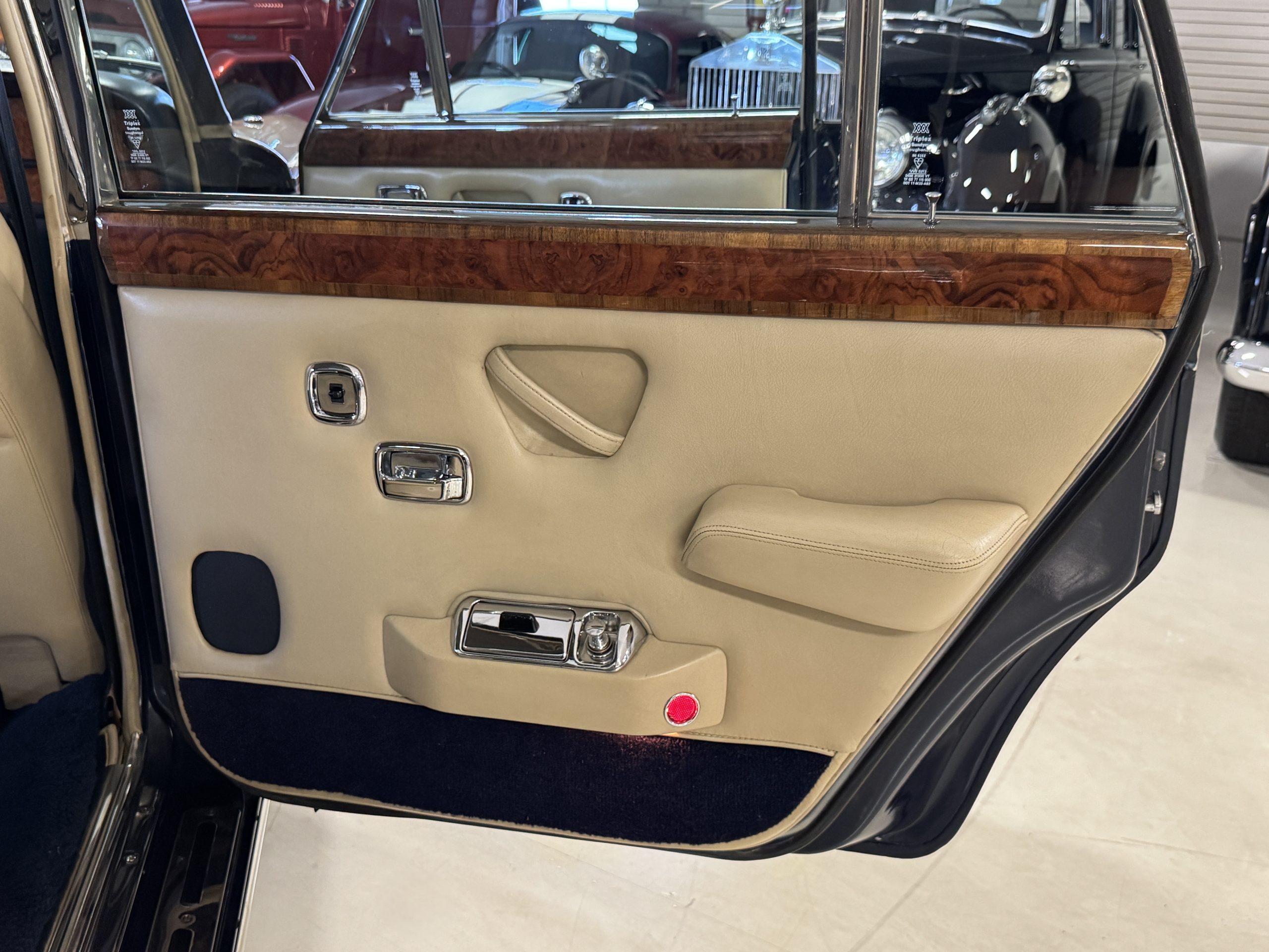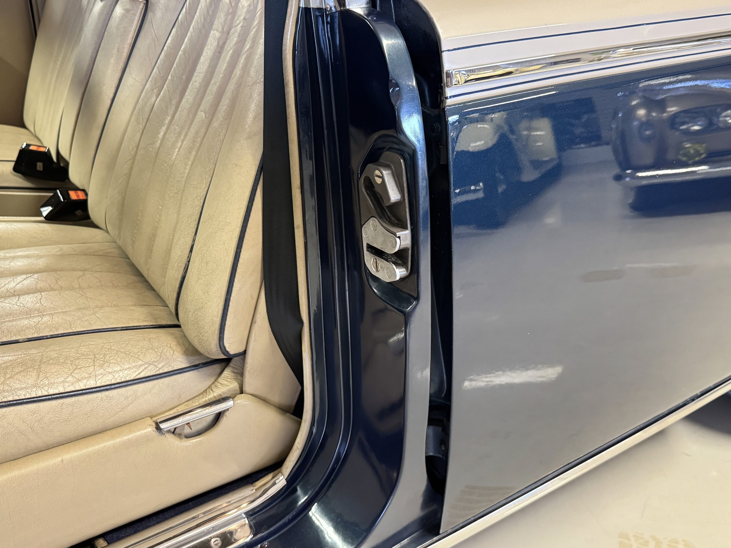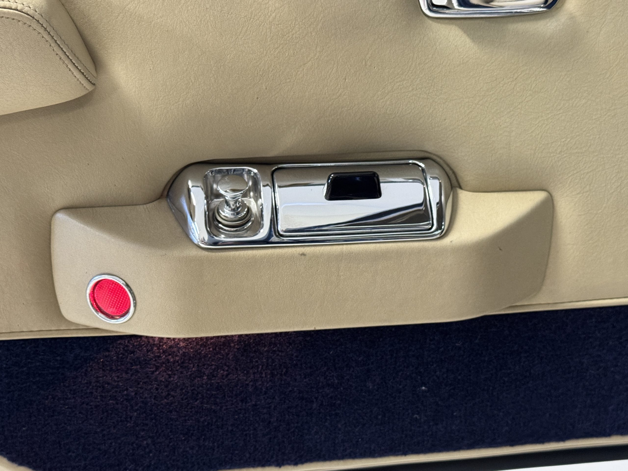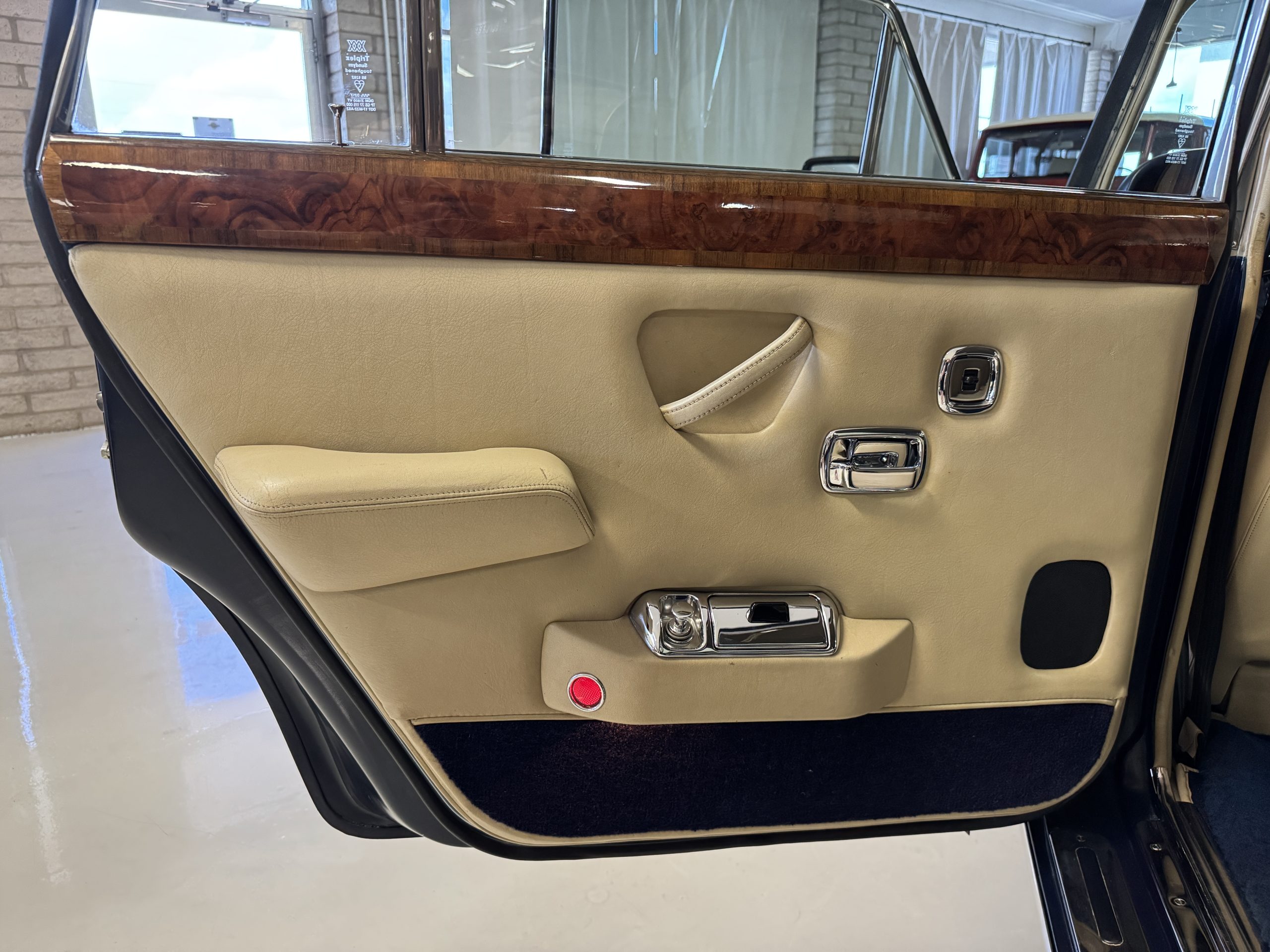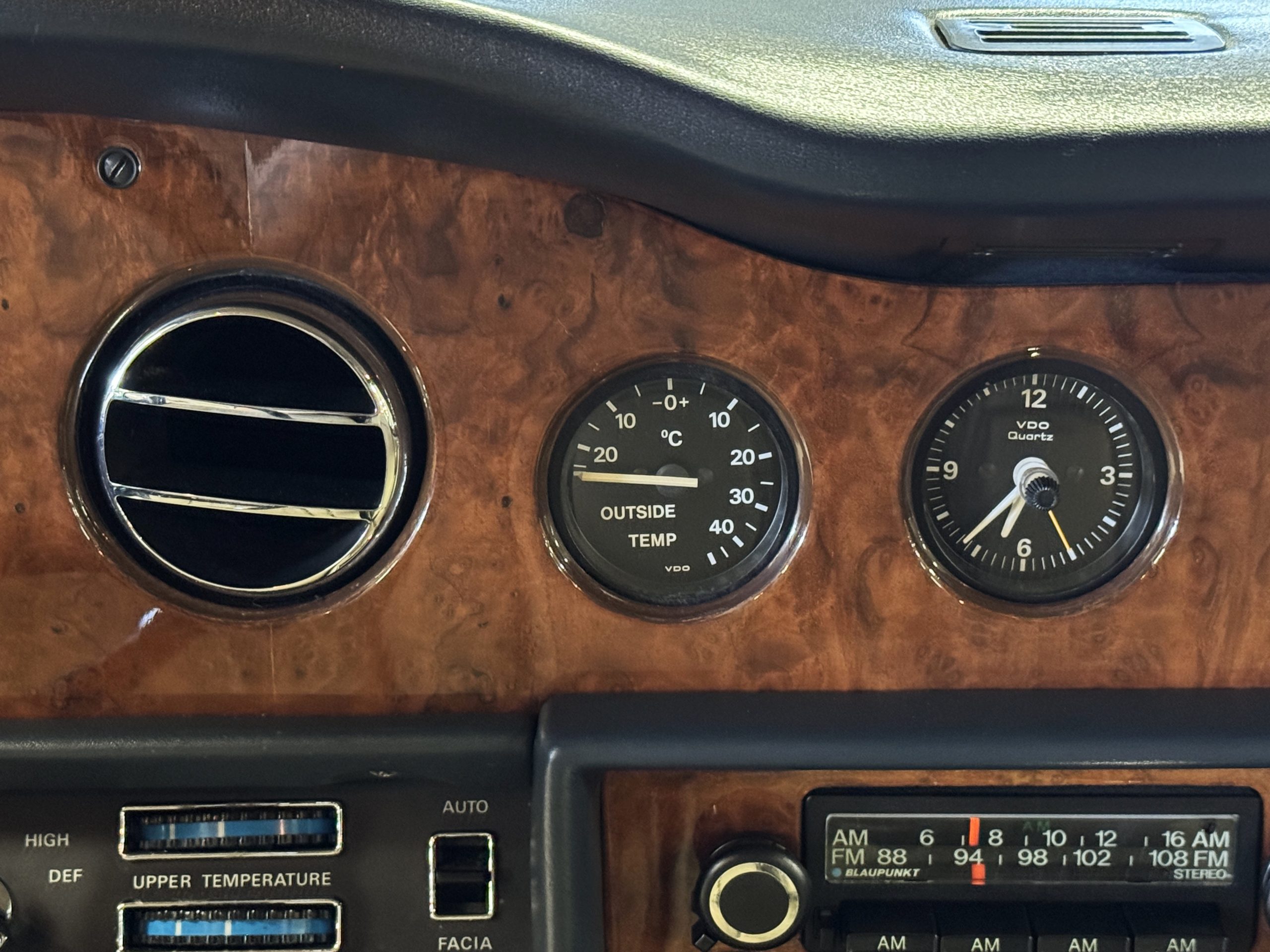 Inside, the Rolls-Royce presents the serene luxury expected of the brand. The cabin features original Beige Connolly hides with Dark Blue piping accents, showing gentle creasing consistent with age, complemented by beautifully preserved rich Lombardy walnut veneers. The Wilton wool carpeting and Dark Blue Mouton lambswool overlays remain in very good condition, reflecting careful ownership. The hides display the rich depth and texture typical of Connolly Vaumol leather with Luxan Grain, a natural, hand-rubbed finish that gives the leather its subtle burnished tones. Soft, supple, and well-preserved, the leather presents with just the slightest, correct patina. Every surface reflects the care of its owners, and the quality craftsmanship Rolls-Royce is known for. Interior amenities include dual-zone automatic climate control with functioning cold air conditioning, a Blaupunkt AM/FM stereo with Pioneer cassette deck, power locks and cruise control. Overall, the interior remains a warm, inviting environment that reflects both craftsmanship and comfort.