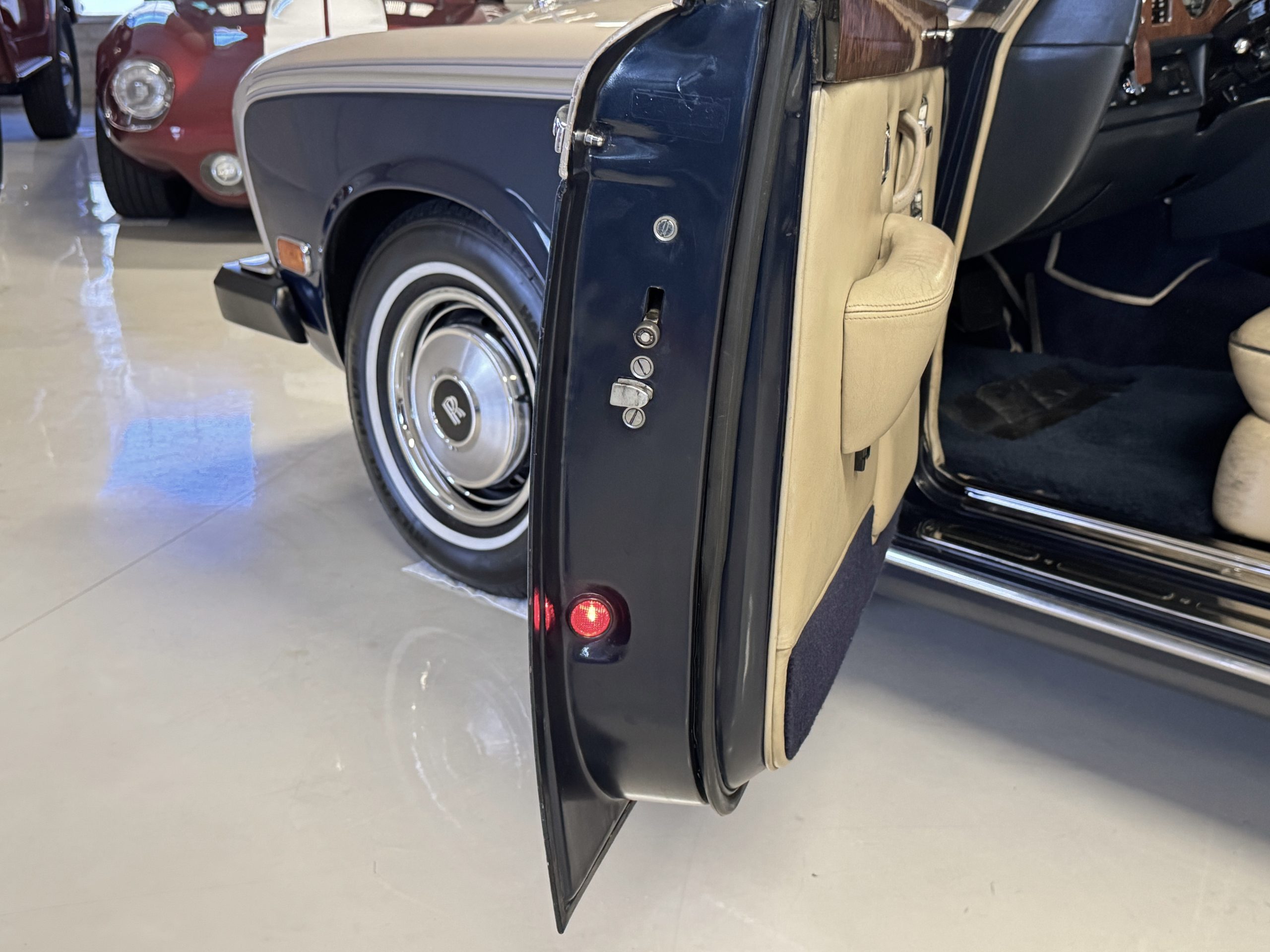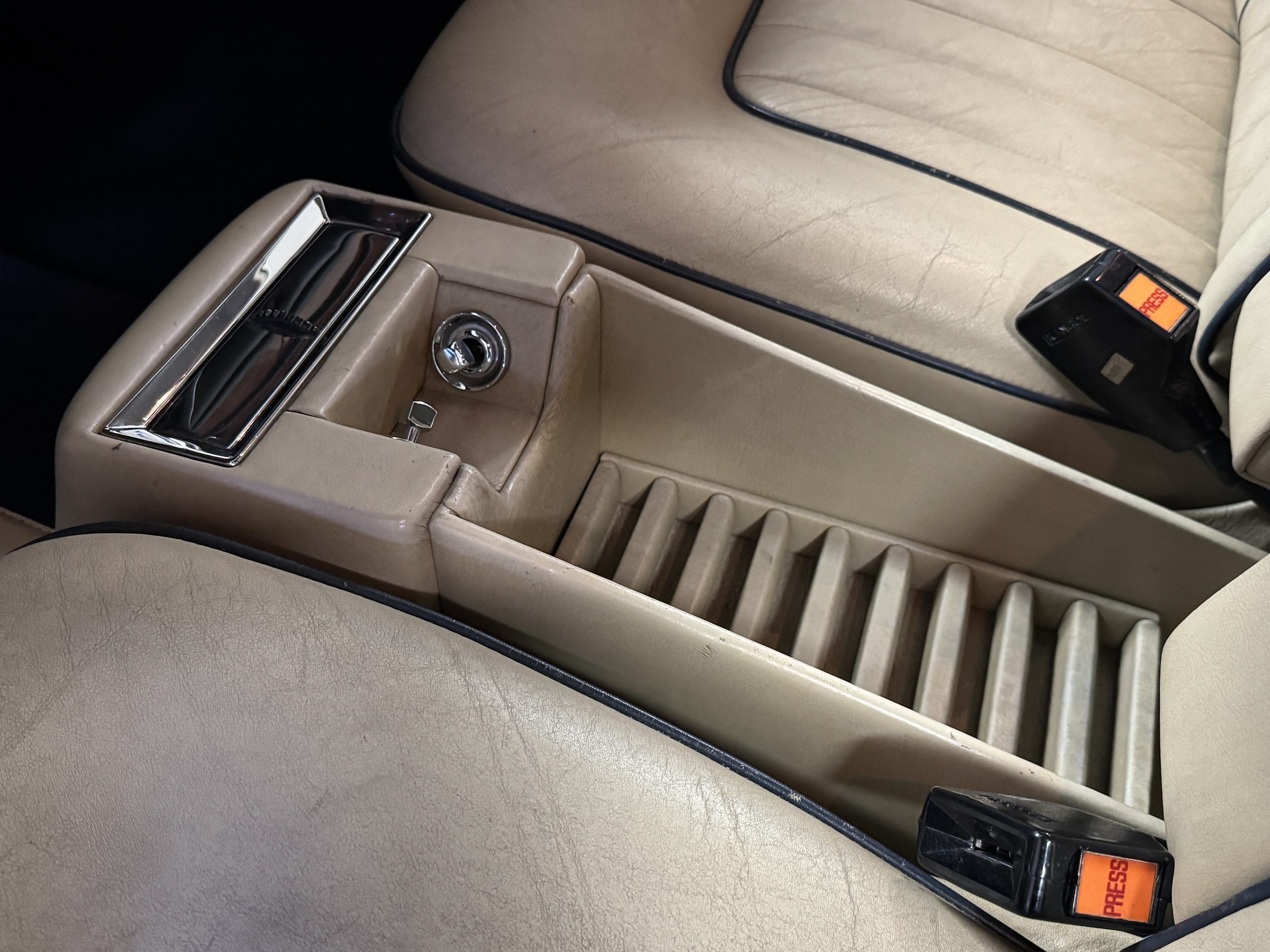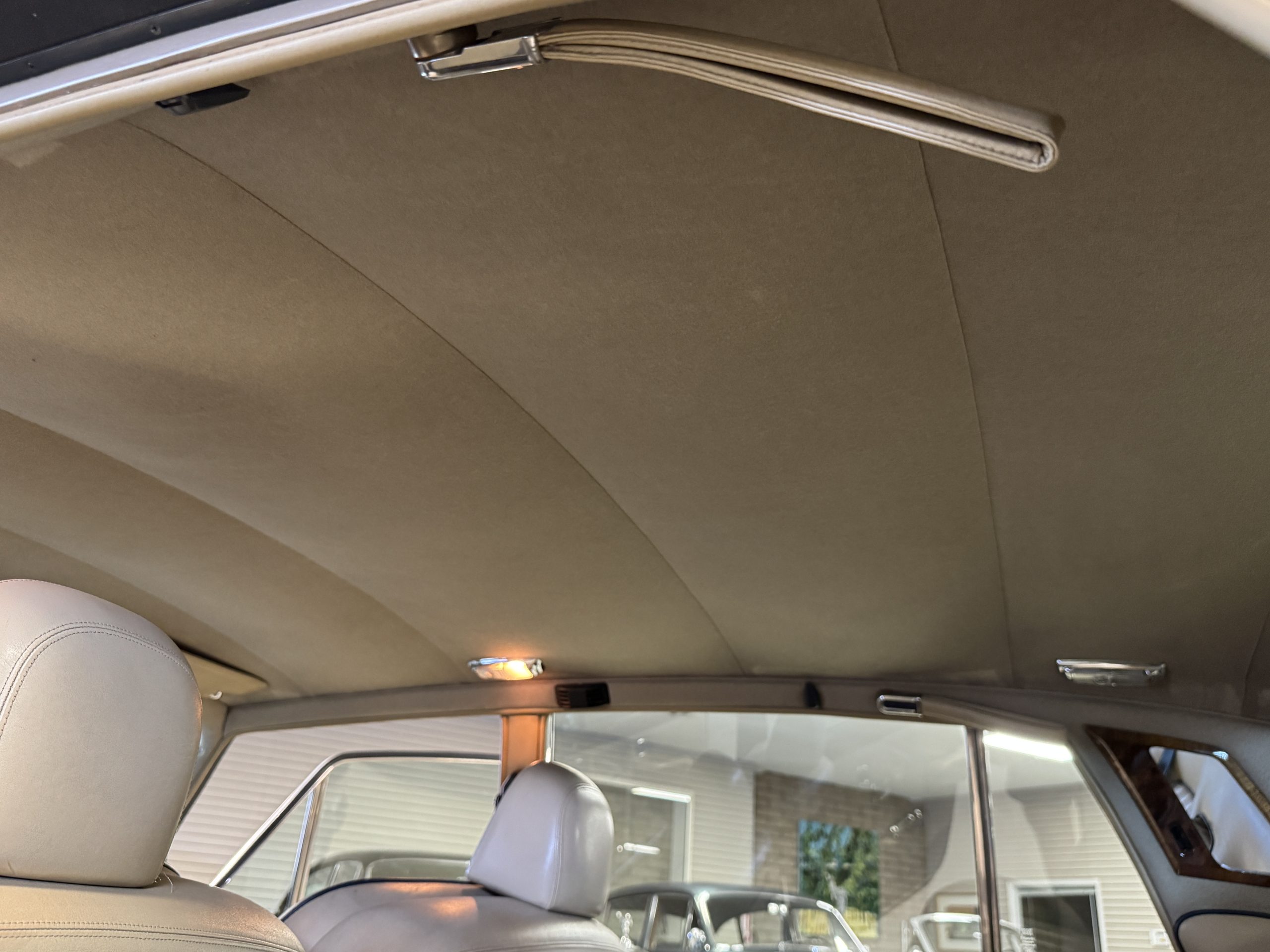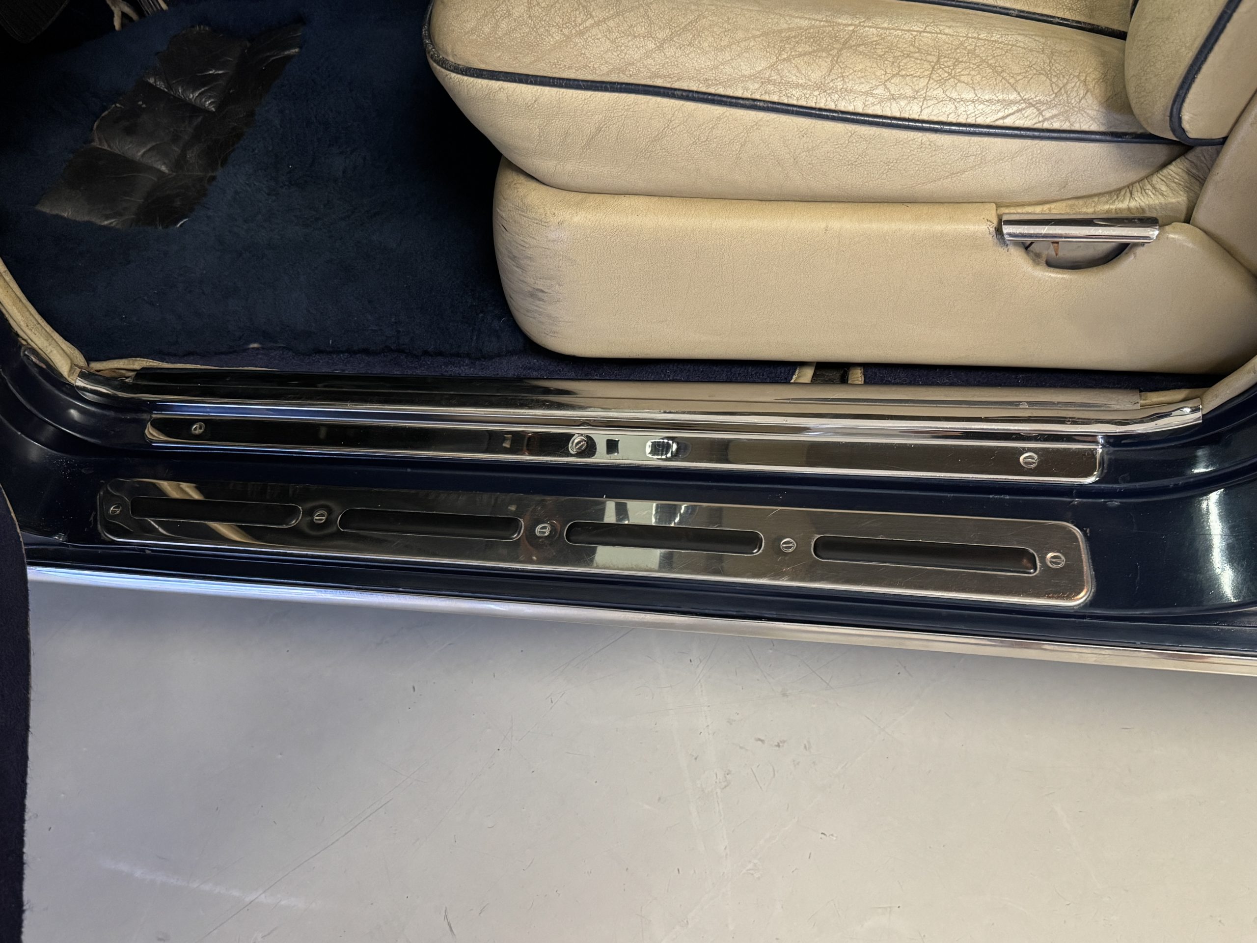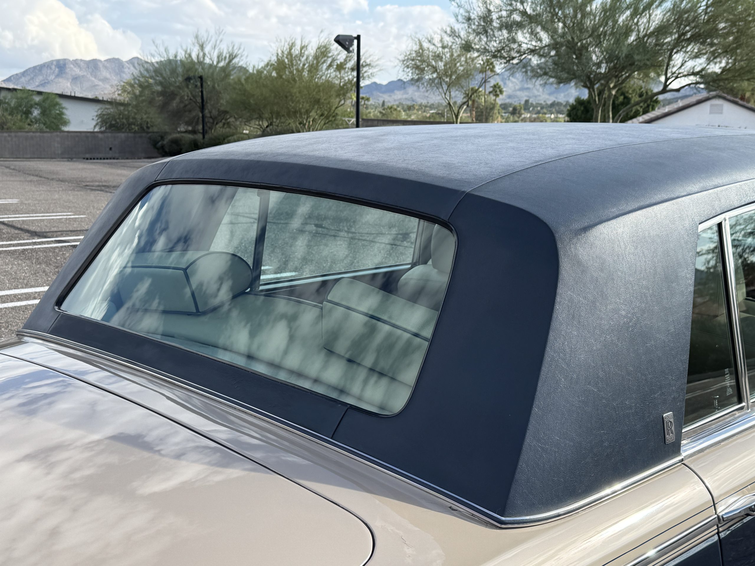 Inside, the Rolls-Royce presents the serene luxury expected of the brand. The cabin features original Beige Connolly hides with Dark Blue piping accents, showing gentle creasing consistent with age, complemented by beautifully preserved rich Lombardy walnut veneers. The Wilton wool carpeting and Dark Blue Mouton lambswool overlays remain in very good condition, reflecting careful ownership. The hides display the rich depth and texture typical of Connolly Vaumol leather with Luxan Grain, a natural, hand-rubbed finish that gives the leather its subtle burnished tones. Soft, supple, and well-preserved, the leather presents with just the slightest, correct patina. Every surface reflects the care of its owners, and the quality craftsmanship Rolls-Royce is known for. Interior amenities include dual-zone automatic climate control with functioning cold air conditioning, a Blaupunkt AM/FM stereo with Pioneer cassette deck, power locks and cruise control. Overall, the interior remains a warm, inviting environment that reflects both craftsmanship and comfort.