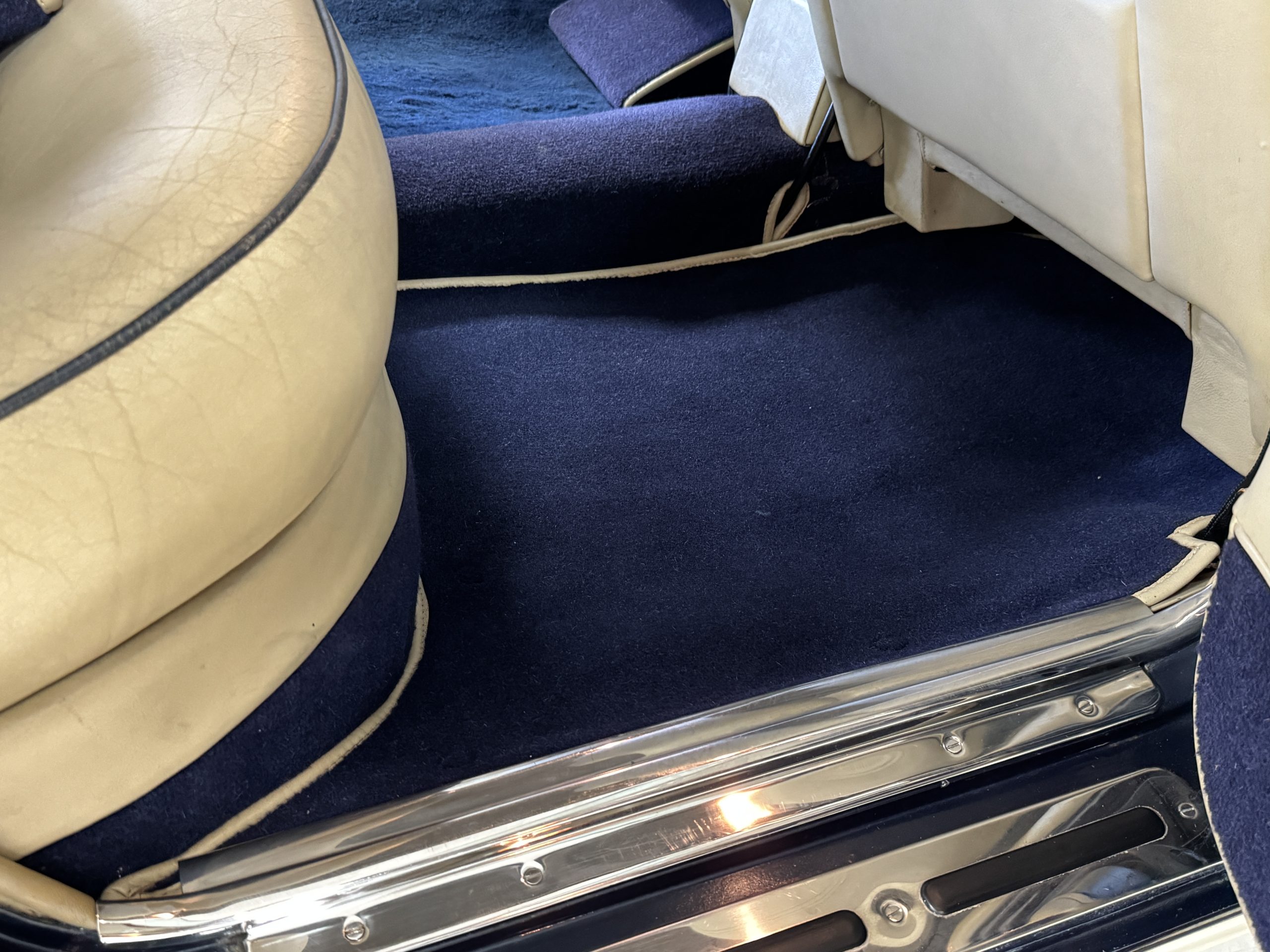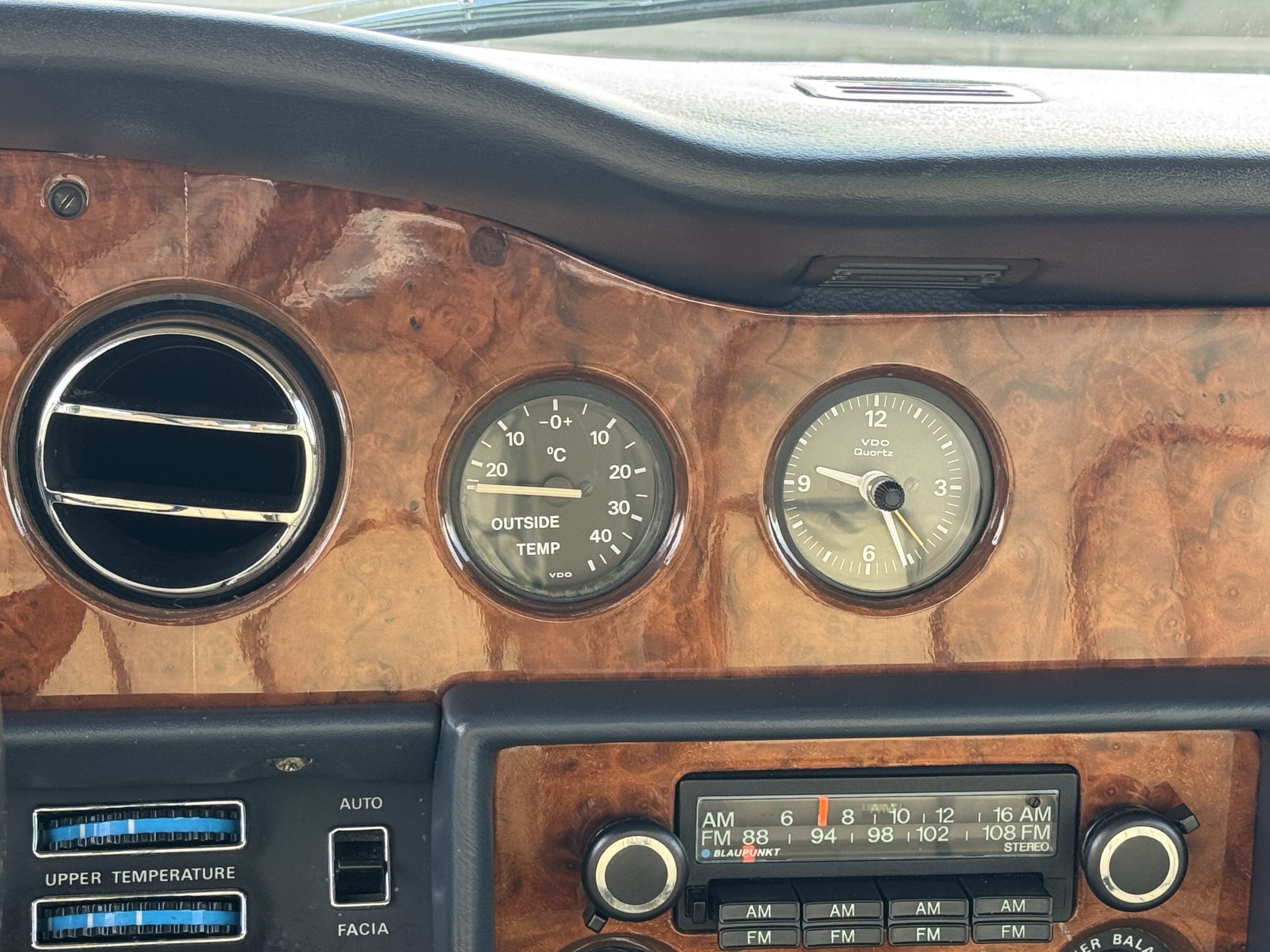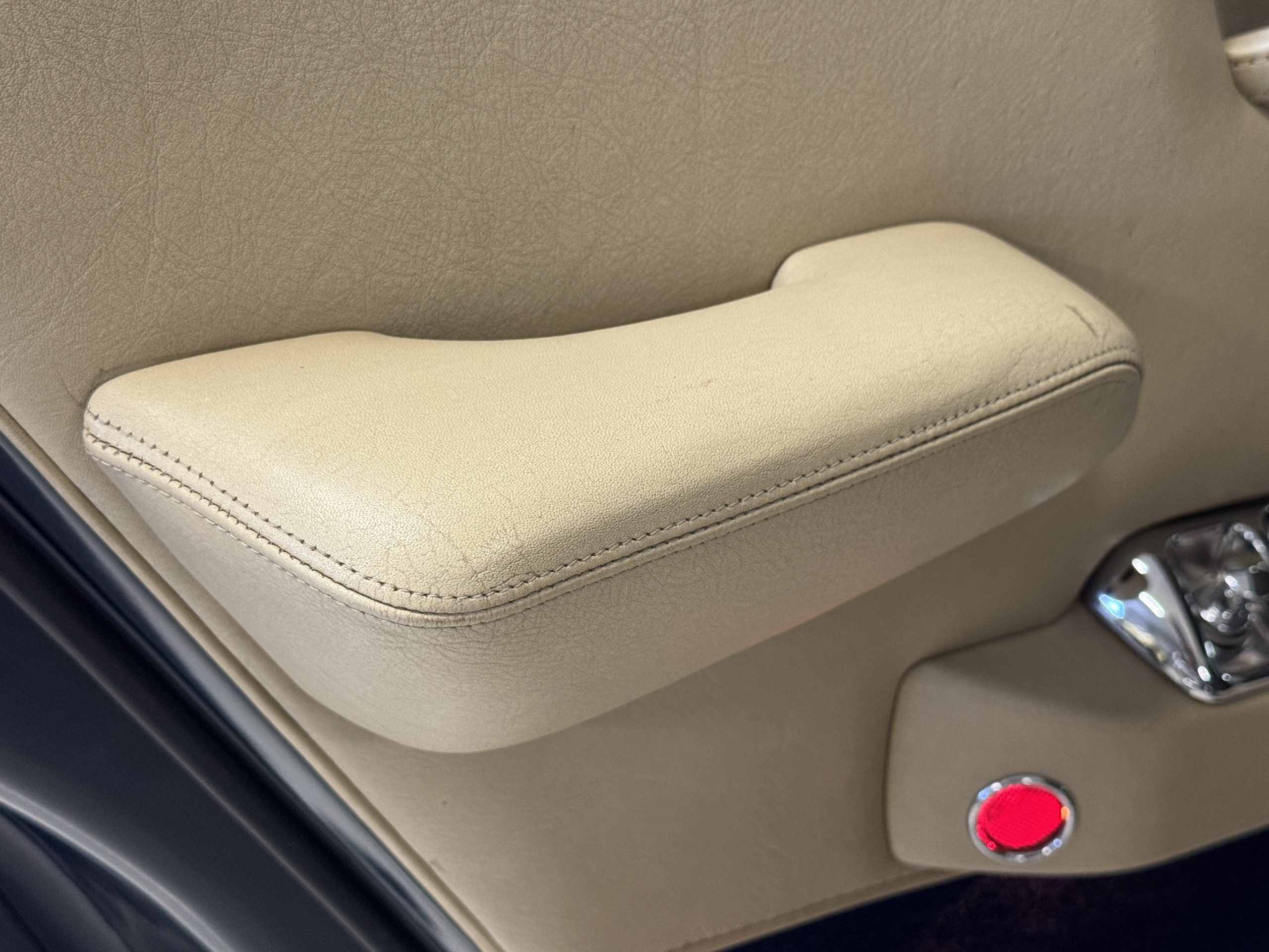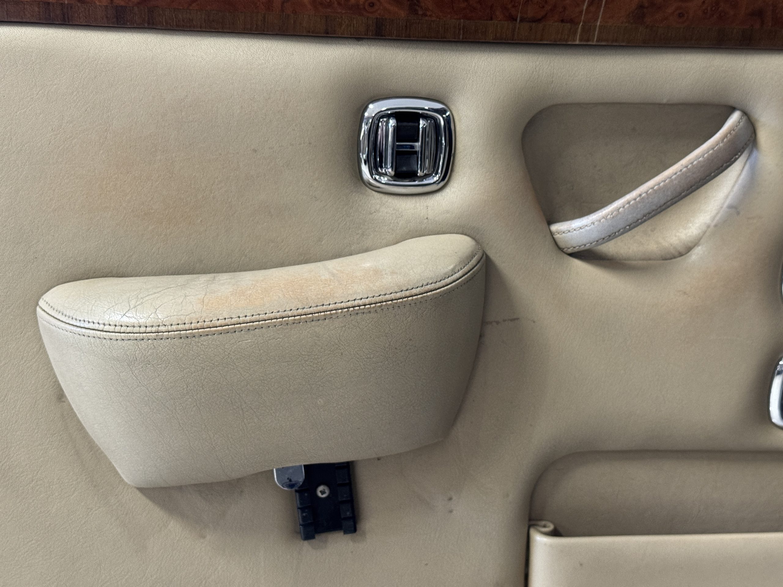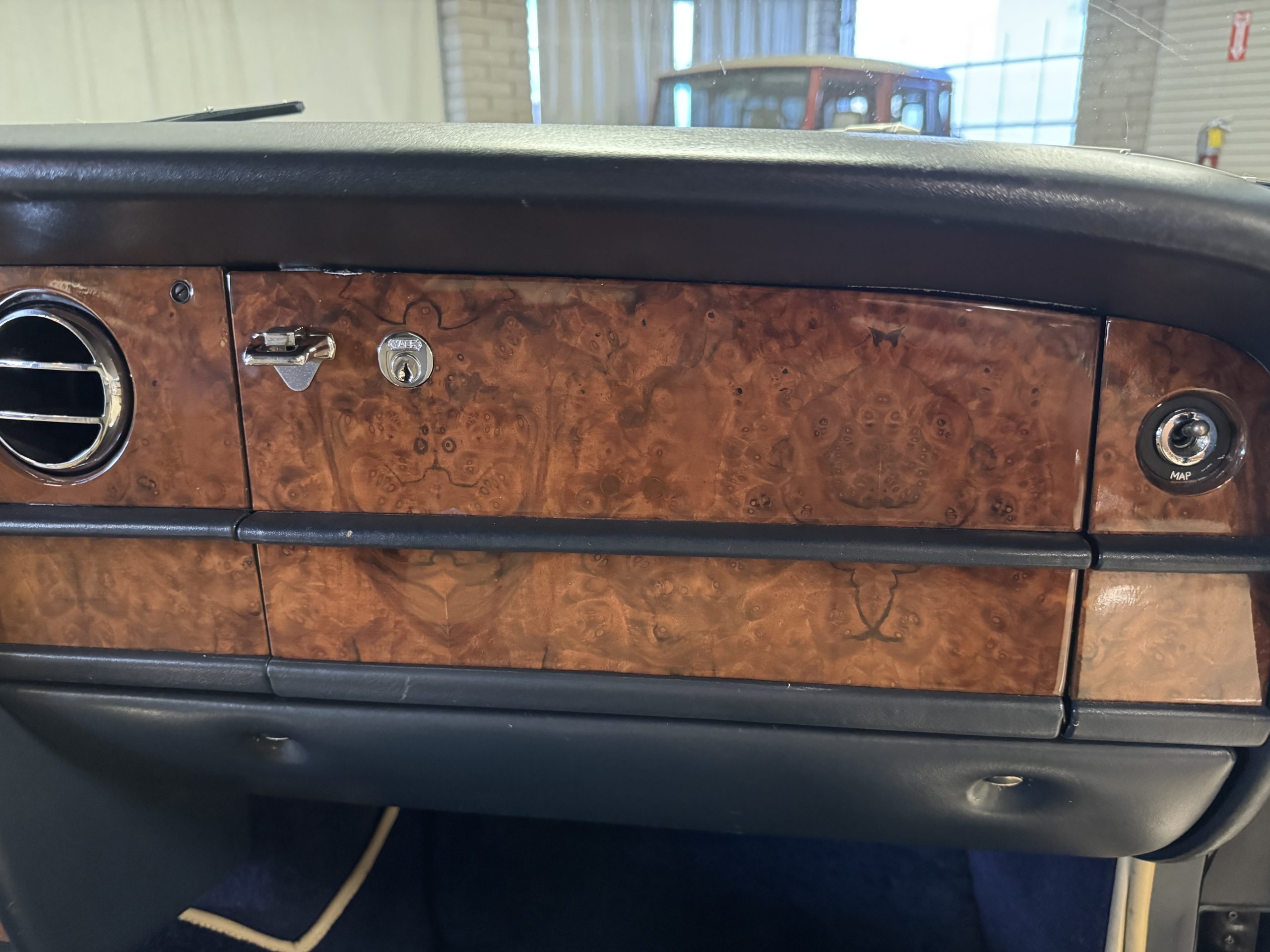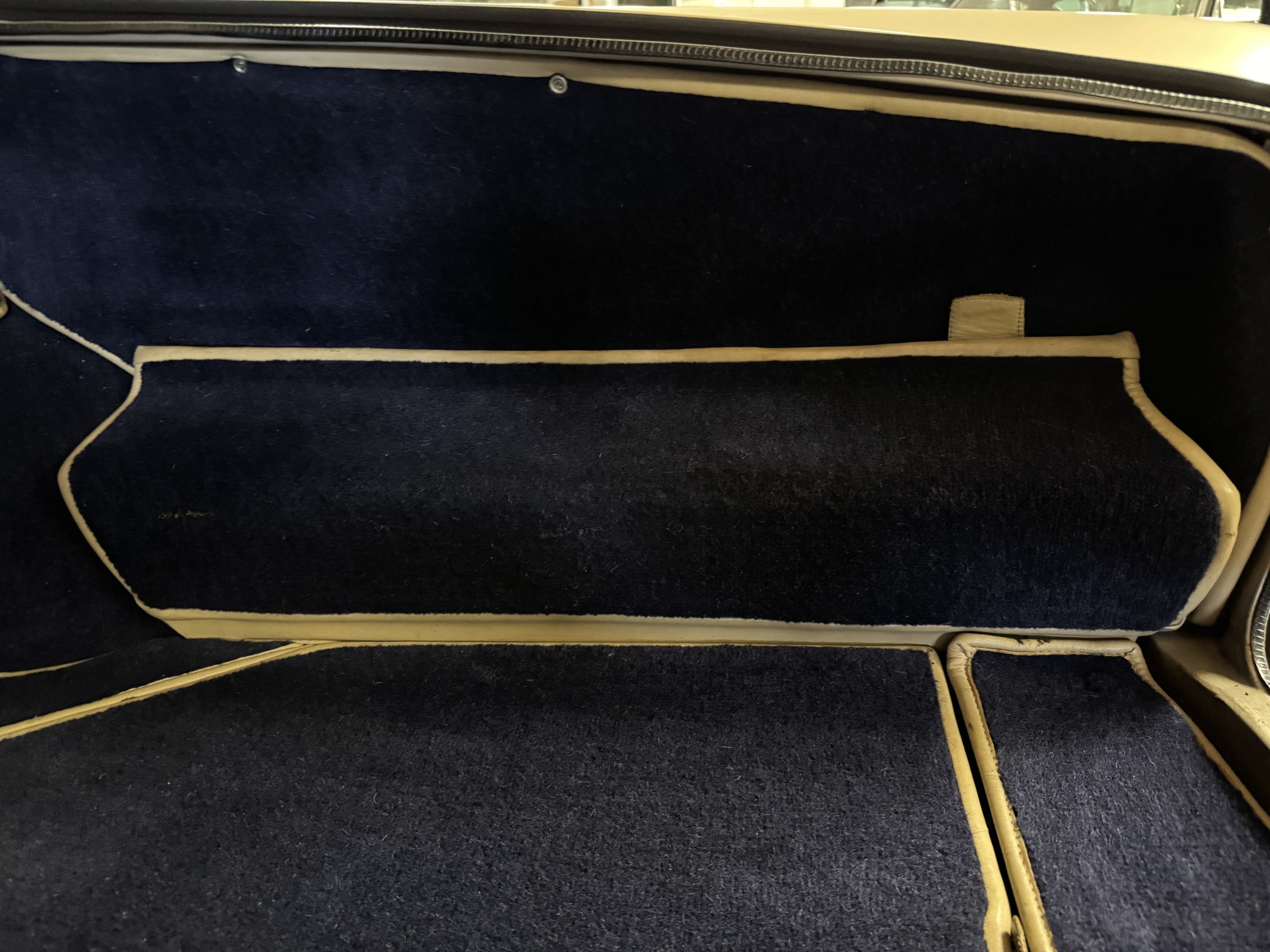 Inside, the Rolls-Royce presents the serene luxury expected of the brand. The cabin features original Beige Connolly hides with Dark Blue piping accents, showing gentle creasing consistent with age, complemented by beautifully preserved rich Lombardy walnut veneers. The Wilton wool carpeting and Dark Blue Mouton lambswool overlays remain in very good condition, reflecting careful ownership. The hides display the rich depth and texture typical of Connolly Vaumol leather with Luxan Grain, a natural, hand-rubbed finish that gives the leather its subtle burnished tones. Soft, supple, and well-preserved, the leather presents with just the slightest, correct patina. Every surface reflects the care of its owners, and the quality craftsmanship Rolls-Royce is known for. Interior amenities include dual-zone automatic climate control with functioning cold air conditioning, a Blaupunkt AM/FM stereo with Pioneer cassette deck, power locks and cruise control. Overall, the interior remains a warm, inviting environment that reflects both craftsmanship and comfort.